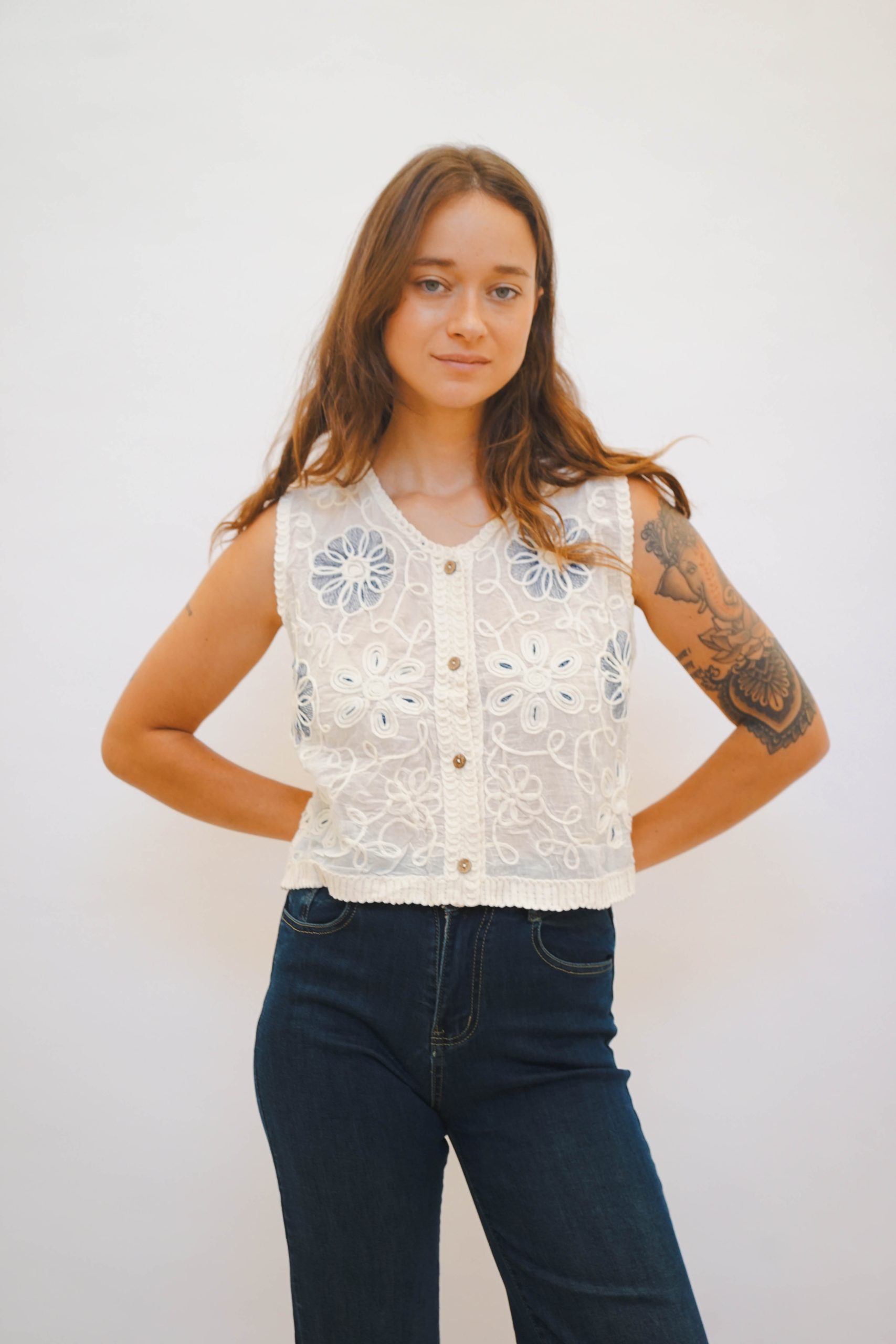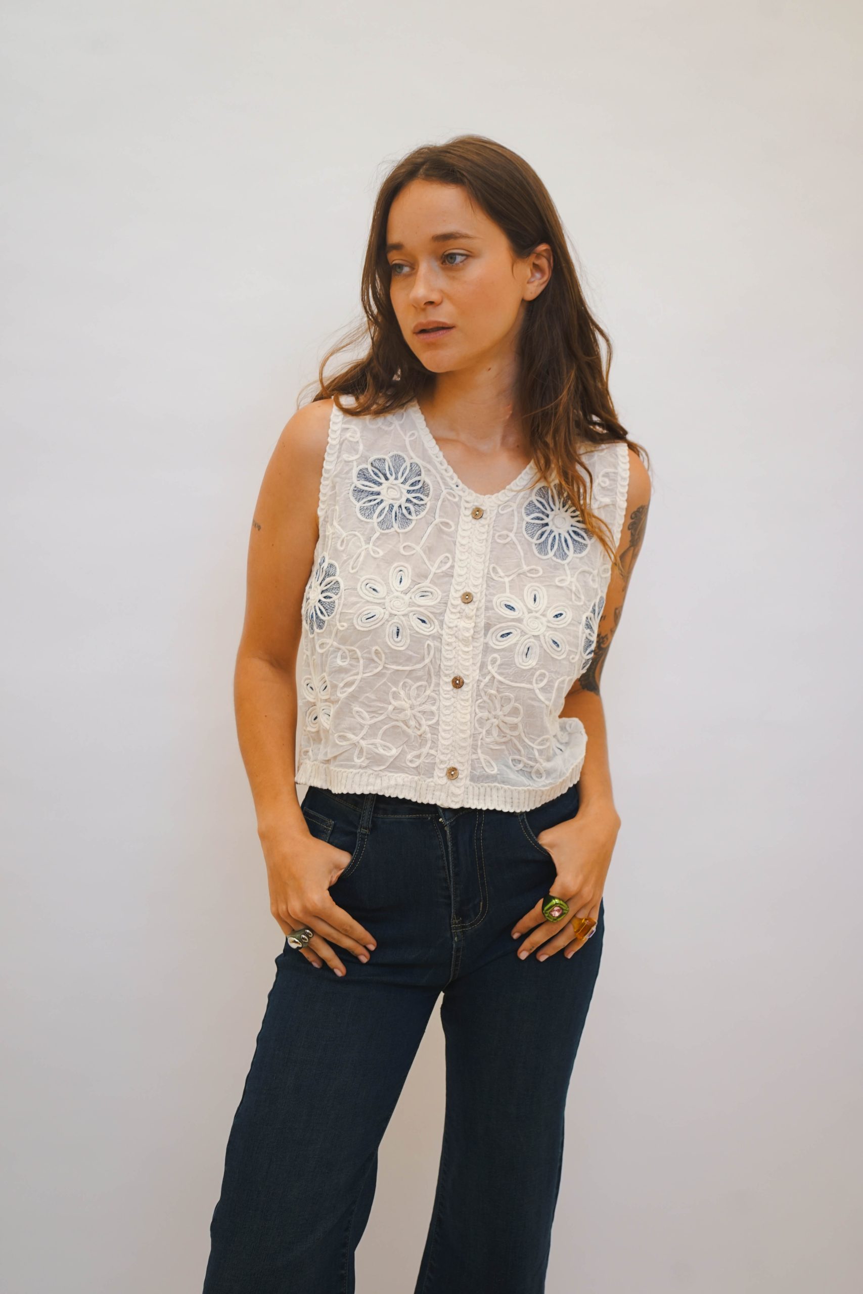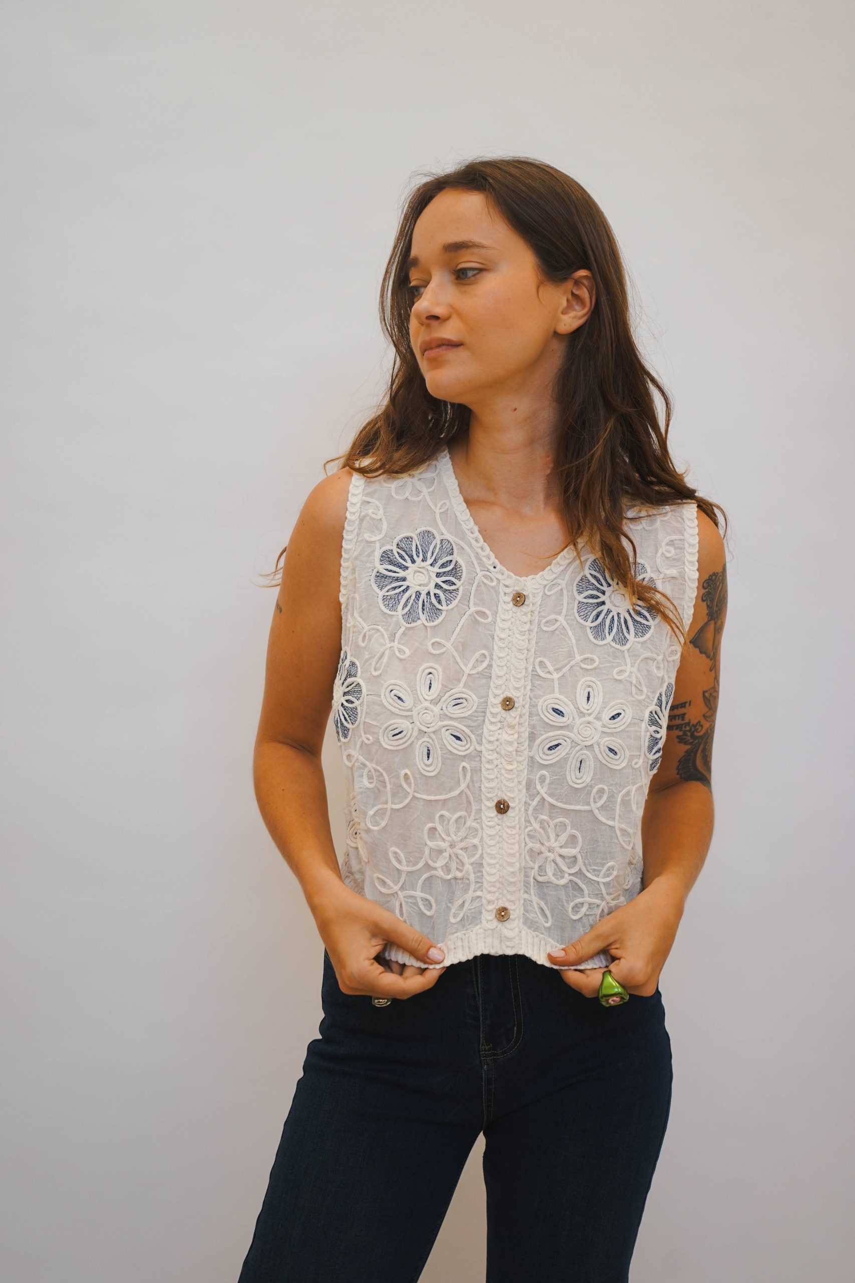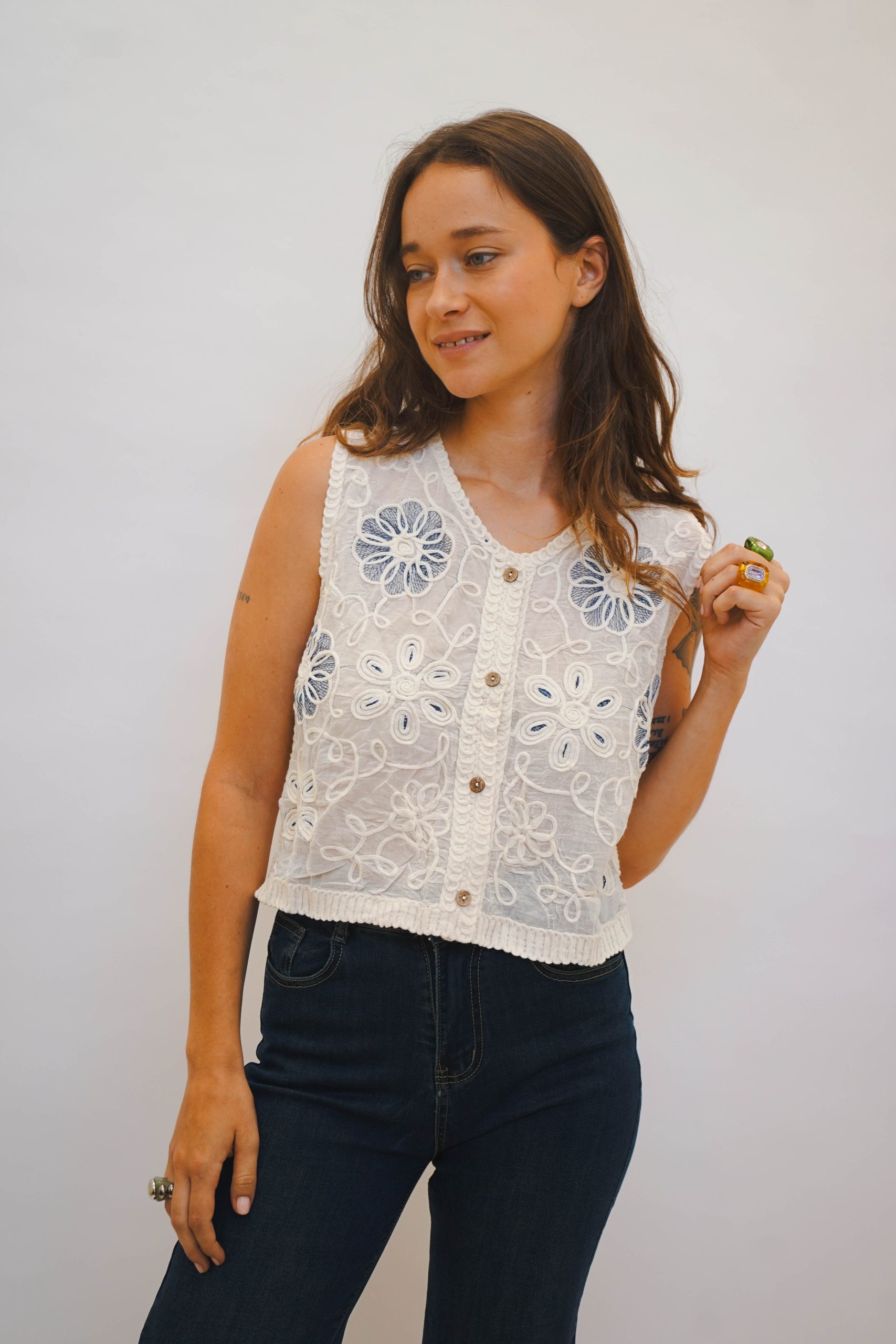 אפודת קרושה בגזרה ריבועית עם מפתח עגול וכתפיות רחבות, בדוגמת ריבועים שחורים עם פרחים לבנים ריקמה כחולה בפרחים וגב קרושה מתאימה לשילוב עם ג׳ינס ליום או מכנס מחויט ונעלי עקב לערב