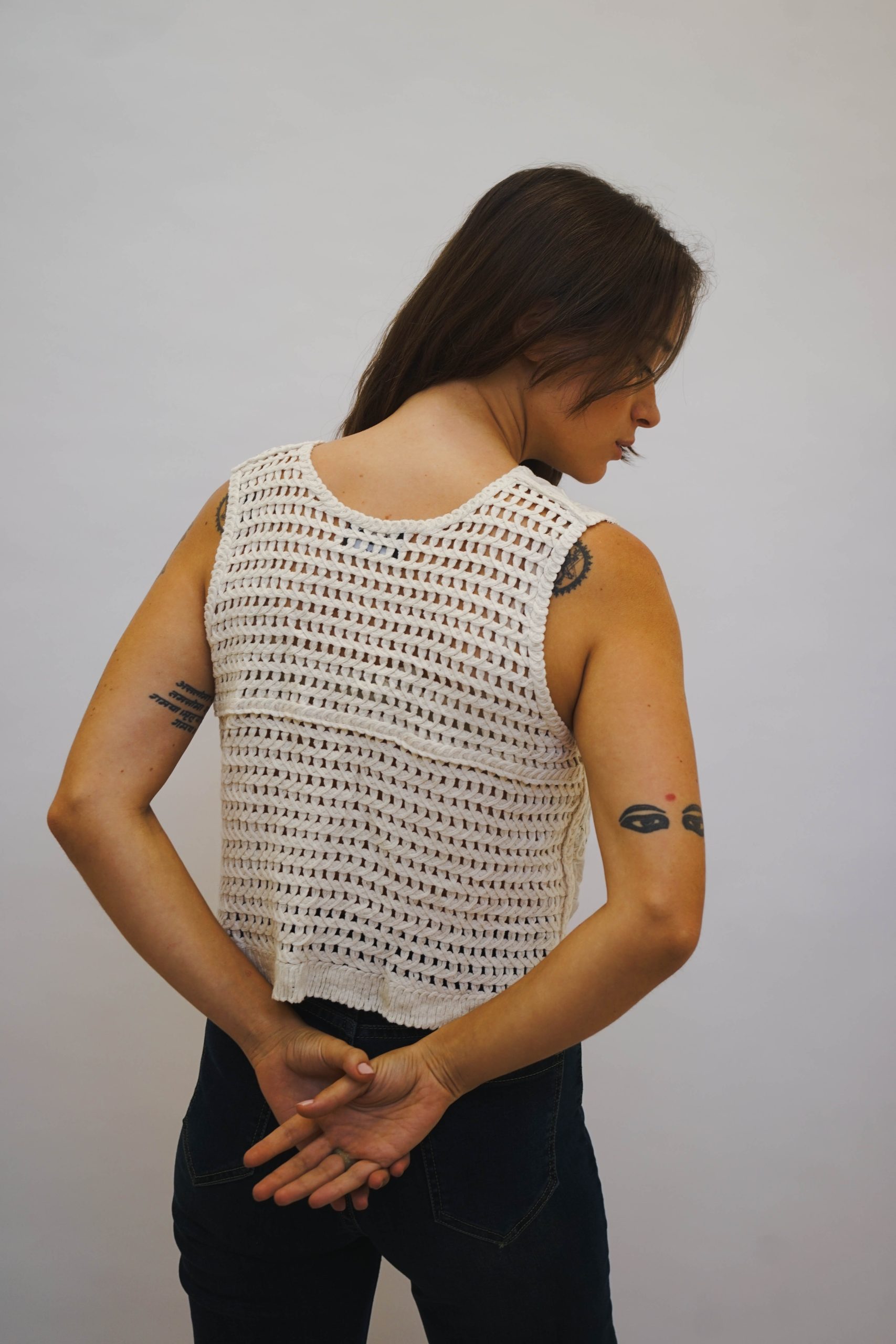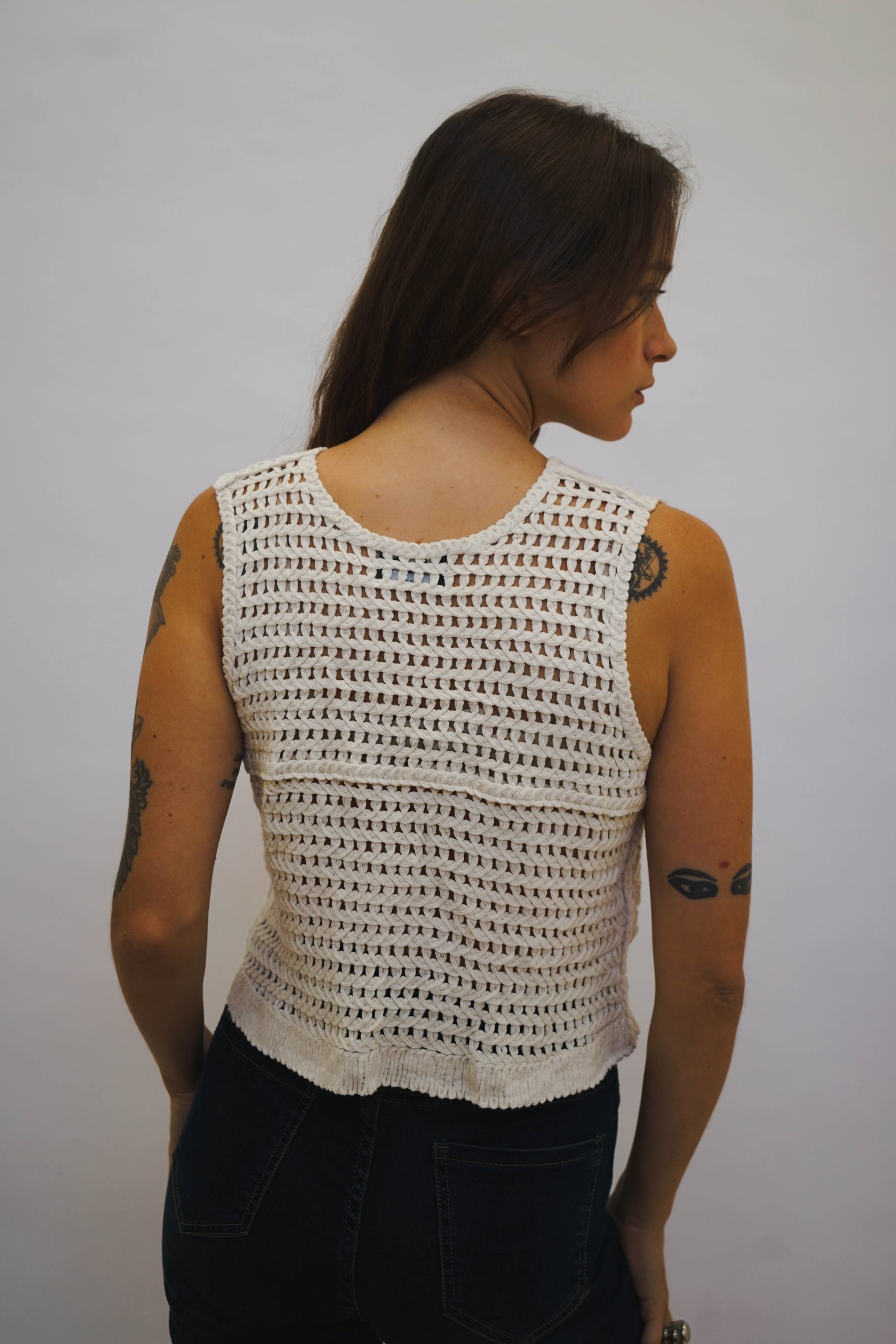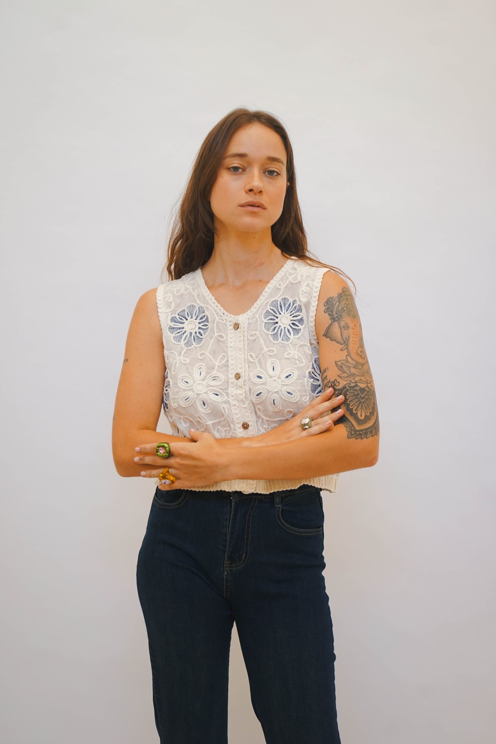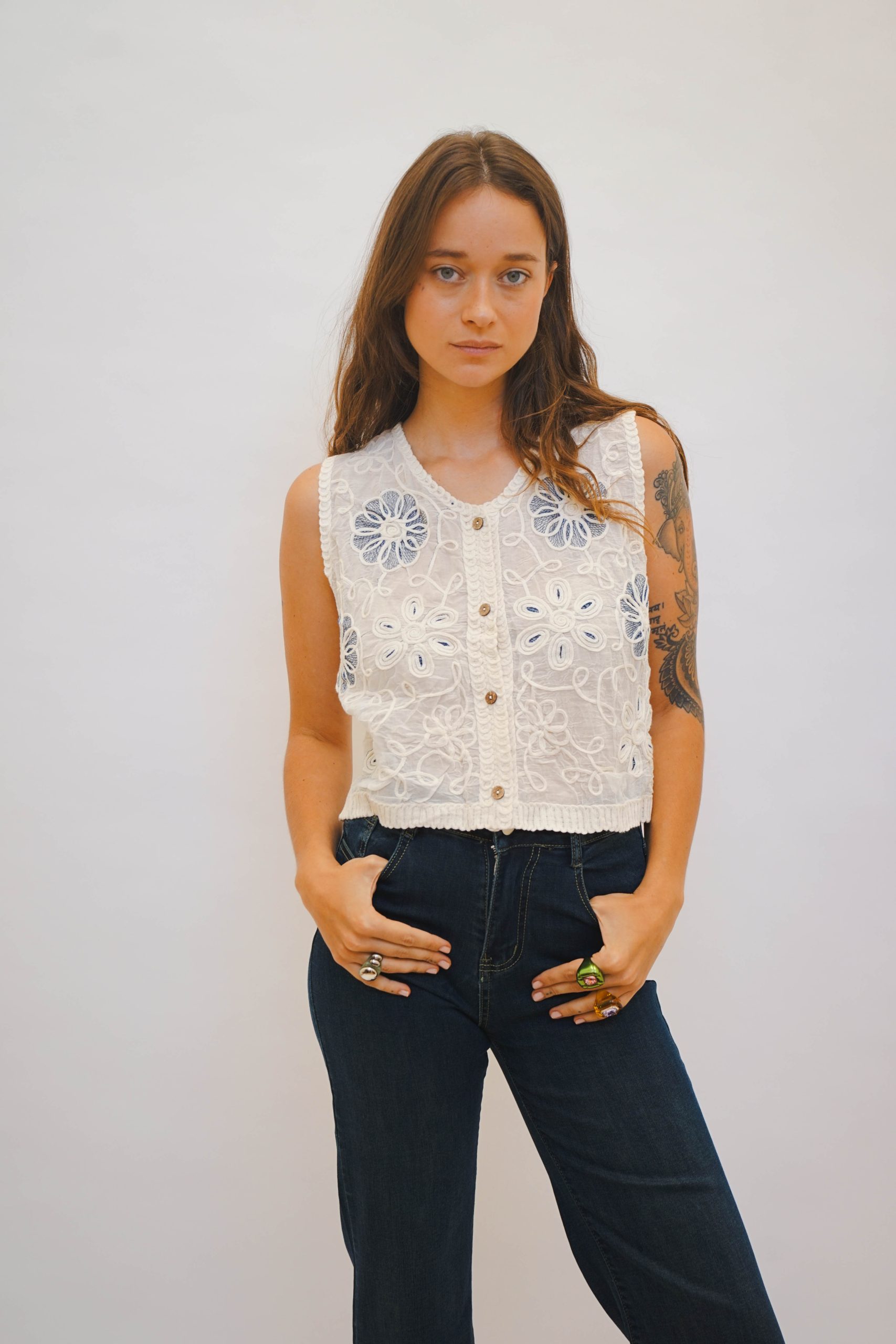 אפודת קרושה בגזרה ריבועית עם מפתח עגול וכתפיות רחבות, בדוגמת ריבועים שחורים עם פרחים לבנים ריקמה כחולה בפרחים וגב קרושה מתאימה לשילוב עם ג׳ינס ליום או מכנס מחויט ונעלי עקב לערב
