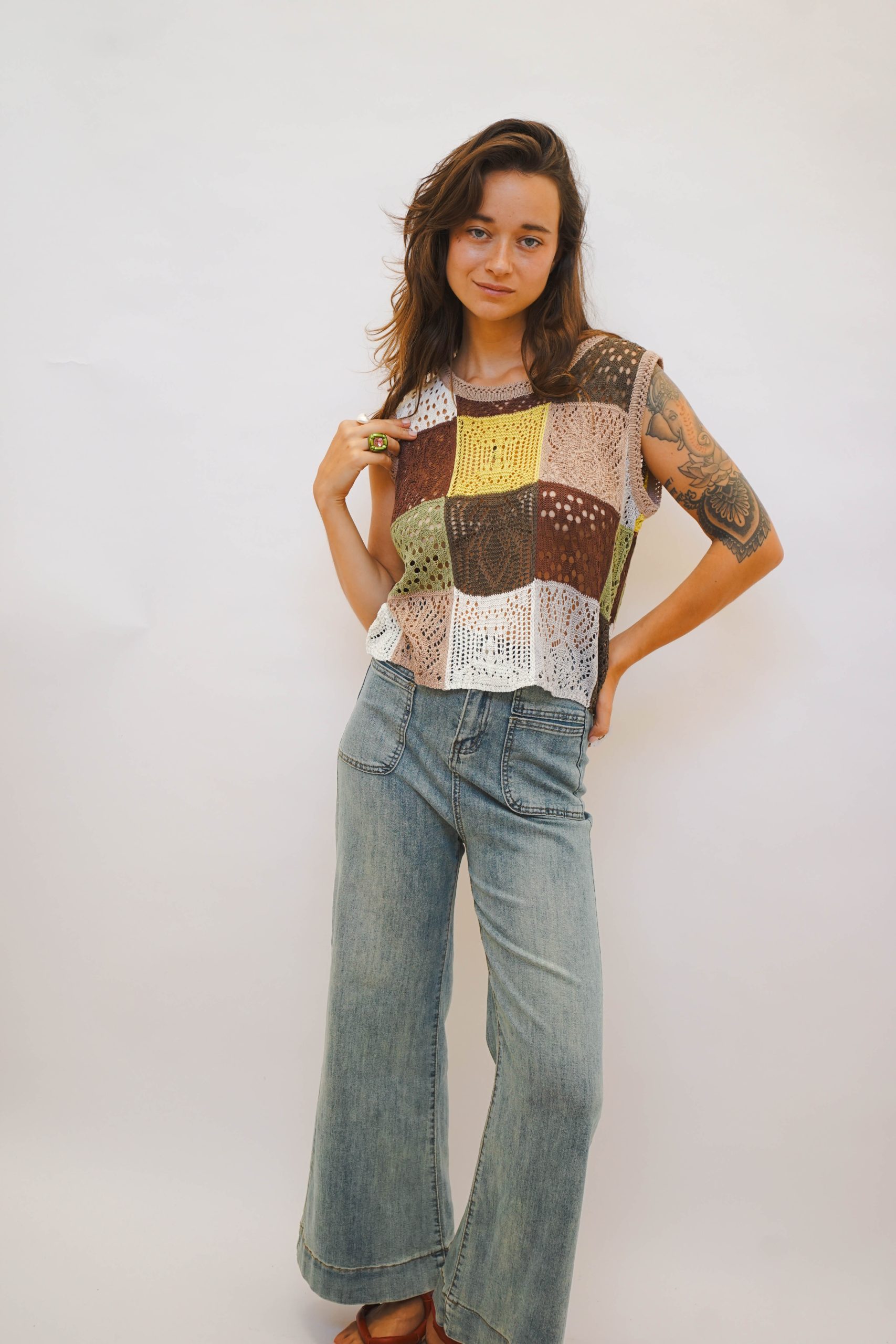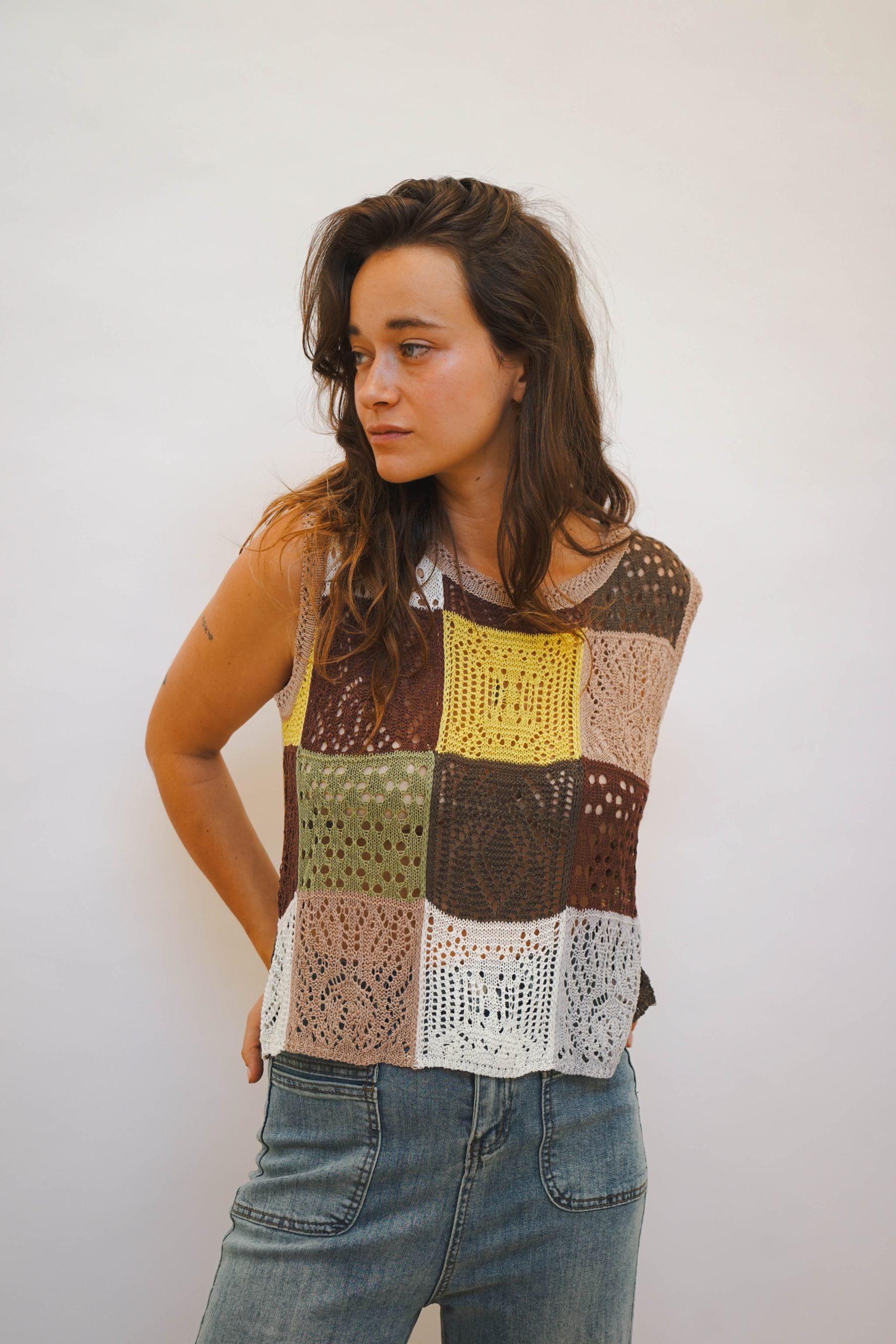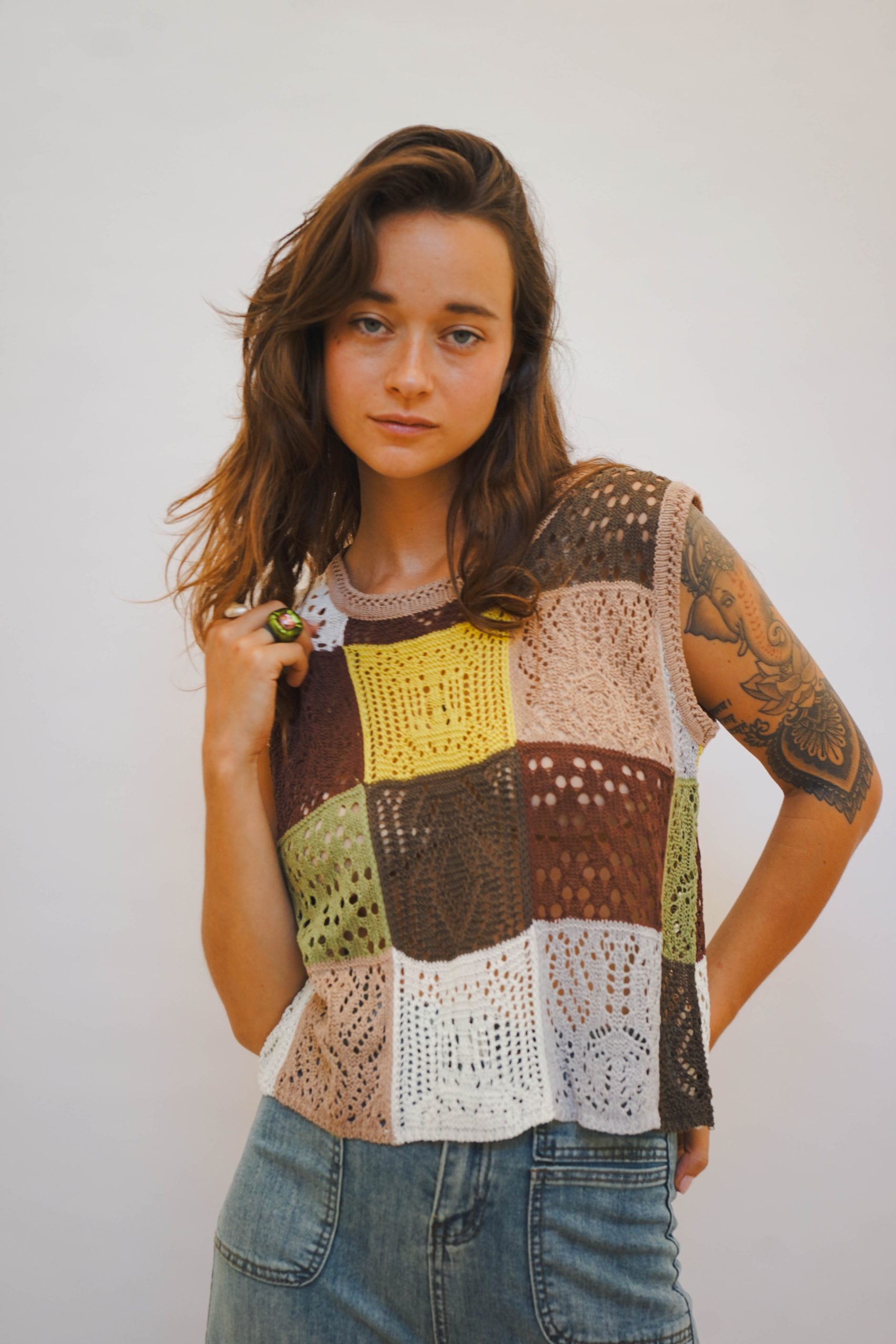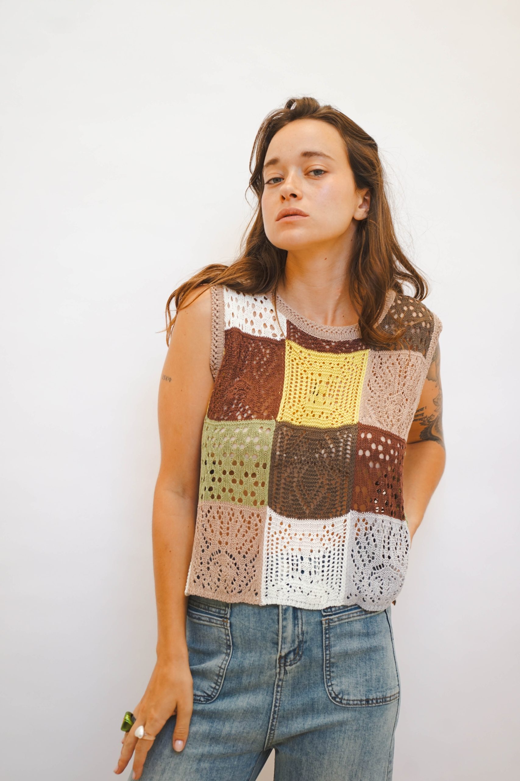 אפודת קרושה בגזרה ישרה וללא שרוולים, עשויה בטכניקת טלאים סרוגים – שילוב של מרקמים ודוגמאות שונות שיוצרות מראה וינטג’. מתאימה ללבישה בפני עצמה, או מעל טי / שמלה חלקה לאאוטפיט ייחודי.53 סמ אורך 104 סמ היקף