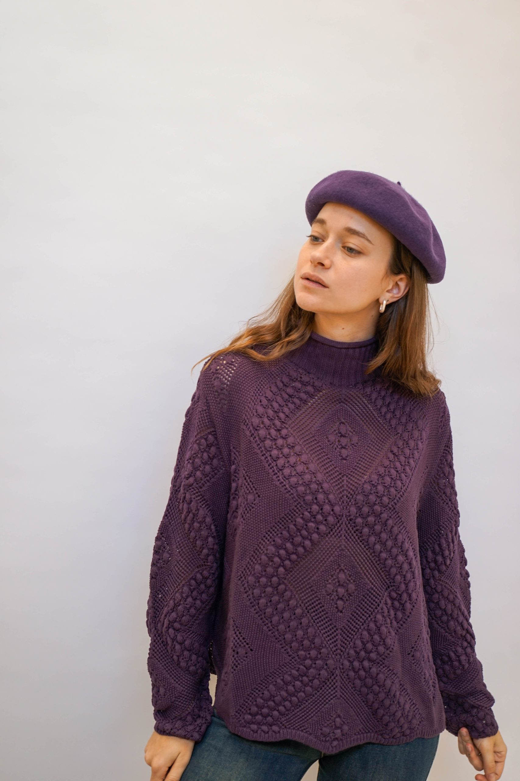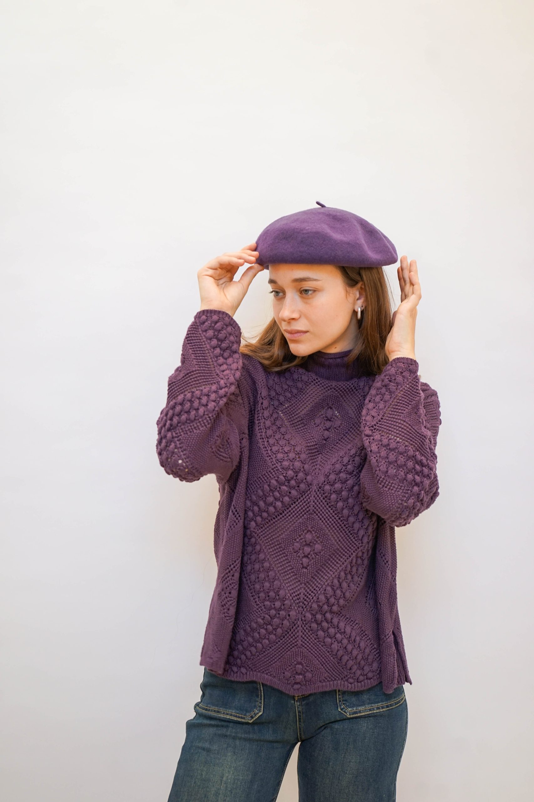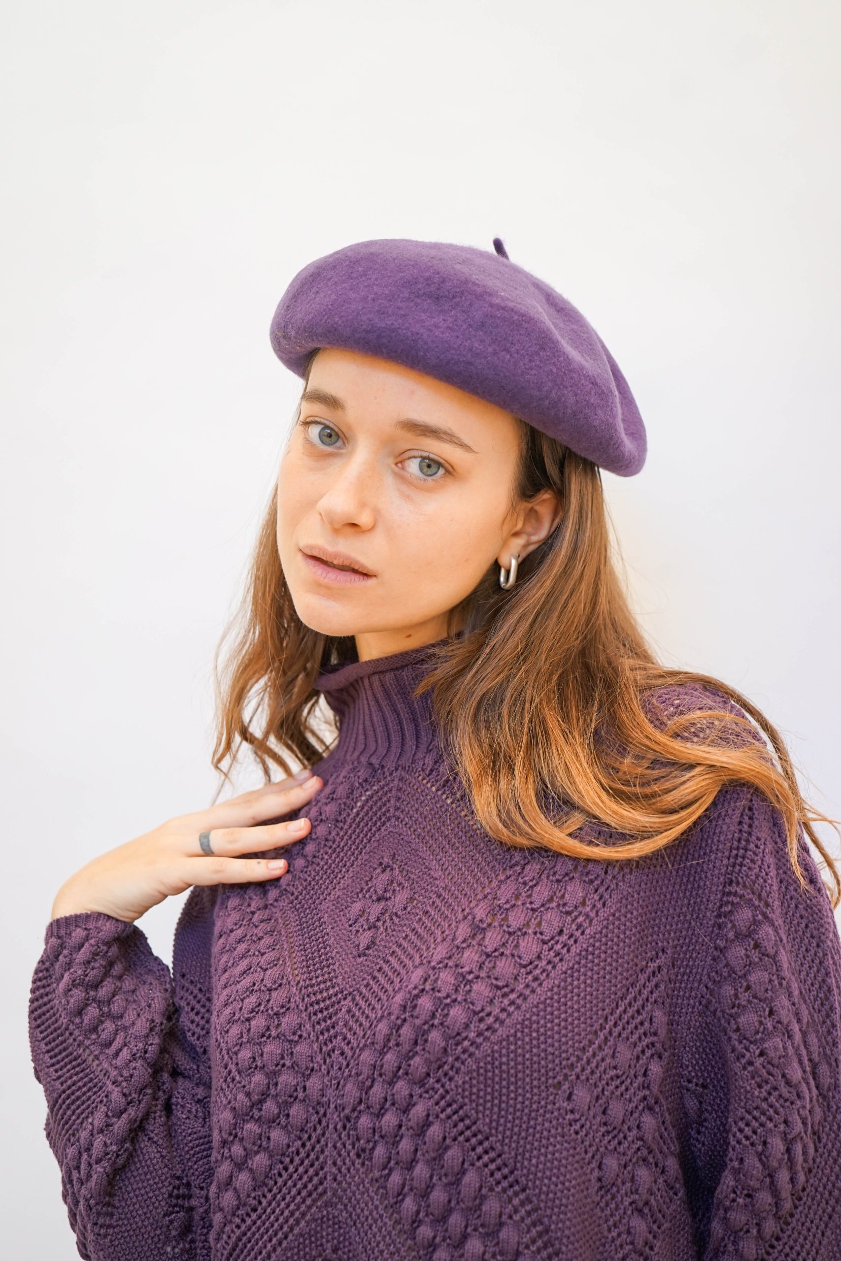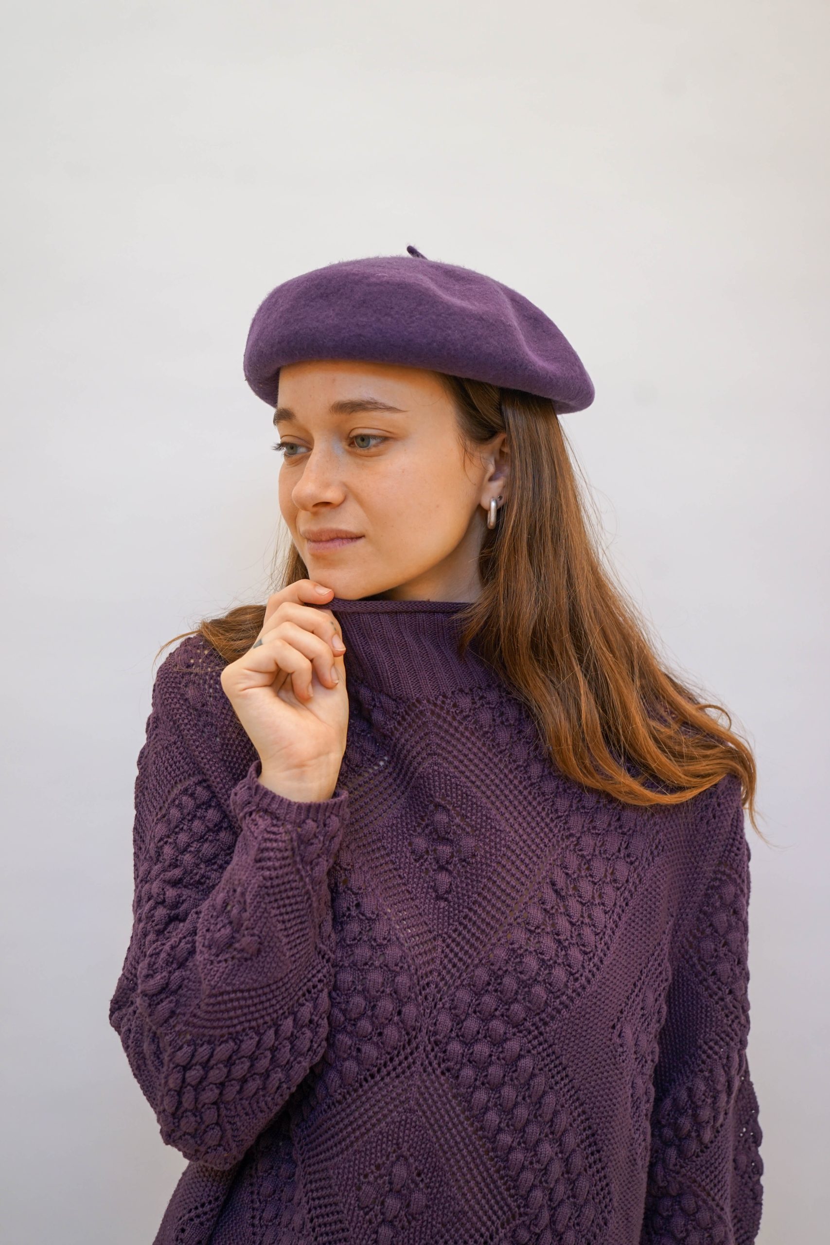 כובע בראט צרפתי בצבע סגול. אקססורי מיוחד למי שרוצה להביא ללוק שלה טאץ' אחר. יכול להיות מושלם לשלב עם סוודר ומגפונים סטייל דוק מרטינס.