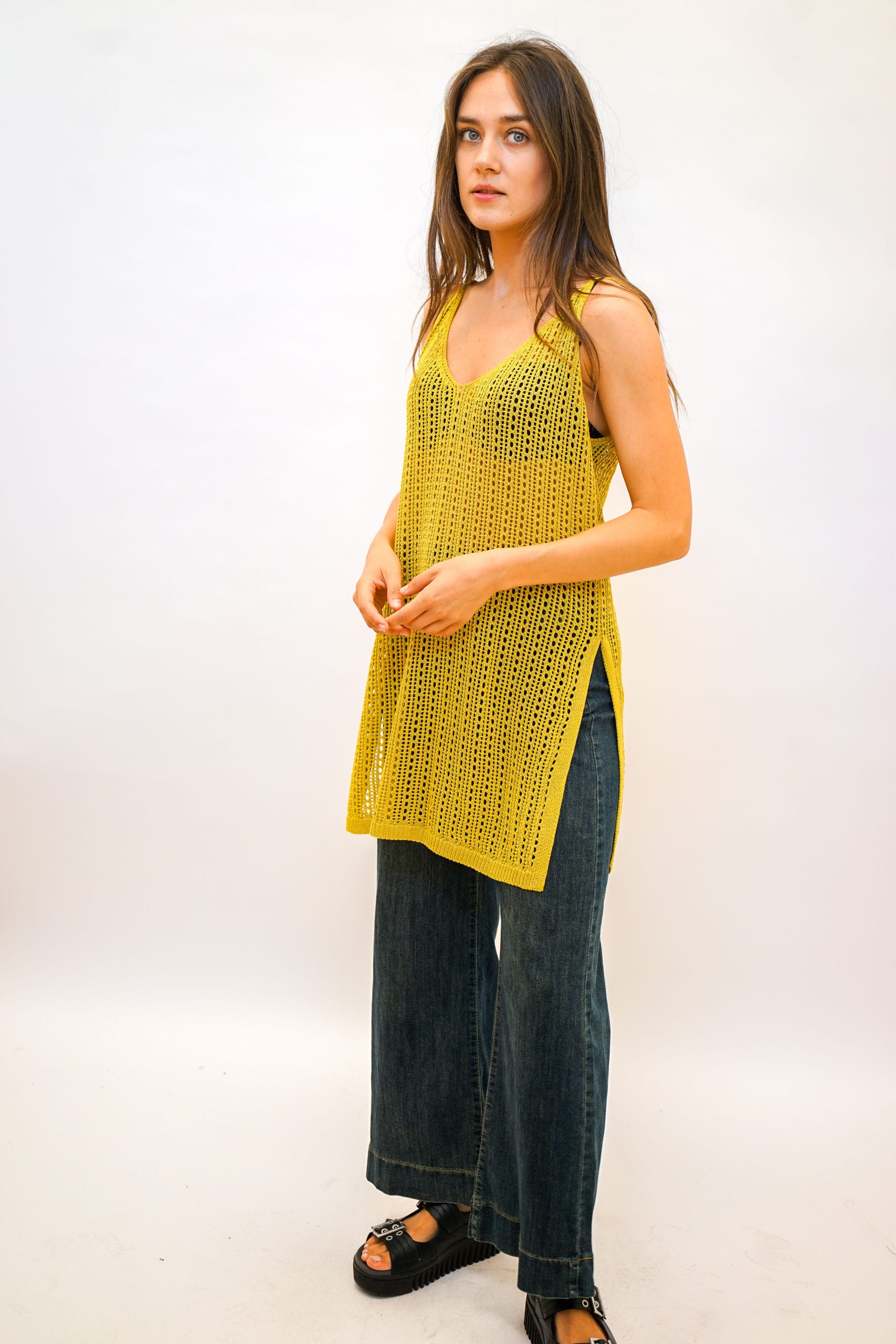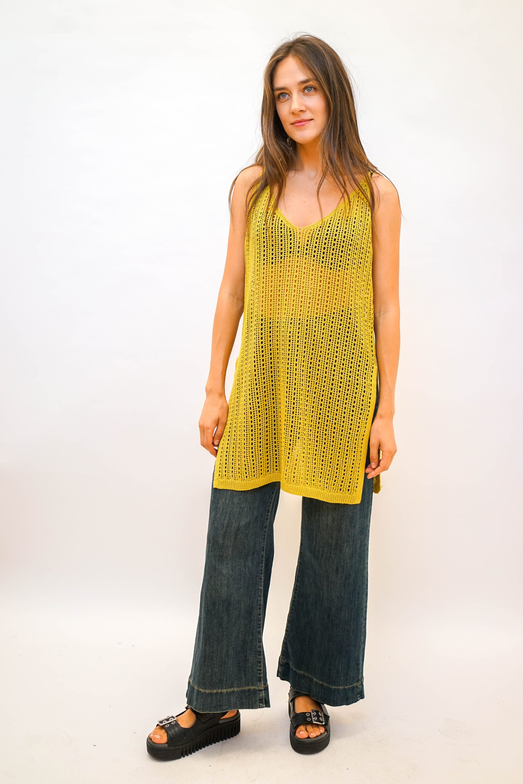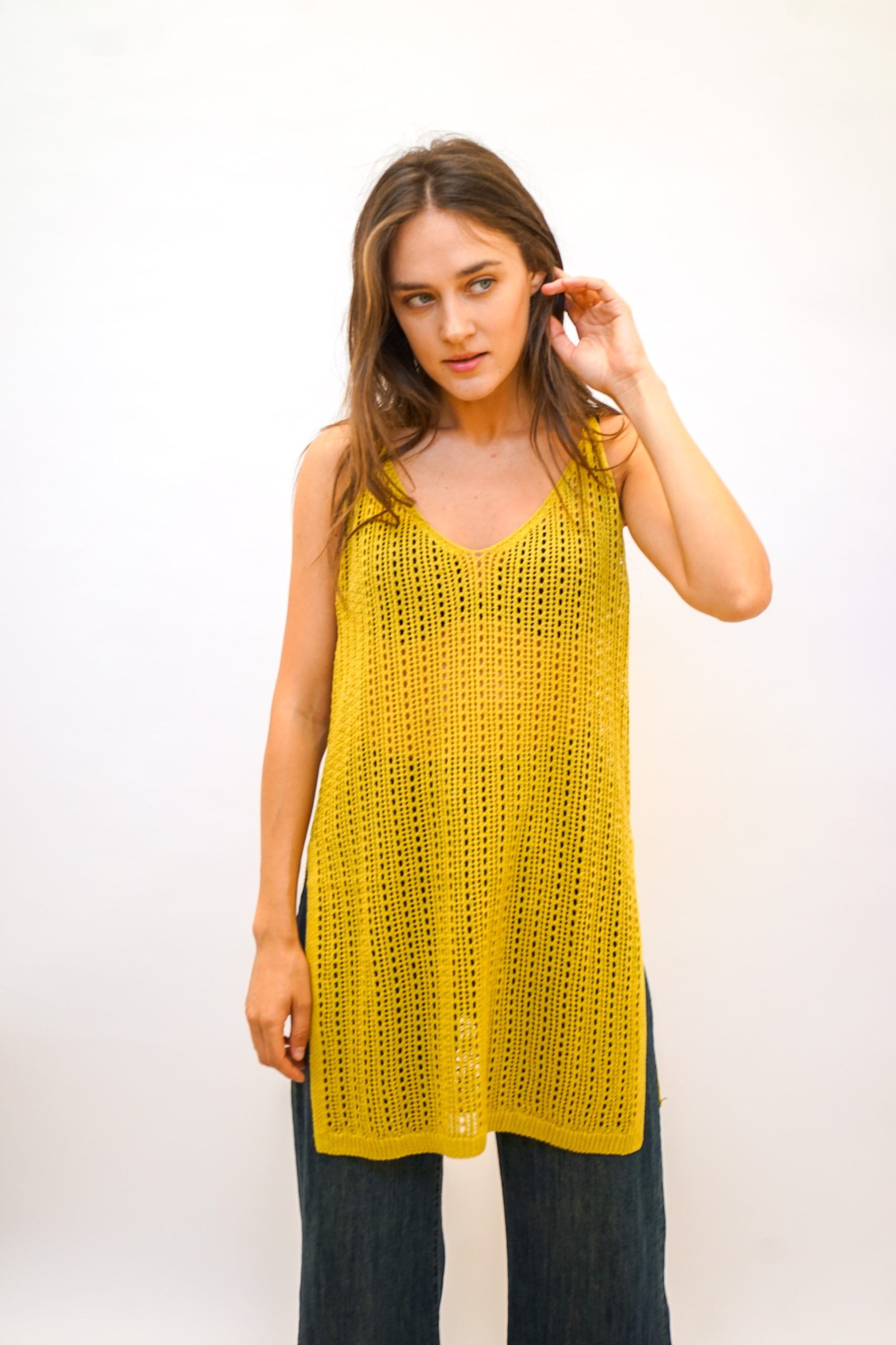 גופיית סריג שליצים בצדדים וי מקדימה ומאחור אורך הגופייה …. יכול לשמש מעל בגד ים או חזייה לערב ואפשר גם עם גופיית ספגטי מתחת