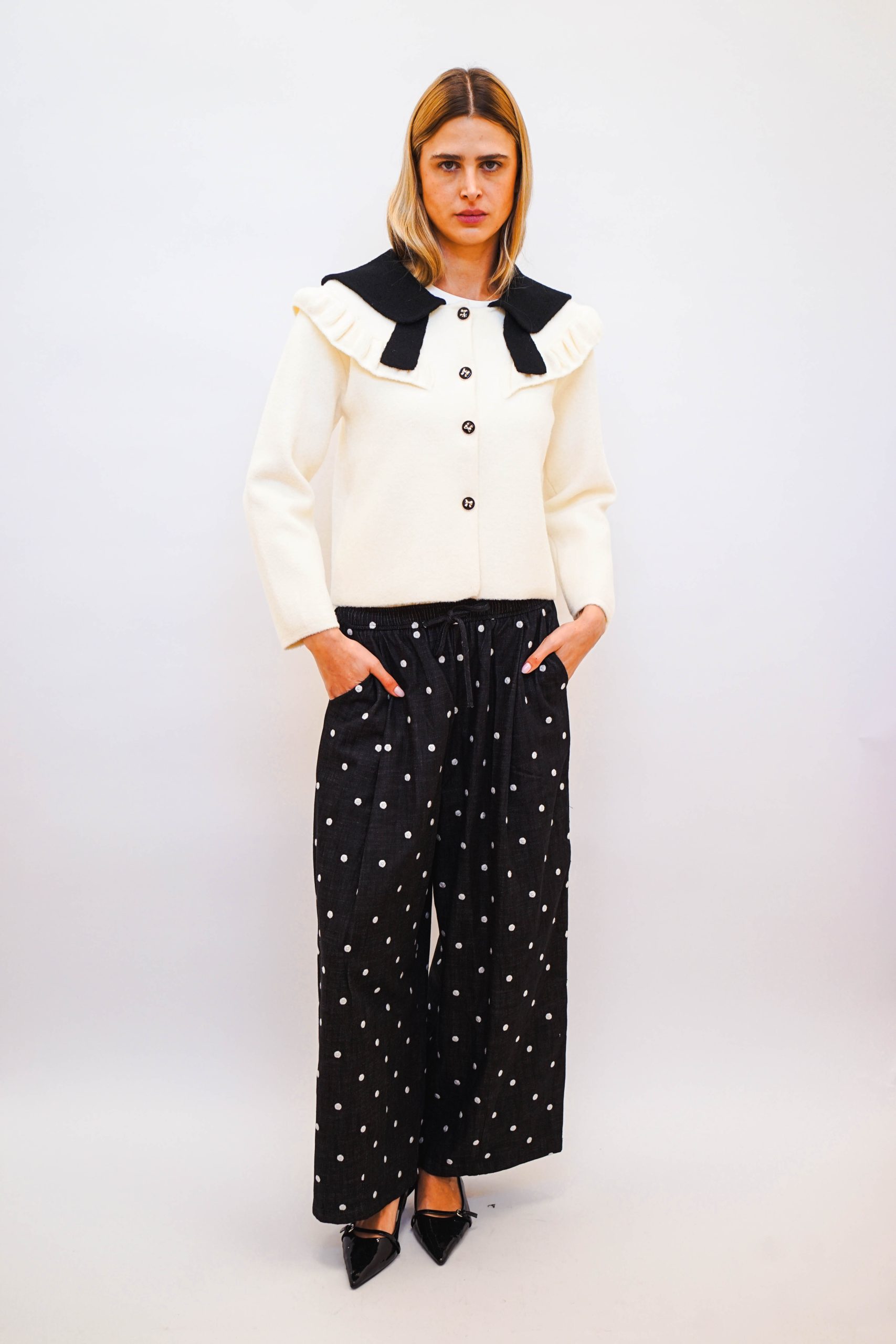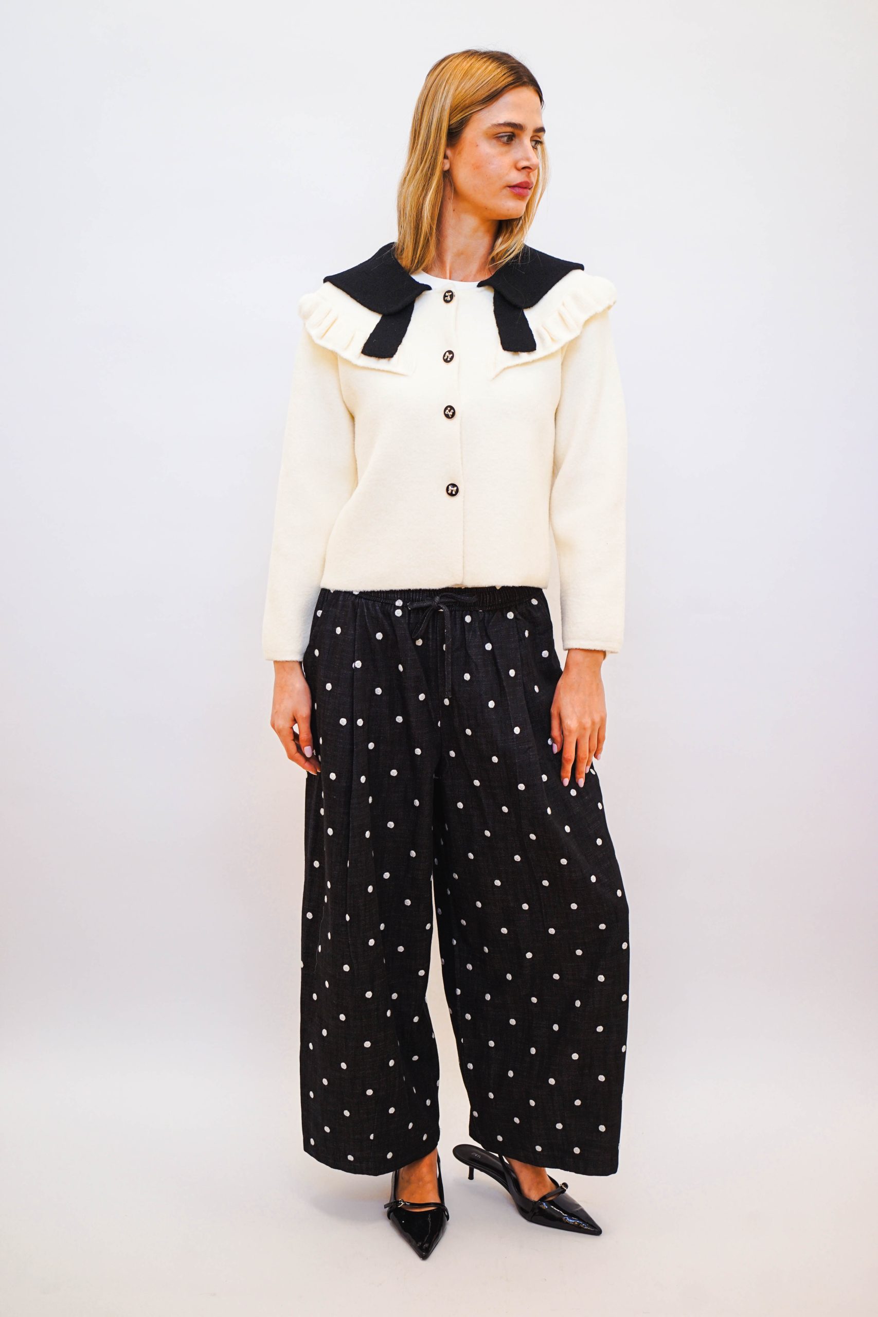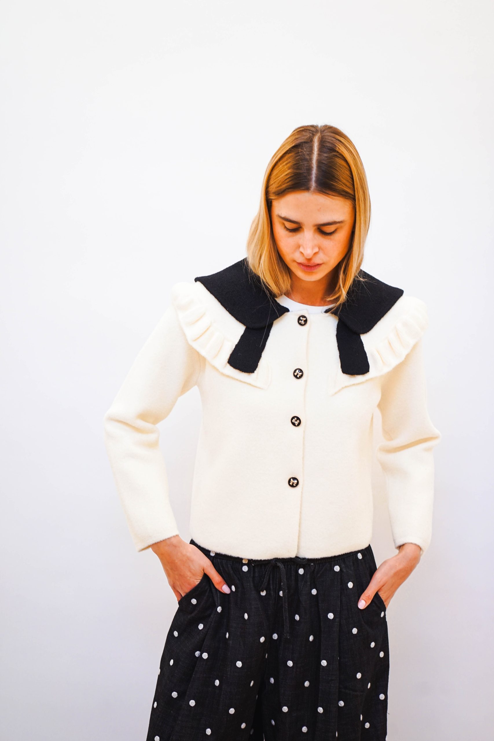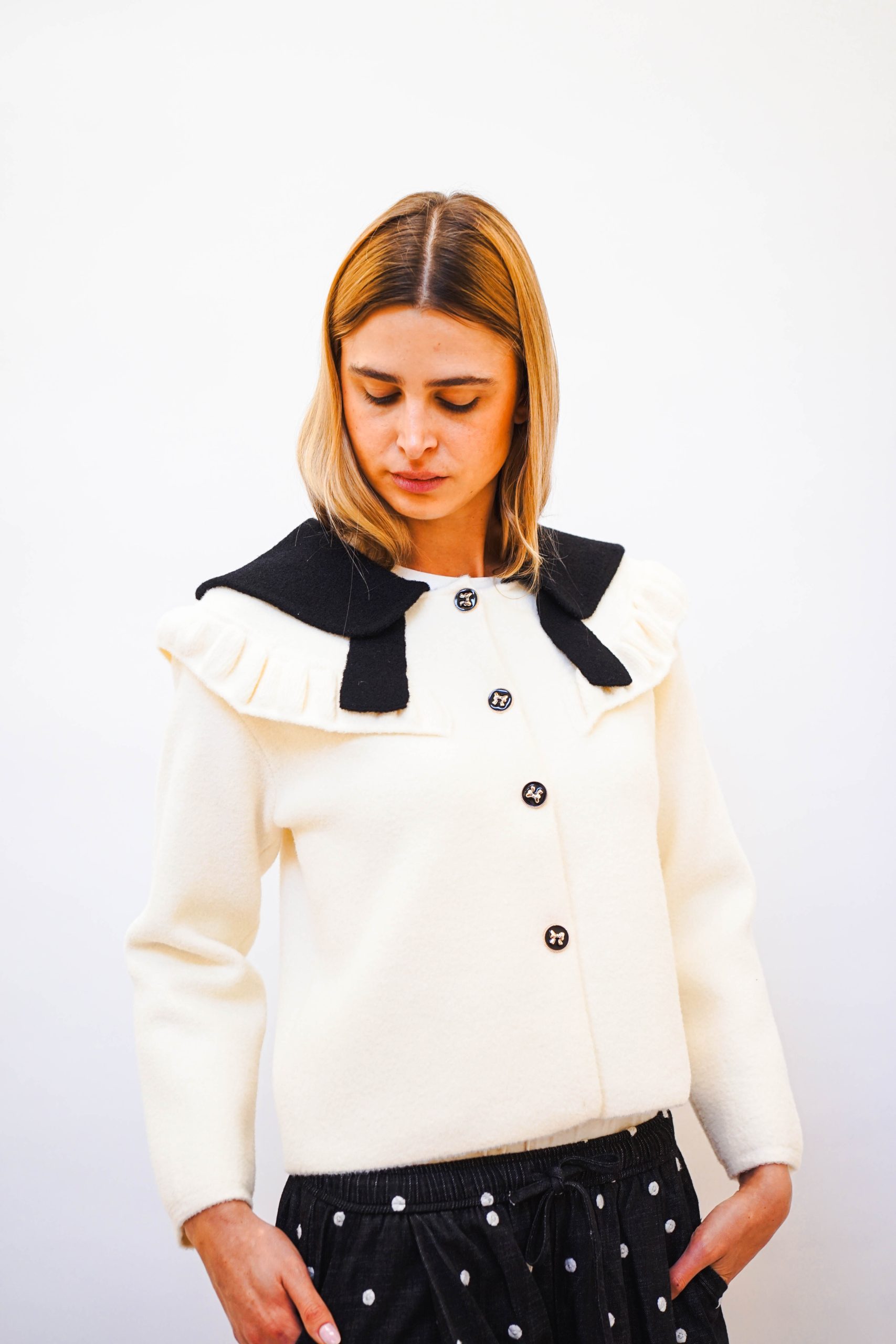 ג'קט פלפי לבן עם פפיון שחור וקשירה כפתורים ייחודים פיון שחור זהב כפתורים לכל אורכו במראה קרוב לגוף וינטאג' שאנלי מושלם יפה עם חצאית שחורה או מכנסי דוטס שחור לבן למראה עם קריצה אורך 58 היקף 1 מטר בד נמתח