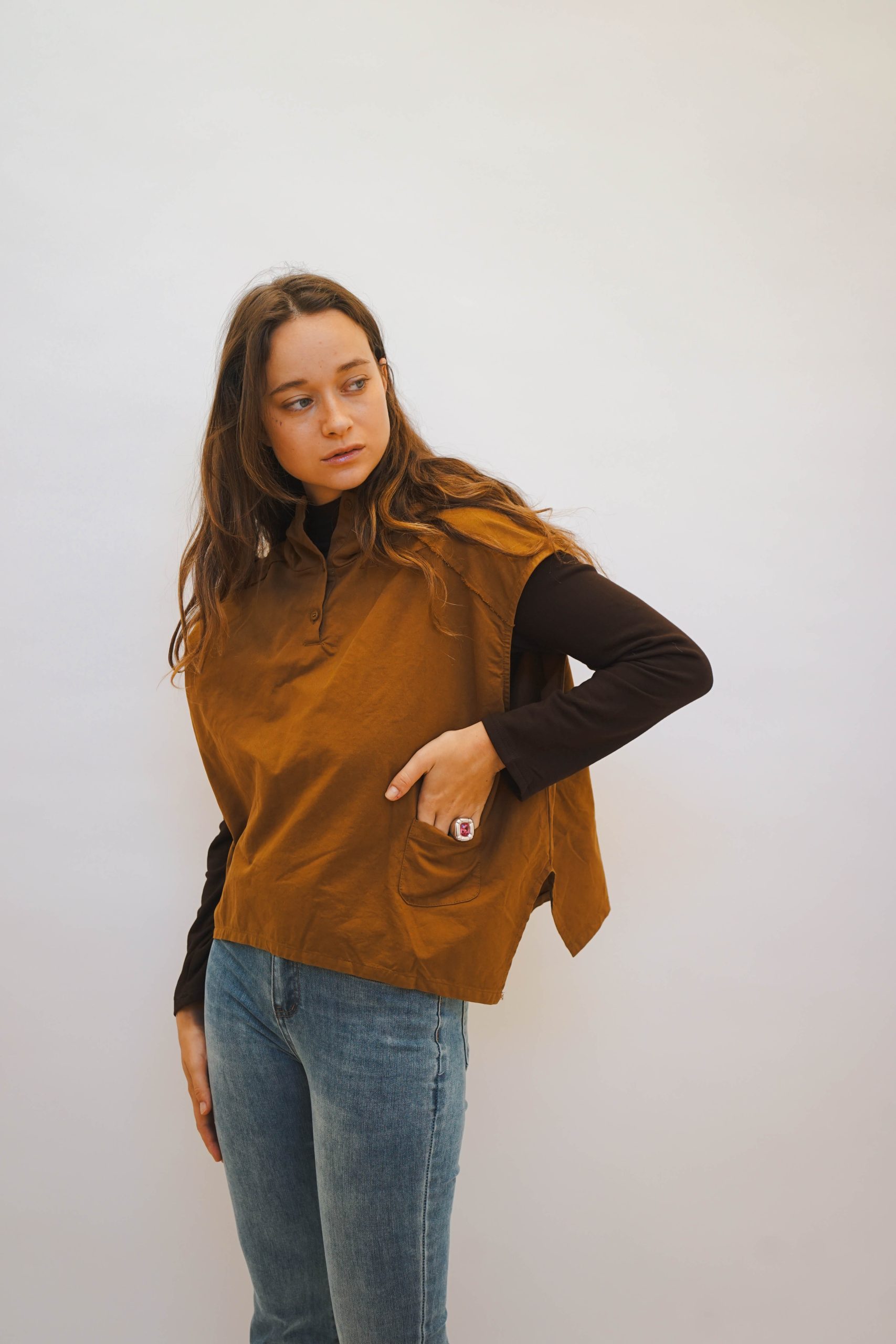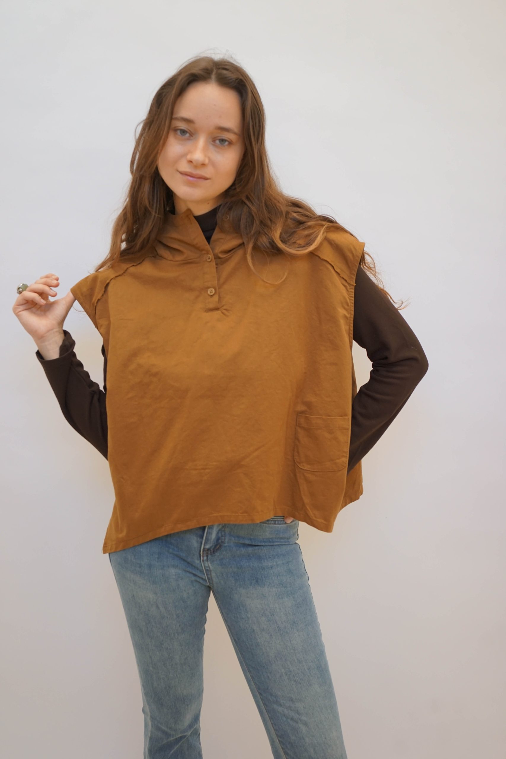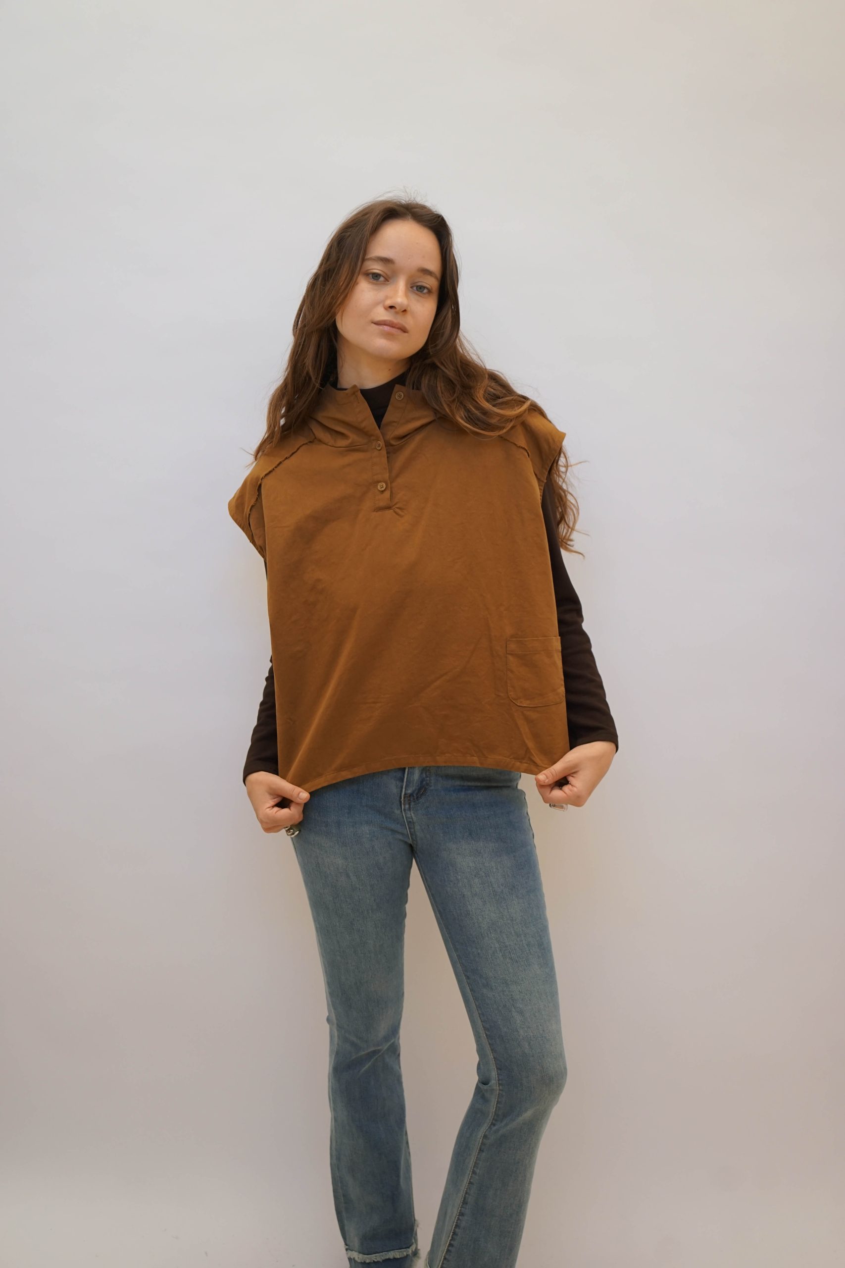 ווסט חרדל בגיזרה רחוקה מהגוף. עם קפוצון מושלם בהדפס שחור לבן 2 כפתורים בצווארון ומראה פרום בכתפיים ולמראה קליל עם ג'ינס,מכנס מחוייט, ניתן ללבוש מעל חולצה מכופתרת או טישרט ארוכה או קצרה,עם חצאית למראה יותר קלאסי. אורך קידמי 55 אחורי 60 היקף 120