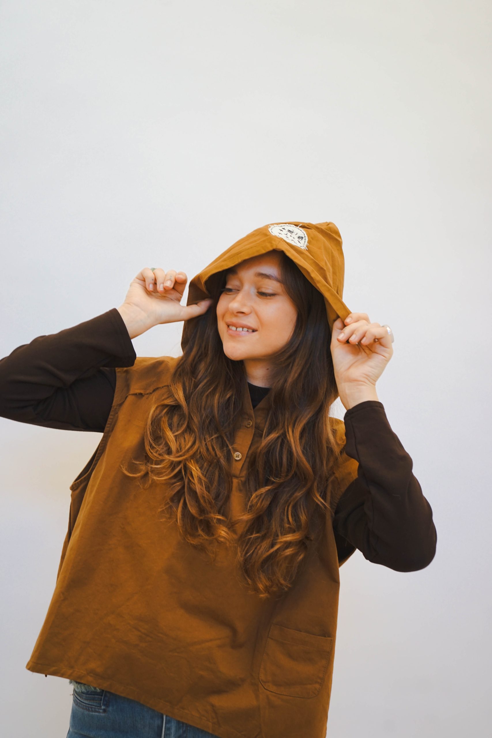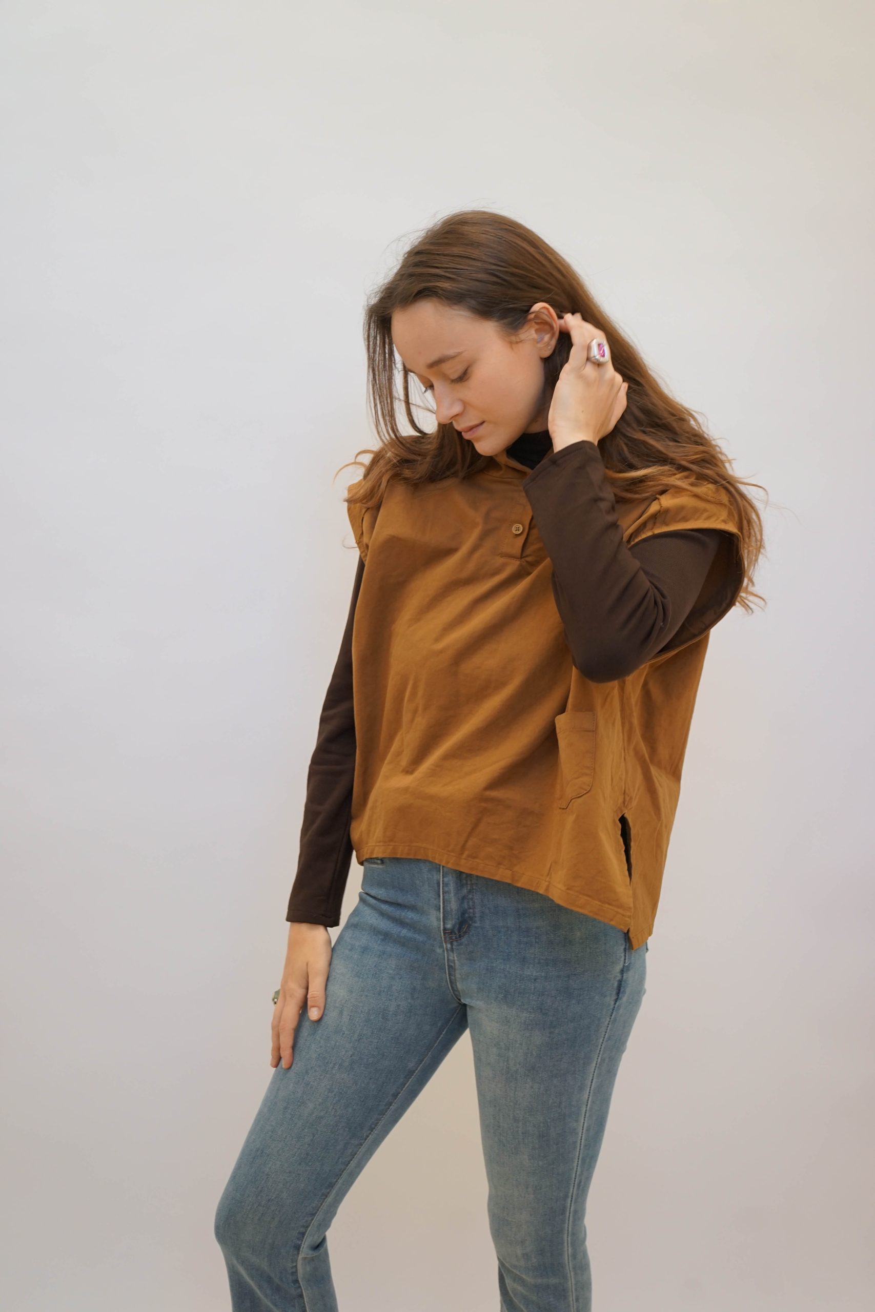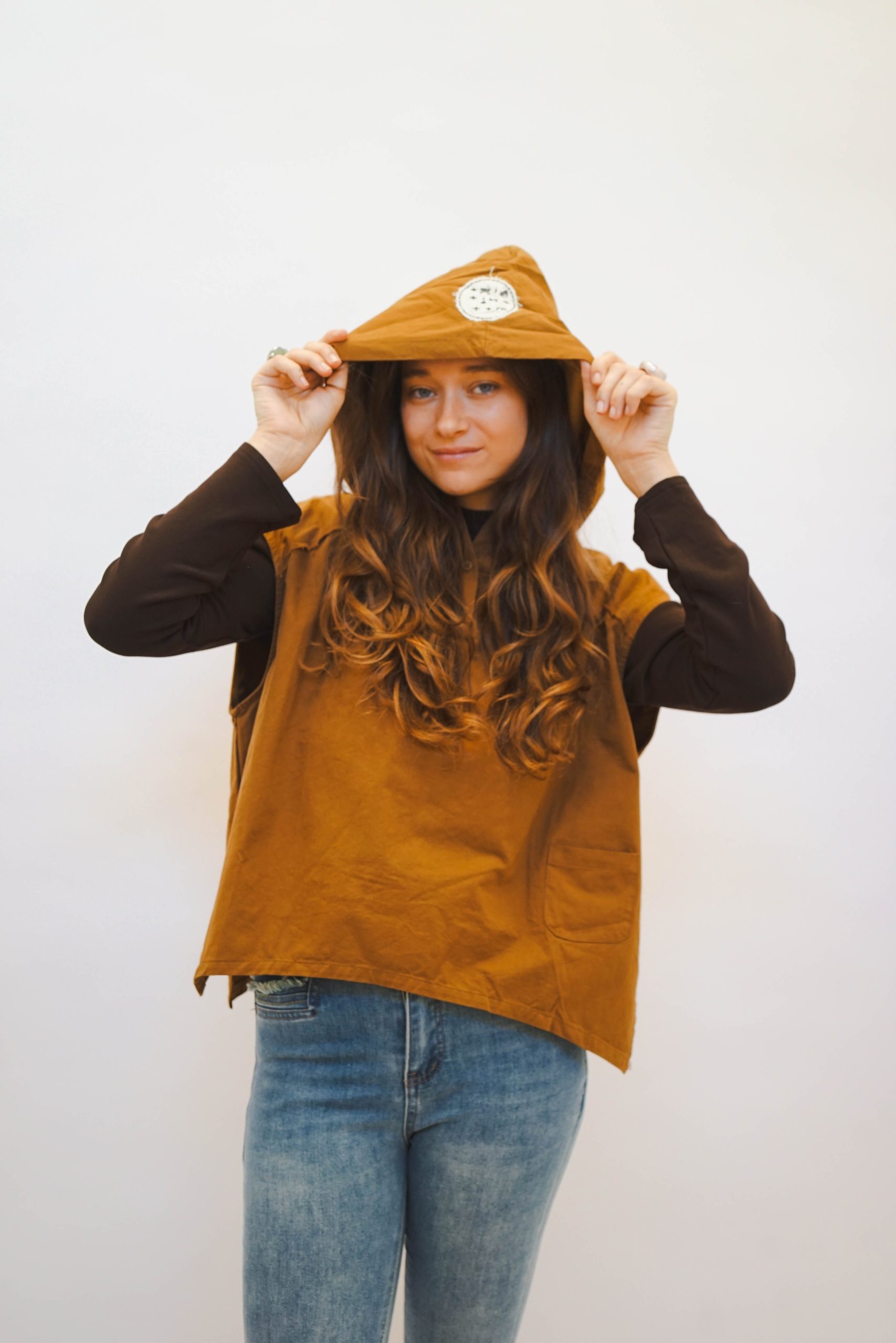 ווסט חרדל בגיזרה רחוקה מהגוף. עם קפוצון מושלם בהדפס שחור לבן 2 כפתורים בצווארון ומראה פרום בכתפיים ולמראה קליל עם ג'ינס,מכנס מחוייט, ניתן ללבוש מעל חולצה מכופתרת או טישרט ארוכה או קצרה,עם חצאית למראה יותר קלאסי. אורך קידמי 55 אחורי 60 היקף 120
