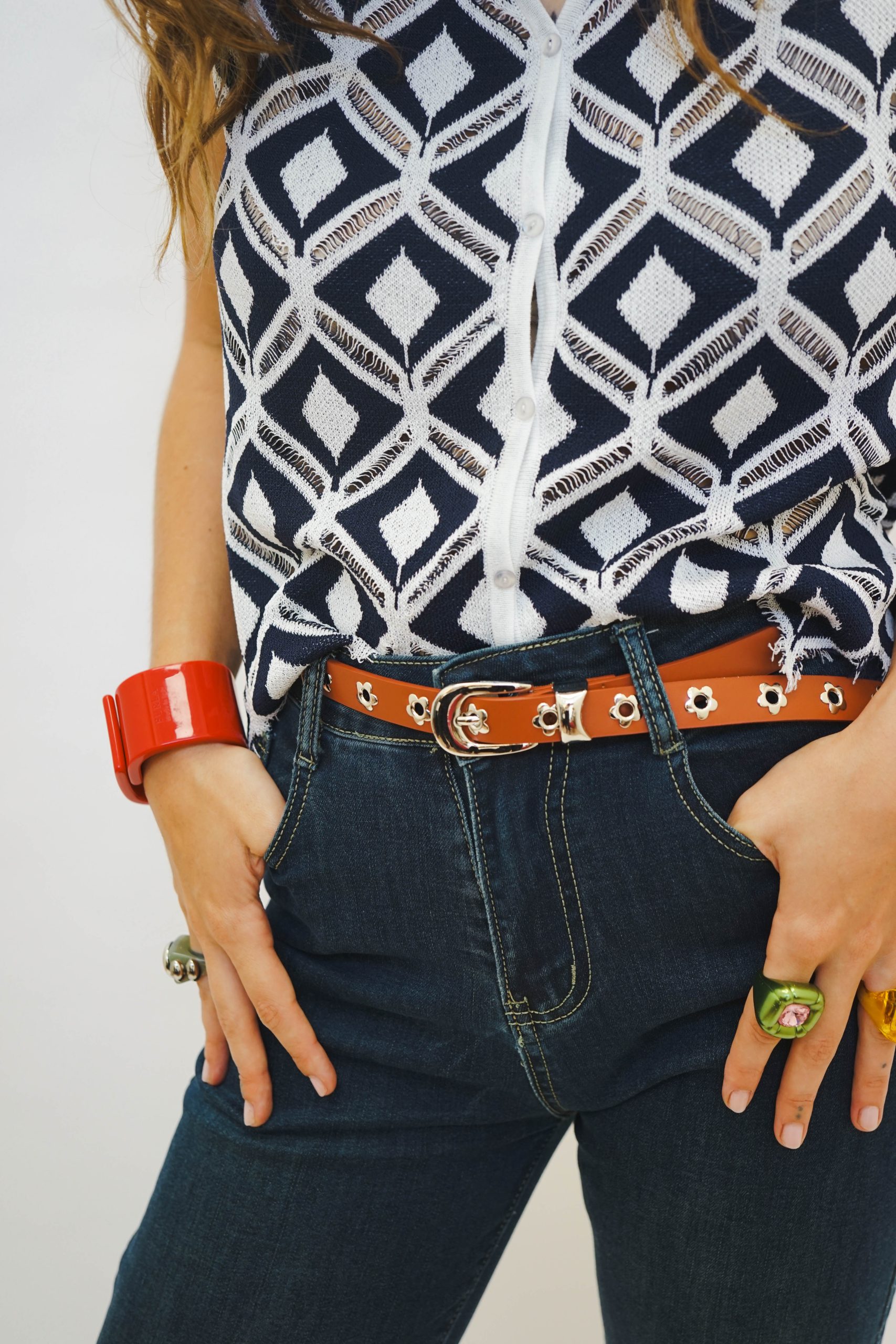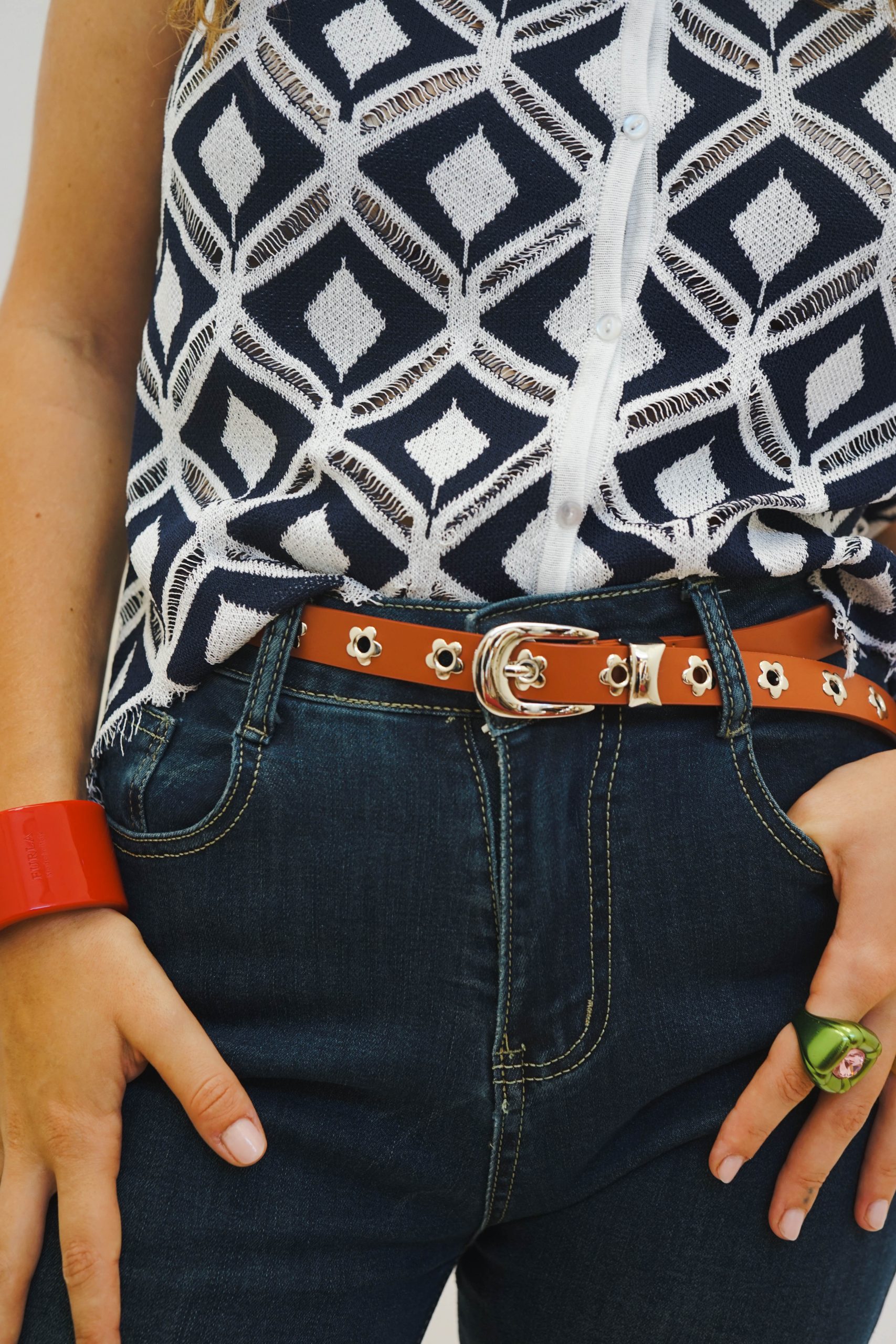 חגורה דקה וקולית עם טאץ’ מיוחד, במרקם חלק עם אבזם מתכתי מבריק. החגורה מעוטרת בעיטורי פרחים מתכתיים לכל אורכה. ותשדרג כל לוק ביום או בלילה.