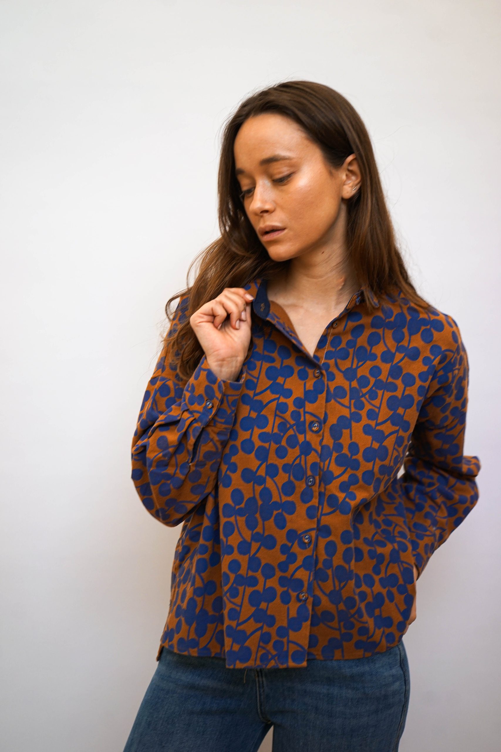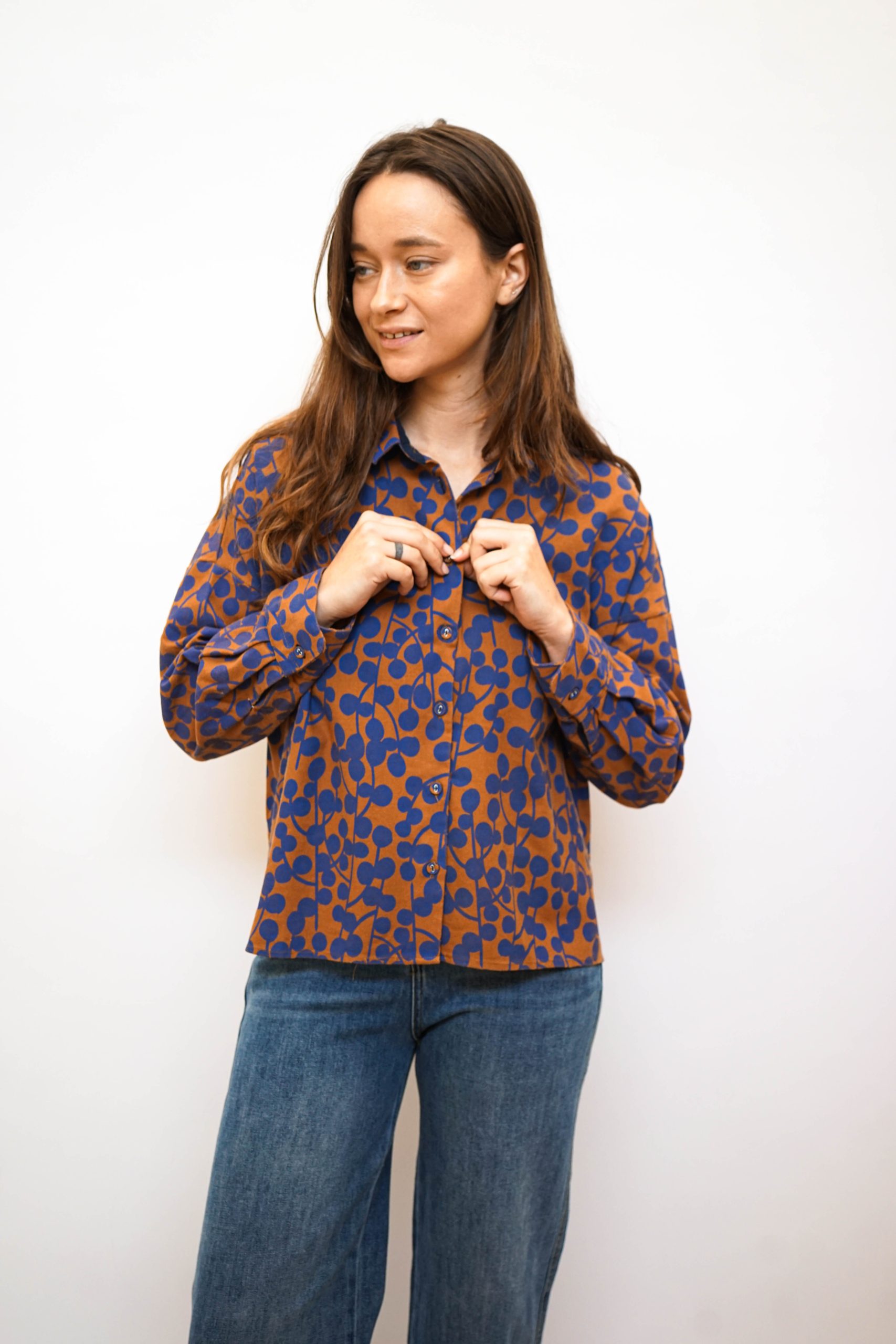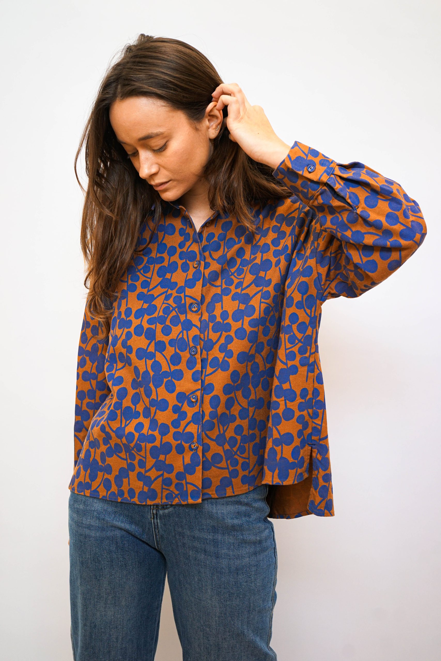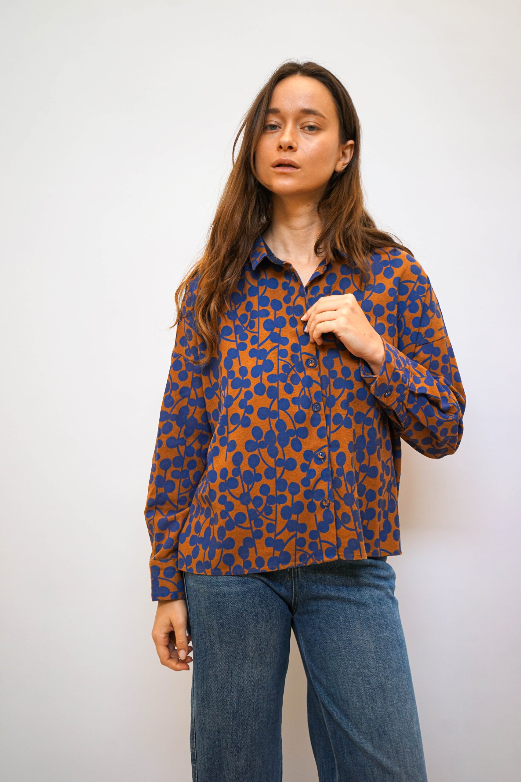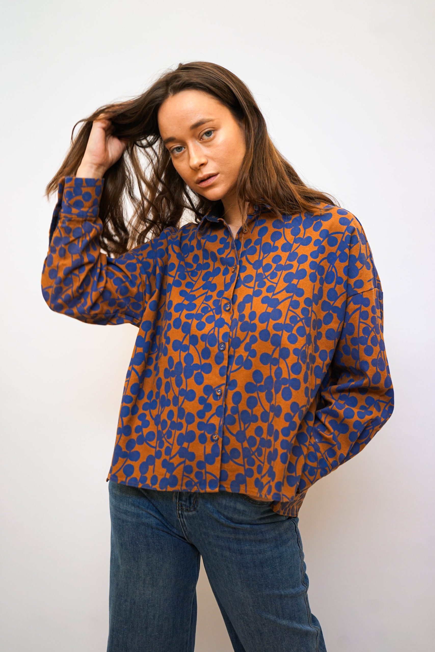 חולצת כפתורים כותנה 100% עם הדפס אוכמניות מגיעה בשני צבעים במראה רחוק מעט מהגוף במראה וינטאג' סטריט יפה במראה טוטאל לוק ג'ינס או עם כל מכנסים או חצאית בצבע אורך 55 קידמי 65 אחורי היקף 120