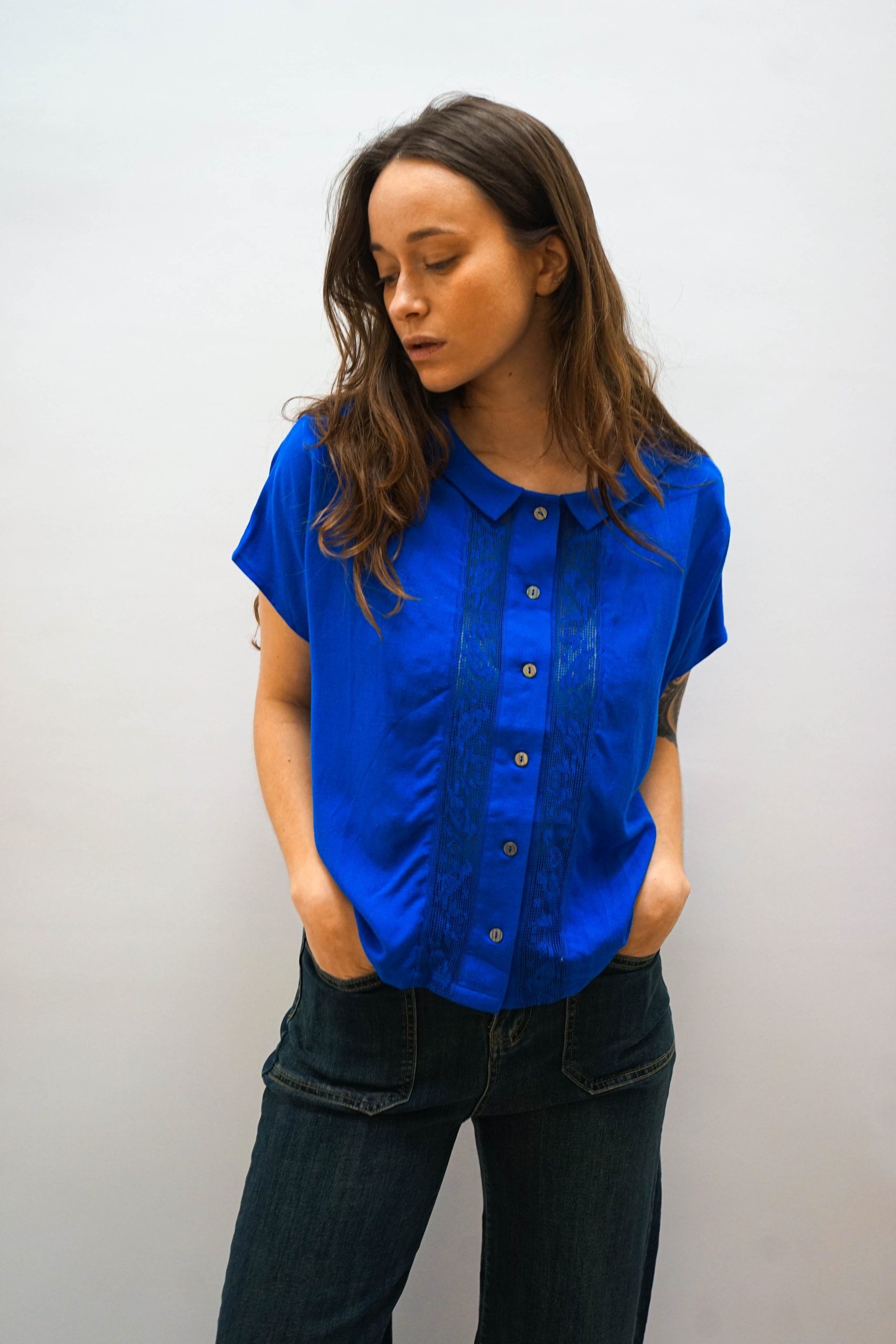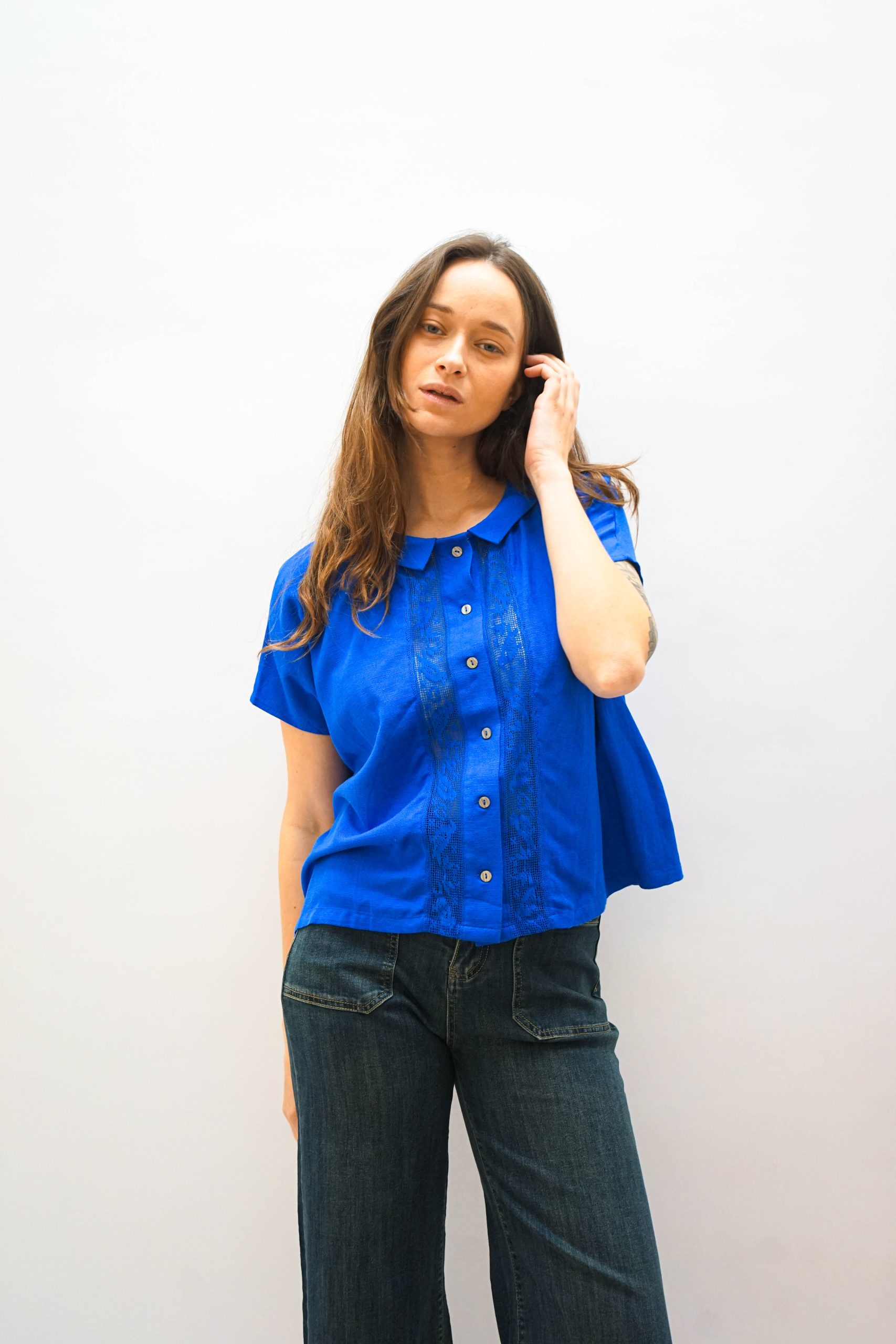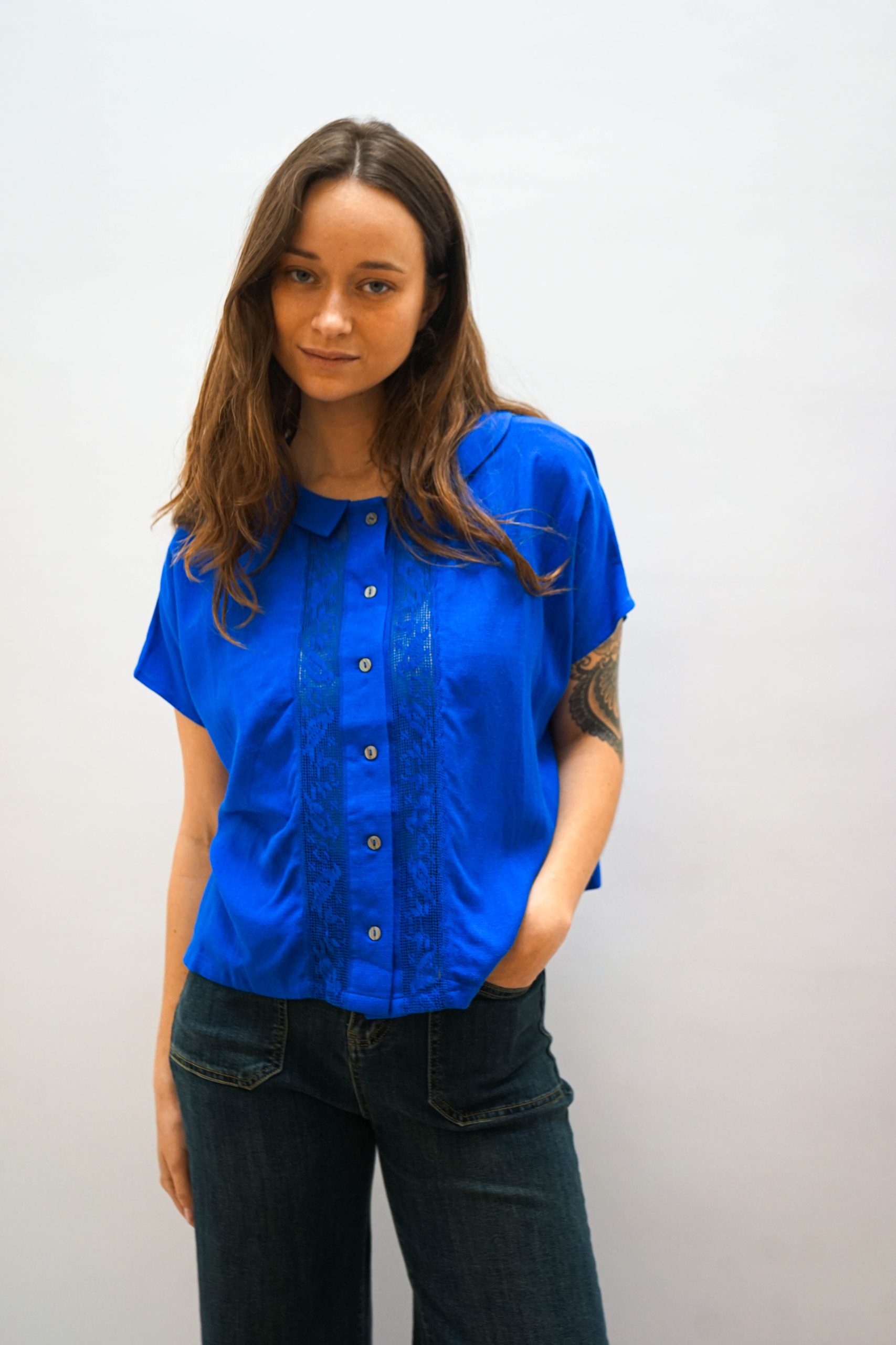 חולצה מכופתרת בגזרה מעט רחוקה מהגוף. בצבע כחול בוהק. צאוורון ייחודי. רכיסת כפתורים לאורך החזית. ופרטי כפלי בד משני צידי הכפתורים ופסי תחרה עדינה . ניתן לשלב עם ג'ינס כיסים מכנסי צבע אבן מכנסי מורי צהובות (למראה צבעוני וייחודי)