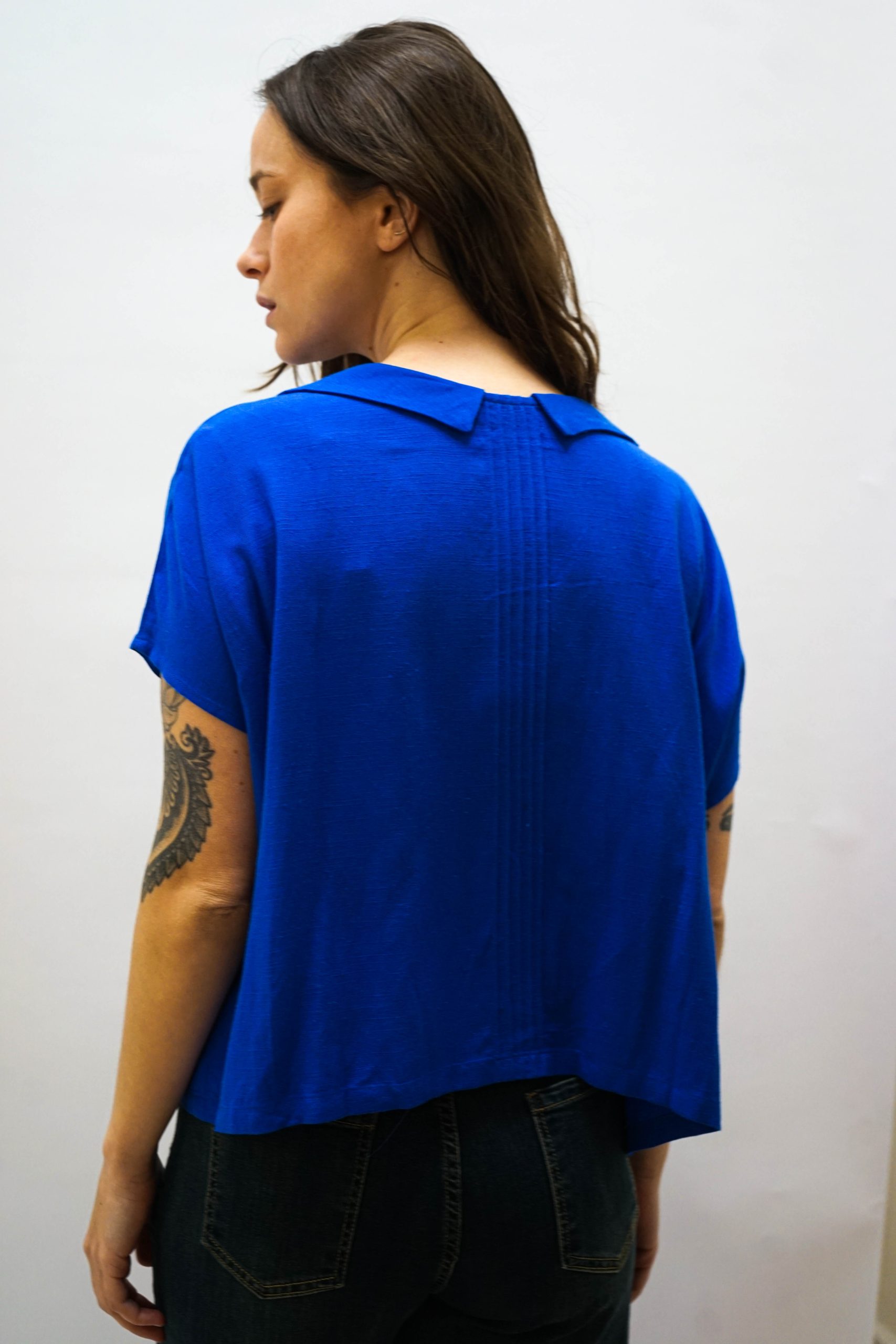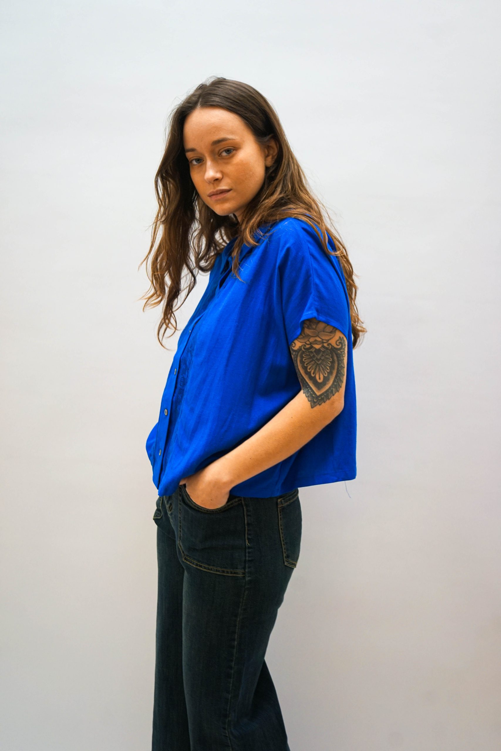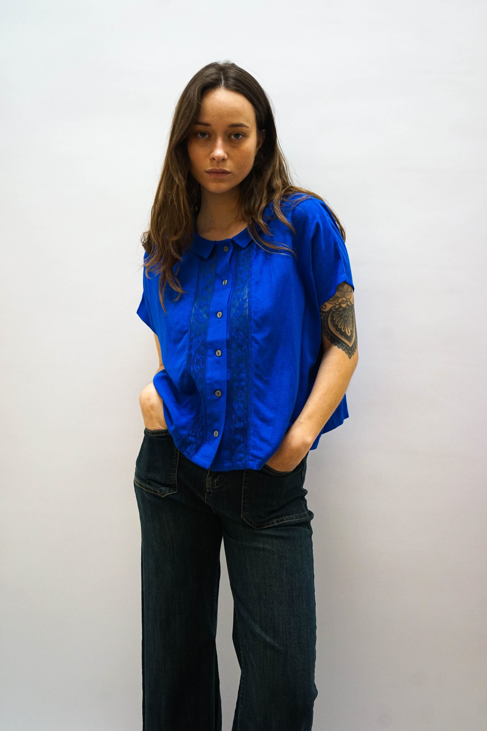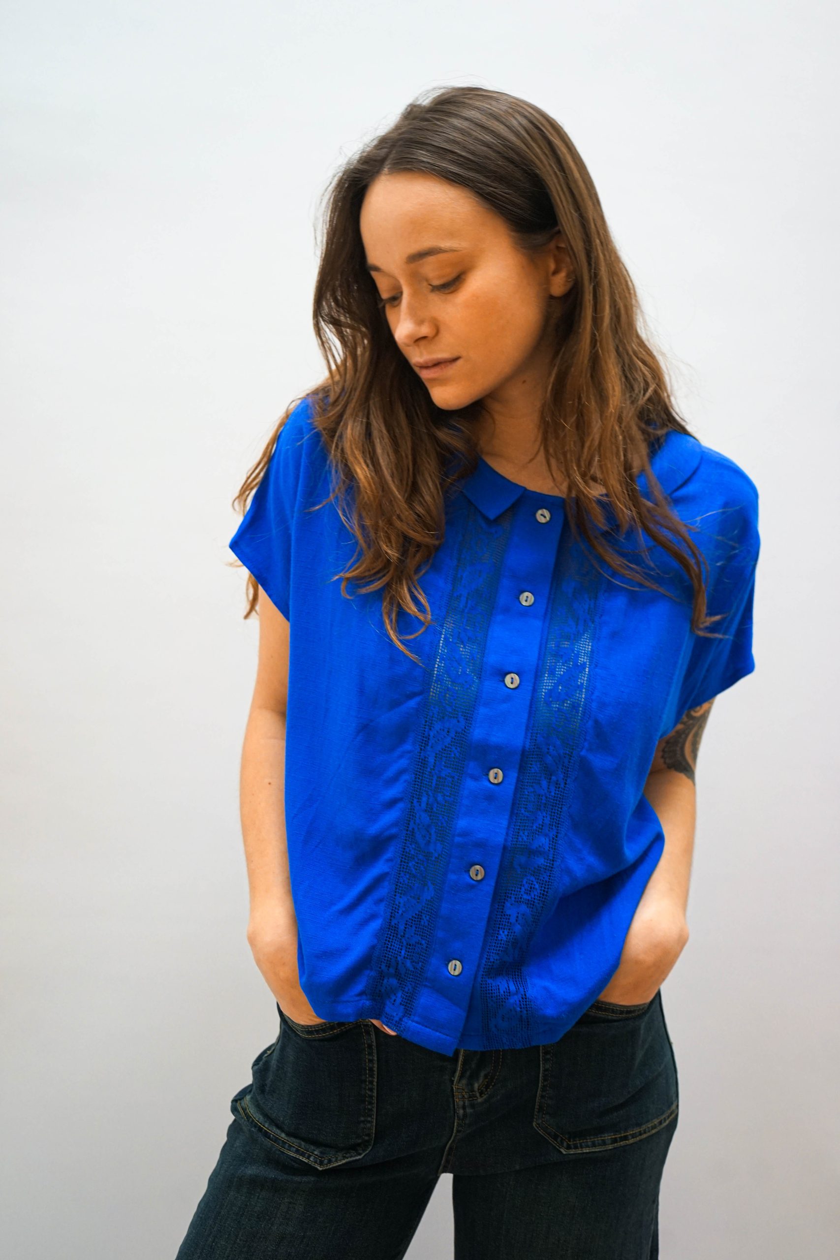 חולצה מכופתרת בגזרה מעט רחוקה מהגוף. בצבע כחול בוהק. צאוורון ייחודי. רכיסת כפתורים לאורך החזית. ופרטי כפלי בד משני צידי הכפתורים ופסי תחרה עדינה . ניתן לשלב עם ג'ינס כיסים מכנסי צבע אבן מכנסי מורי צהובות (למראה צבעוני וייחודי)
