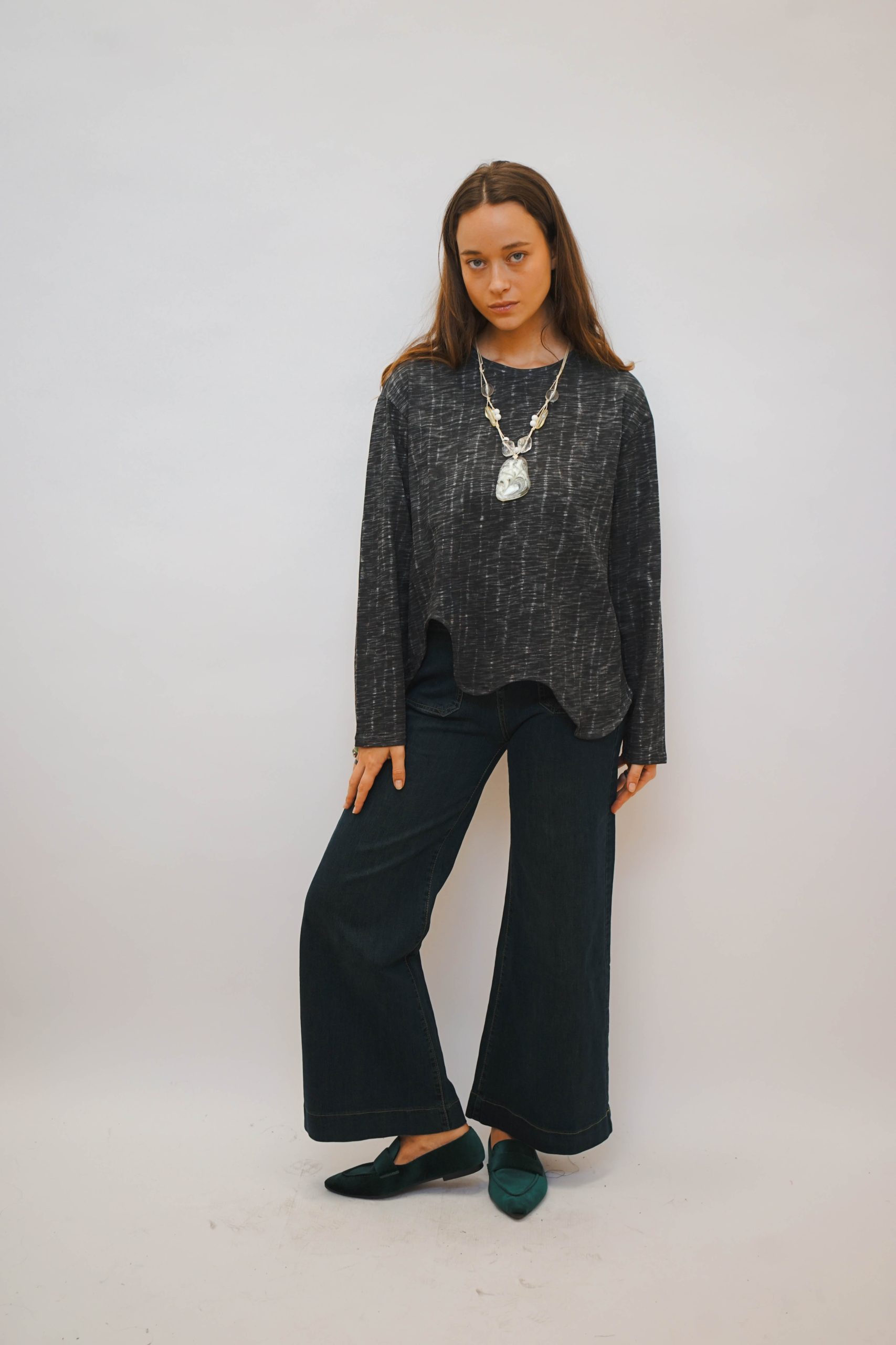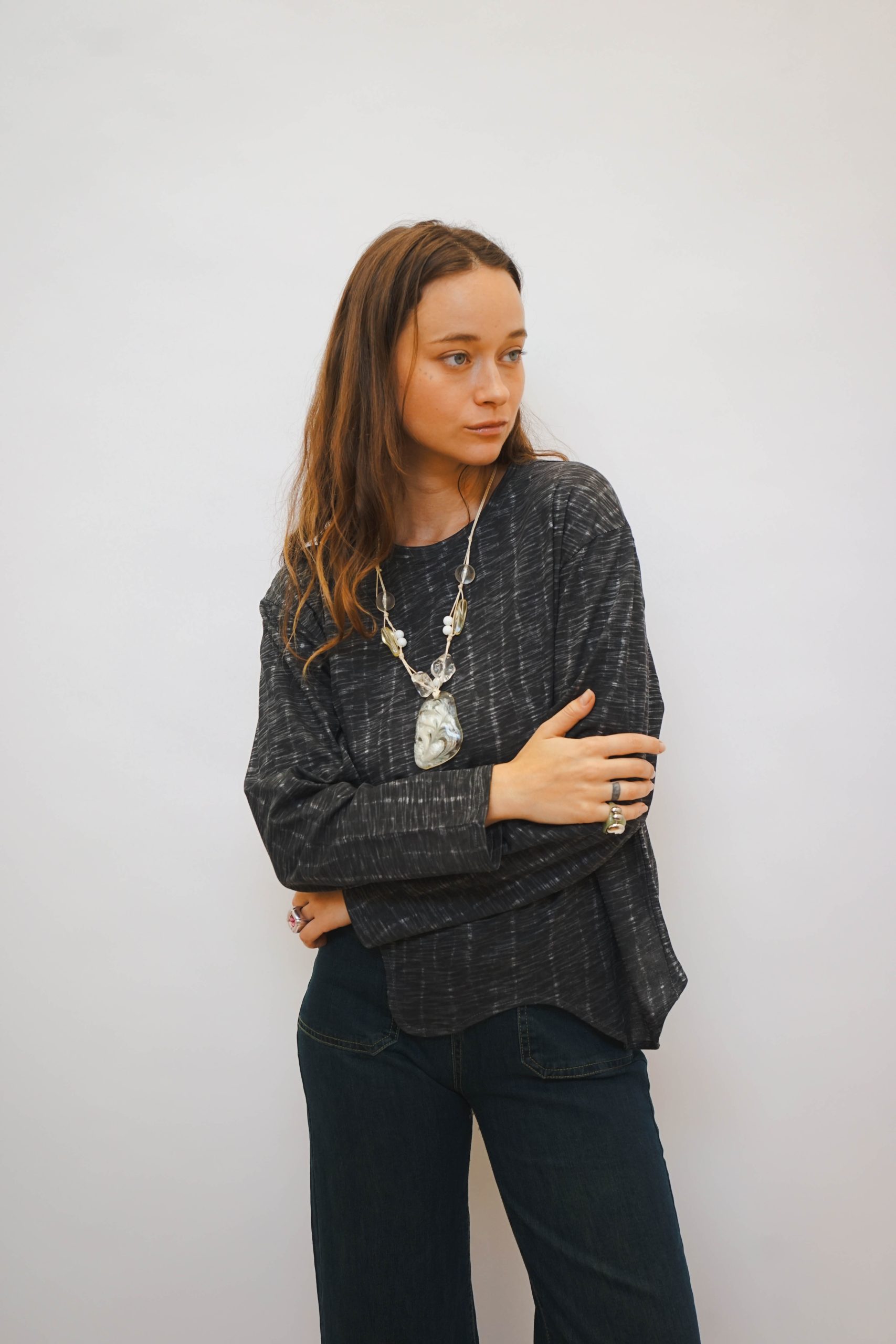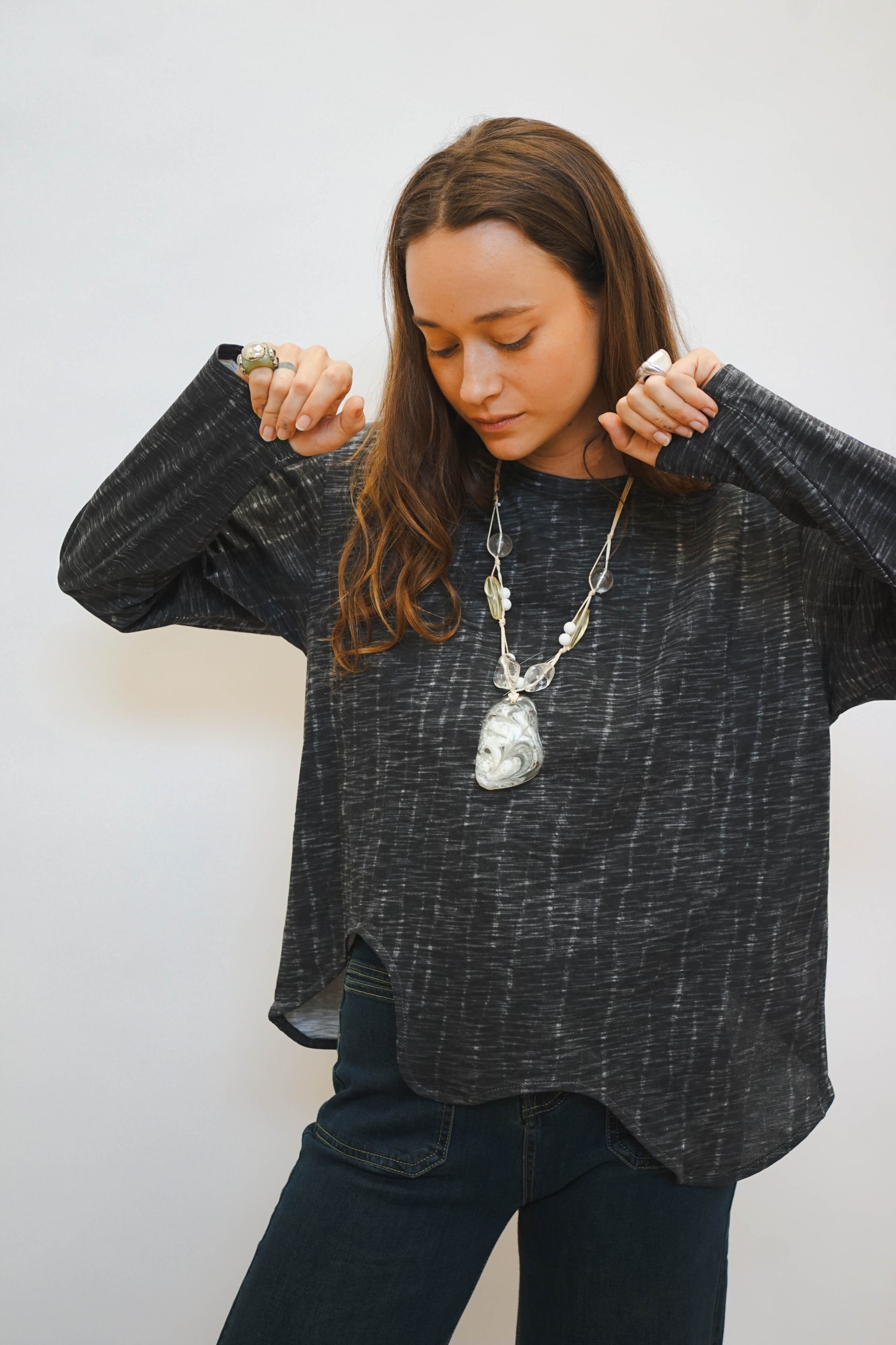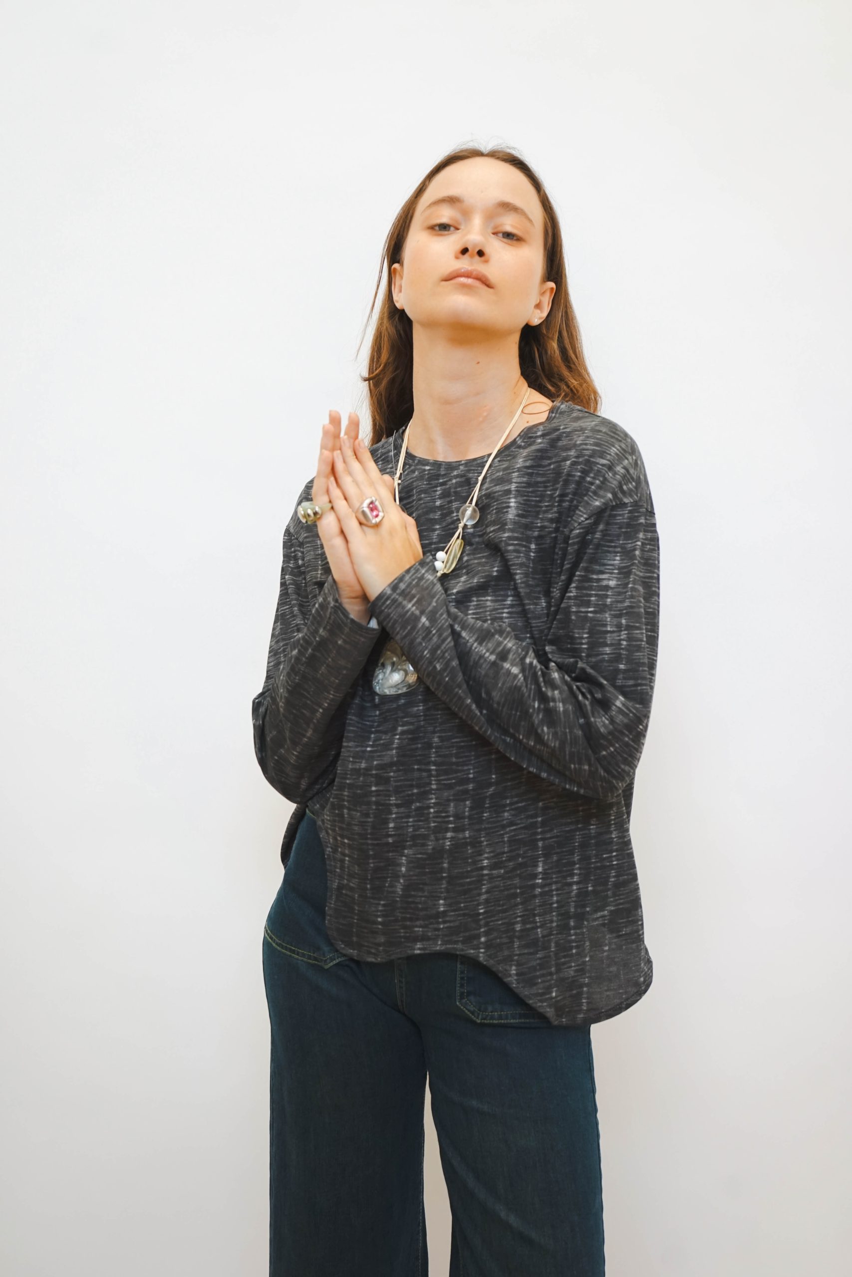חולצת טישרט ארוכה 100% כותנה בצבע אפור ווש ייחודיות ומגניבות עם ג'ינס או מכנסיים בכל צבע או חצאית וג'קט. סיומת גלית לחולצה אורך קצר 50 אורך ארוך 62 היקף 110