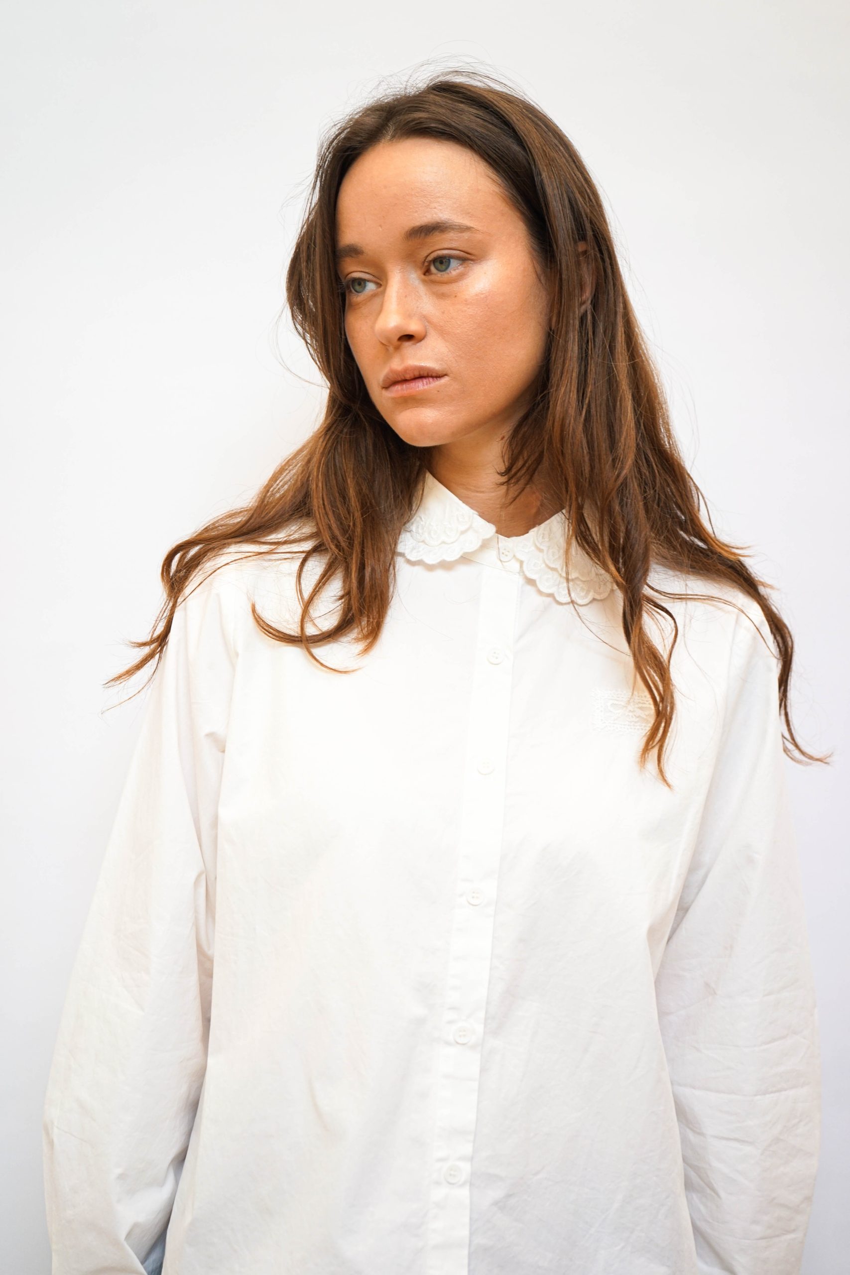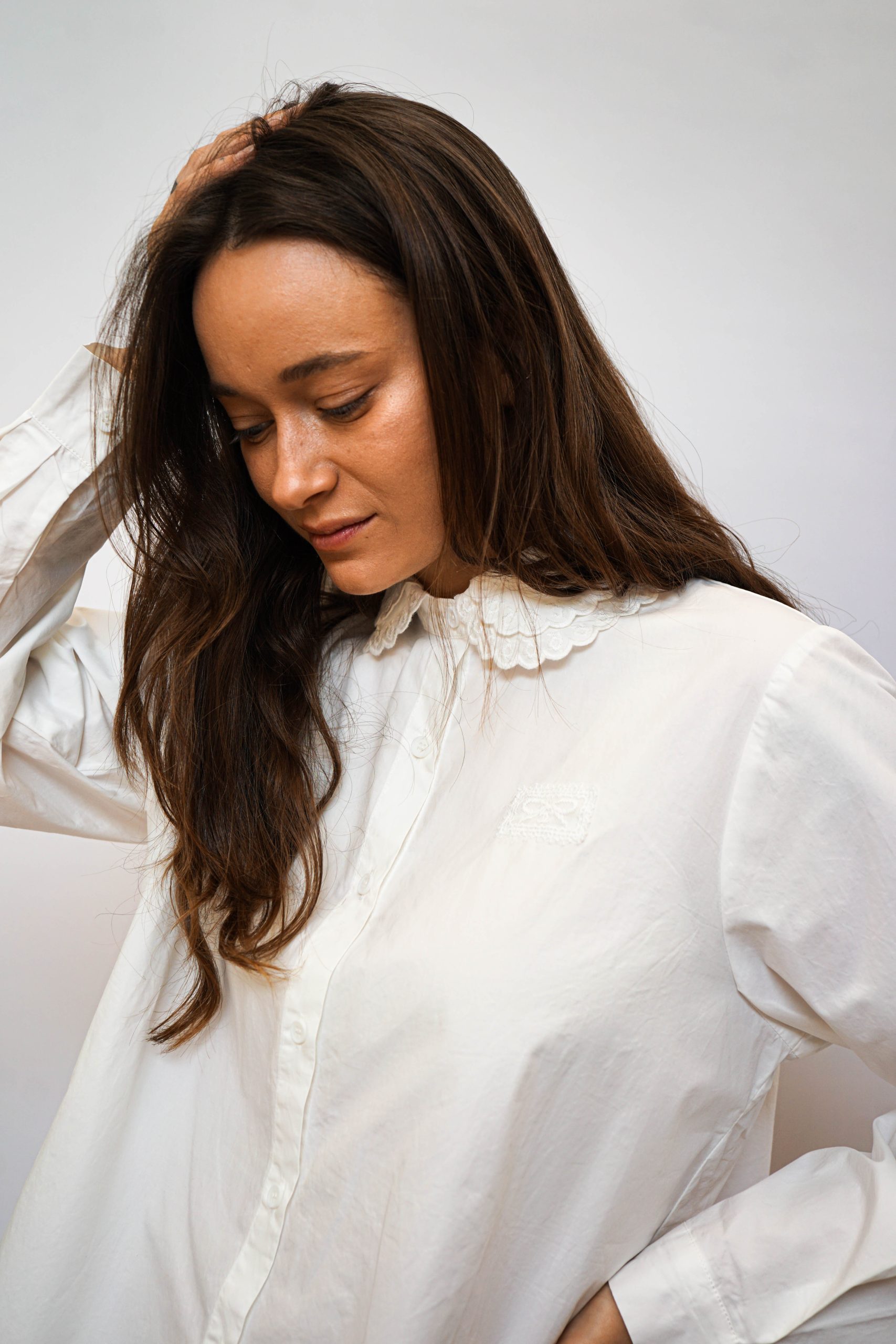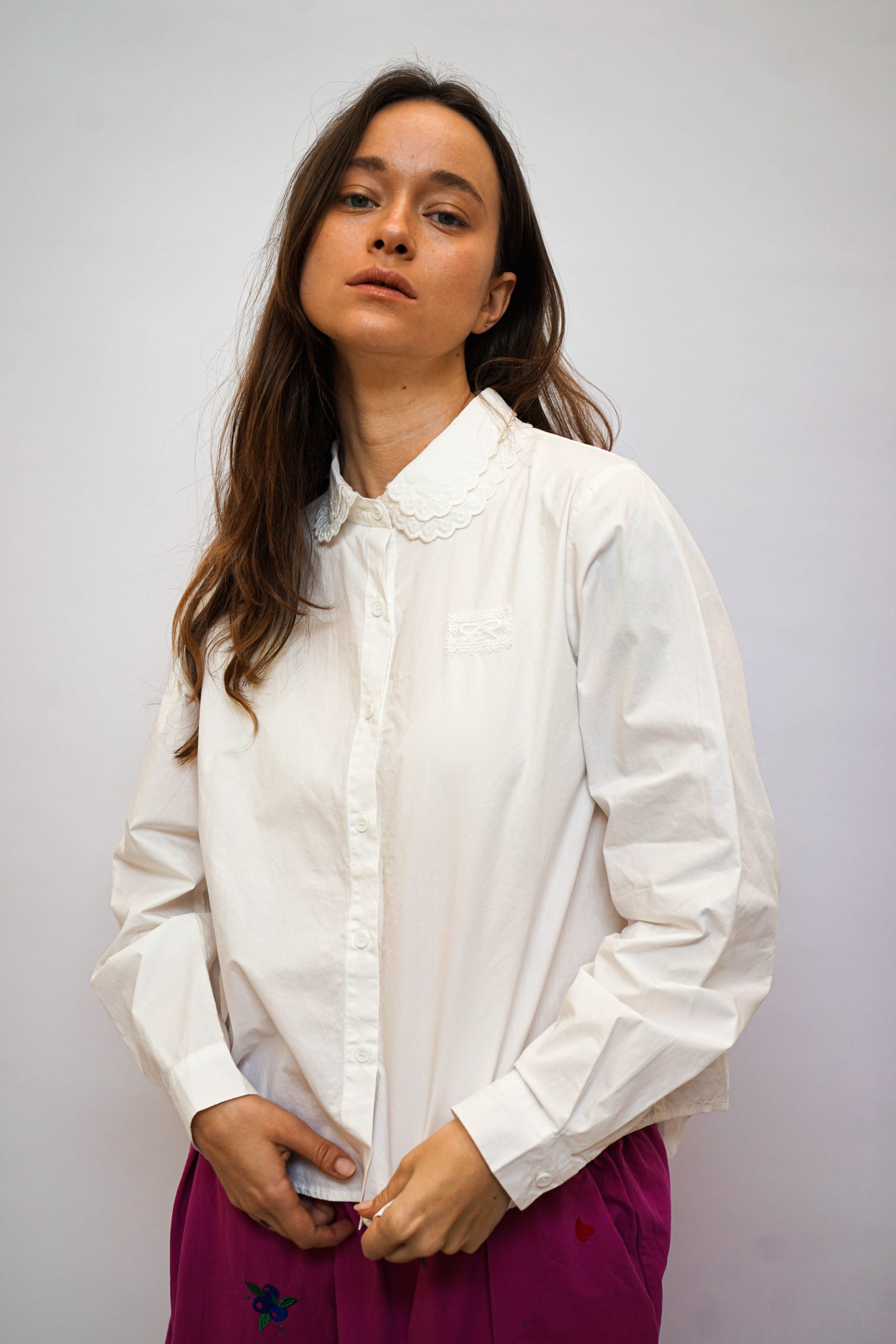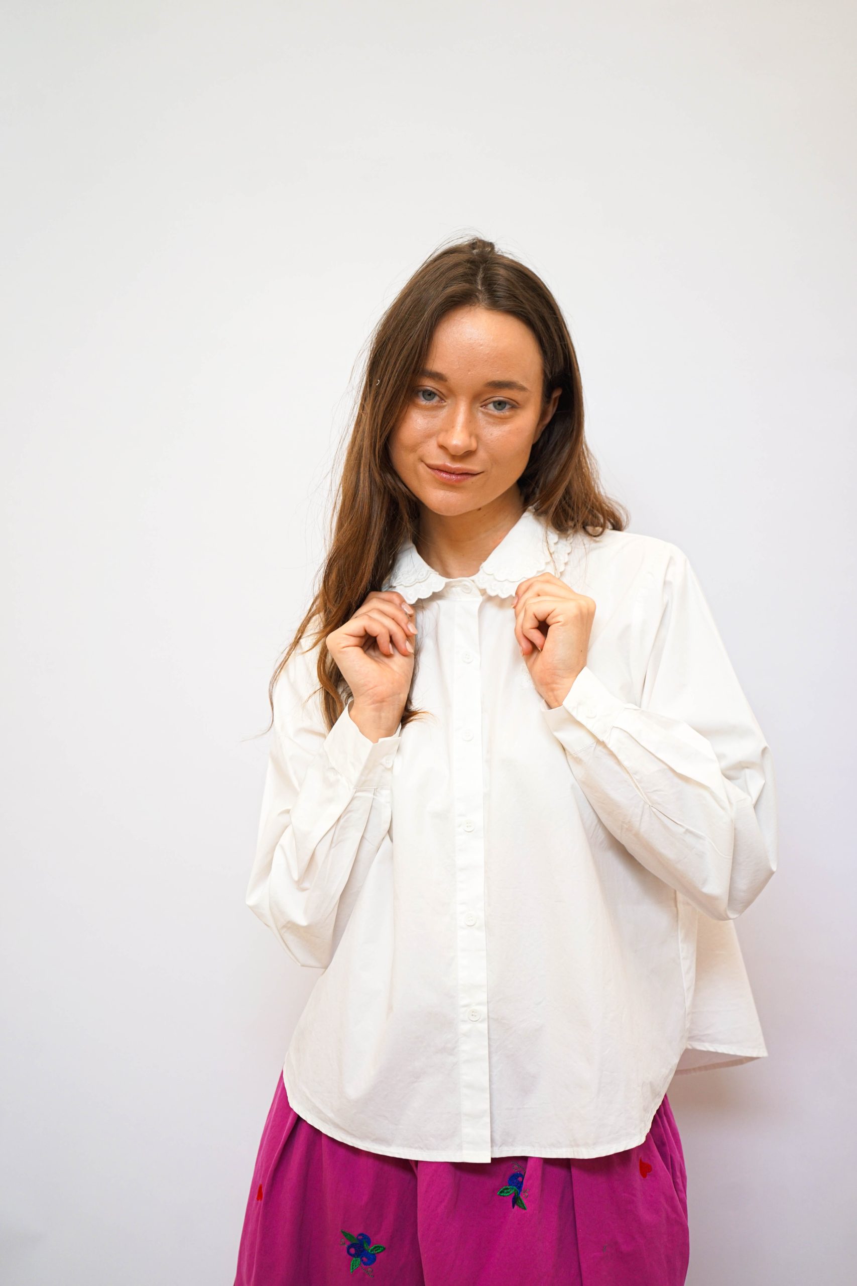 חולצה מכפותרת עם צווארון תחרה כפול פפיון תחרה מוטבע בצד 100% כותנה מושלמת לערב חג או אפילו סתם ככה למשרד בגזרה רחוקה מעט מהגוף עם כפתורים לכל אורכה אורך 57/65 היקף 110