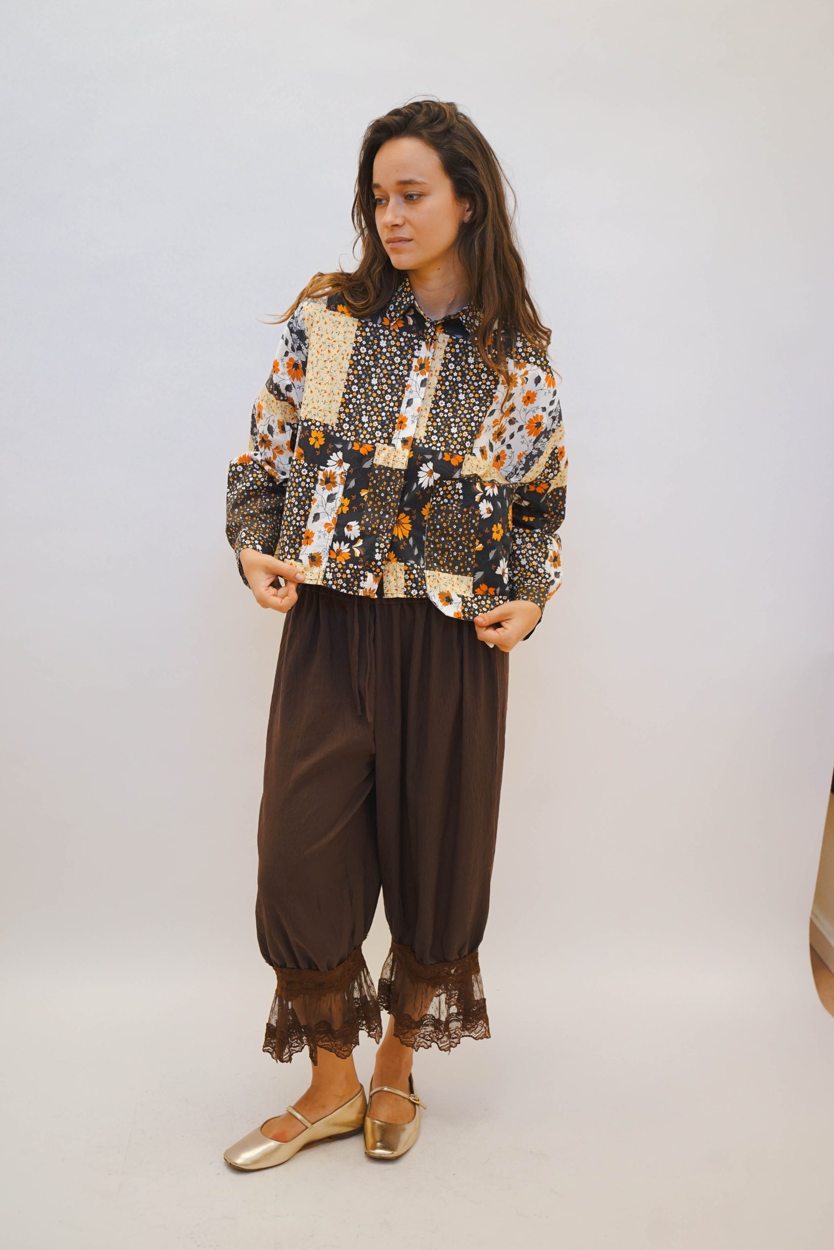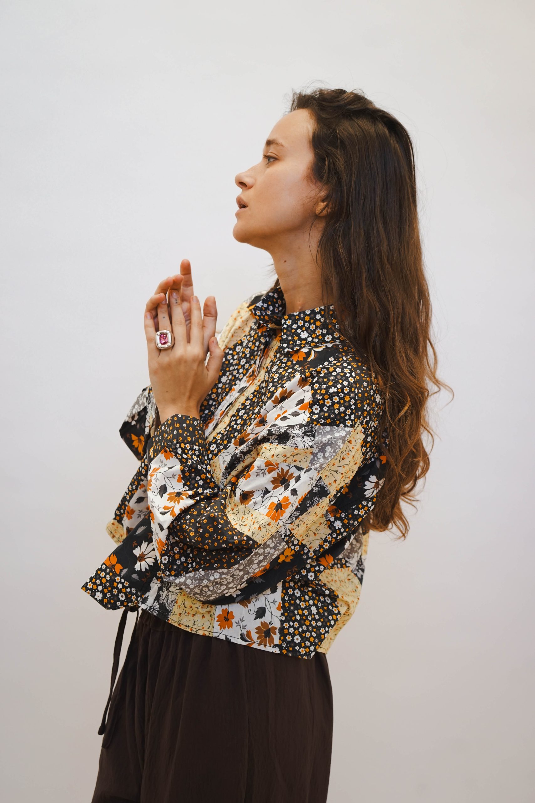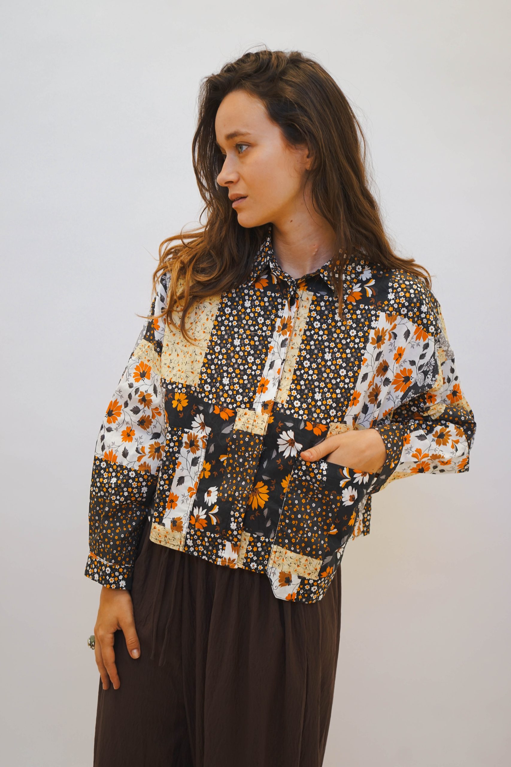 חולצת כפתורים 100% כותנה במראה קליל כפתורים הדפס פרחוני צווארון במראה טלאים בגיזרת 2 כיסים בפרונט (אסימטרי) בגיזרה רחוקה מעט מהגוף