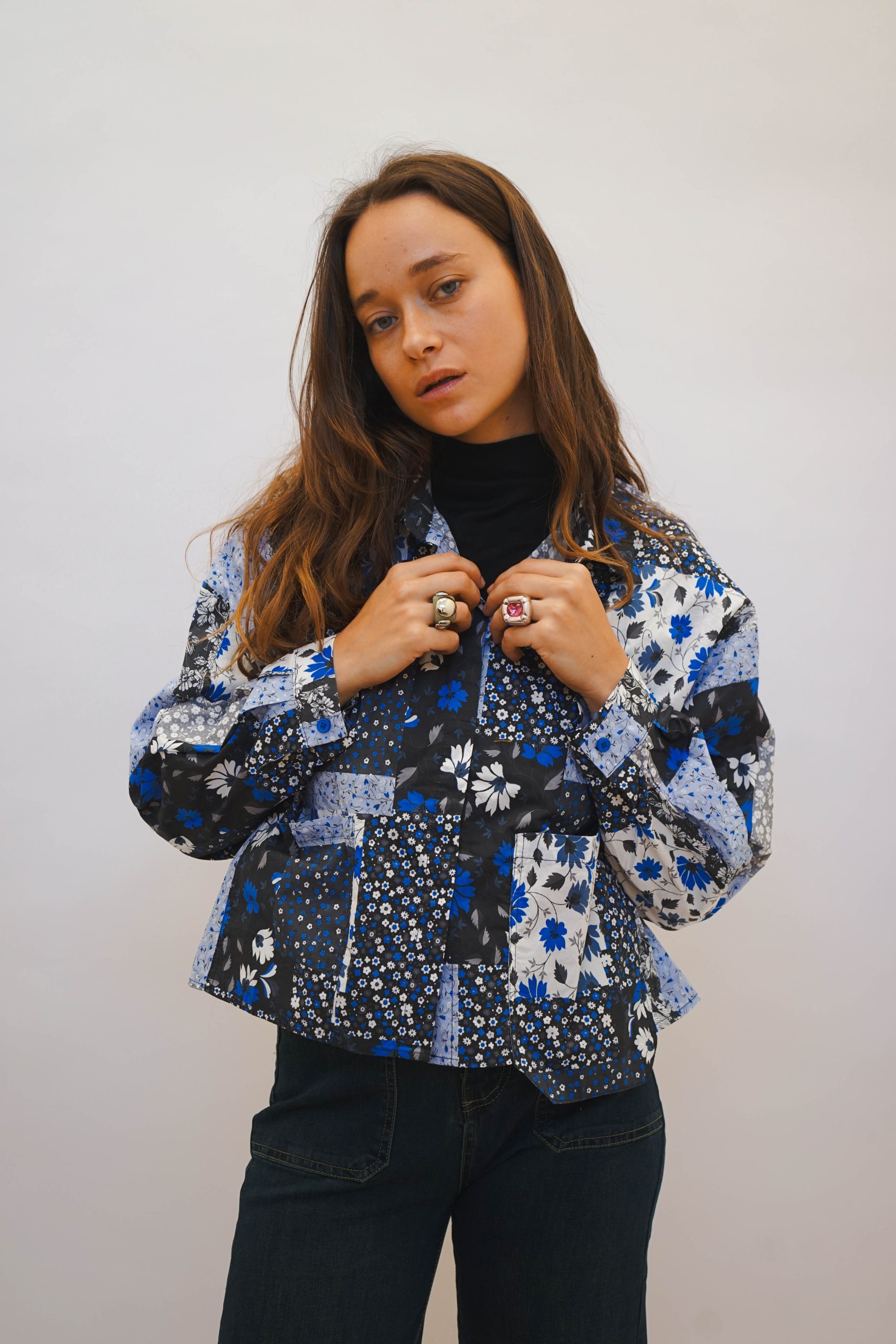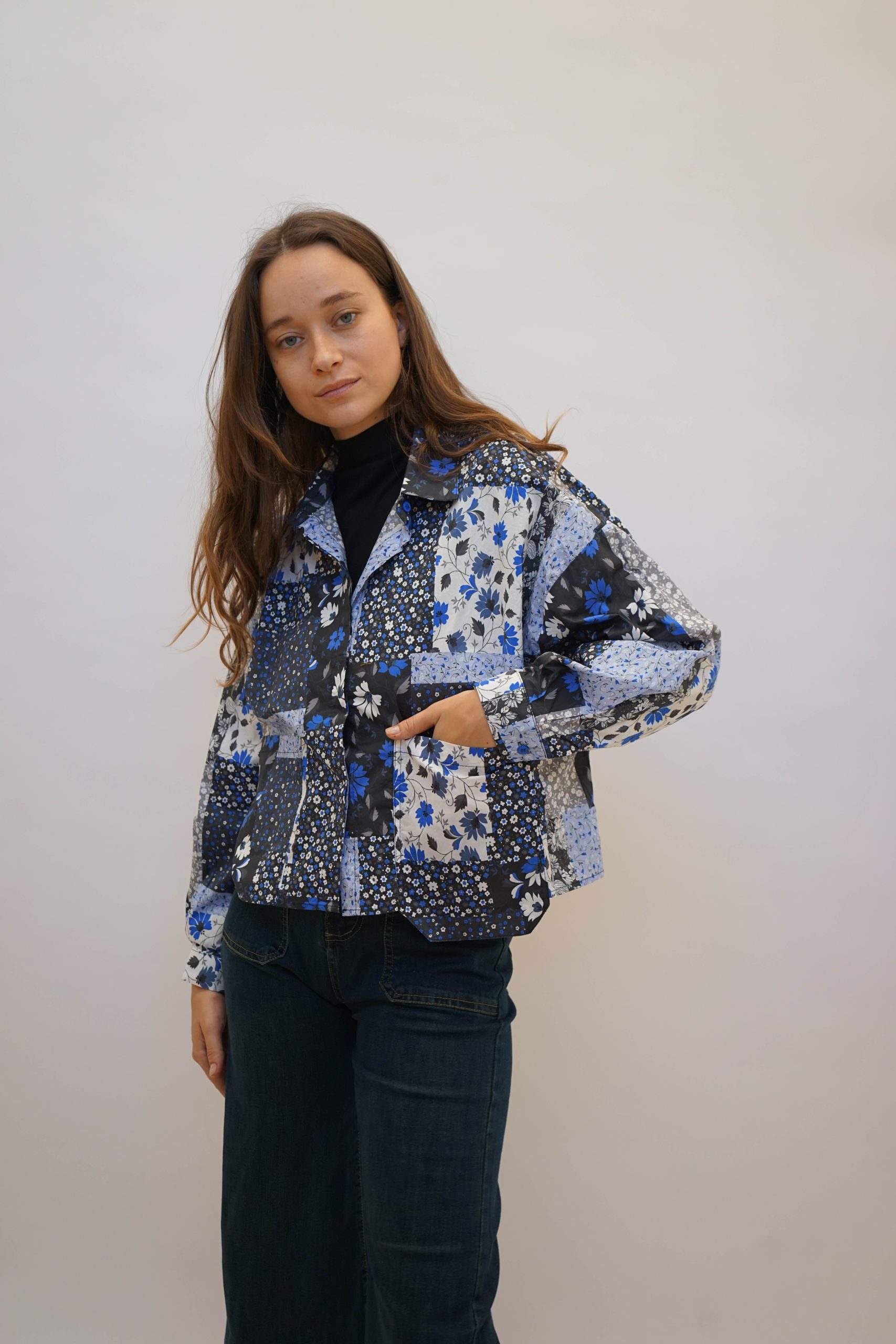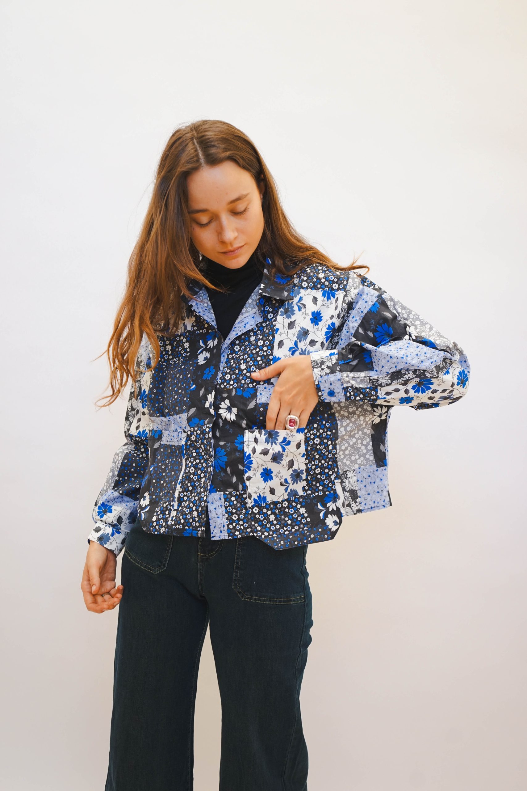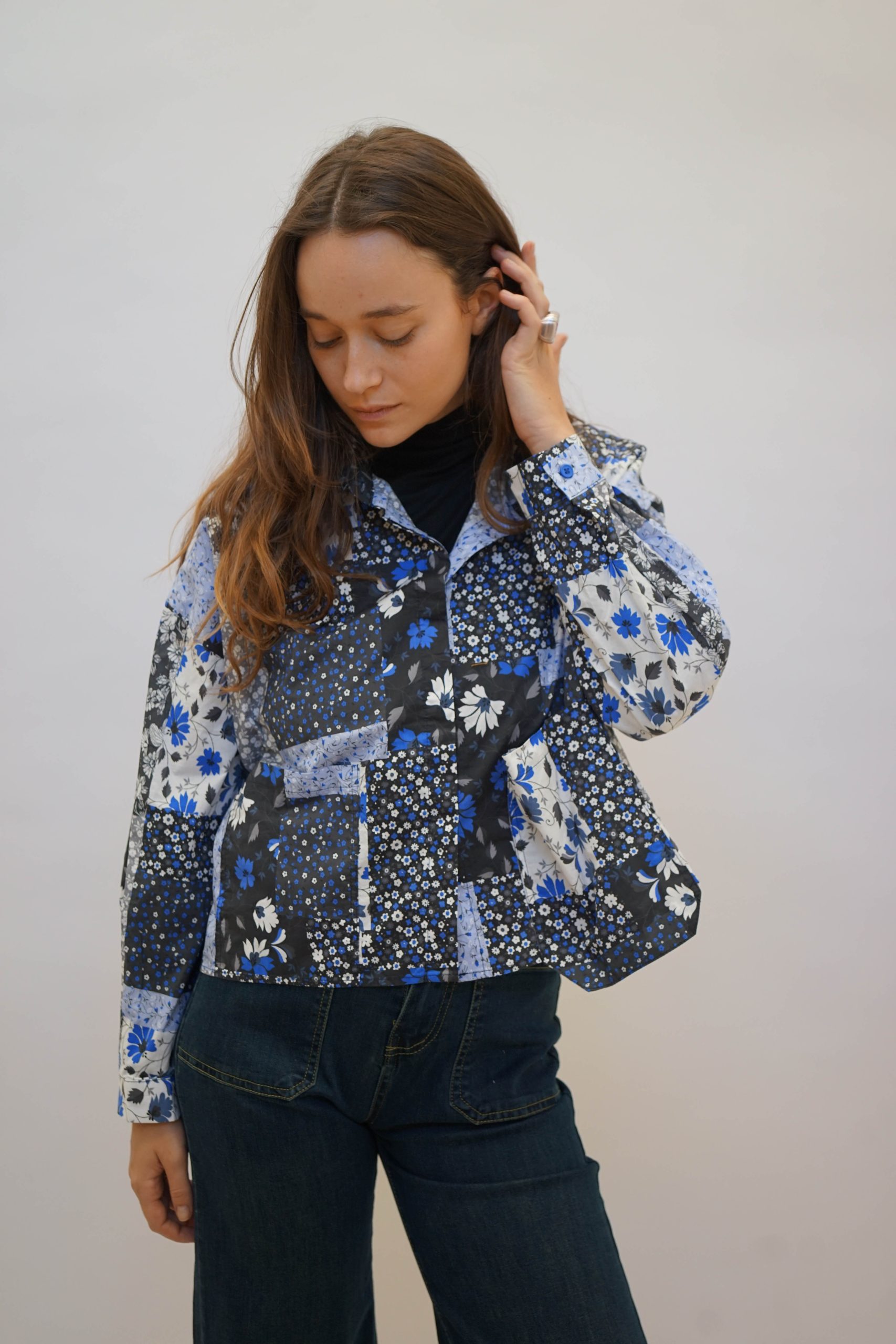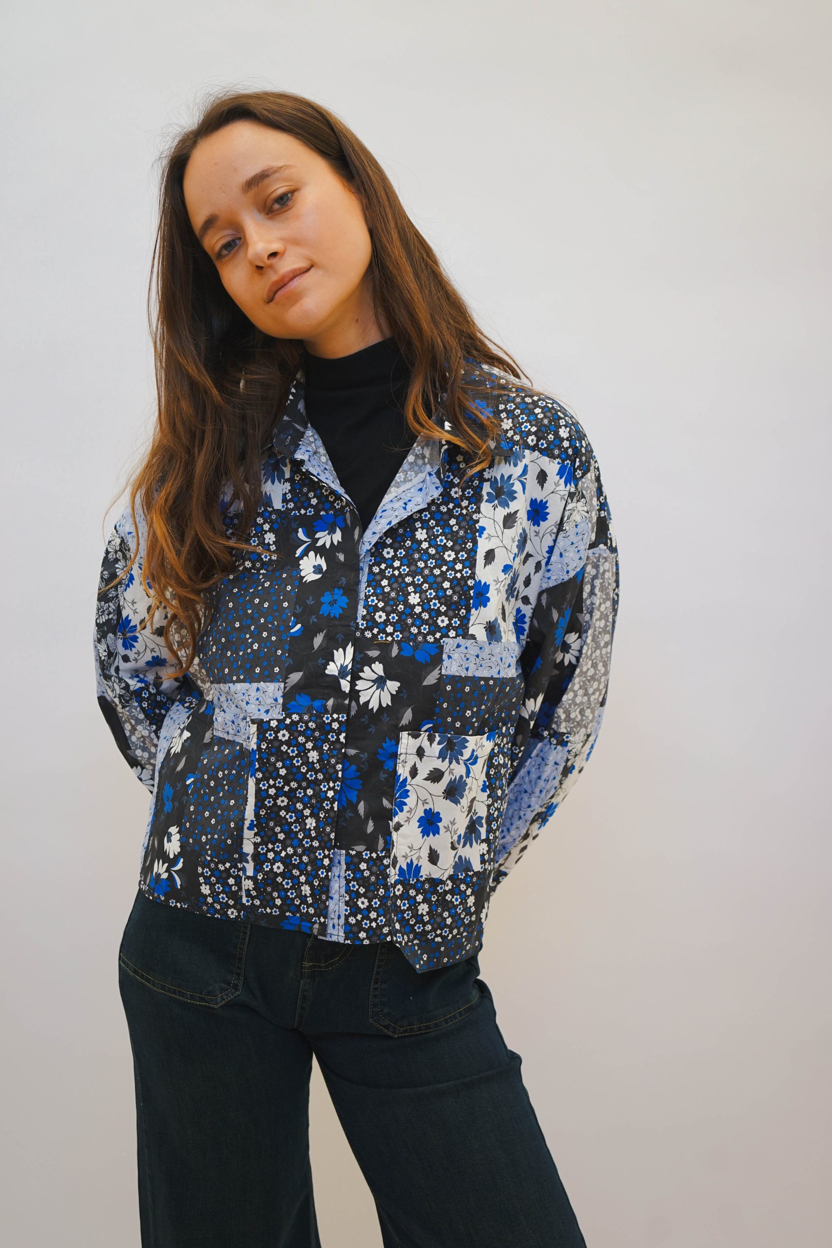 חולצת כפתורים 100% כותנה במראה קליל כפתורים הדפס פרחוני צווארון במראה טלאים בגיזרת 2 כיסים בפרונט (הכיסים אסימטרי מעט) בגיזרה רחוקה מעט מהגוף יכולה להתאים למראה יום יומי עם ג'ינס. או מכנסים מחויטים למשרד. חצאית בגזרת צינור או נשפכת אורך 55 היקף 130