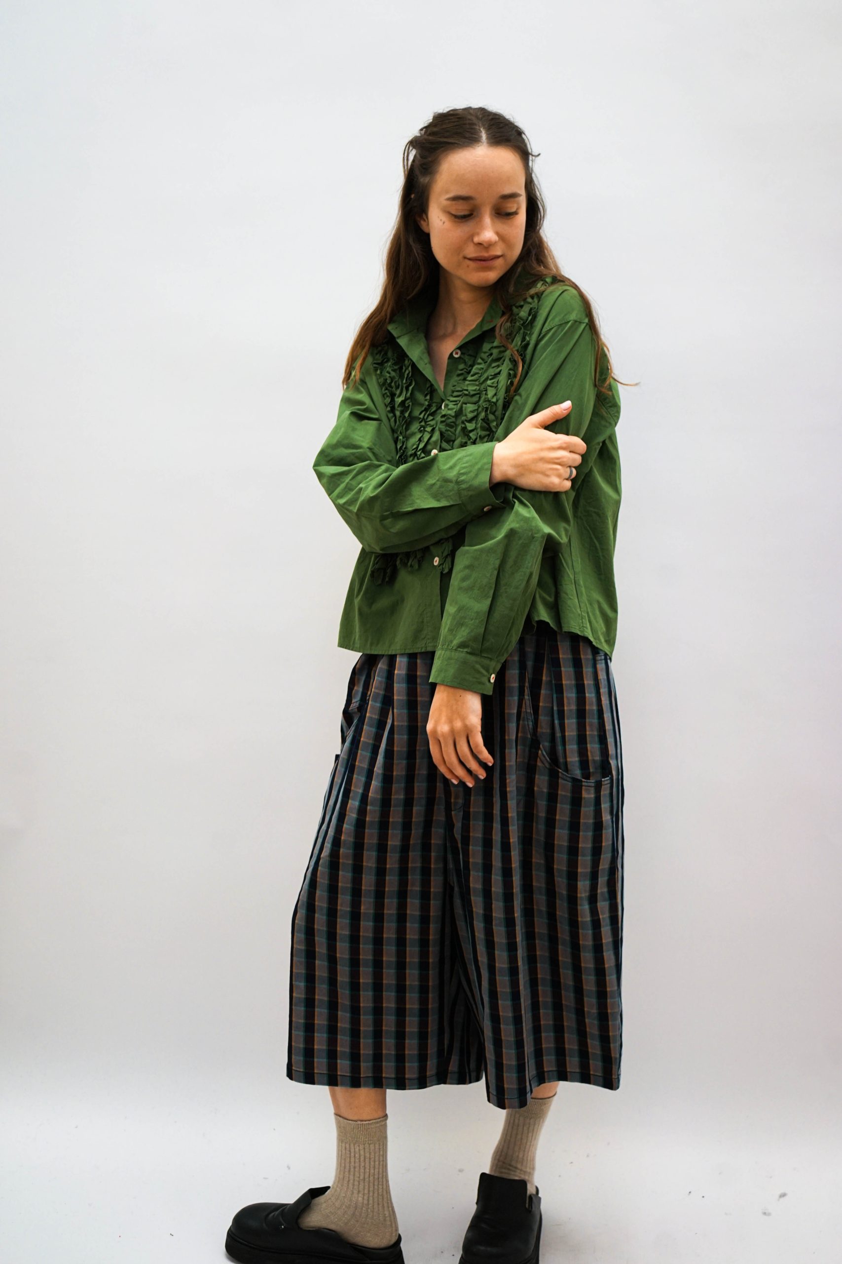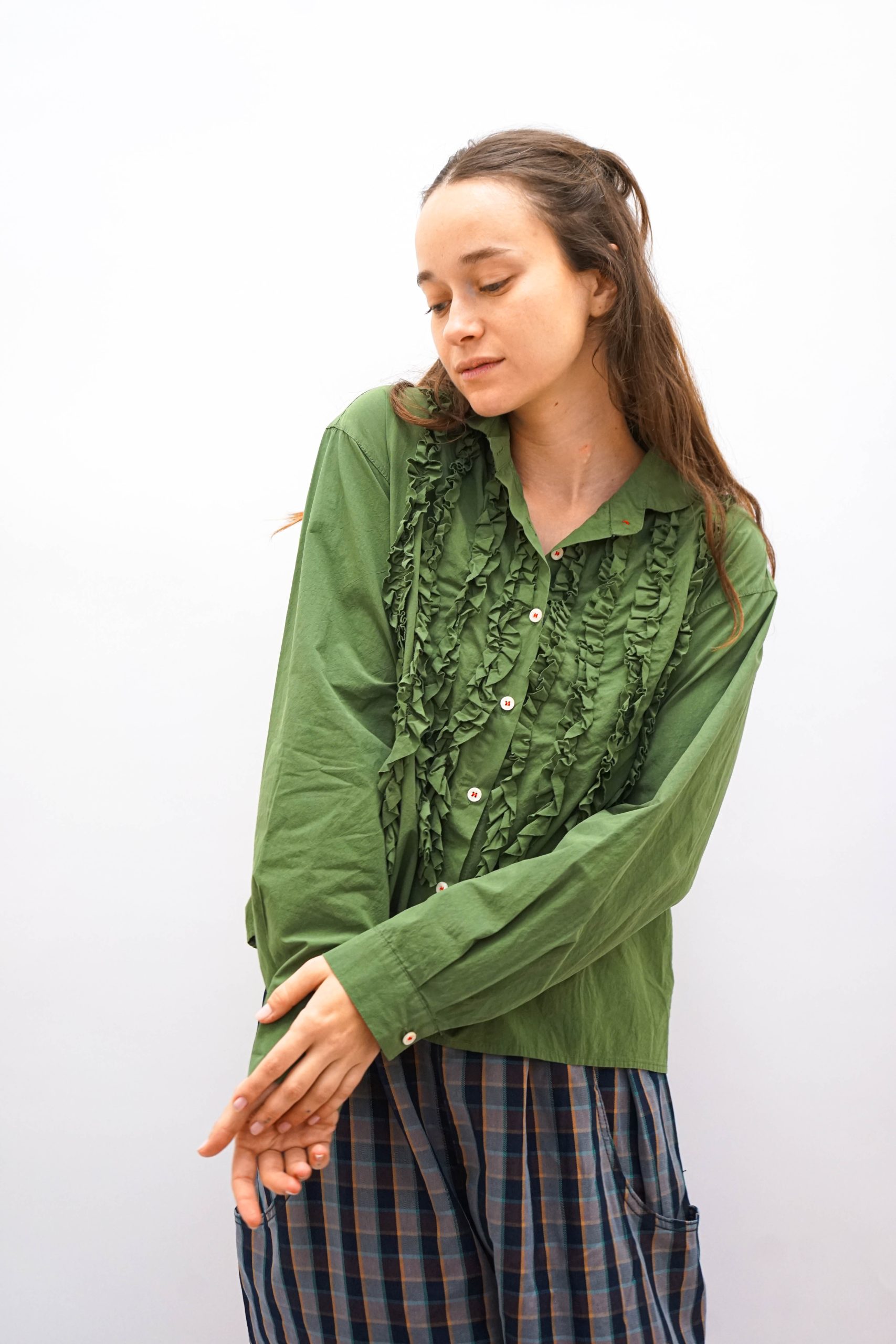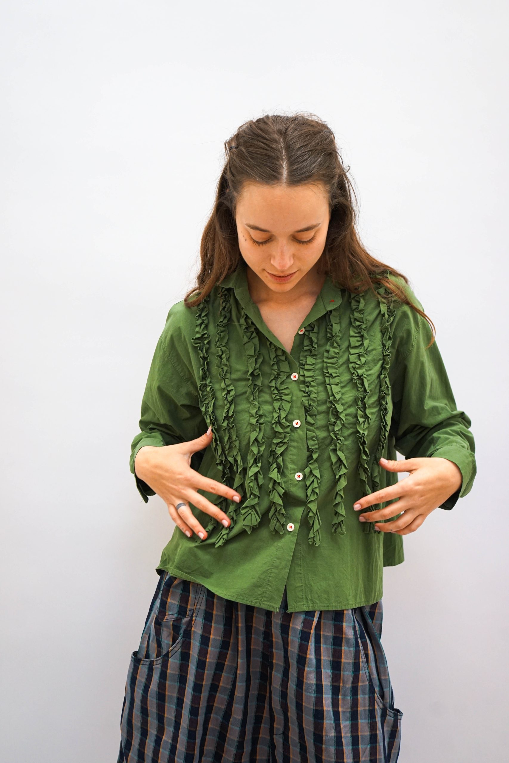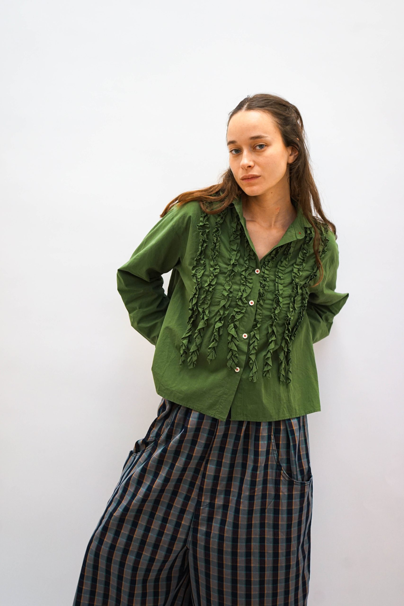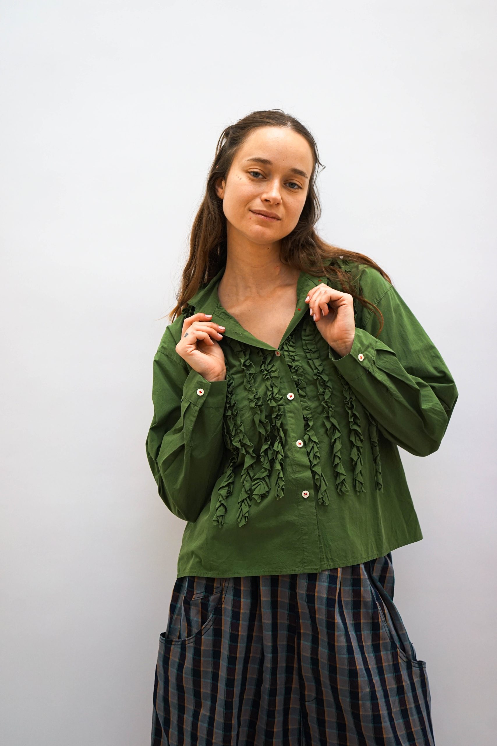 חולצת כפתורים קלילה עם עיטורי מלמלה מגיעה בשלושה צבעים במראה רחוק מעט מהגוף במראה וינטאג' סטריט גזרה רחוקה מעט מהגוף יפה במראה טוטאל לוק ג'ינס או עם כל מכנסים או חצאית בצבע אורך היקף