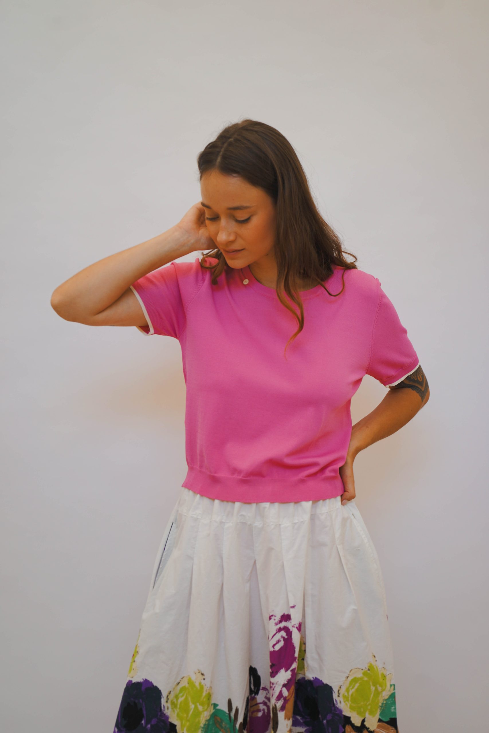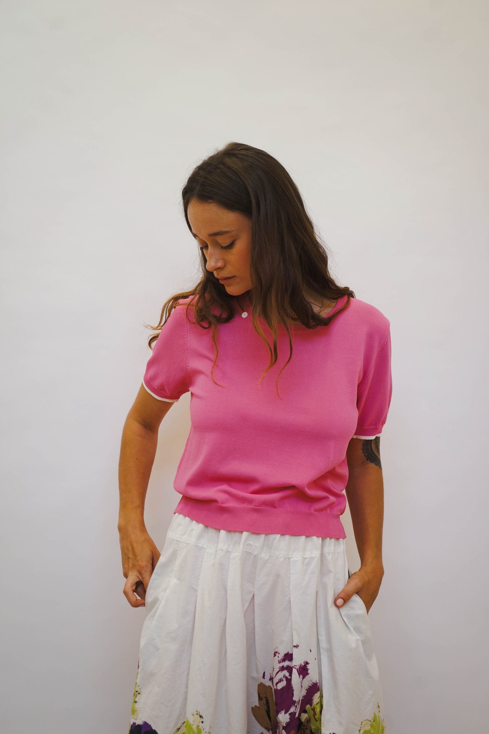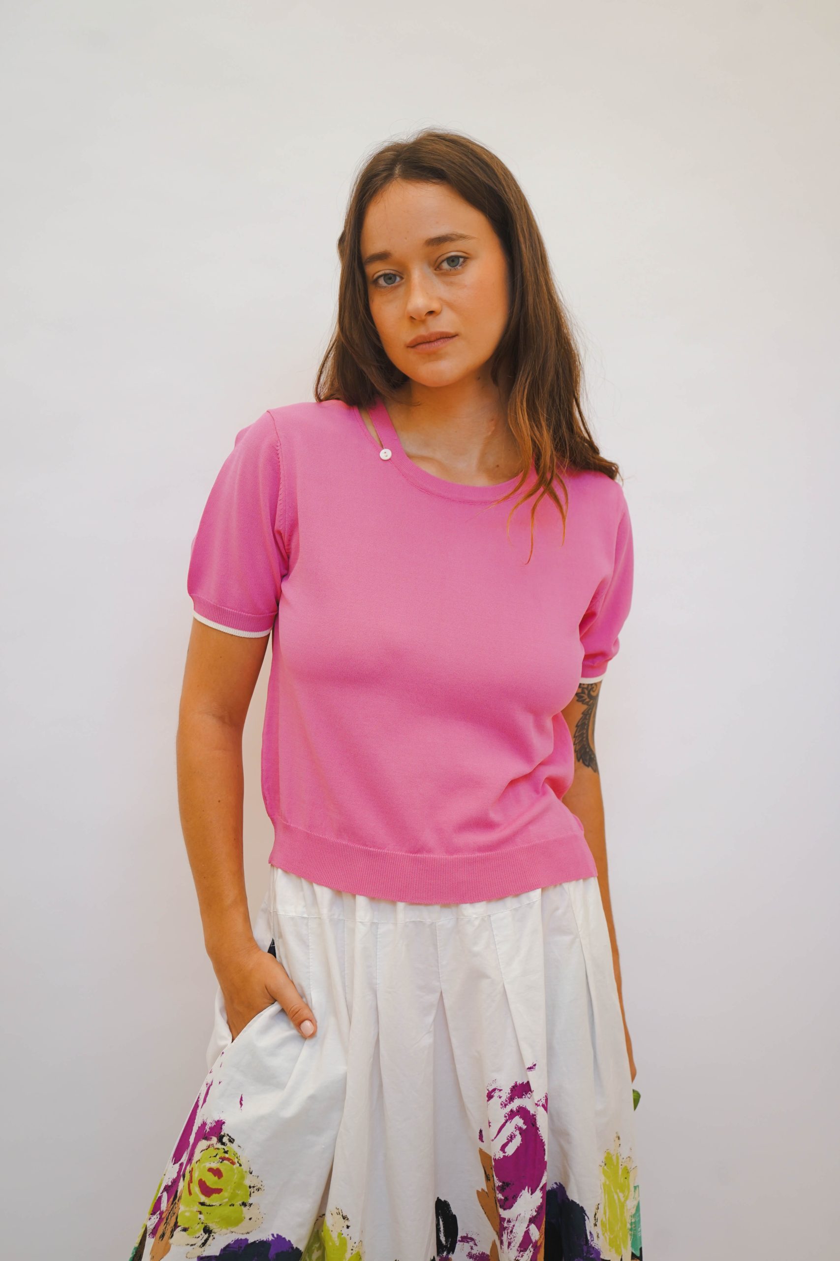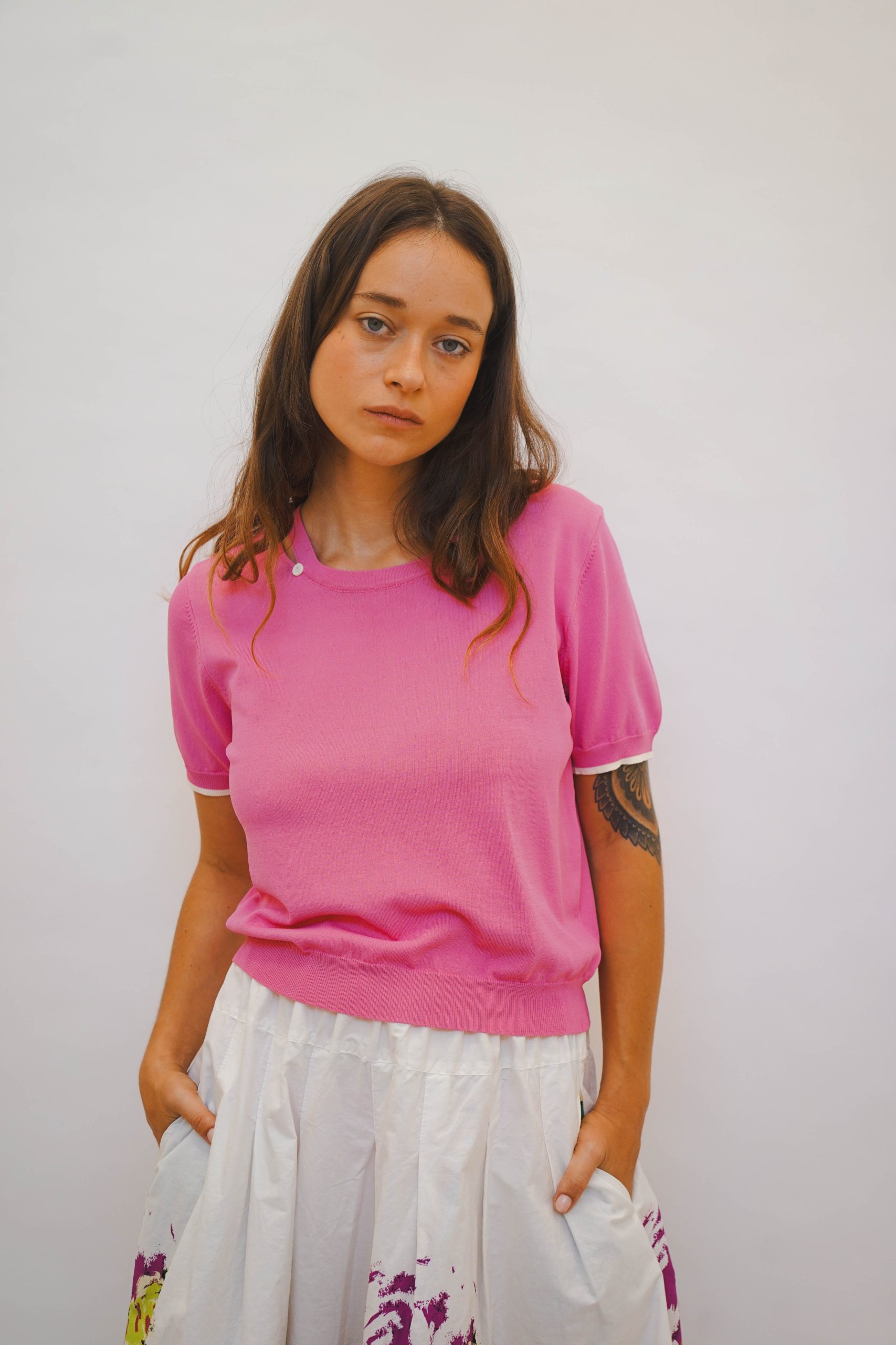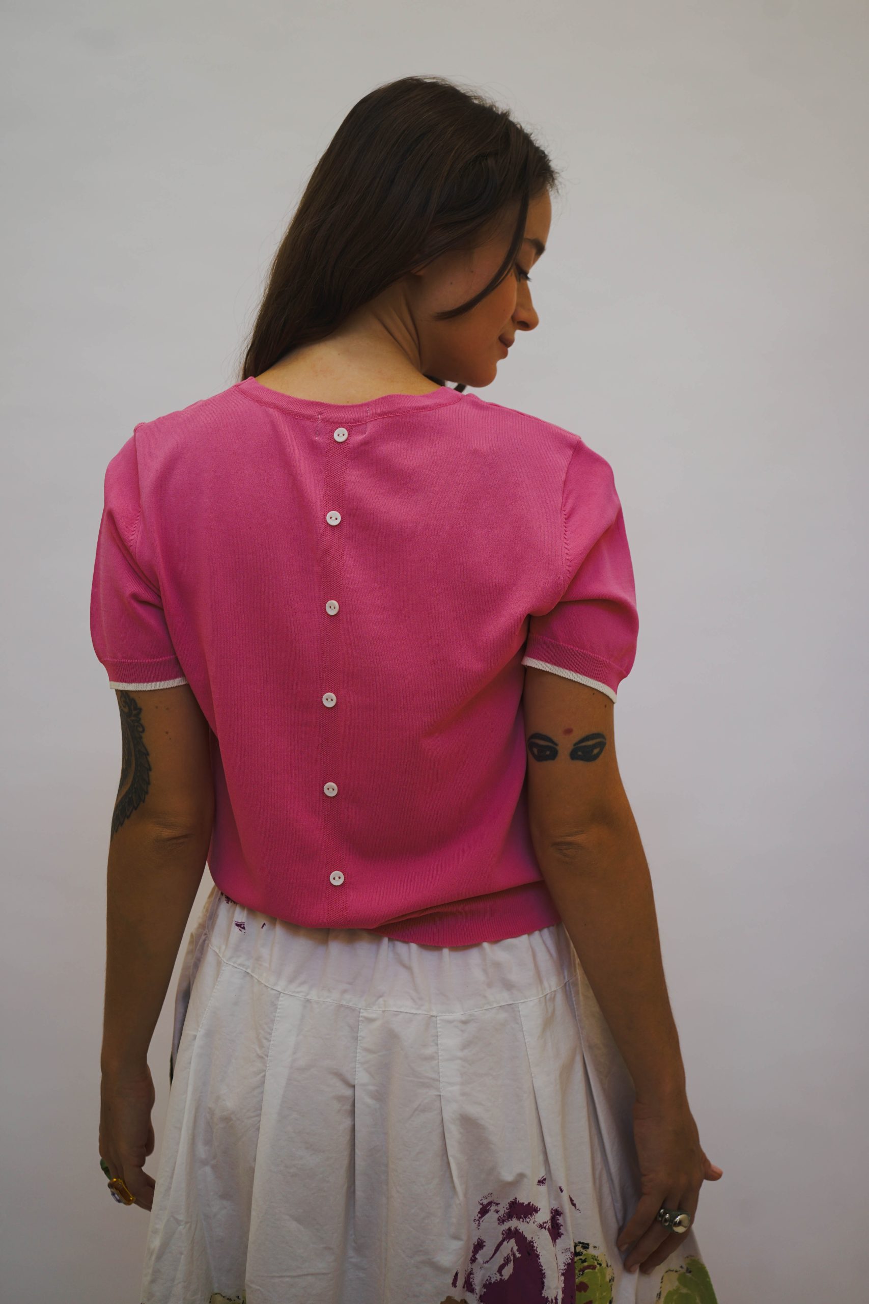 חולצת סריג דק עם כפתורים בגב, במראה סקול גירל. יכולה להתאים למראה יום יומי עם ג'ינס. או מכנסים מחויטים למשרד.בצד ימין כפתור קטן עם חרך עדין