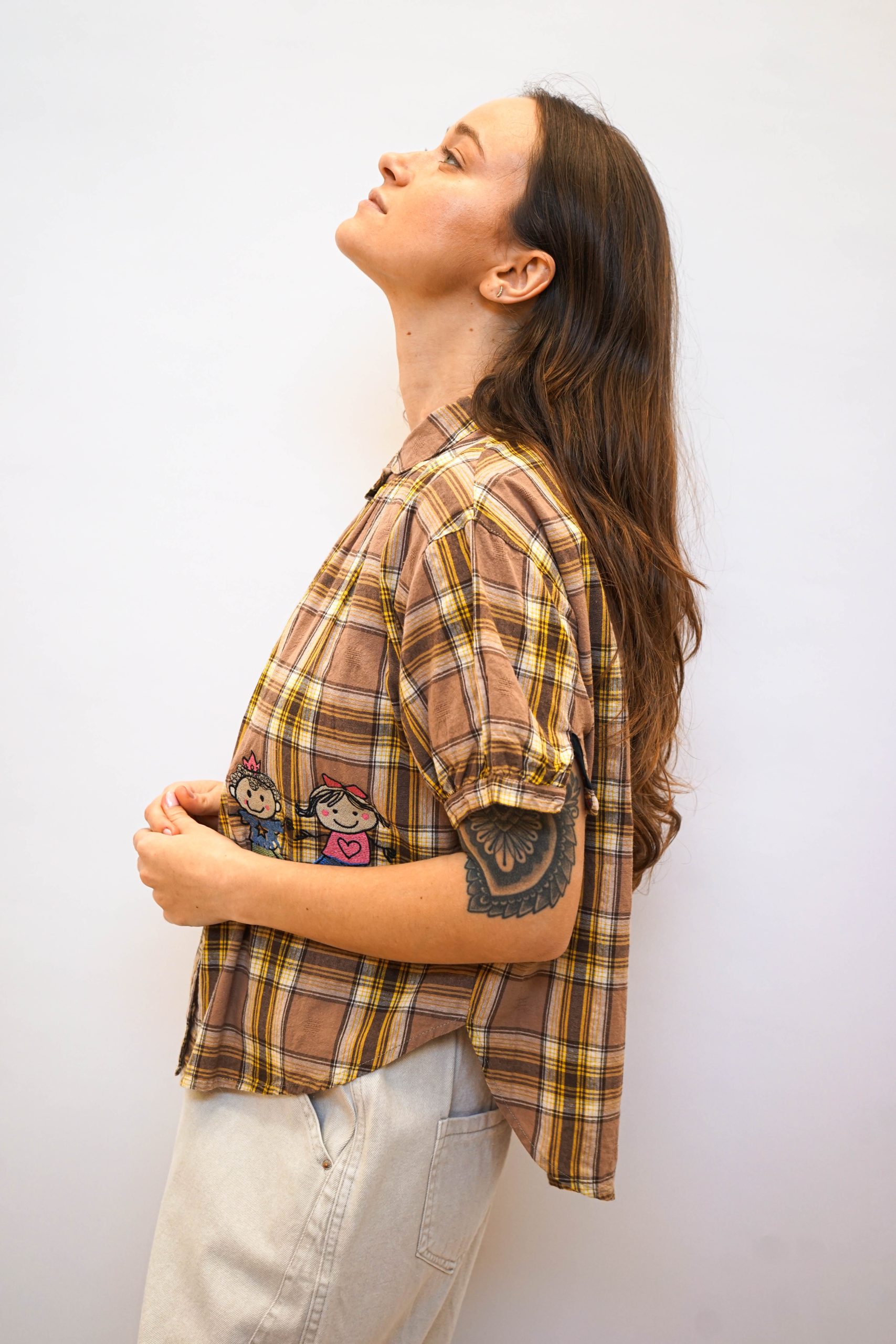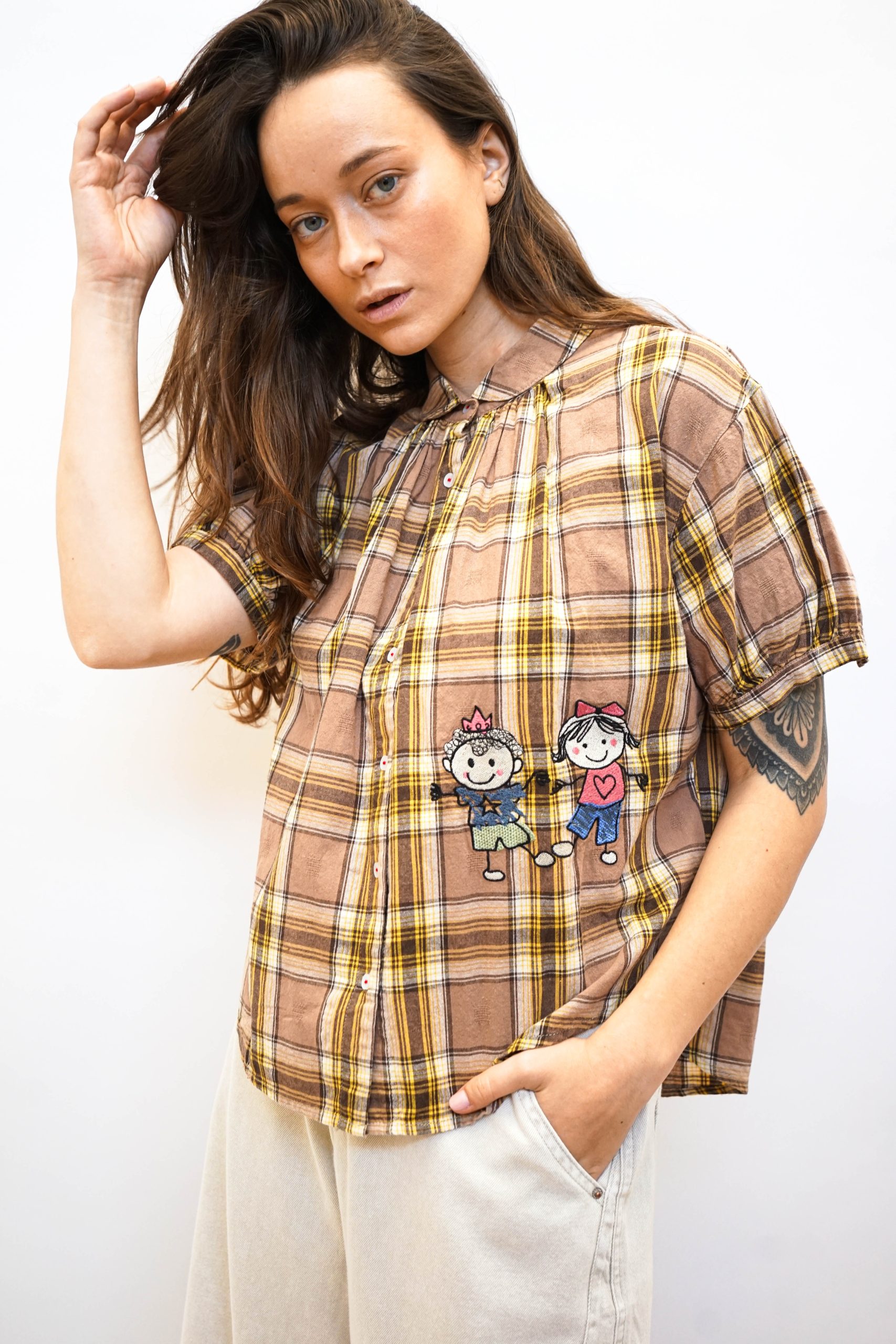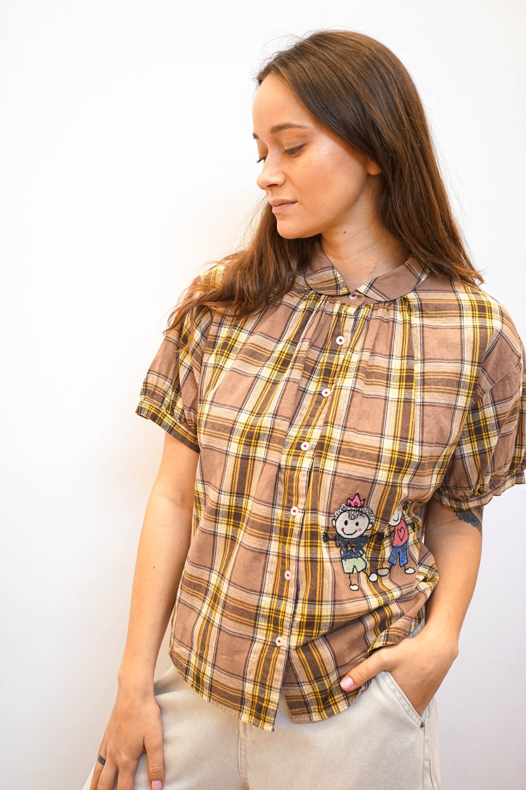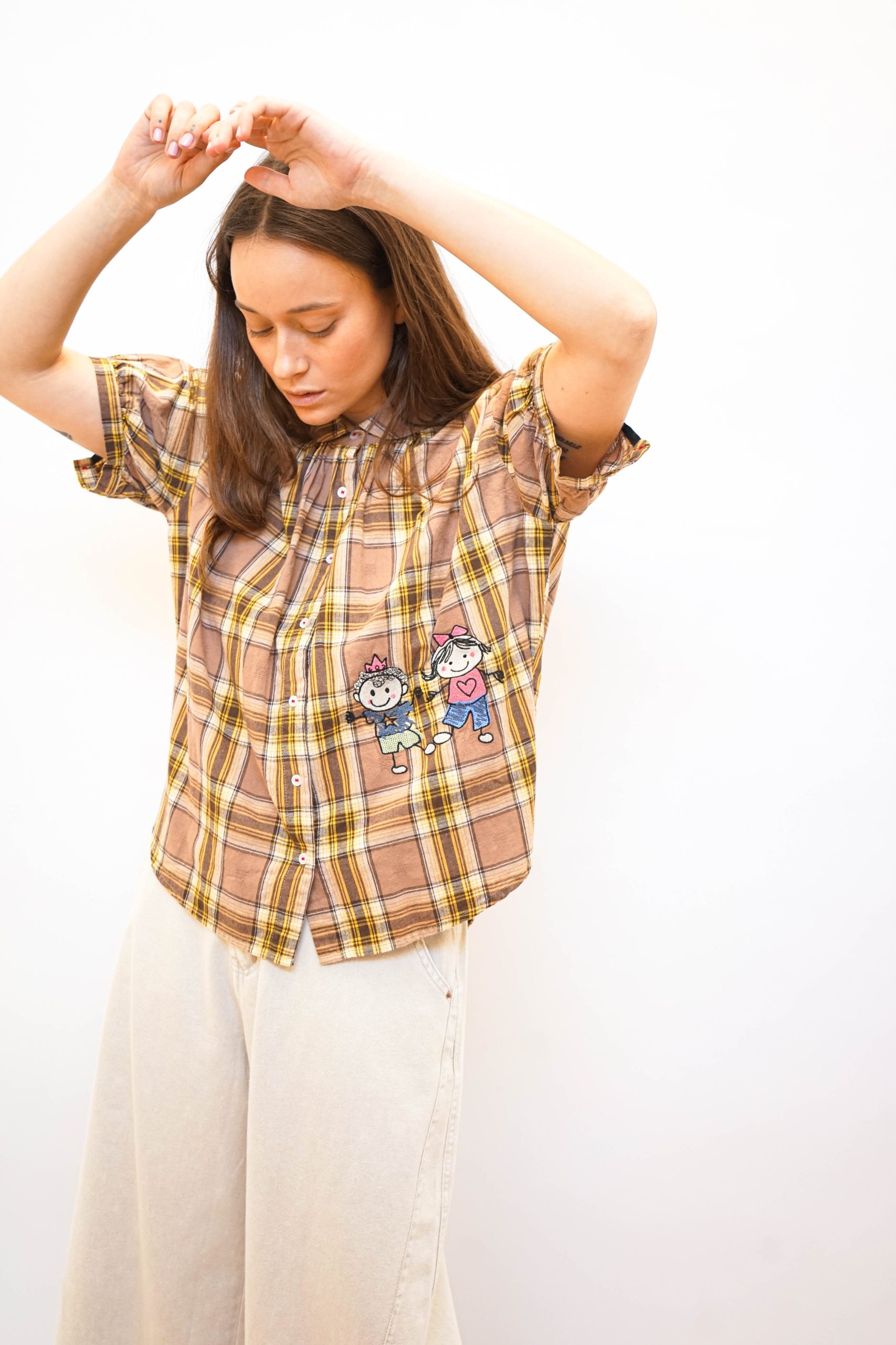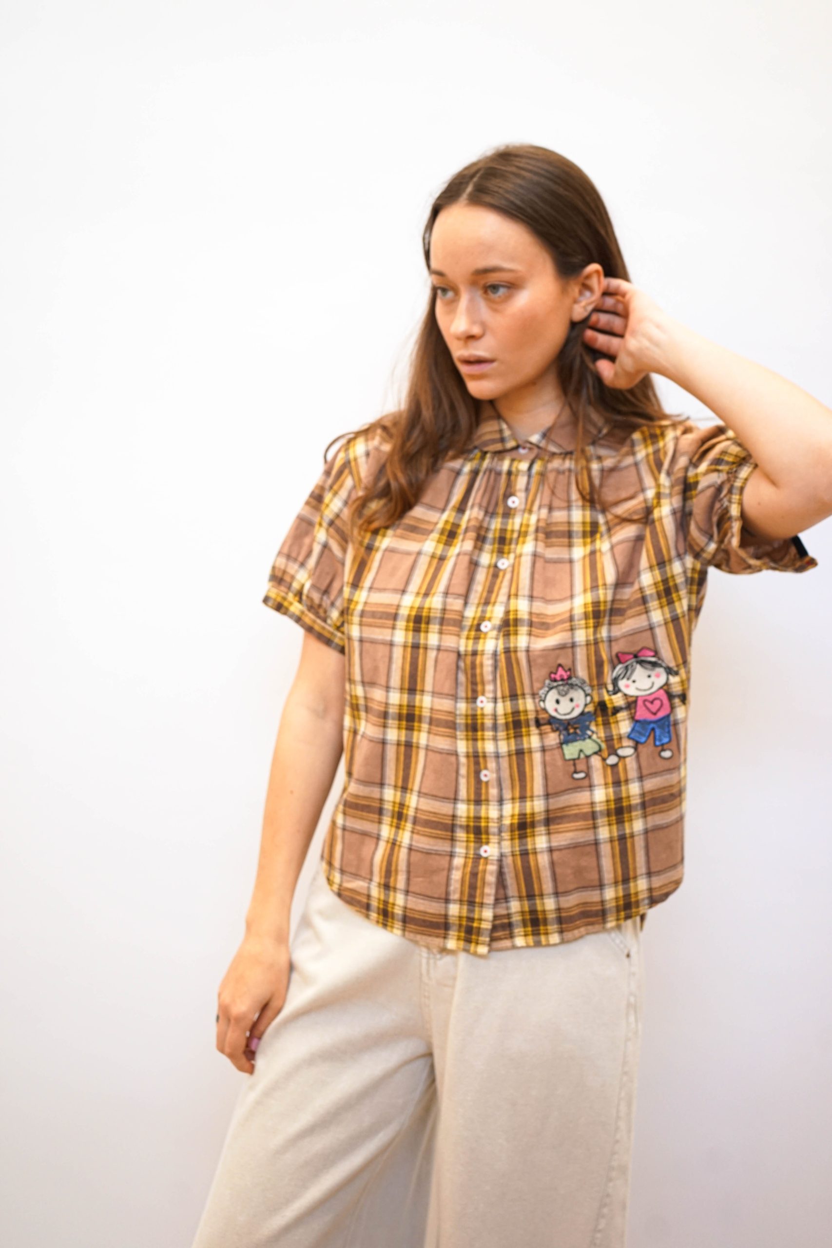 חולצה מכופתרת בגזרה מעט רחוקה מהגוף. עם הדפס משבצות בצבעי חום, בז' וצהוב. עם ריקמה של זוג חמוד וצווארון פיטר פן ושרוולים קצרים עם סיומת גומי עדינה. ניתן לשלב עם מכנסי פאוור קאפל 100%כותנה אורך : 59/64 היקף : 130