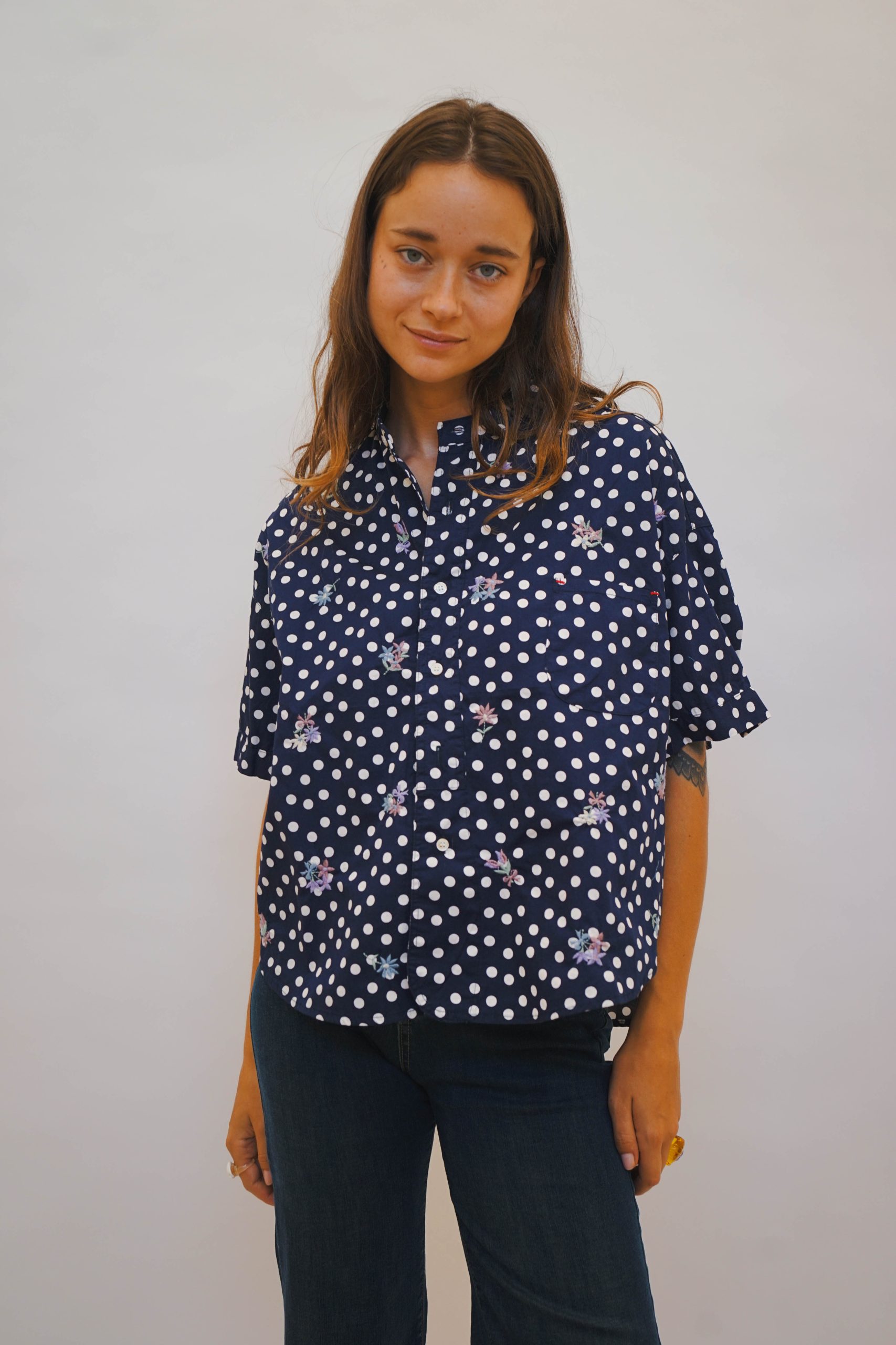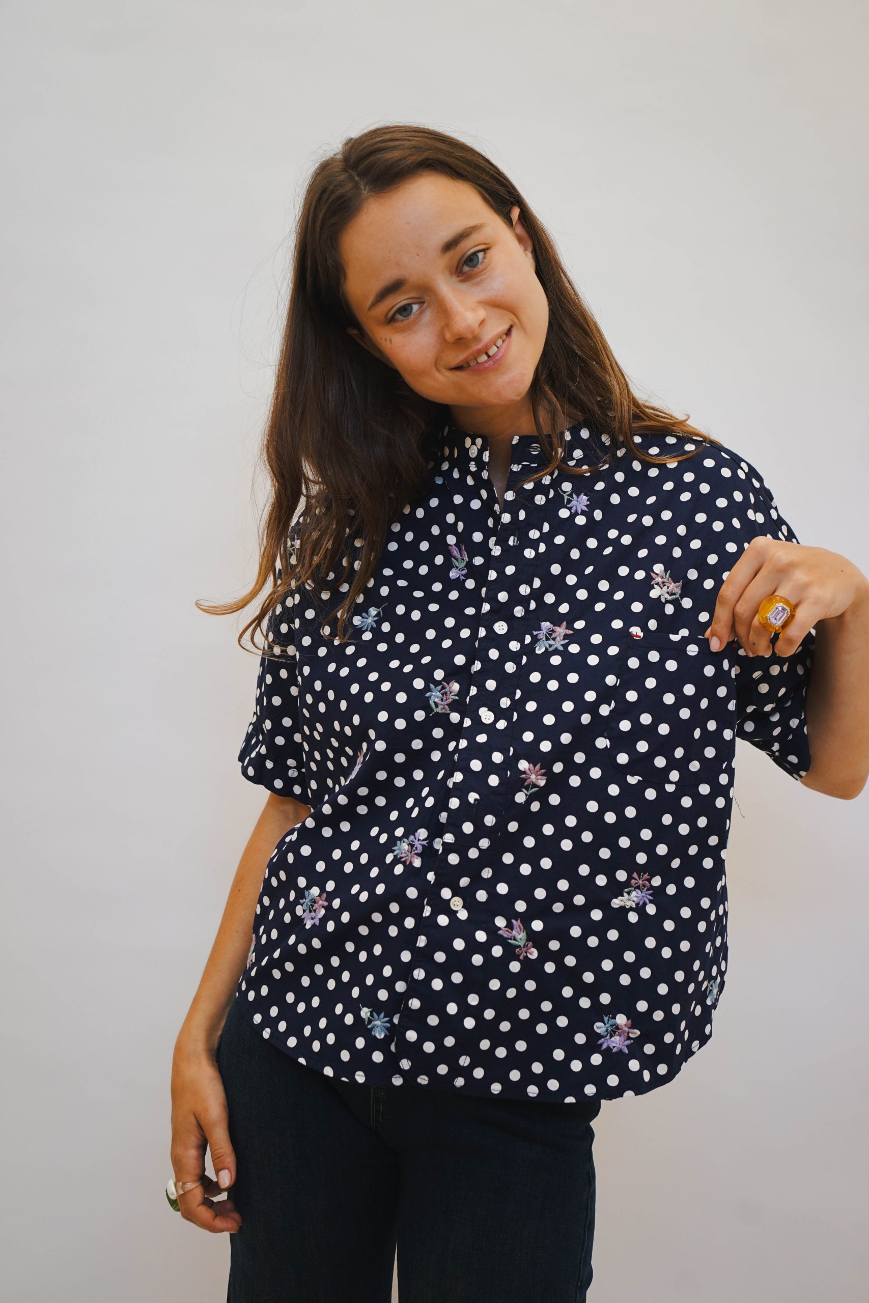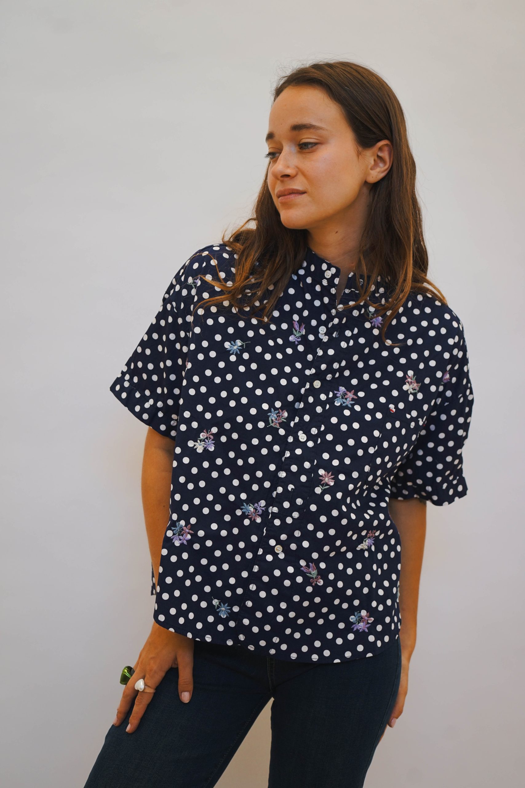 חולצה מכופתרת בגזרה משוחררת עם שרוולים קצרים, עשויה בד נעים ונושם 100% כותנה . מעוטרת בדוגמת נקודות לבנות על רקע כחול כהה, עם שילוב עדין של פרחים קטנים רקומים. הצווארון הסיני מוסיף מראה ייחודי ונקי.