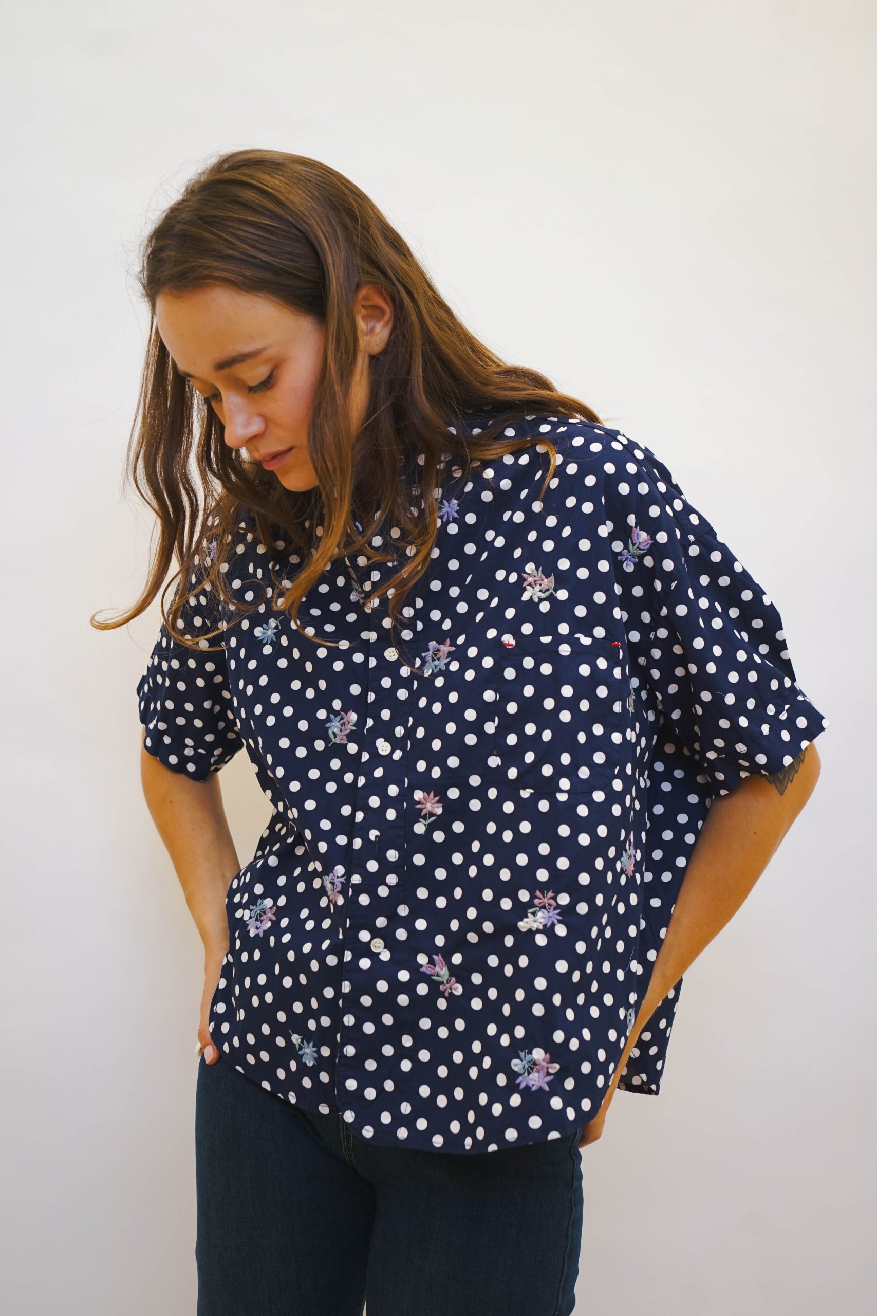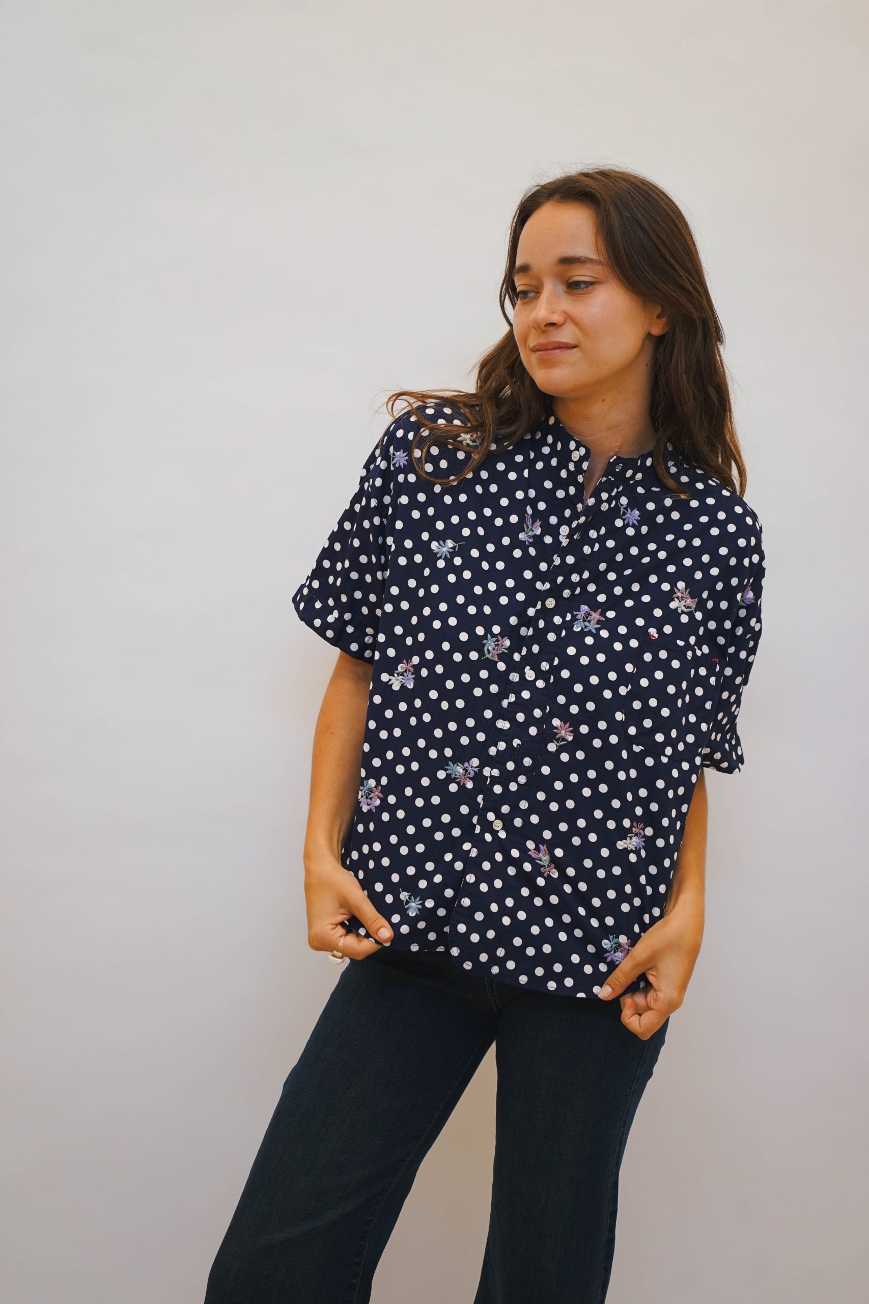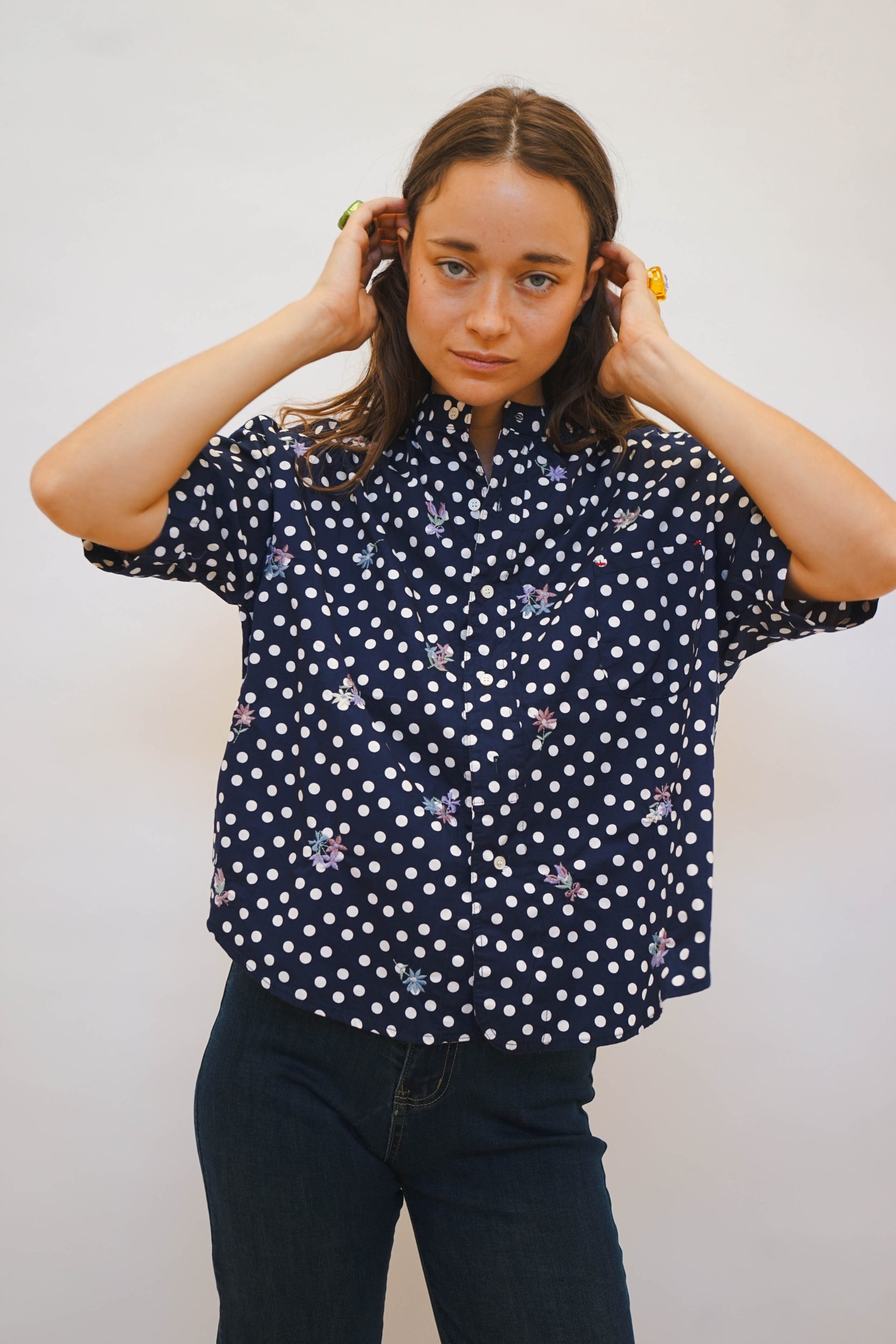 חולצה מכופתרת בגזרה משוחררת עם שרוולים קצרים, עשויה בד נעים ונושם 100% כותנה . מעוטרת בדוגמת נקודות לבנות על רקע כחול כהה, עם שילוב עדין של פרחים קטנים רקומים. הצווארון הסיני מוסיף מראה ייחודי ונקי.