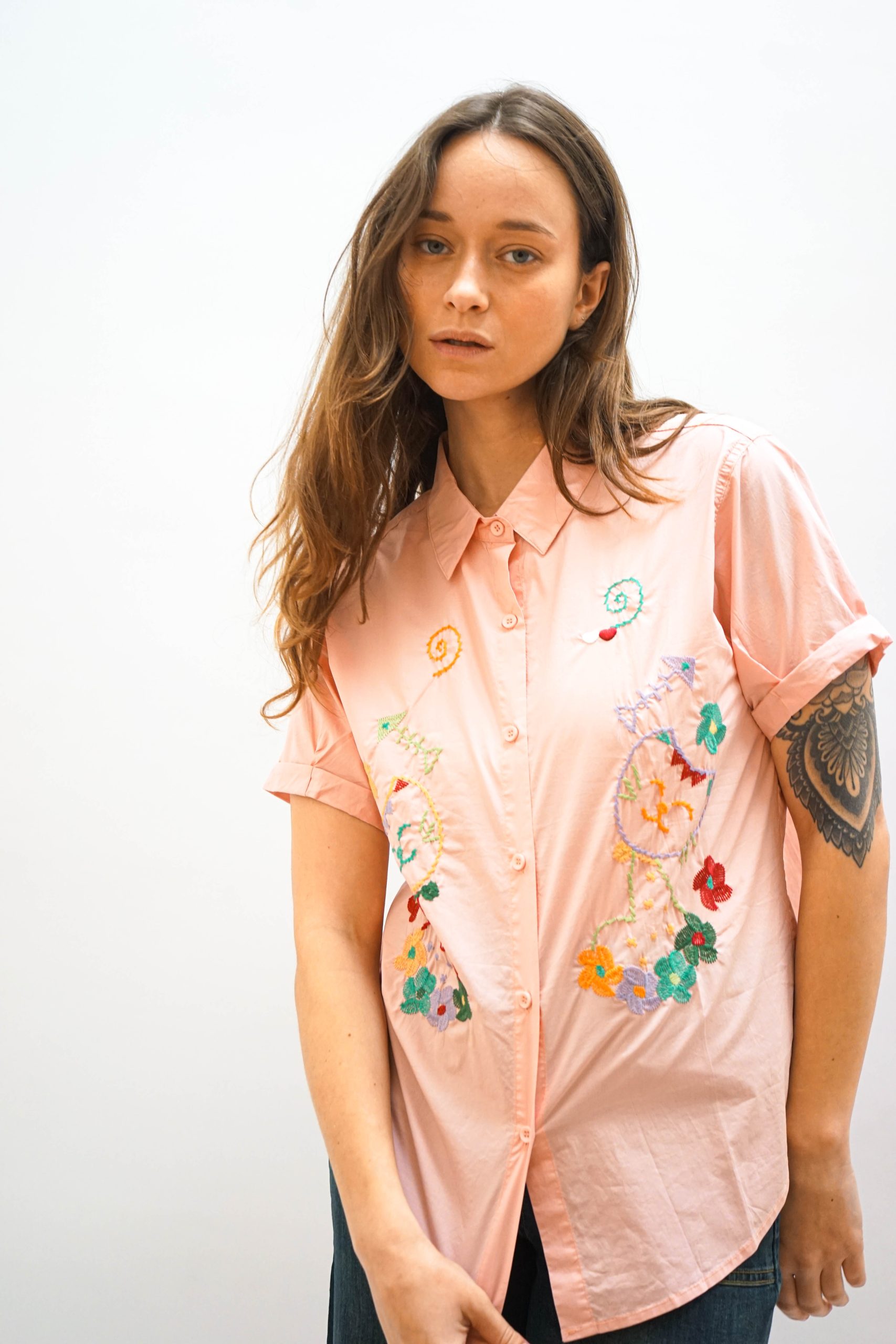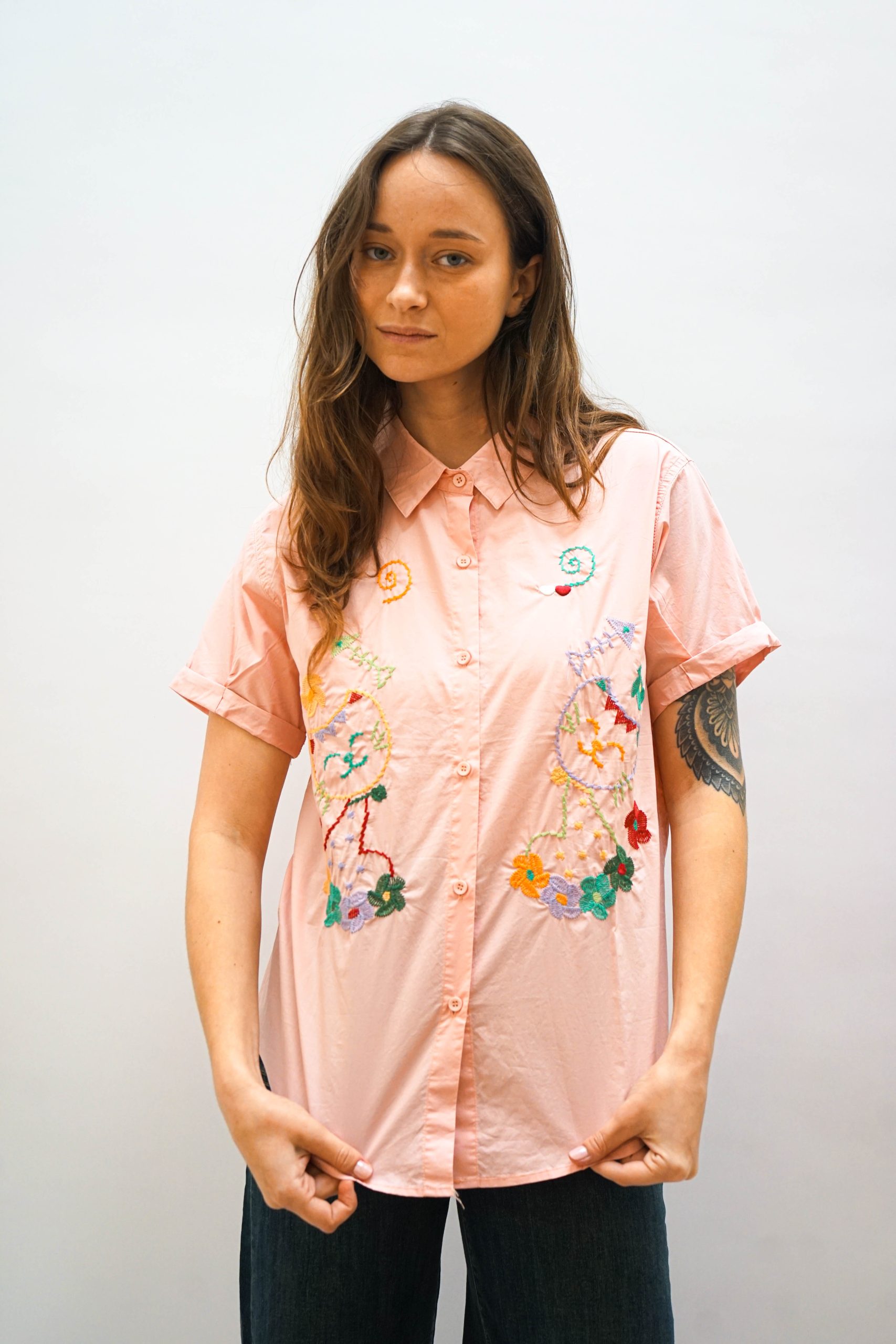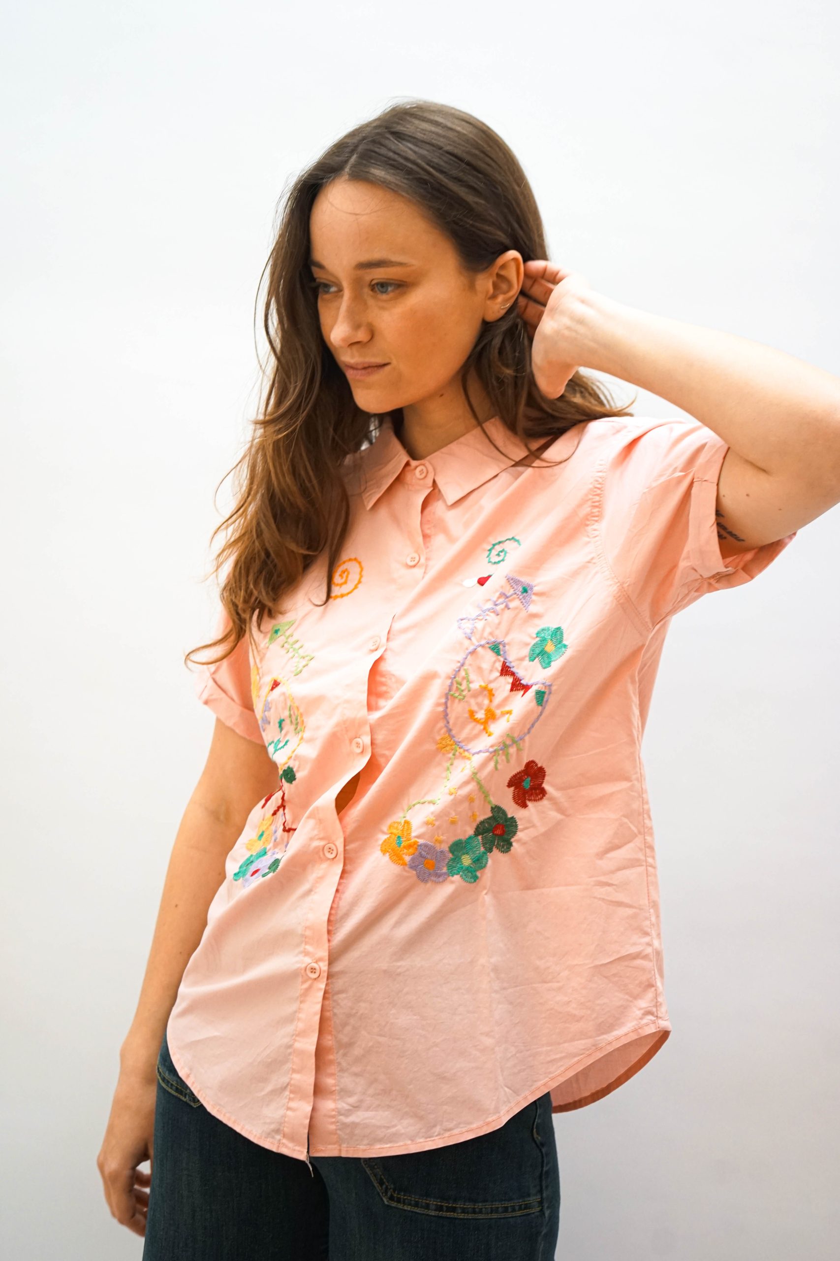 חולצה מכופתרת בגזרה ישרה. עם צווארון קלאסי ורכיסת כפתורים שמצדדיה רקמות צבעוניות של חתולים ופרחים בסגנון וינטאג'. ניתן לשלב עם ג'ינס פרחים חצאית שיבוץ או מכנסי עבודה כחולים בד 100% כותנה היקף : 106 אורך: 57