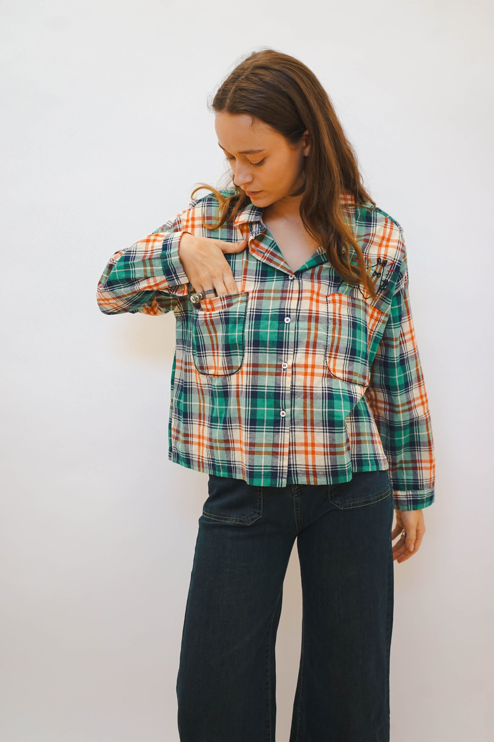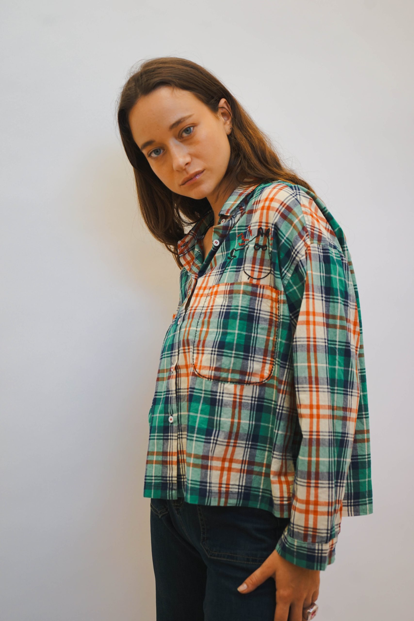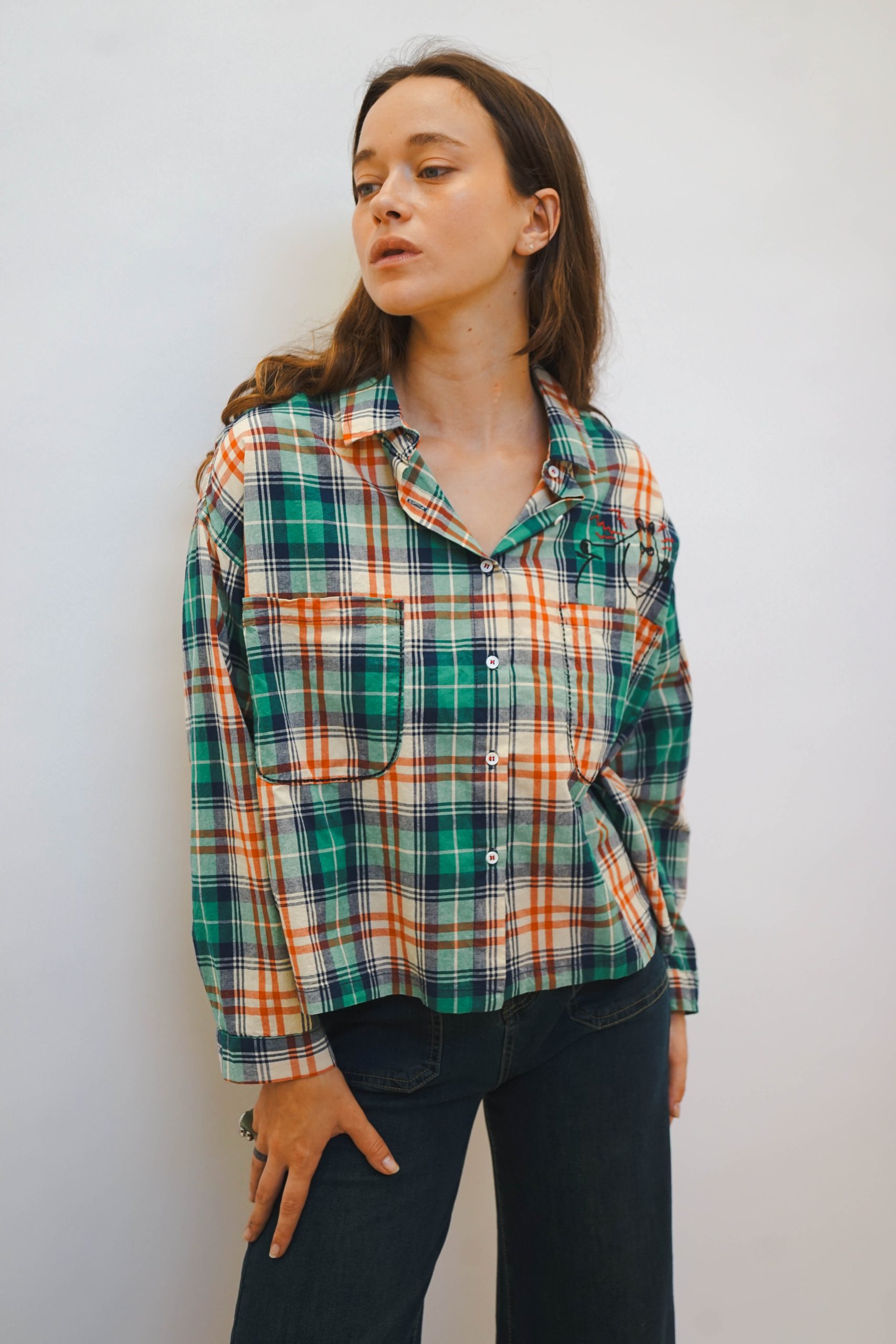 חולצת 100% כותנה כפתורים לאורכה צווארון משובצת בצבעים ירוק כתום עם מומין כועס רקום בצד יפה עם ג'ינס או חצאית בגיזרה מעט רחוקה מהגןף אורך 60 היקף 116