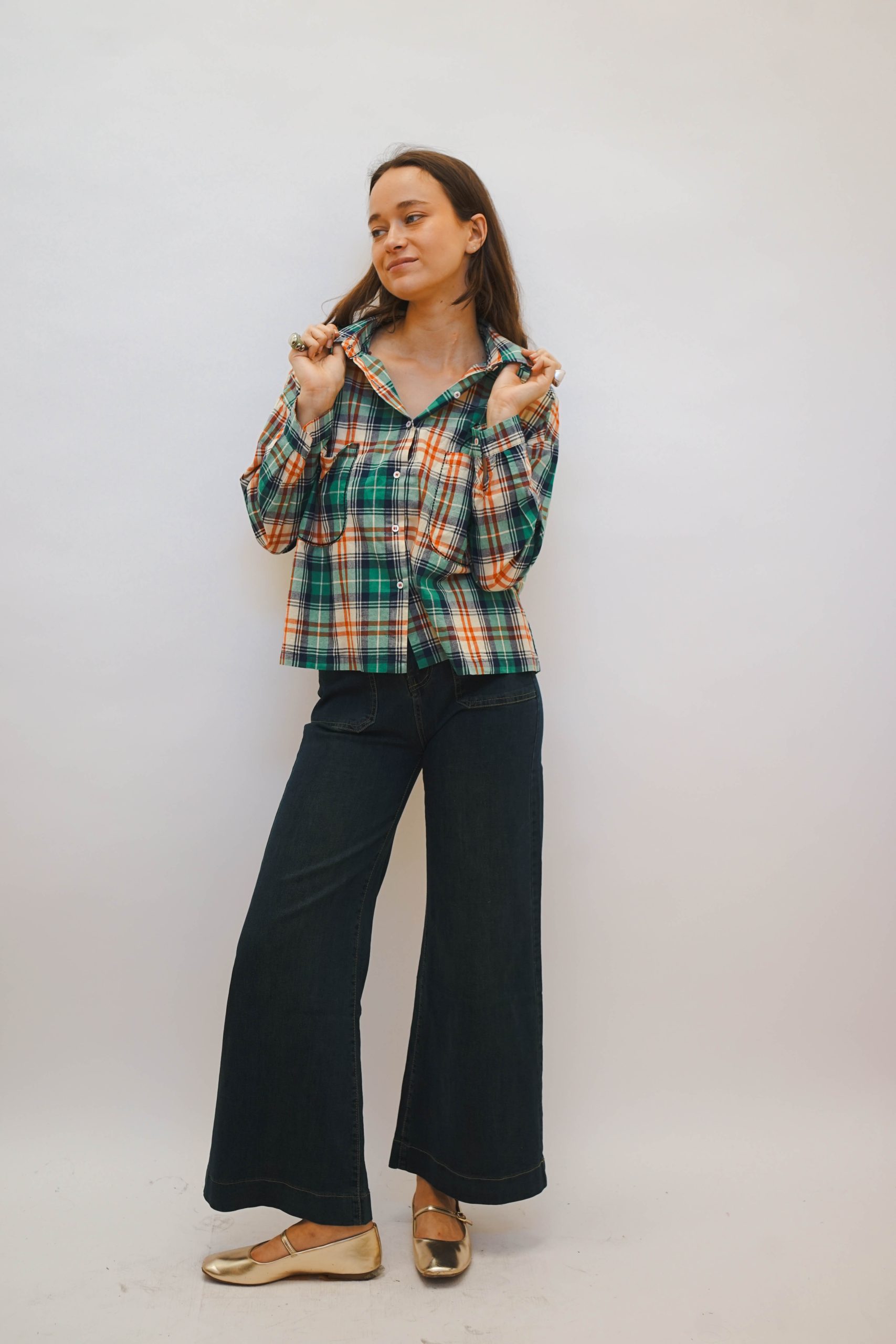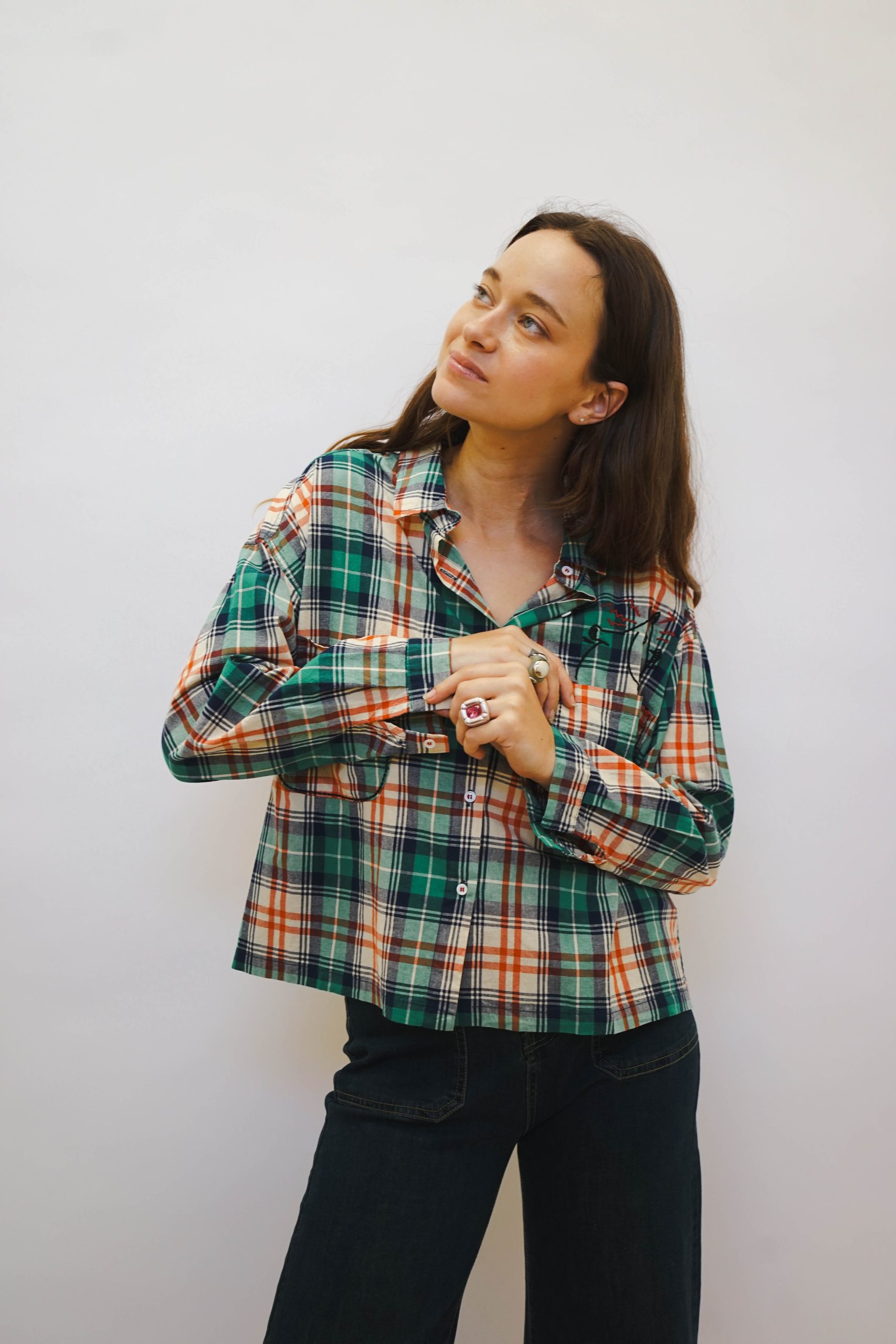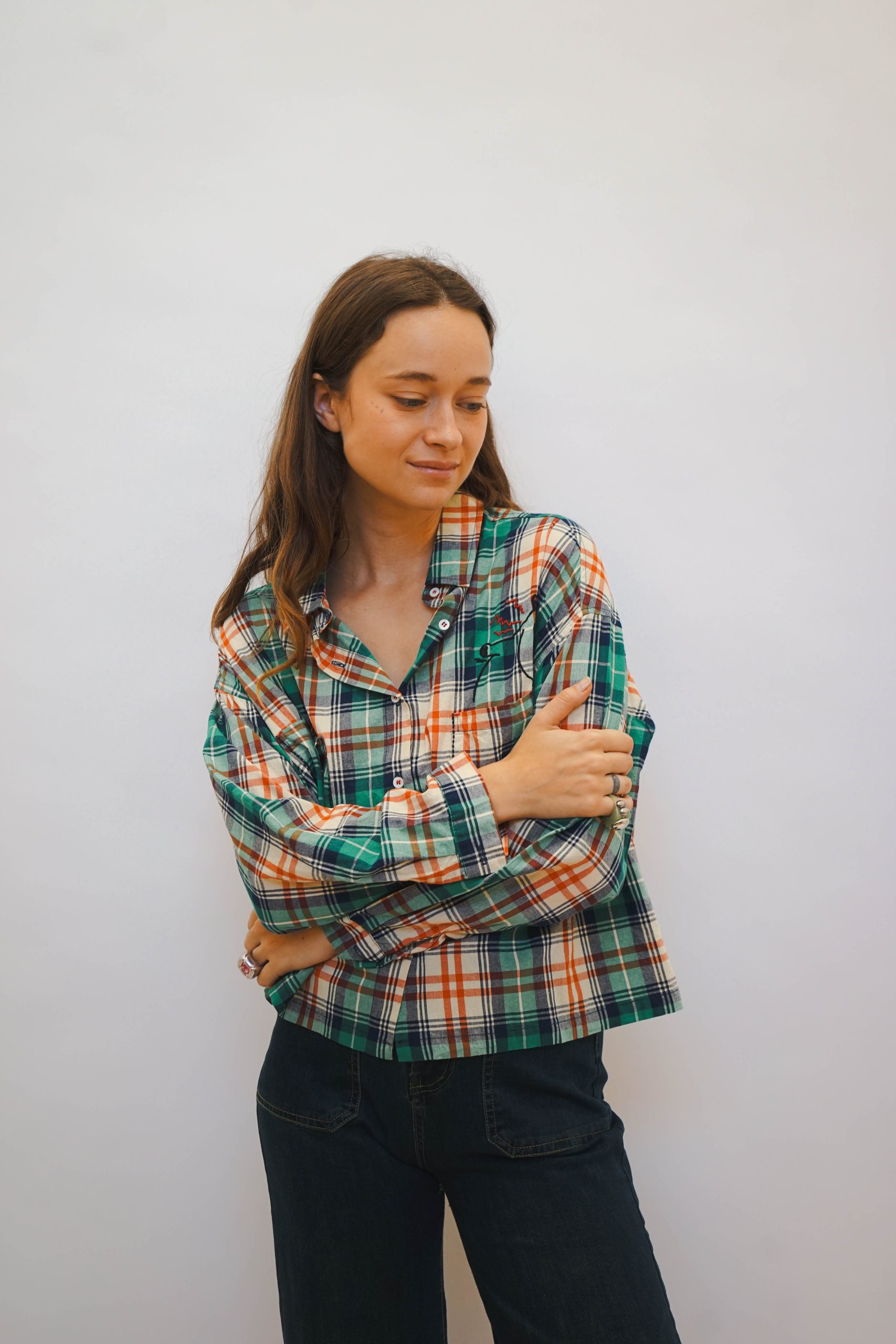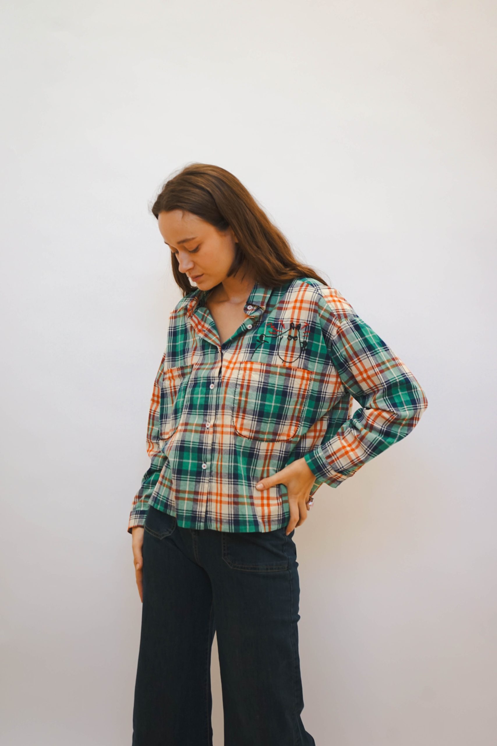 חולצת 100% כותנה כפתורים לאורכה צווארון משובצת בצבעים ירוק כתום עם מומין כועס רקום בצד יפה עם ג'ינס או חצאית בגיזרה מעט רחוקה מהגןף אורך 60 היקף 116