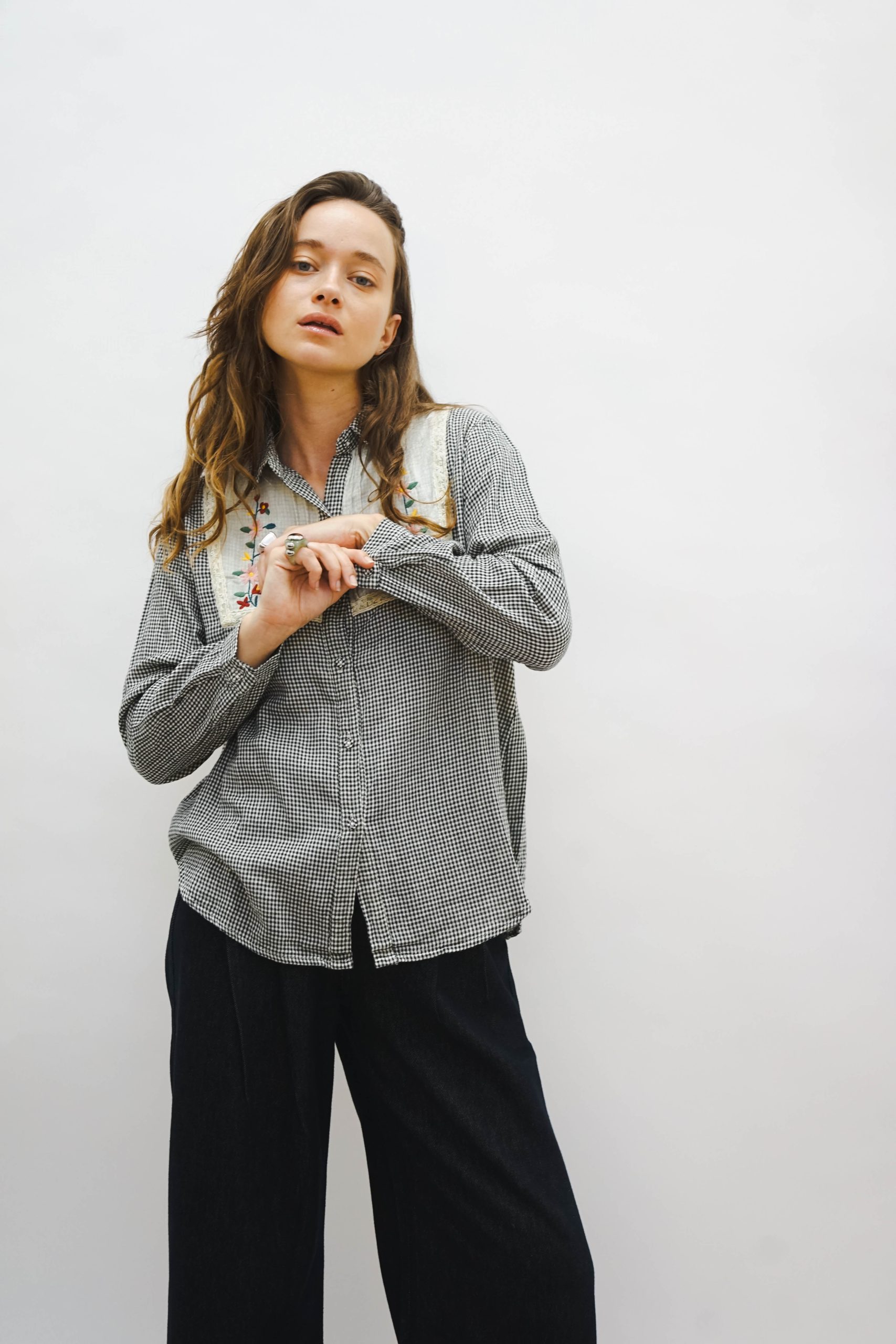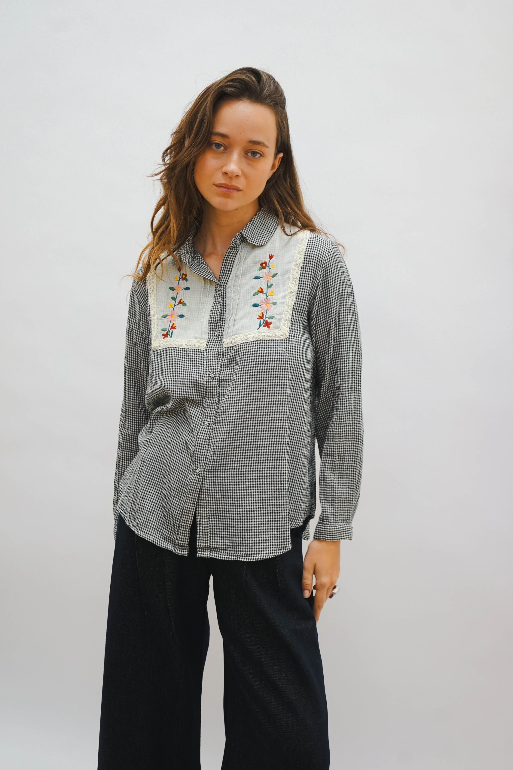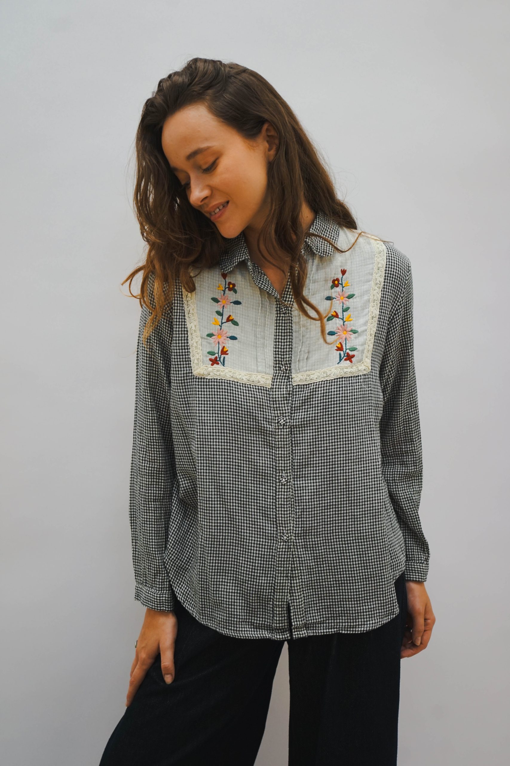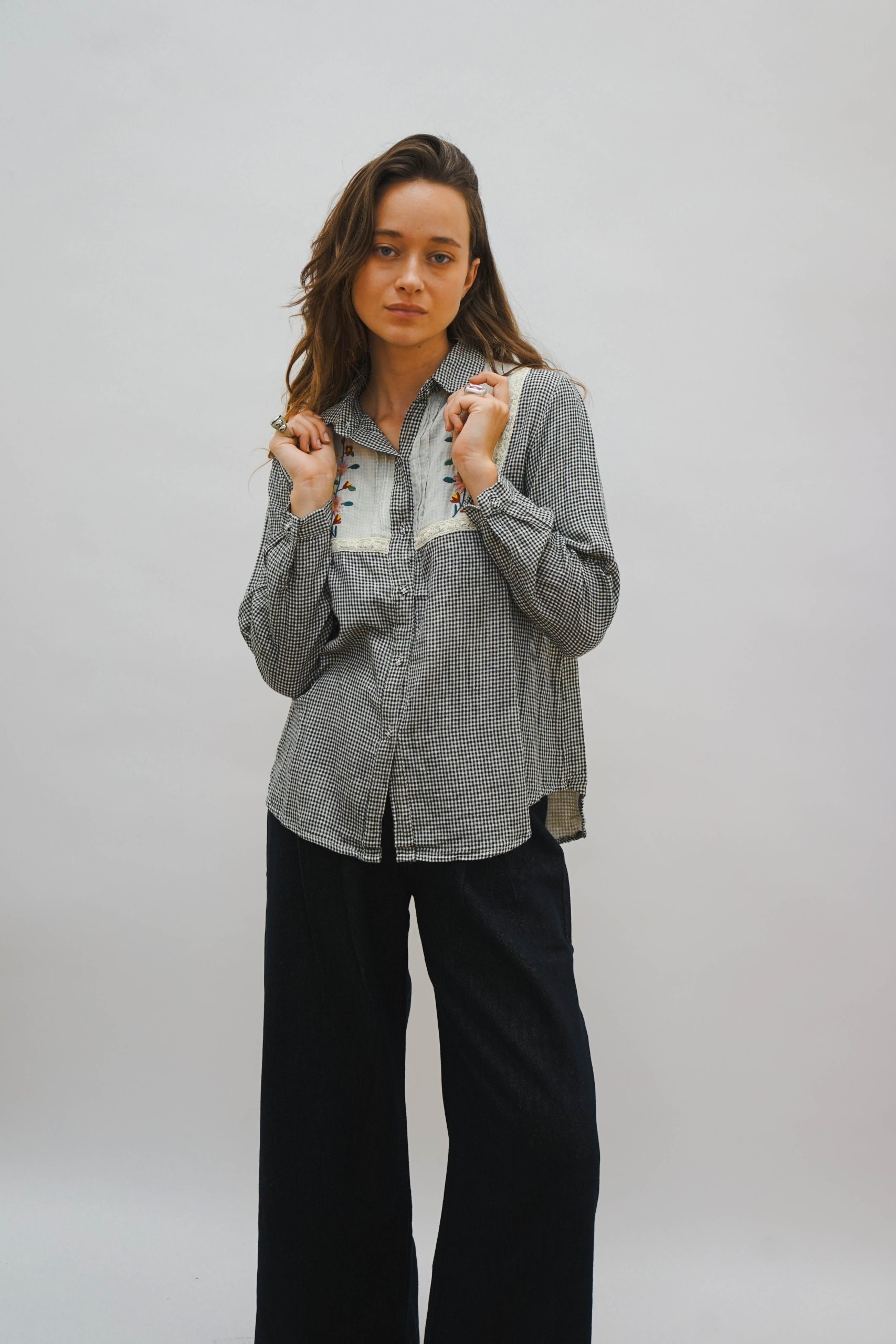 חולצת כפתורים מבד טטרה נעימה ורכה שיבוץ שחור שמנת עם תחרת שמנת ורחקמת פרחים עדינה בגיזרה קרובה לגוף מתאימה עם ג'ינס שחור או כחול חצאית נשפכת ומגפיים