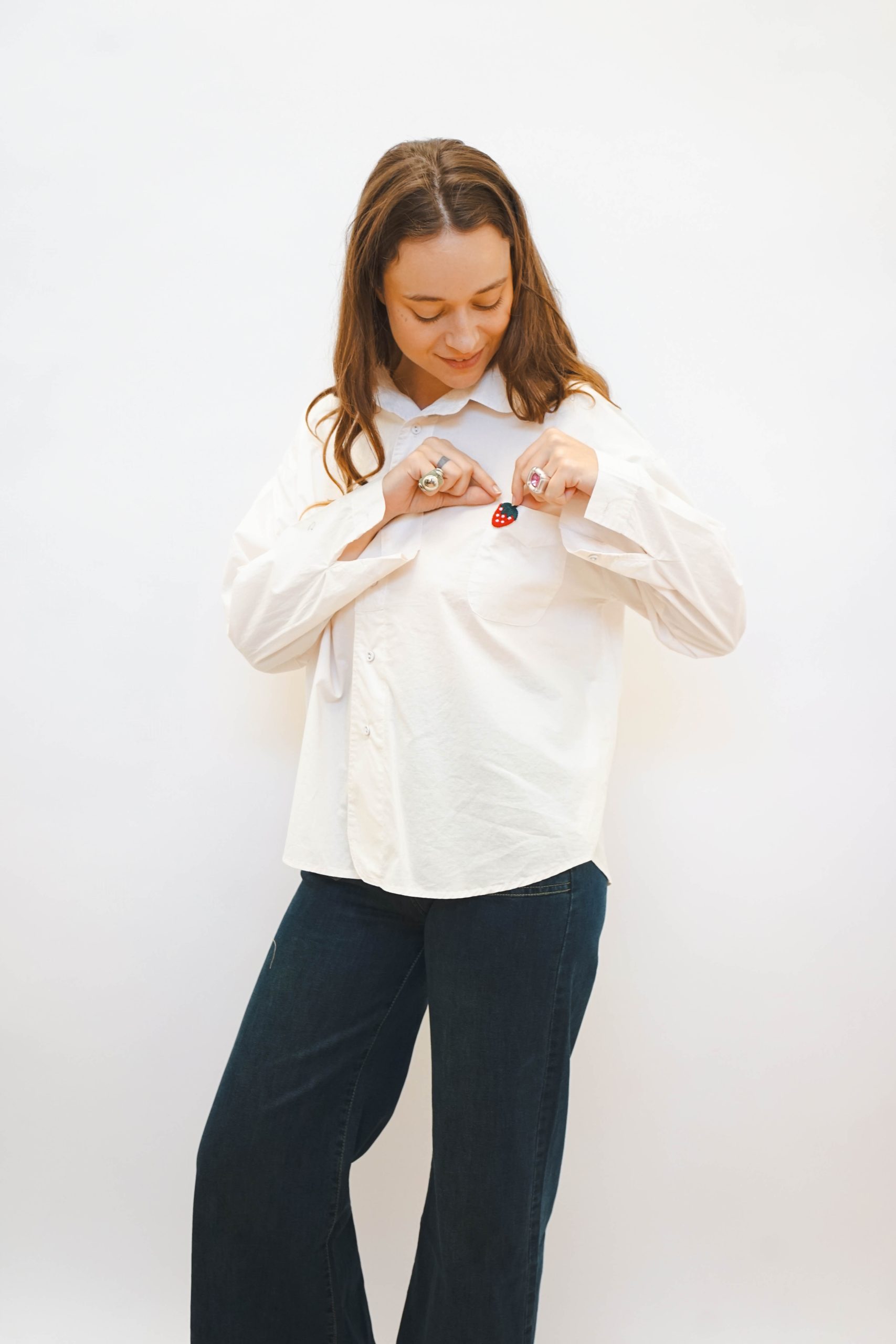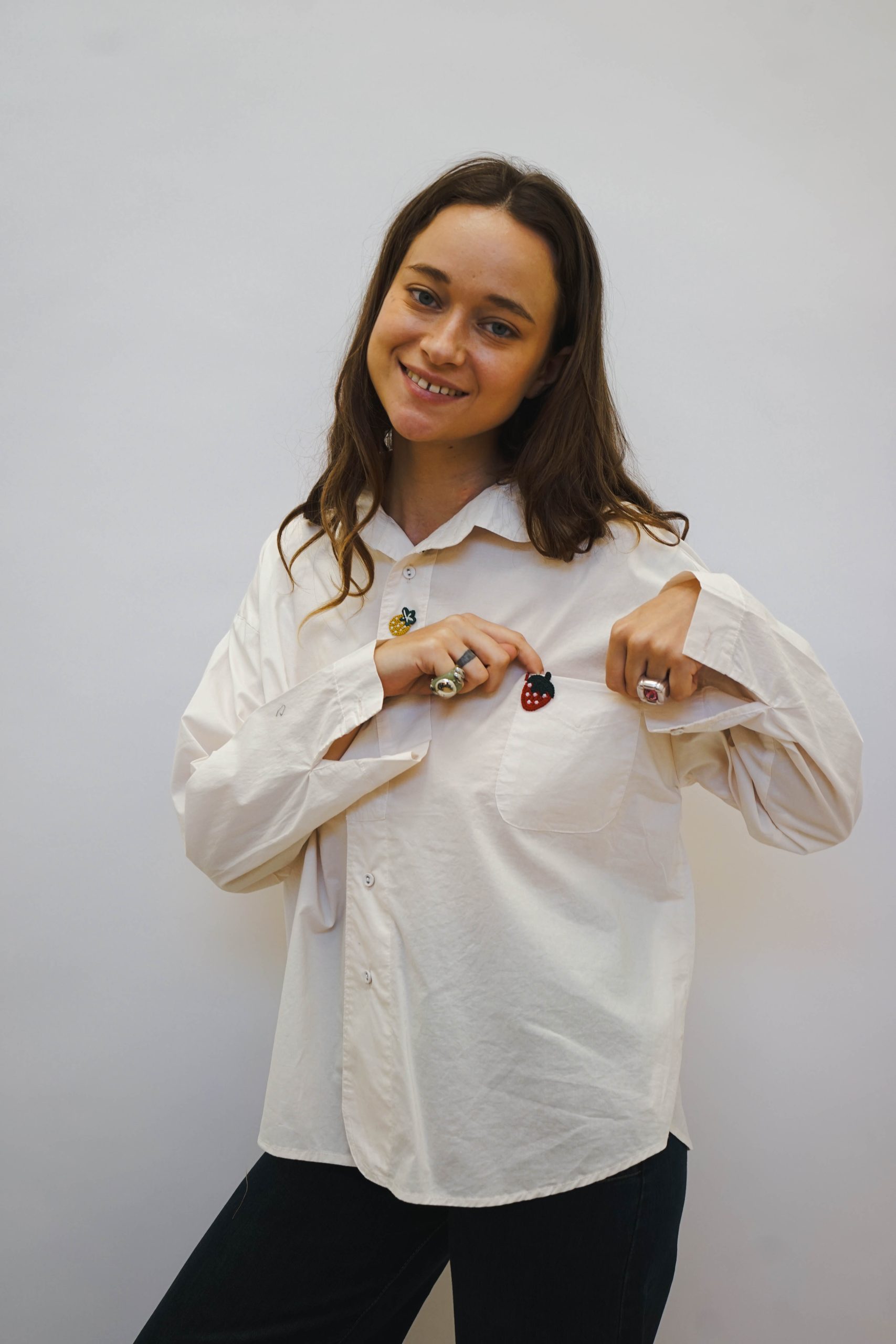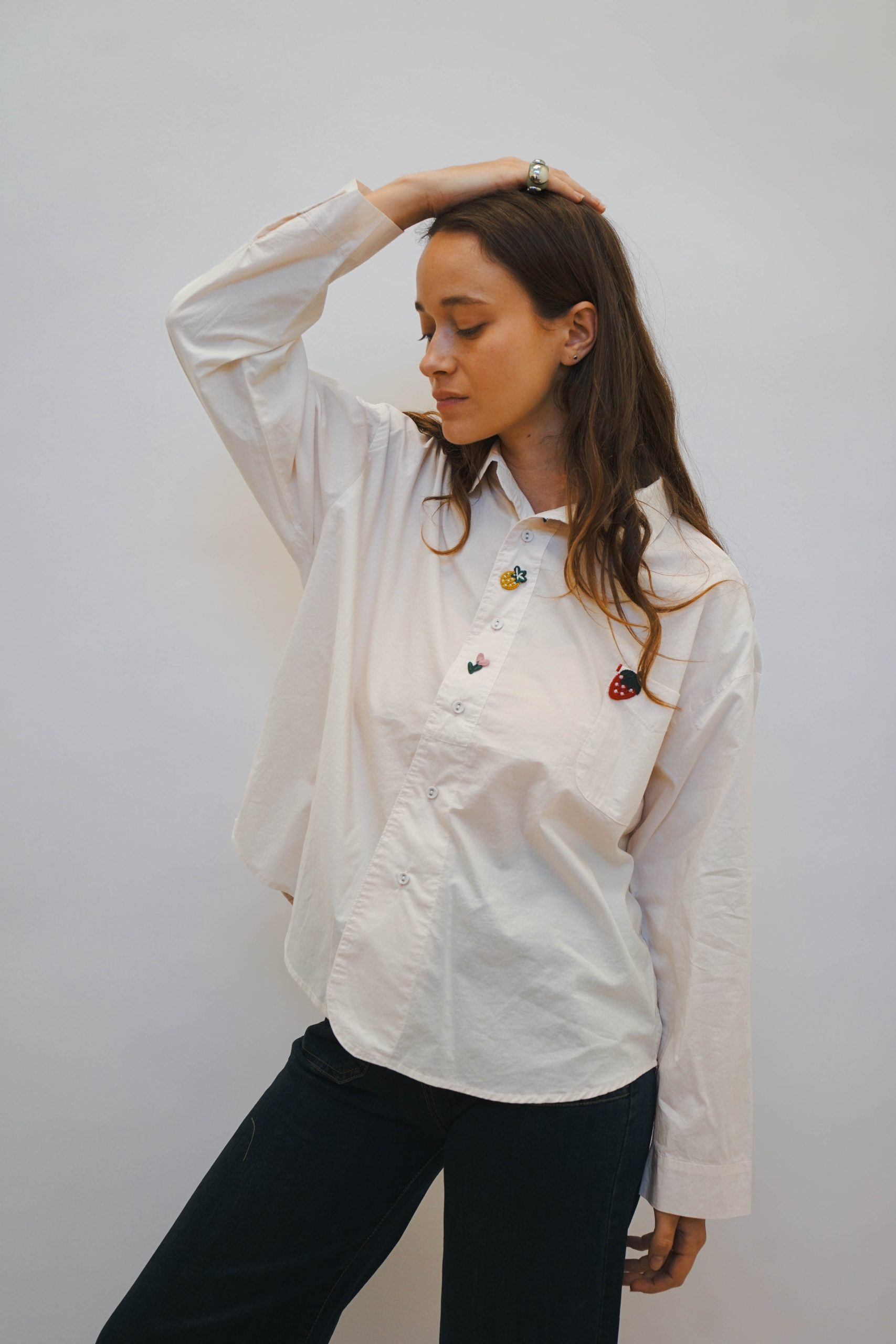 חולצת 100% כותנה כפתורים לאורכה צווארון מעוגל תות ופרח כיס בצד יפה עם ג'ינס או חצאית בגיזרה מעט רחוקה מהגןף אורך 60 היקף 116