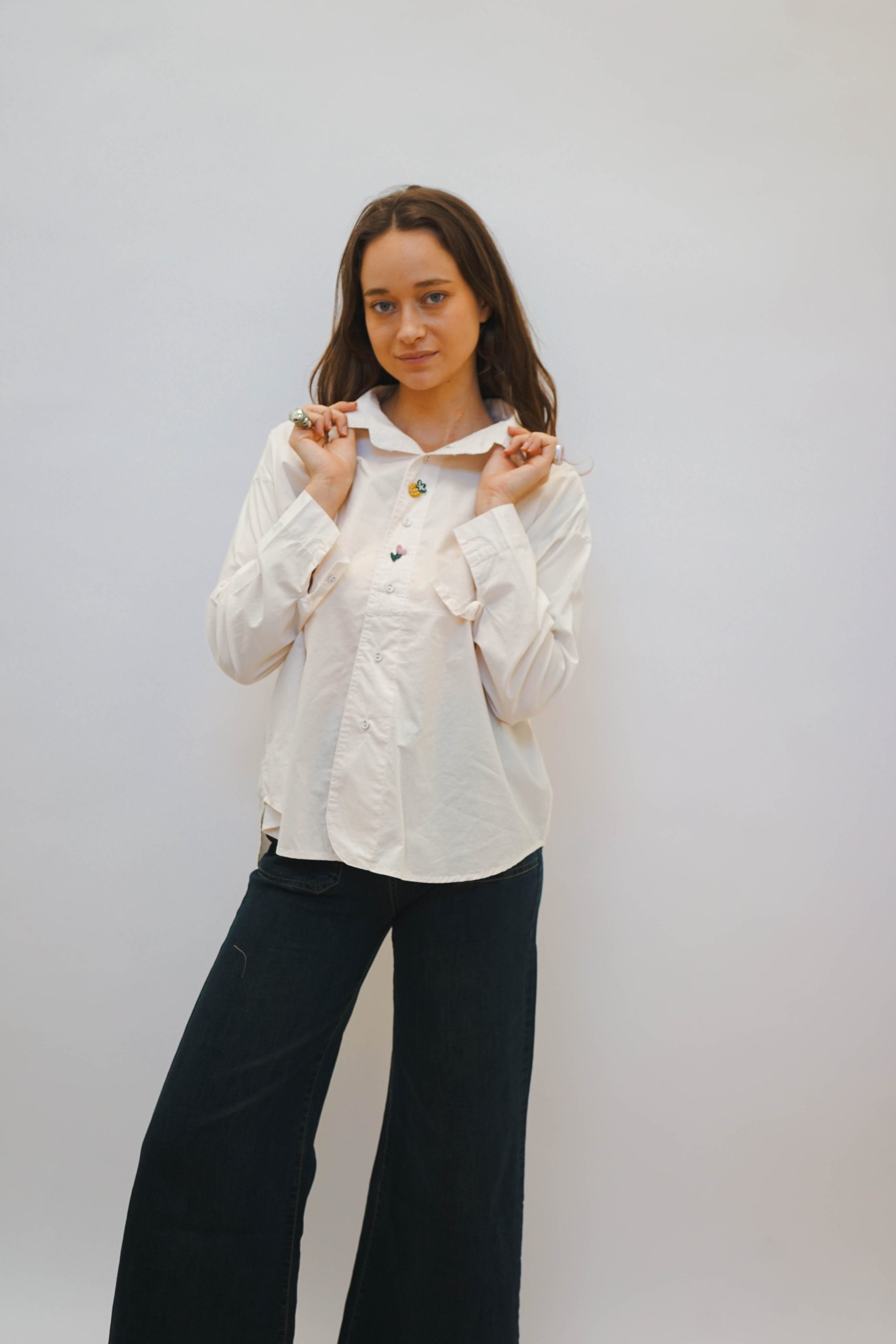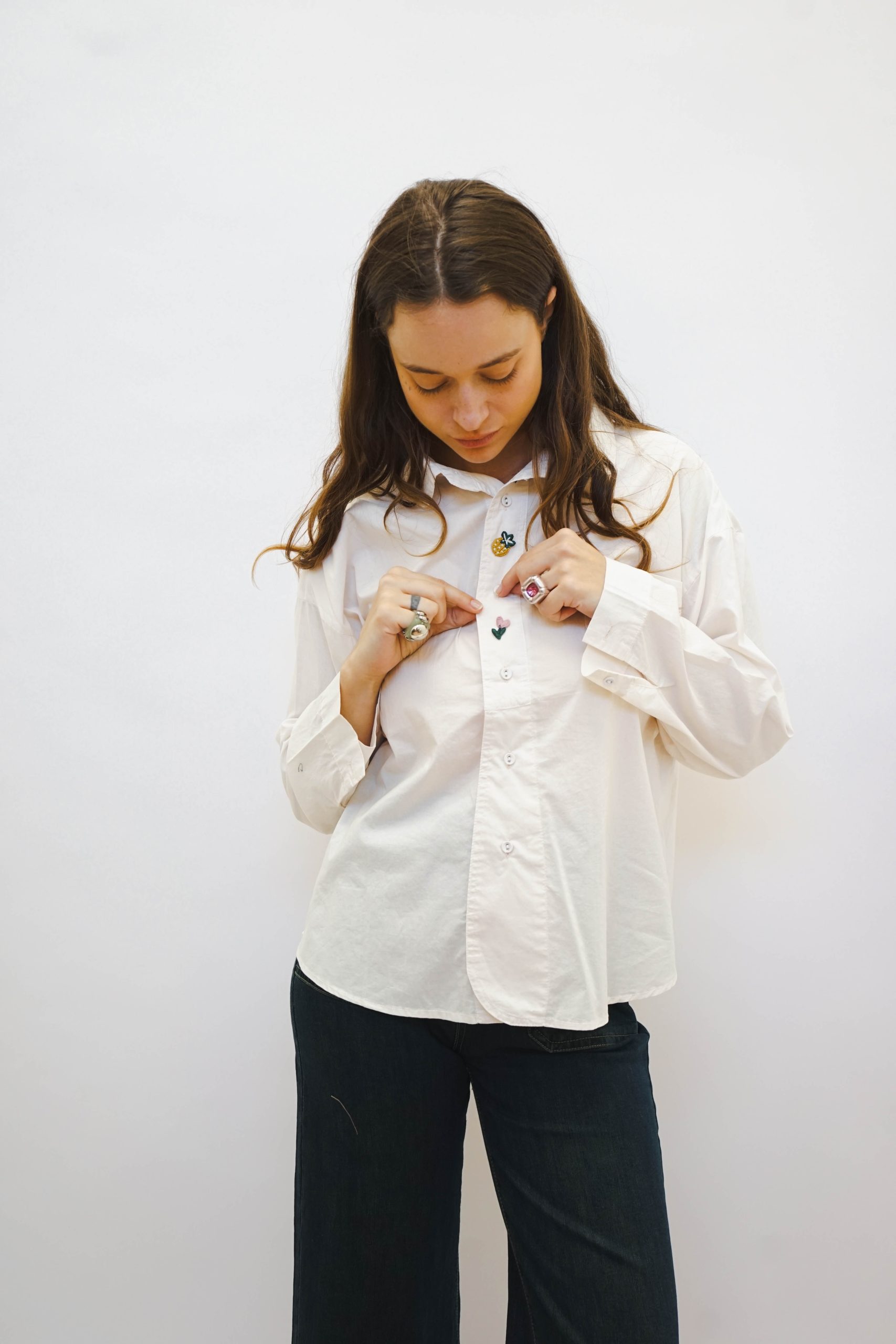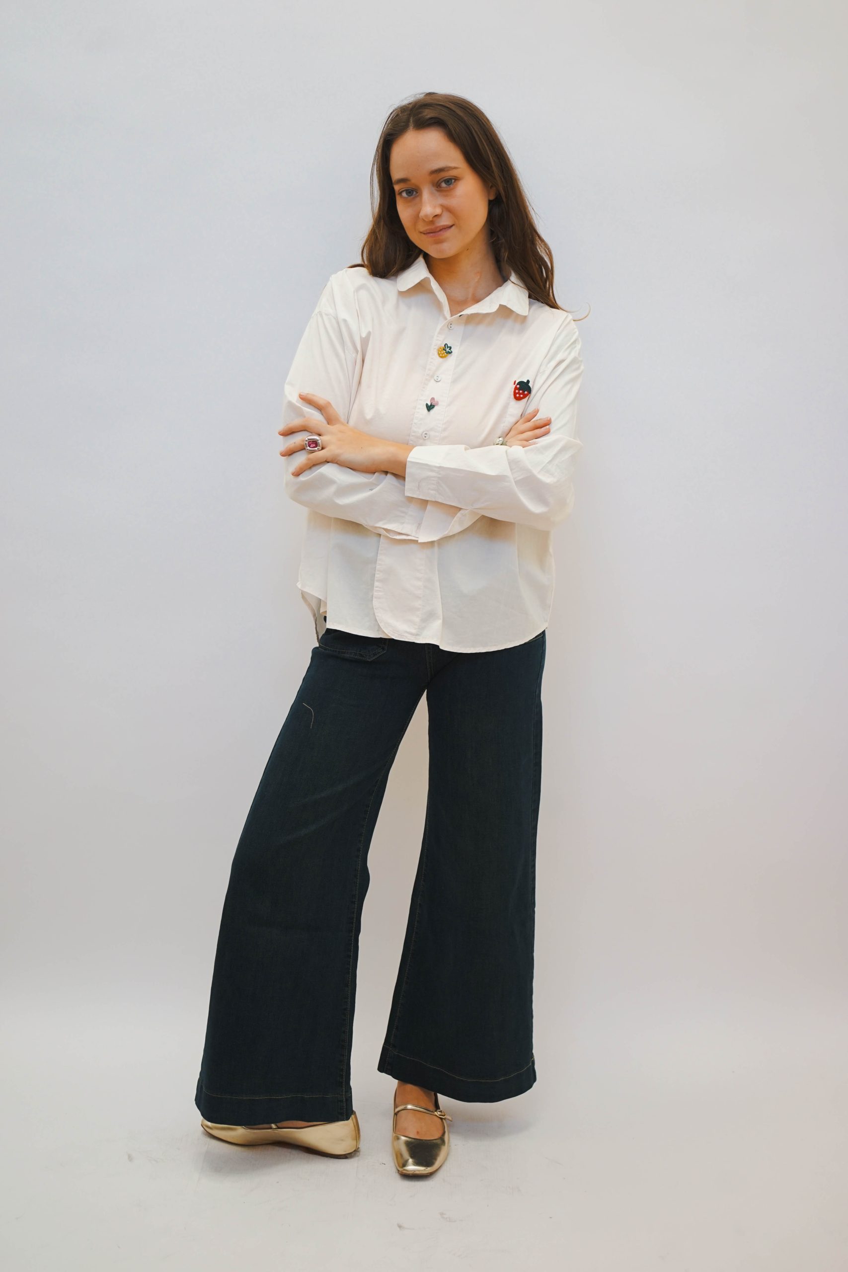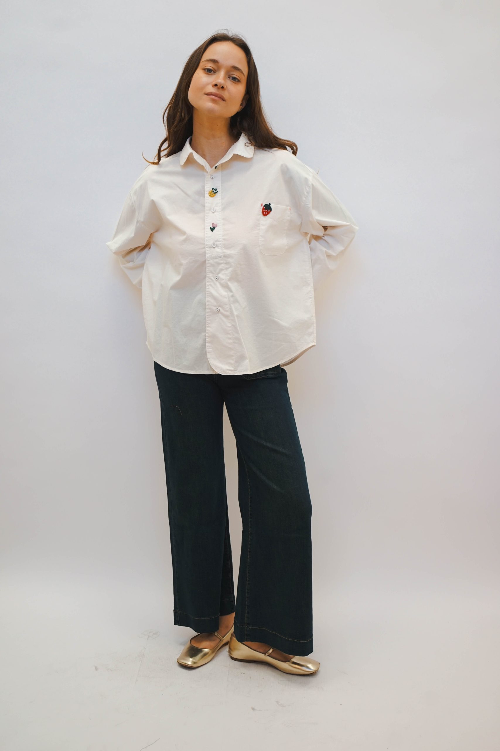חולצת 100% כותנה כפתורים לאורכה צווארון מעוגל תות ופרח כיס בצד יפה עם ג'ינס או חצאית בגיזרה מעט רחוקה מהגןף אורך 60 היקף 116