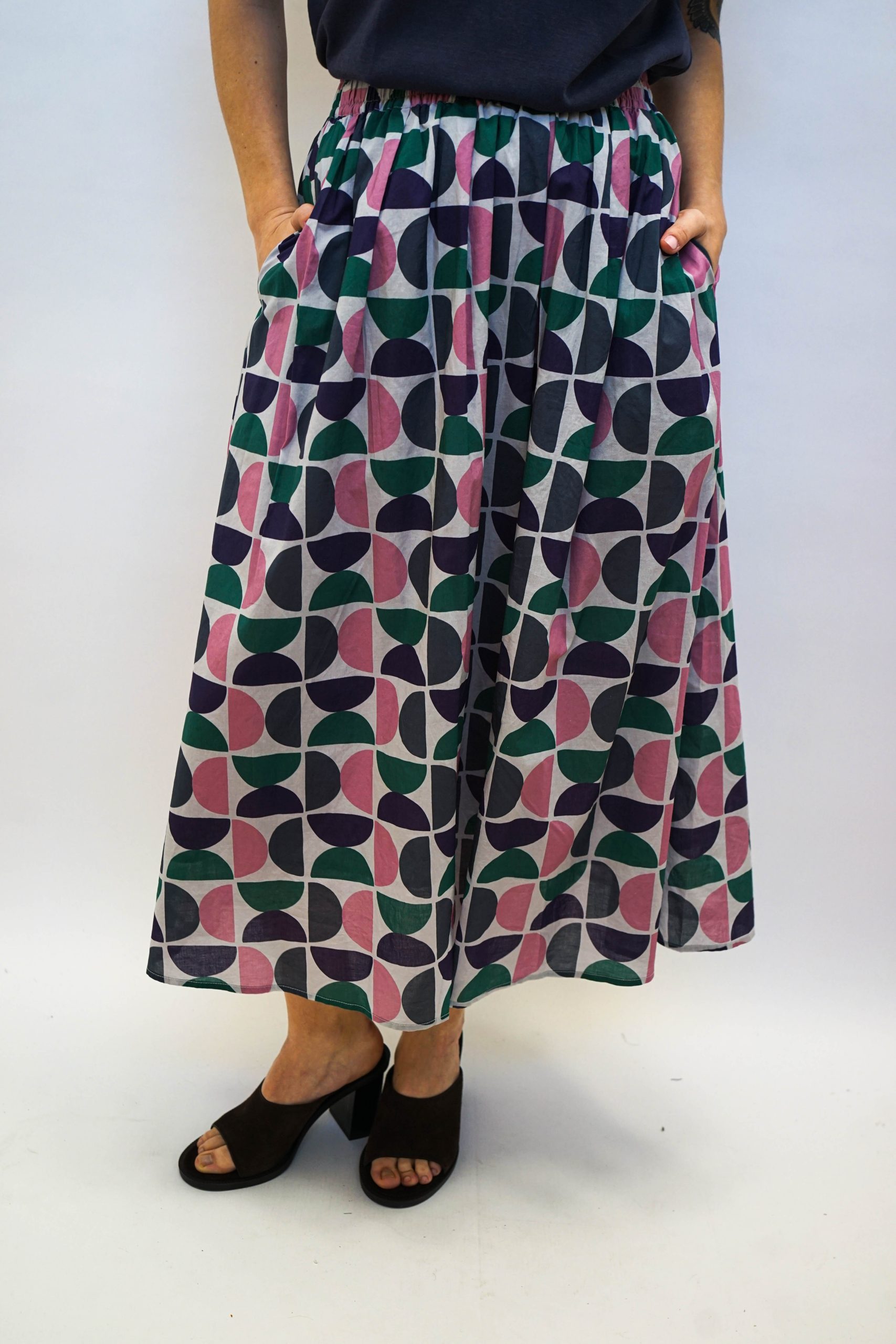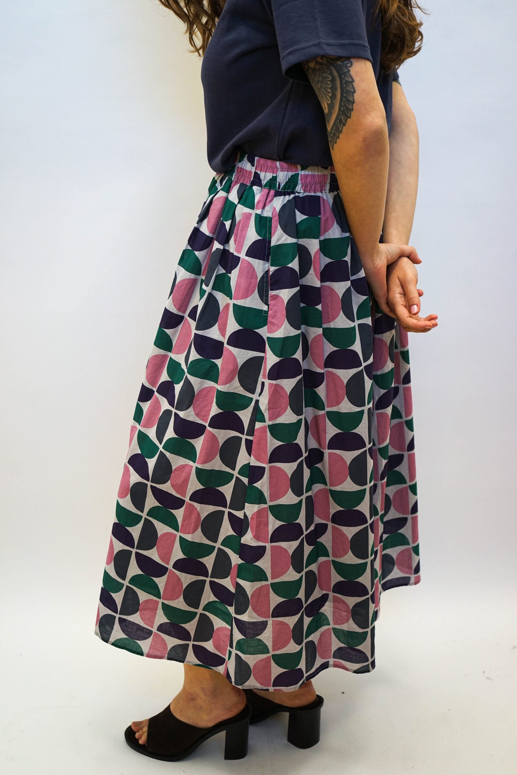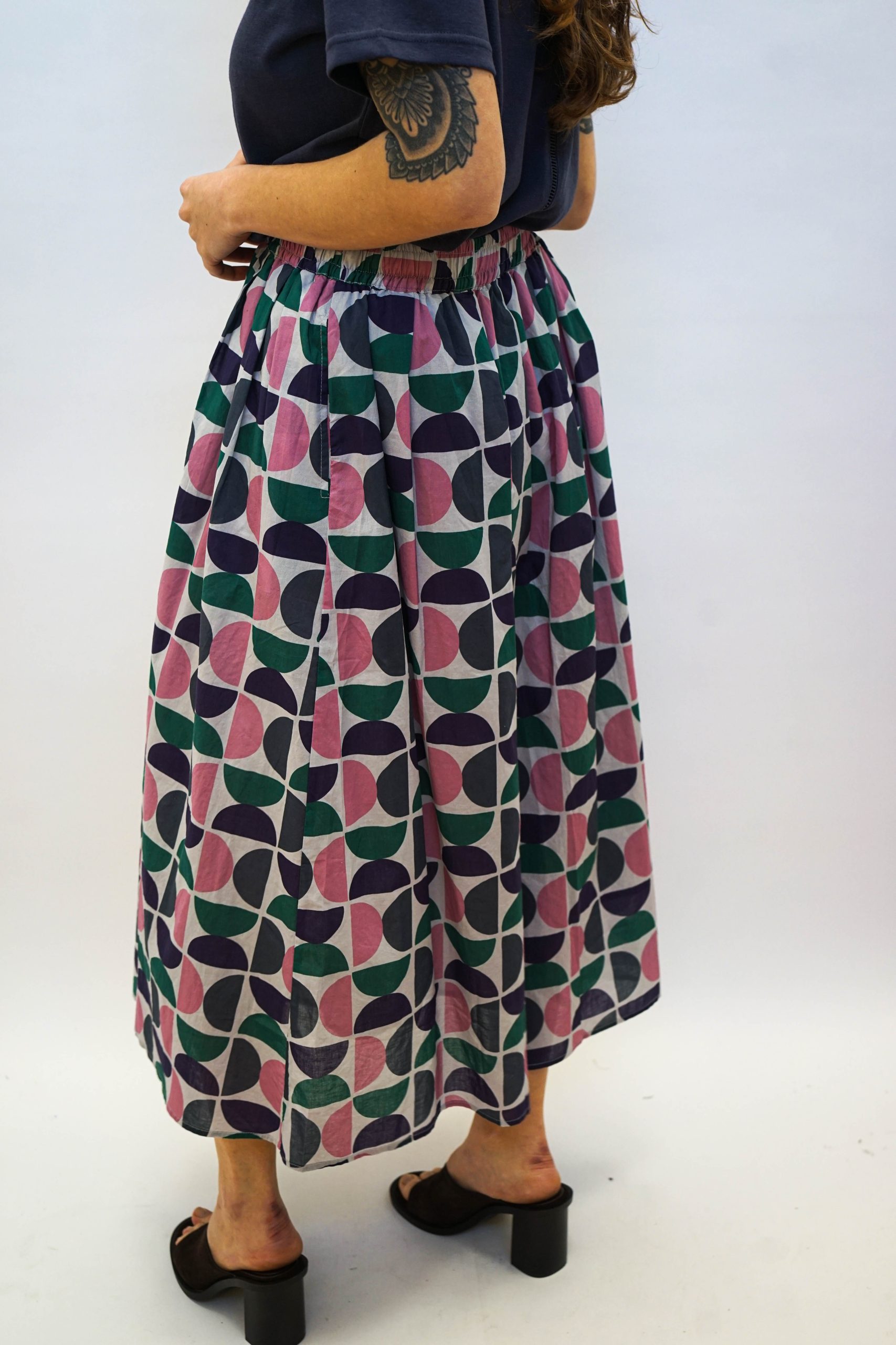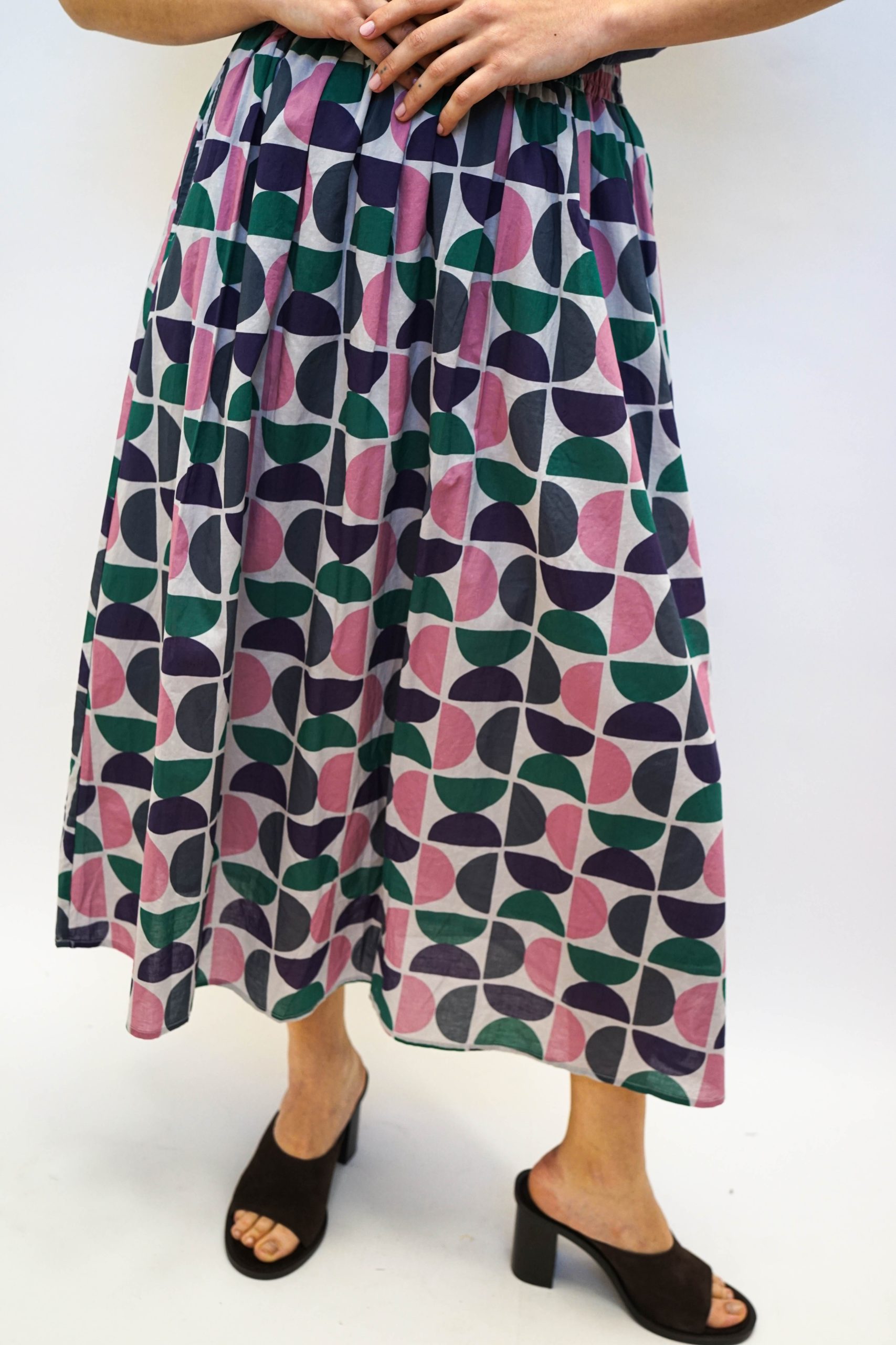 חצאית מידי בהדפס גיאומטרי של חצאי עיגולים. בגזרה מתרחבת מהמותן מטה. עם גומי מתרחב ושרוך קשירה לבן. ניתן לשלב עם טופ ג'אגלינג כחליפה