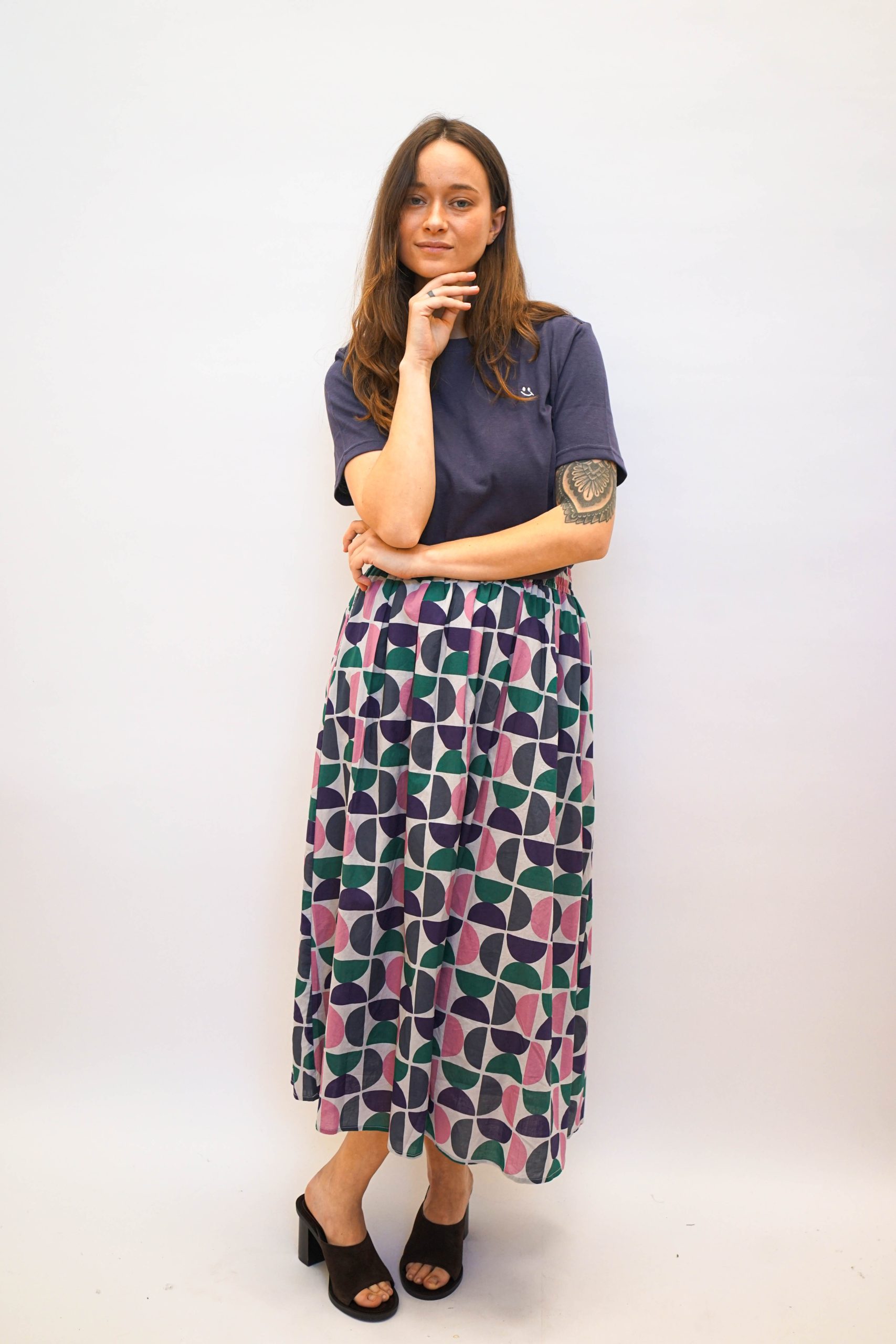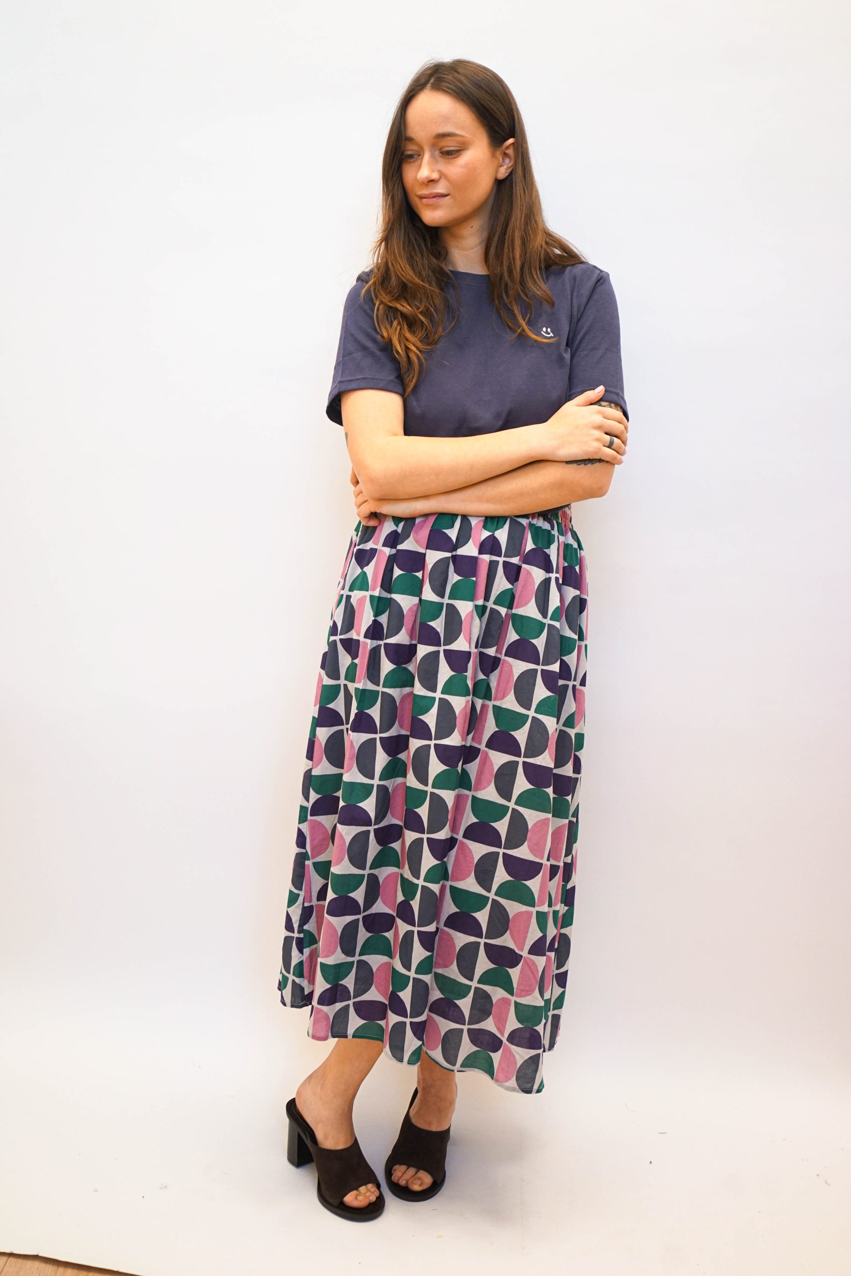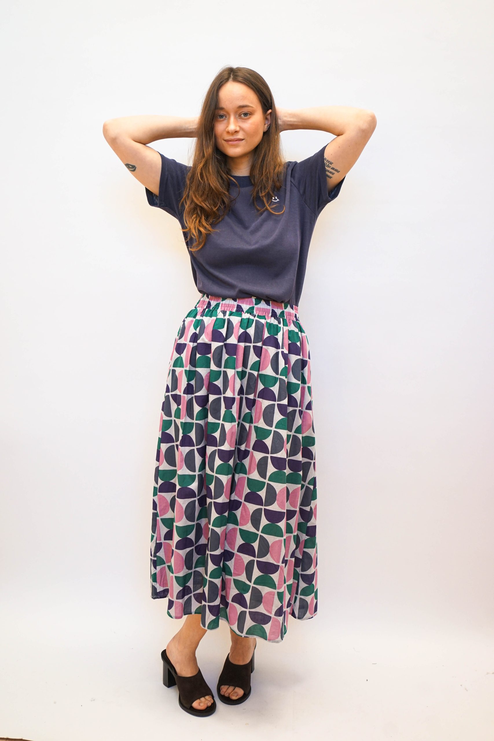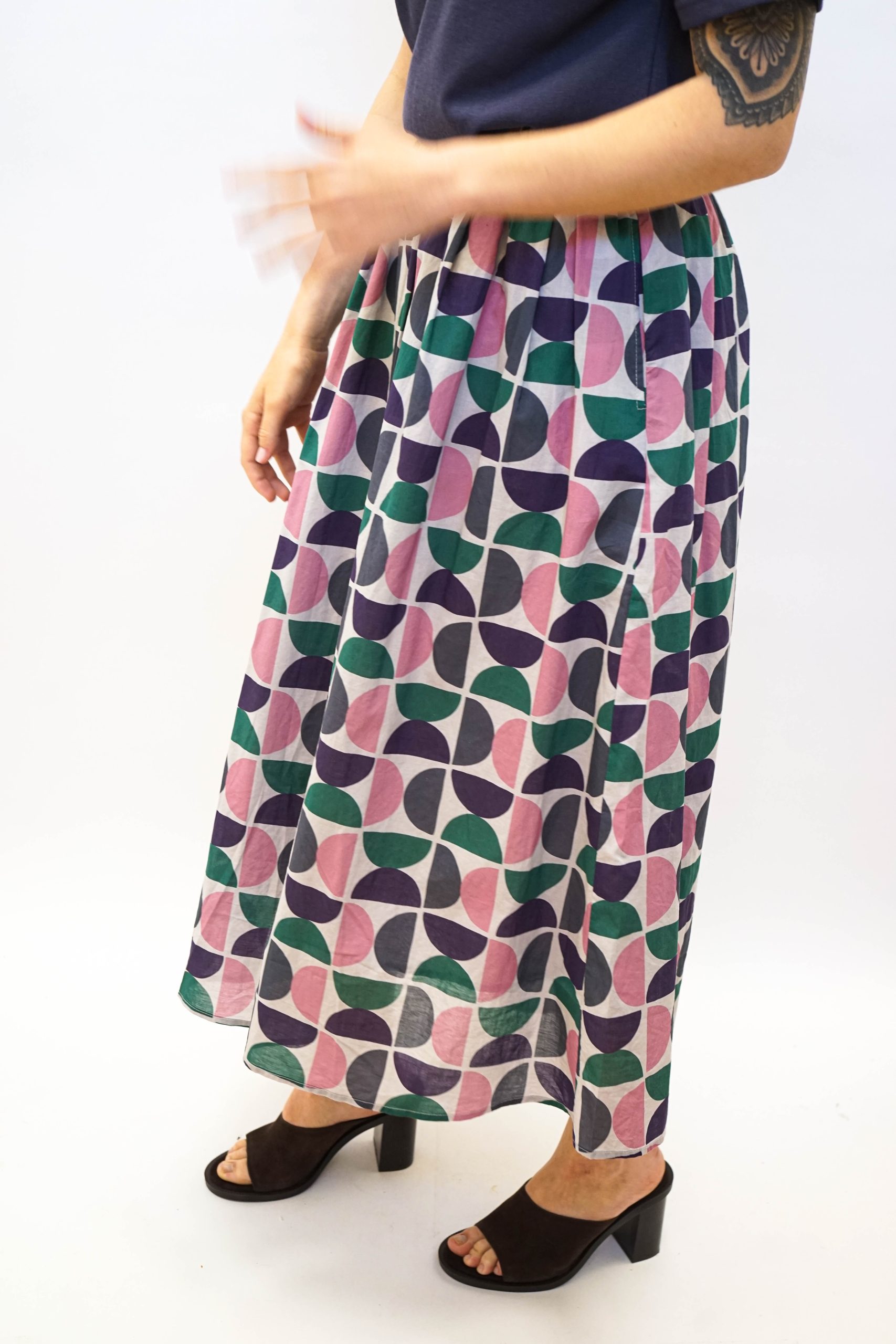 חצאית מידי בהדפס גיאומטרי של חצאי עיגולים. בגזרה מתרחבת מהמותן מטה. עם גומי מתרחב ושרוך קשירה לבן. ניתן לשלב עם טופ ג'אגלינג כחליפה