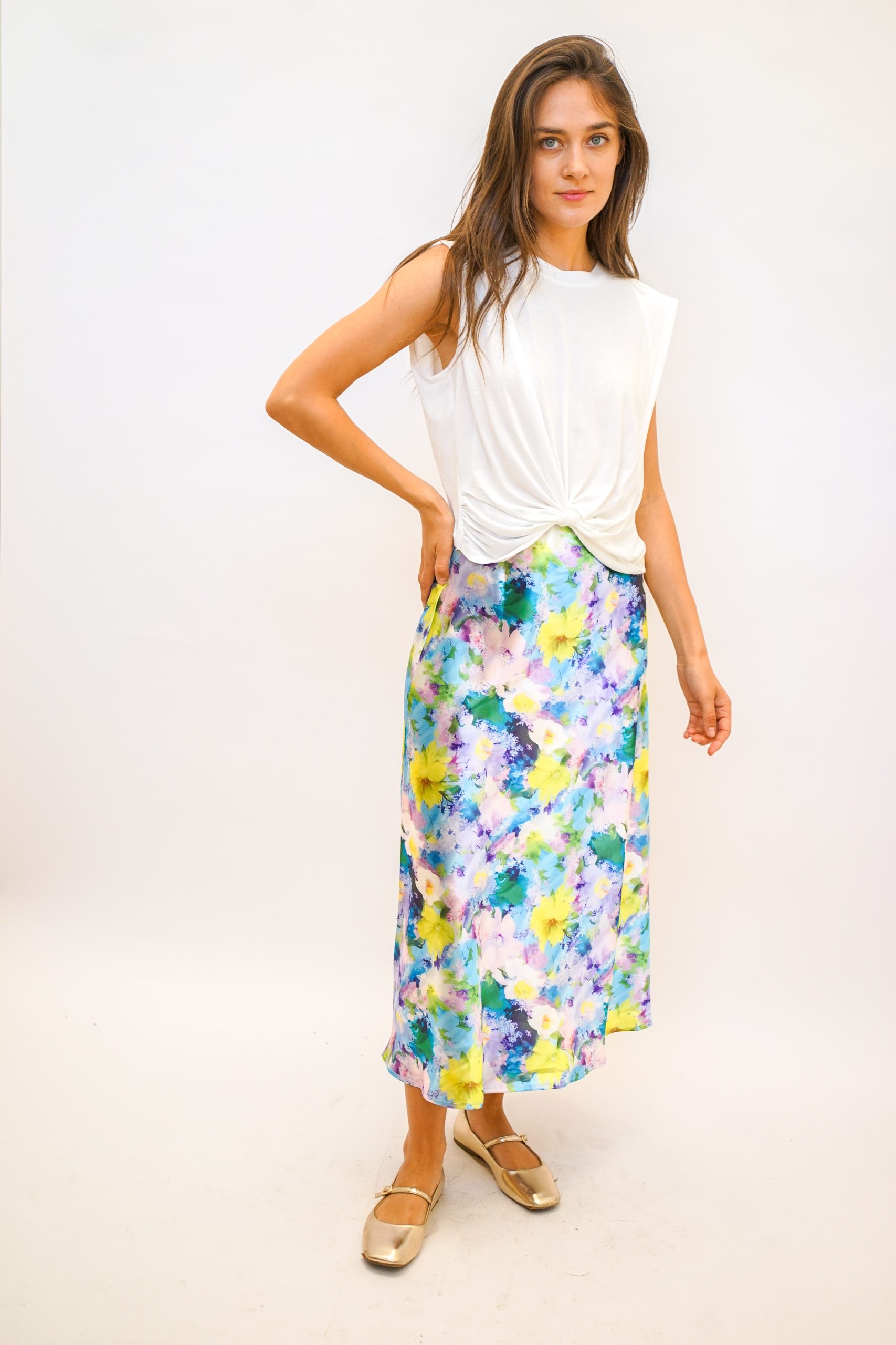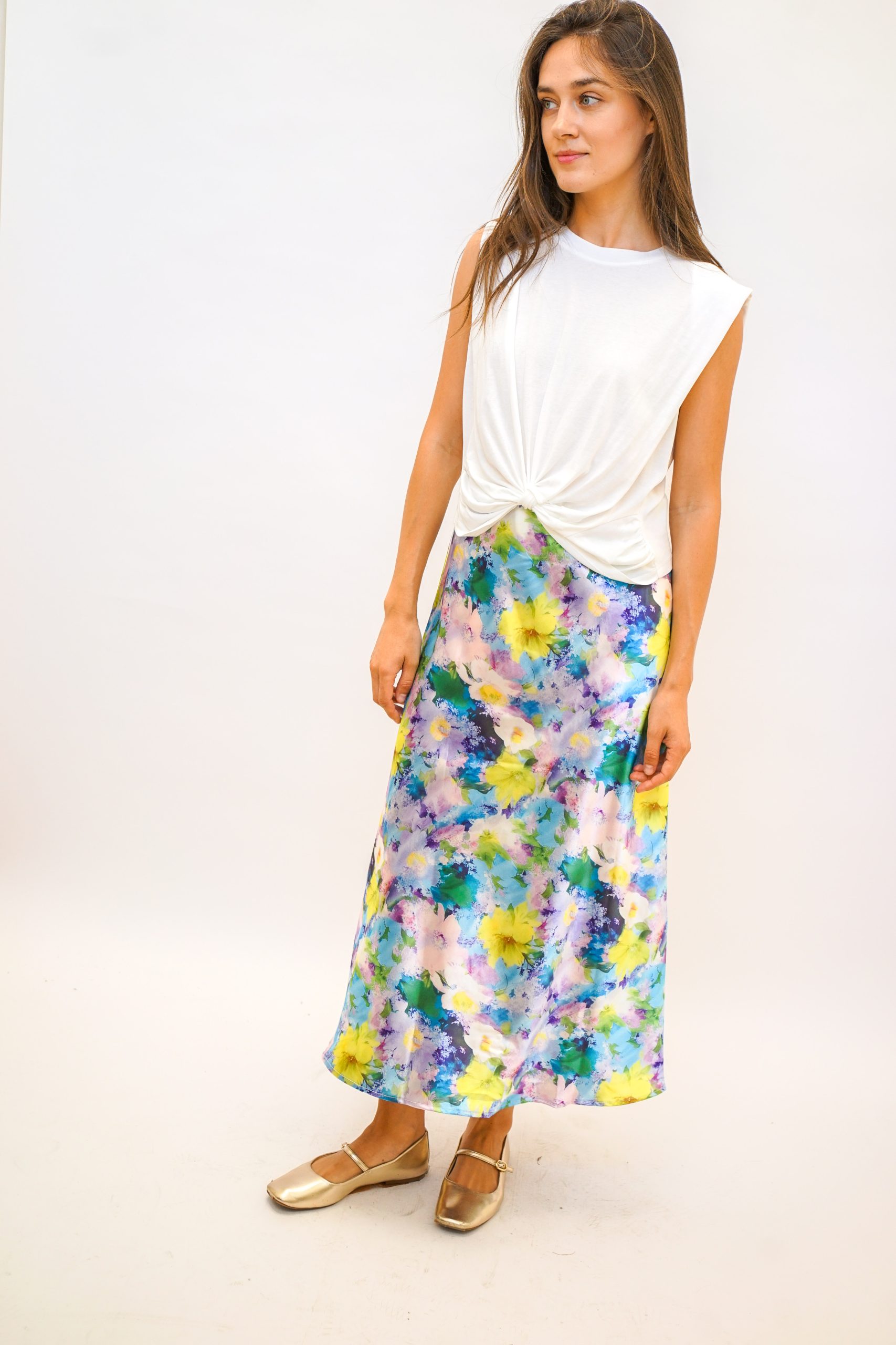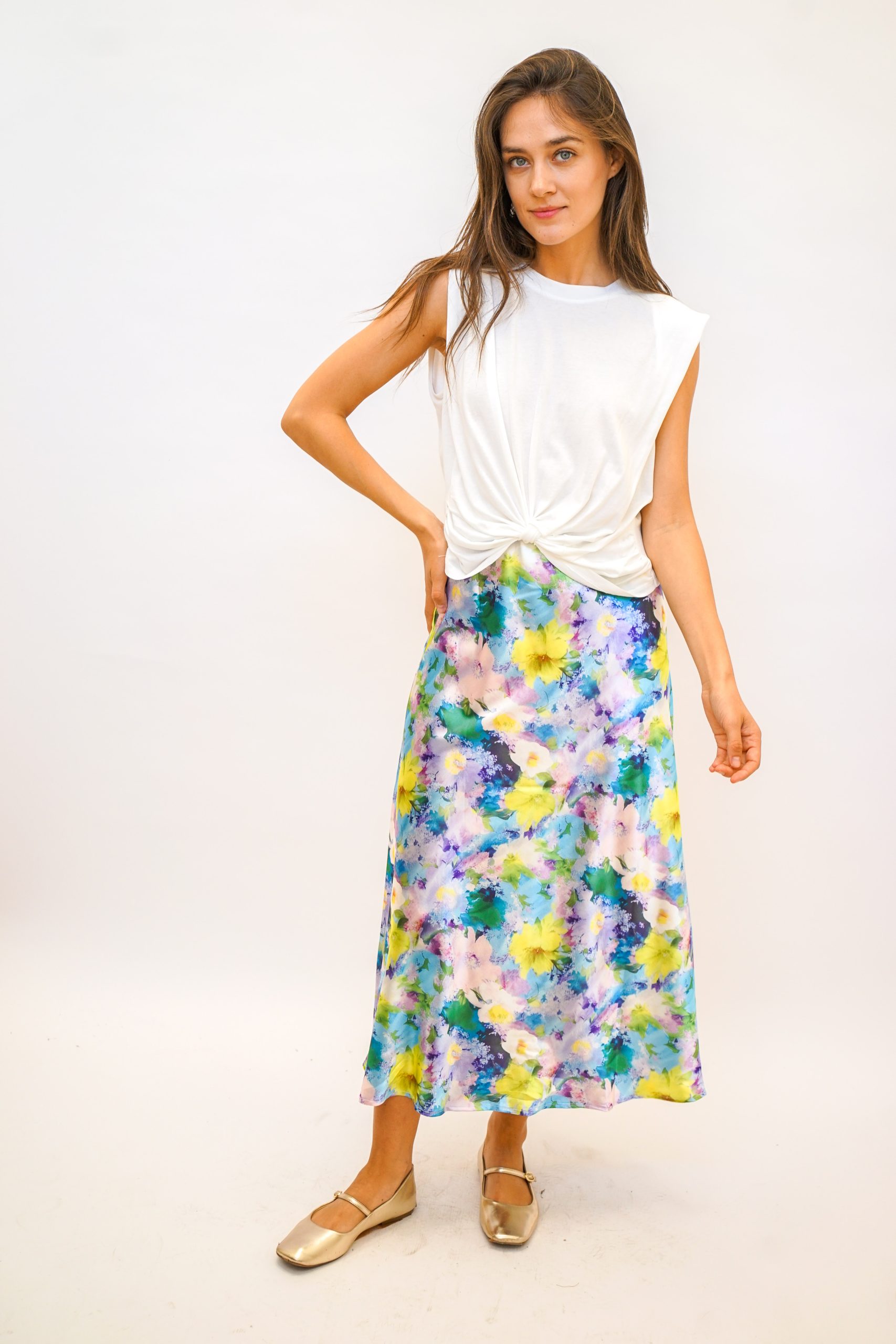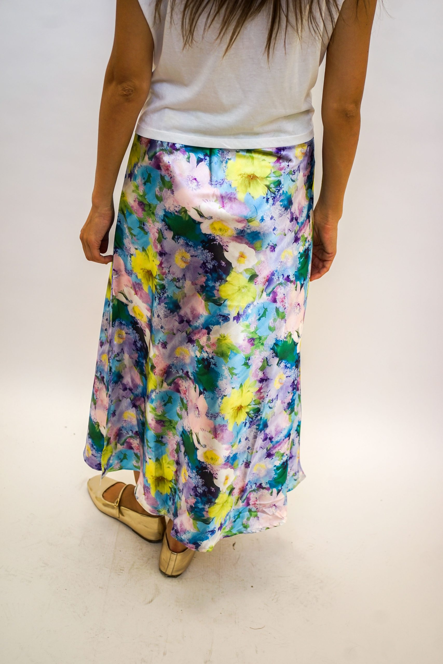 חצאית סאטן פרחונית בצבעים וואו למראה אלגנטי ויומיומי.