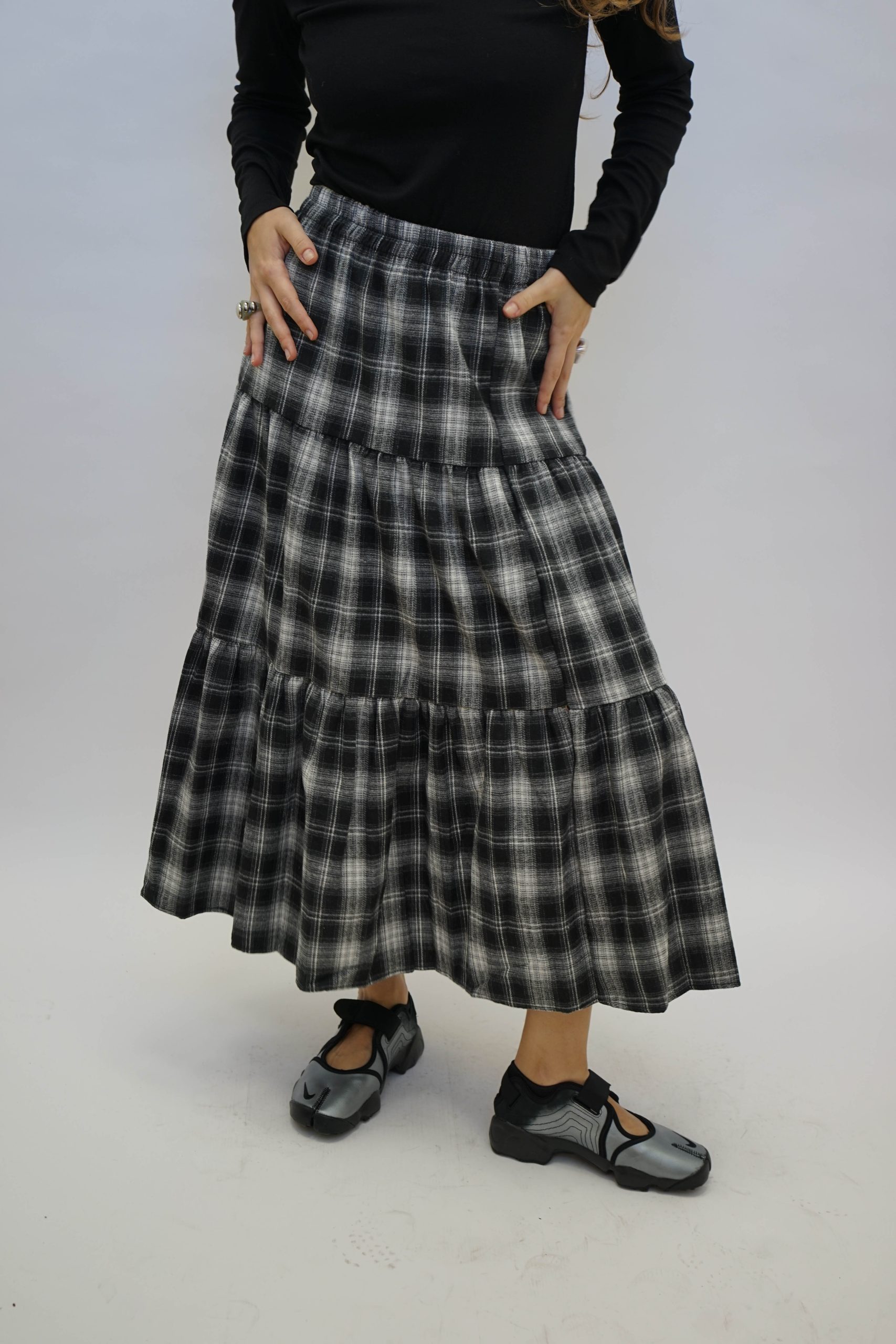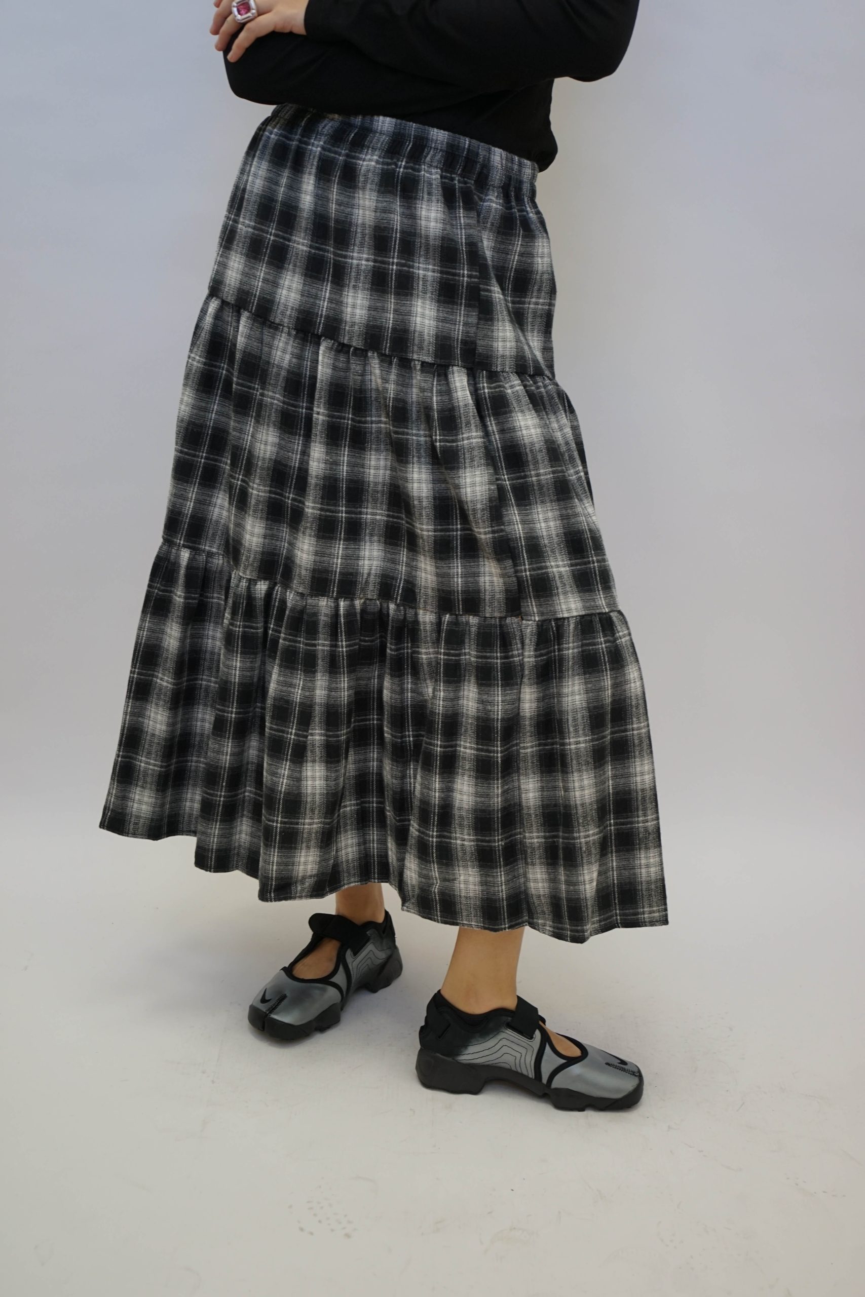 חצאית מקסי/מידי משובצת שחור לבן מבד פלאנל קלילה בצורת פעמון עם גומי למעלה.