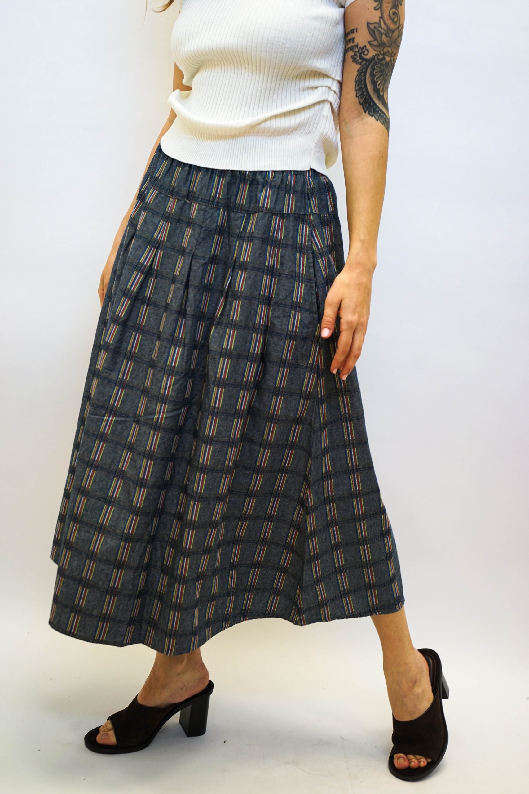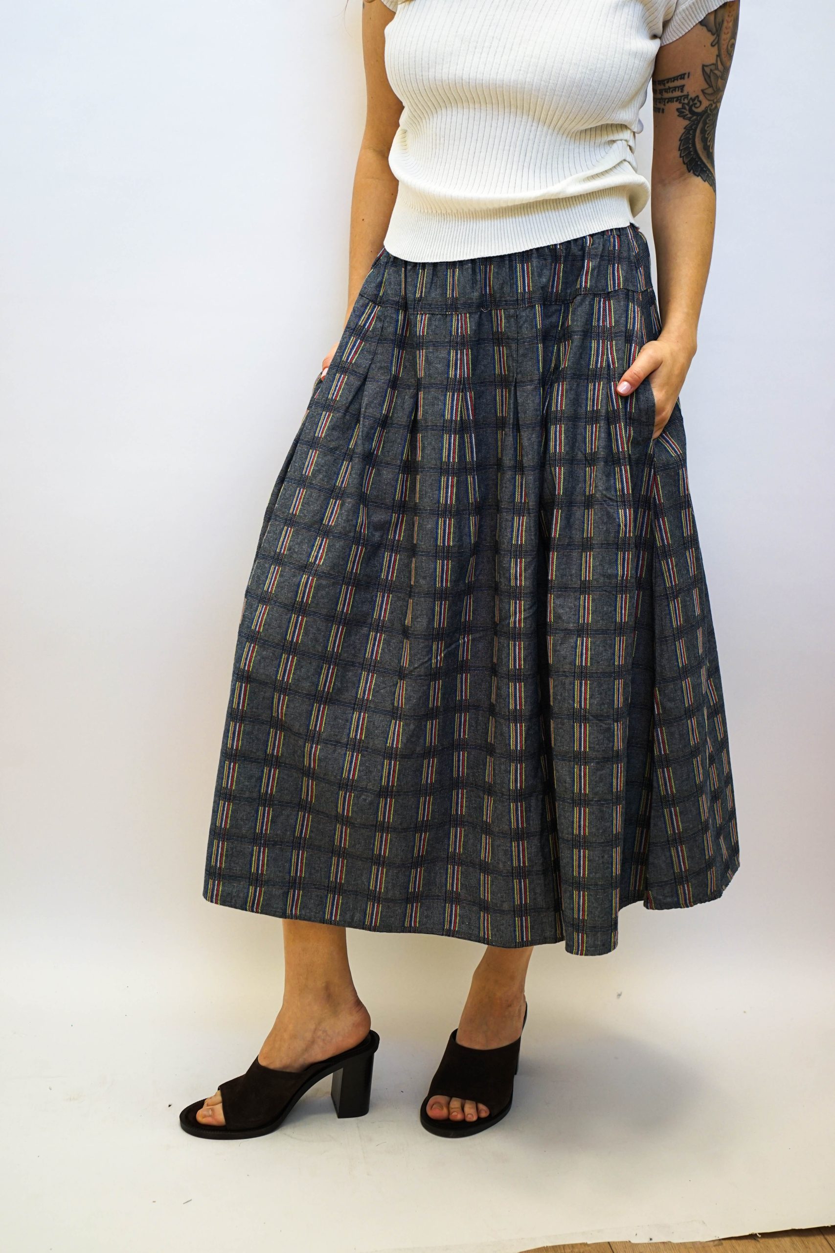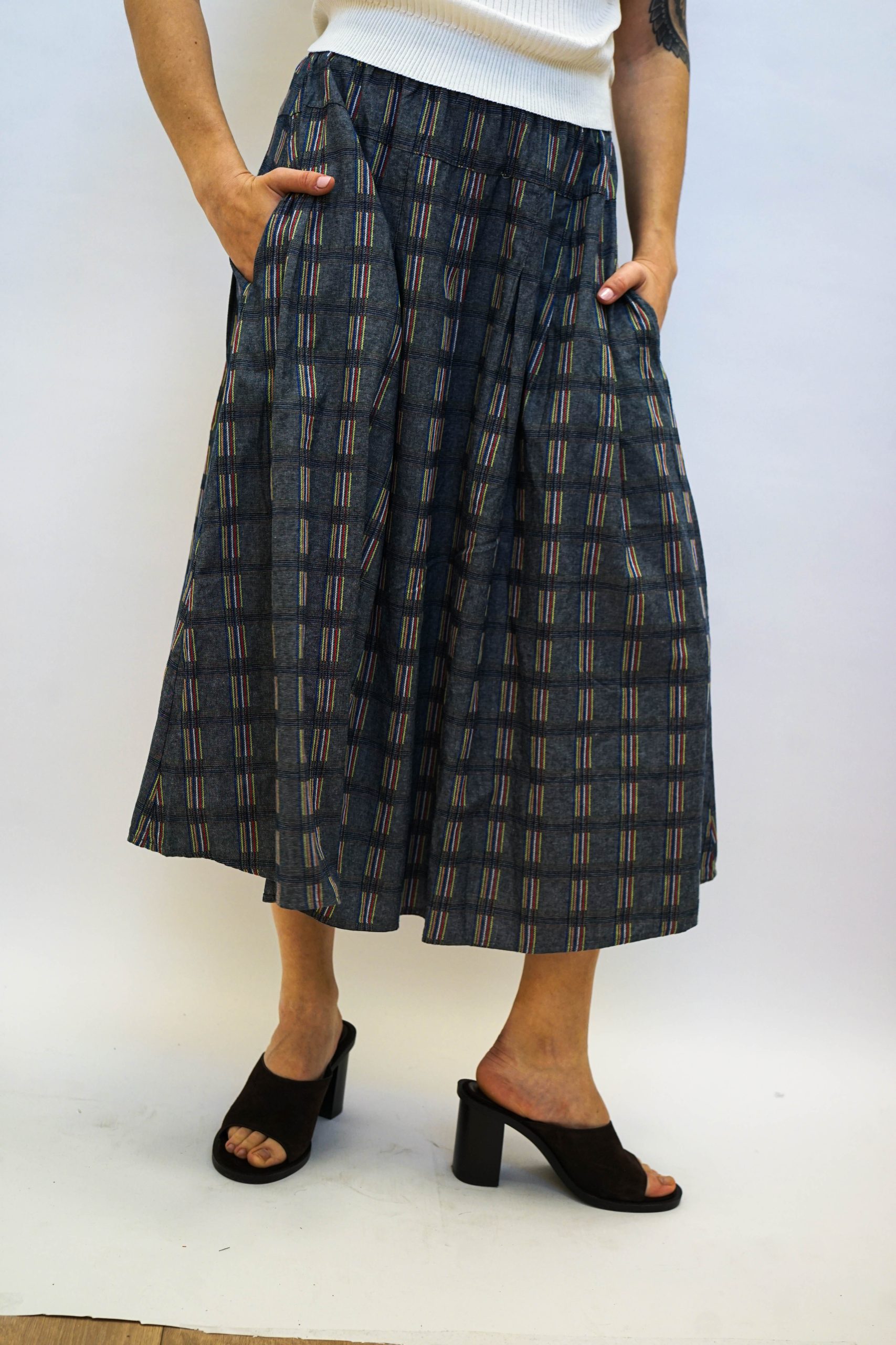 חצאית מידי בגזרה מתרחבת בהדפס משבצות בגווני כחול דנים ואפור עם מילוי צבעוני במשבצות. עם גומי גמיש וכיווצים עדינים. ניתן לשלב עם חולצת תחרה לימון טי ווש קורפ או כל טישרט חולצה מכופתרת עם סניקרס או סנדלים דקיקה וכייפית לקיץ