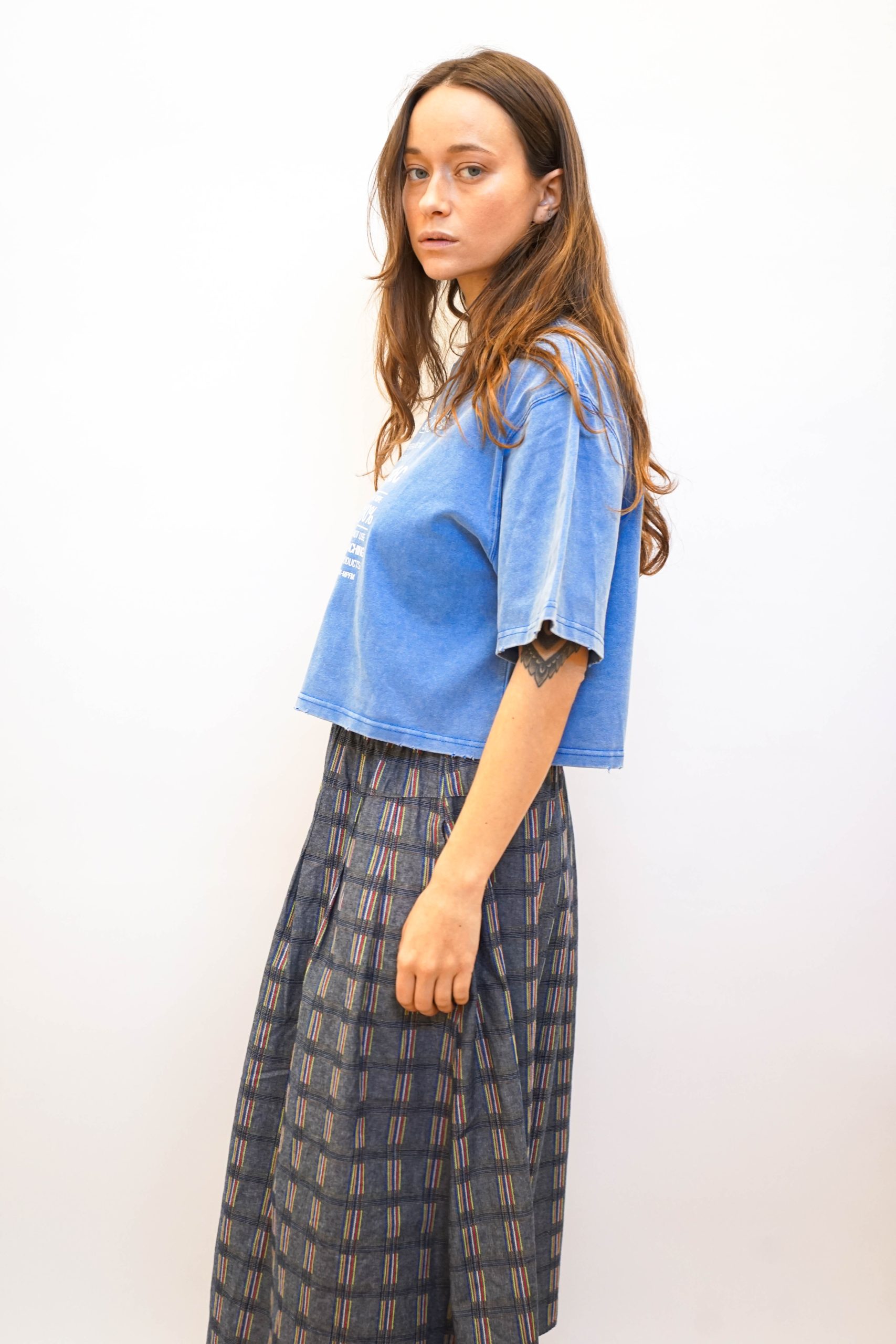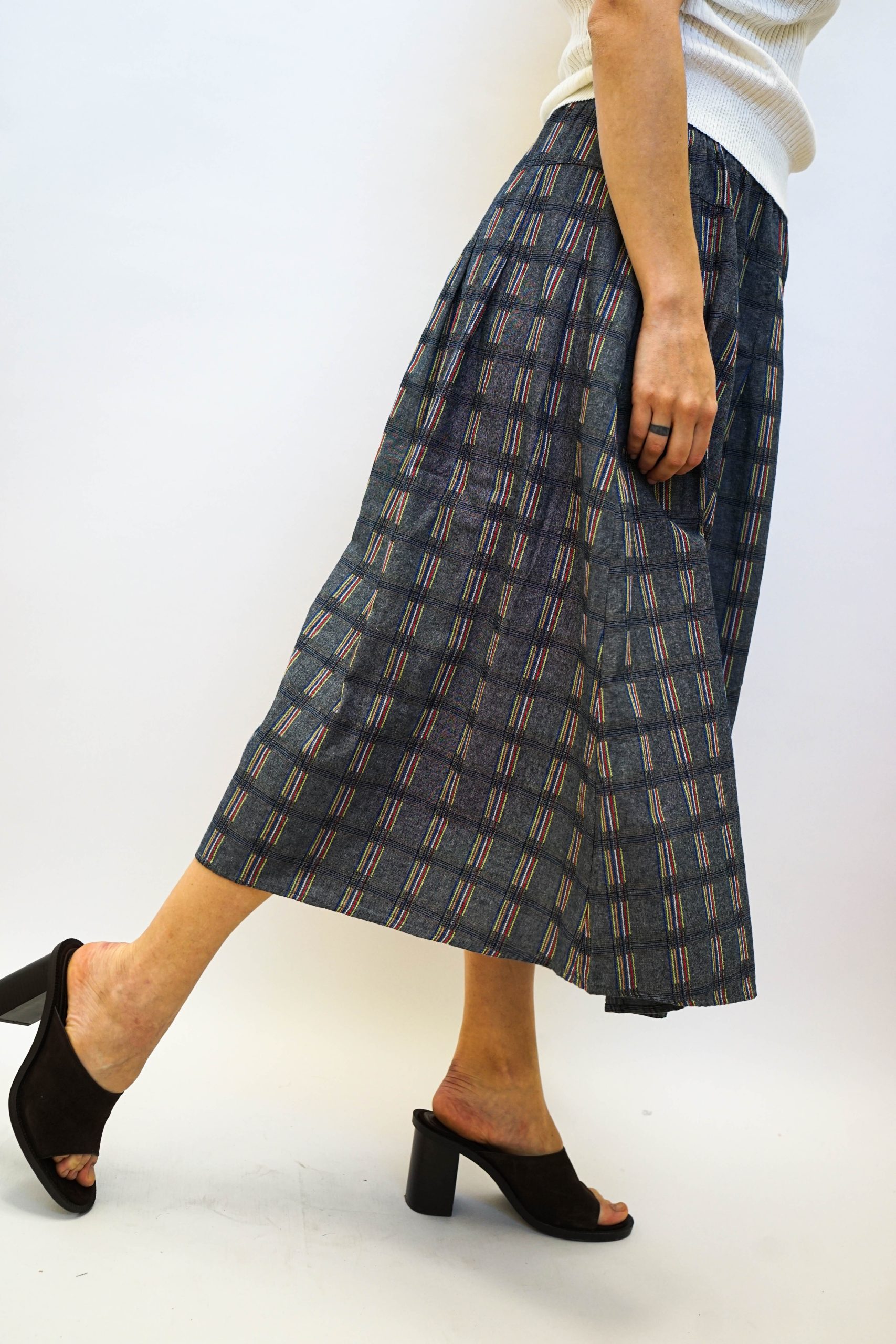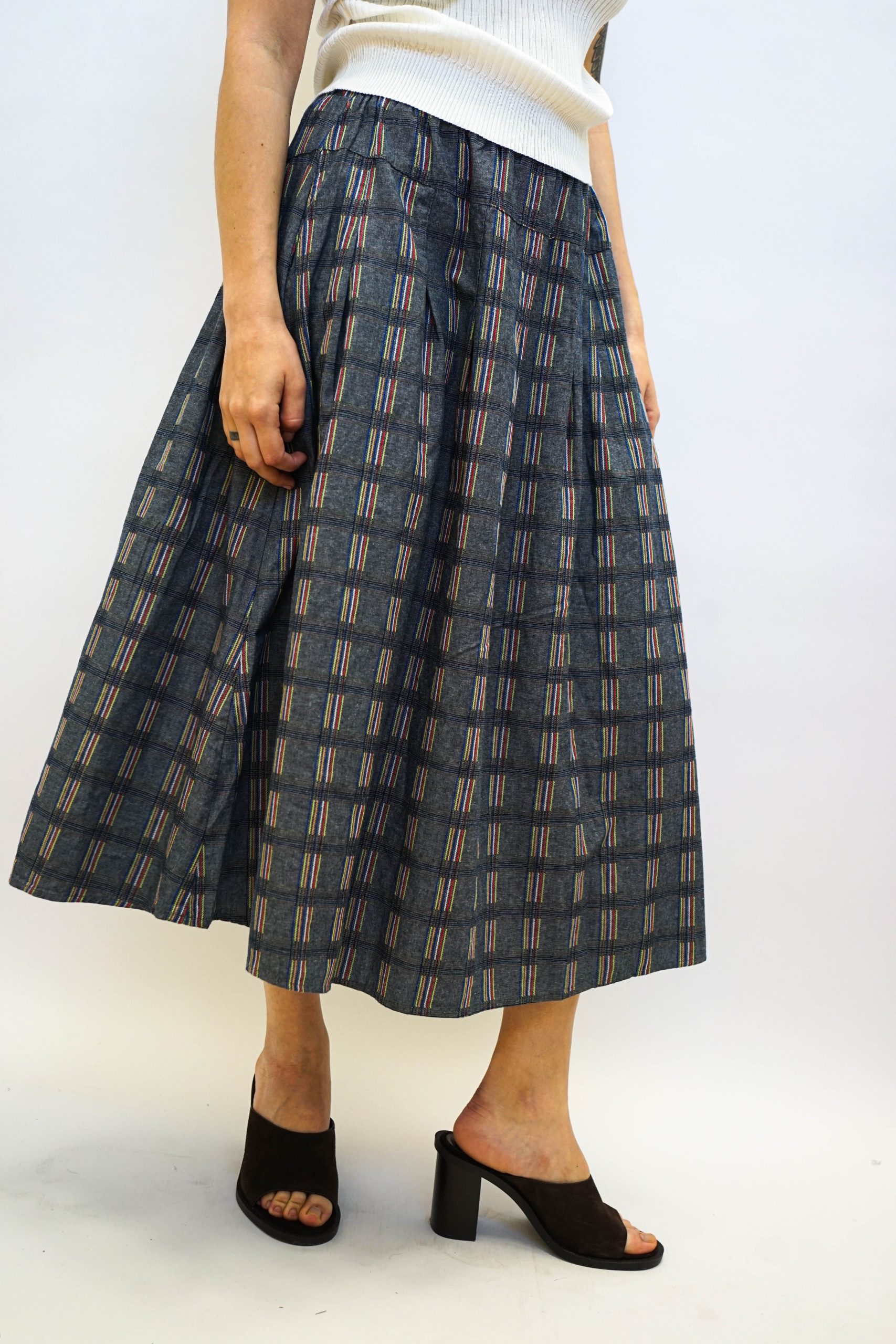חצאית מידי בגזרה מתרחבת בהדפס משבצות בגווני כחול דנים ואפור עם מילוי צבעוני במשבצות. עם גומי גמיש וכיווצים עדינים. ניתן לשלב עם חולצת תחרה לימון טי ווש קורפ או כל טישרט חולצה מכופתרת עם סניקרס או סנדלים דקיקה וכייפית לקיץ