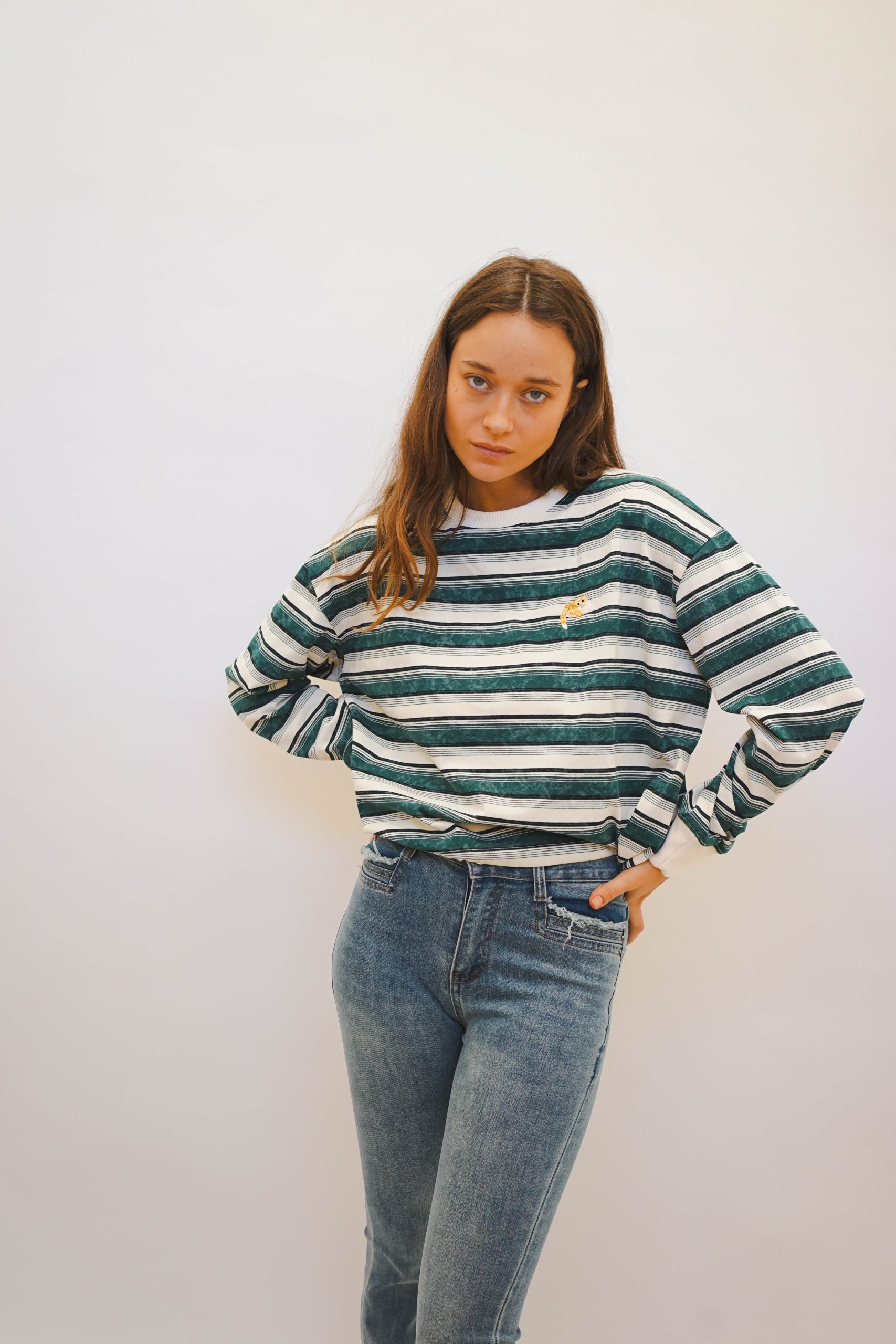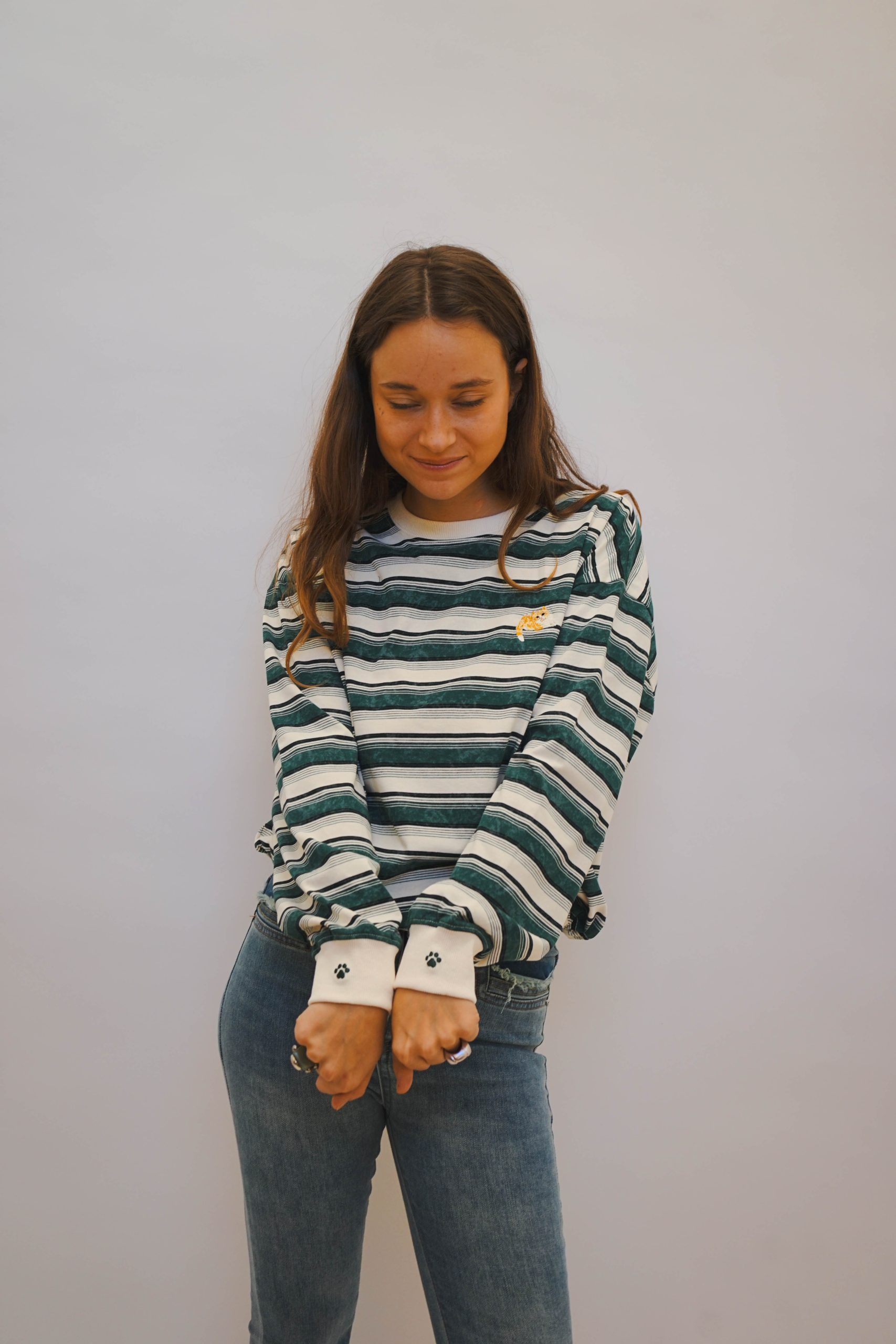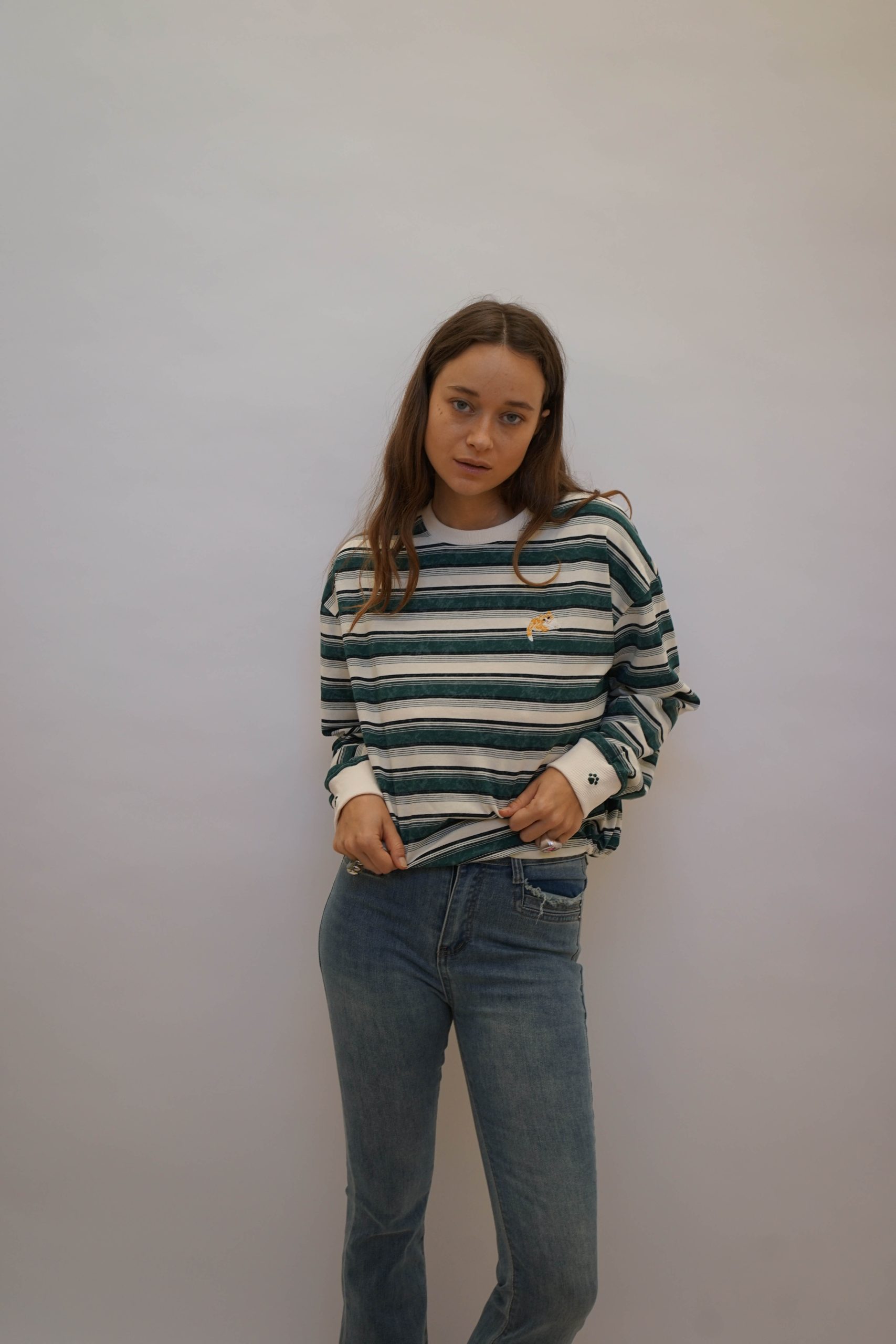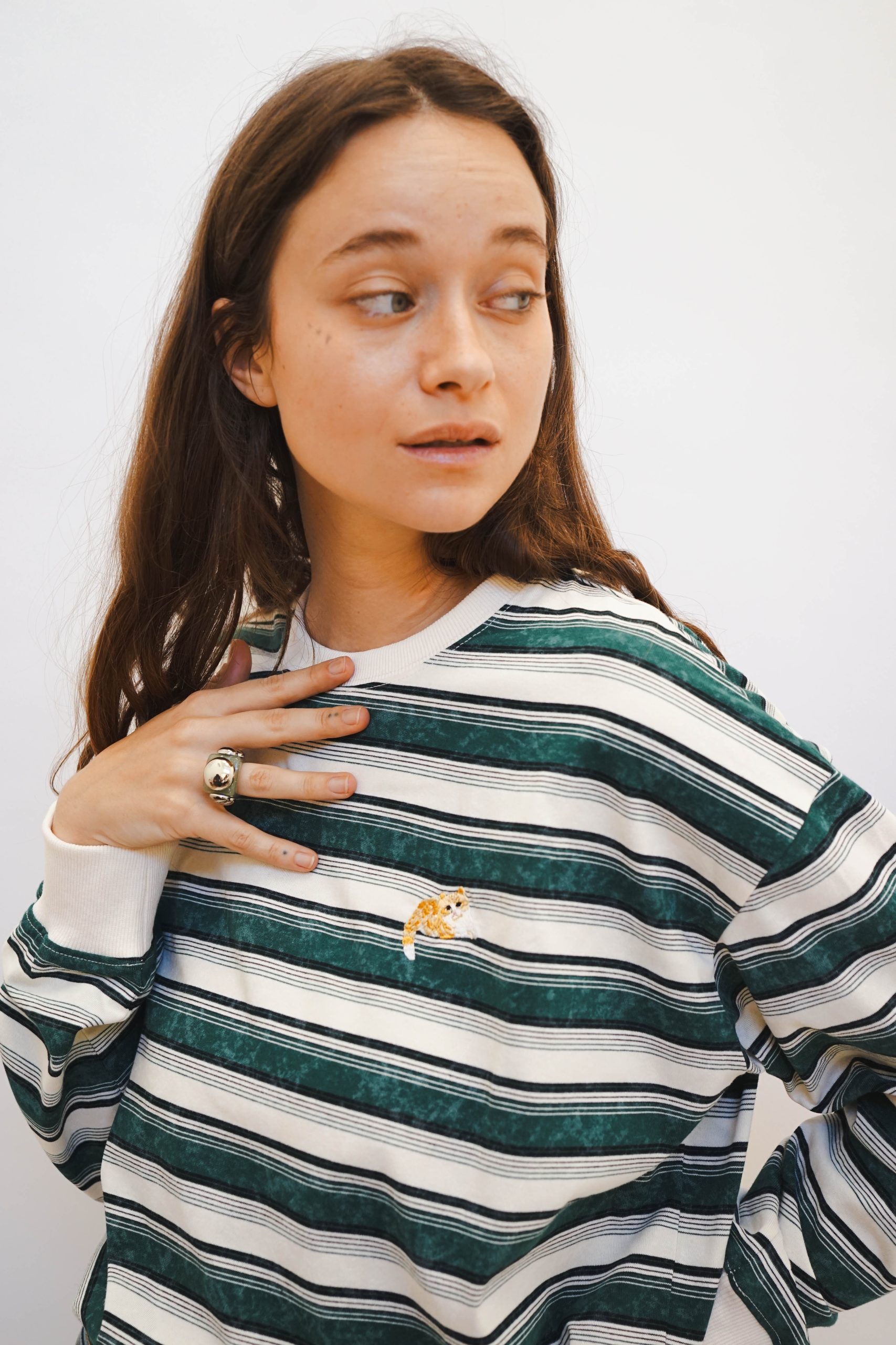 טישרט קלילה פסים עם רקמת חתול בצד בגיזרה רחוקה מהגוף.למראה קליל עם ג'ינס,מכנס מחוייט, ניתן ללבוש מעל חולצה כופתרת ארוכה או קצרה, מתחת לאפודה או ווסט עם חצאית למראה יותר קלאסי. כיווץ בסיומת למראה צמוד יותר במותן וכפות רקומות על פטנט השרוולים