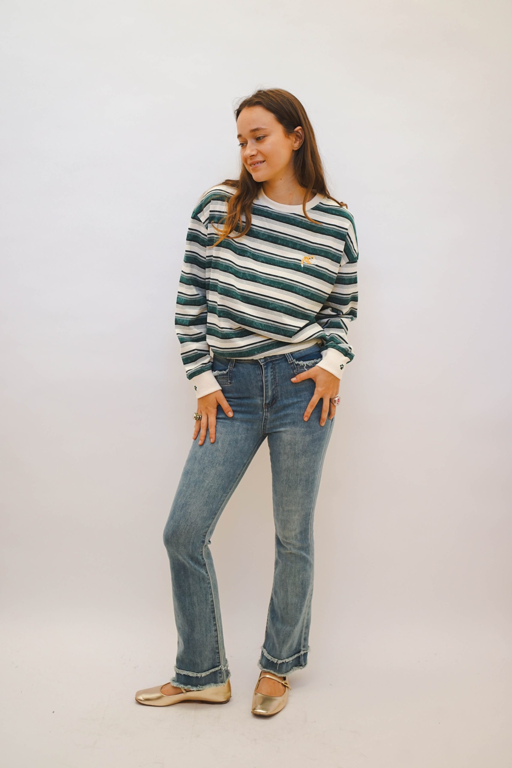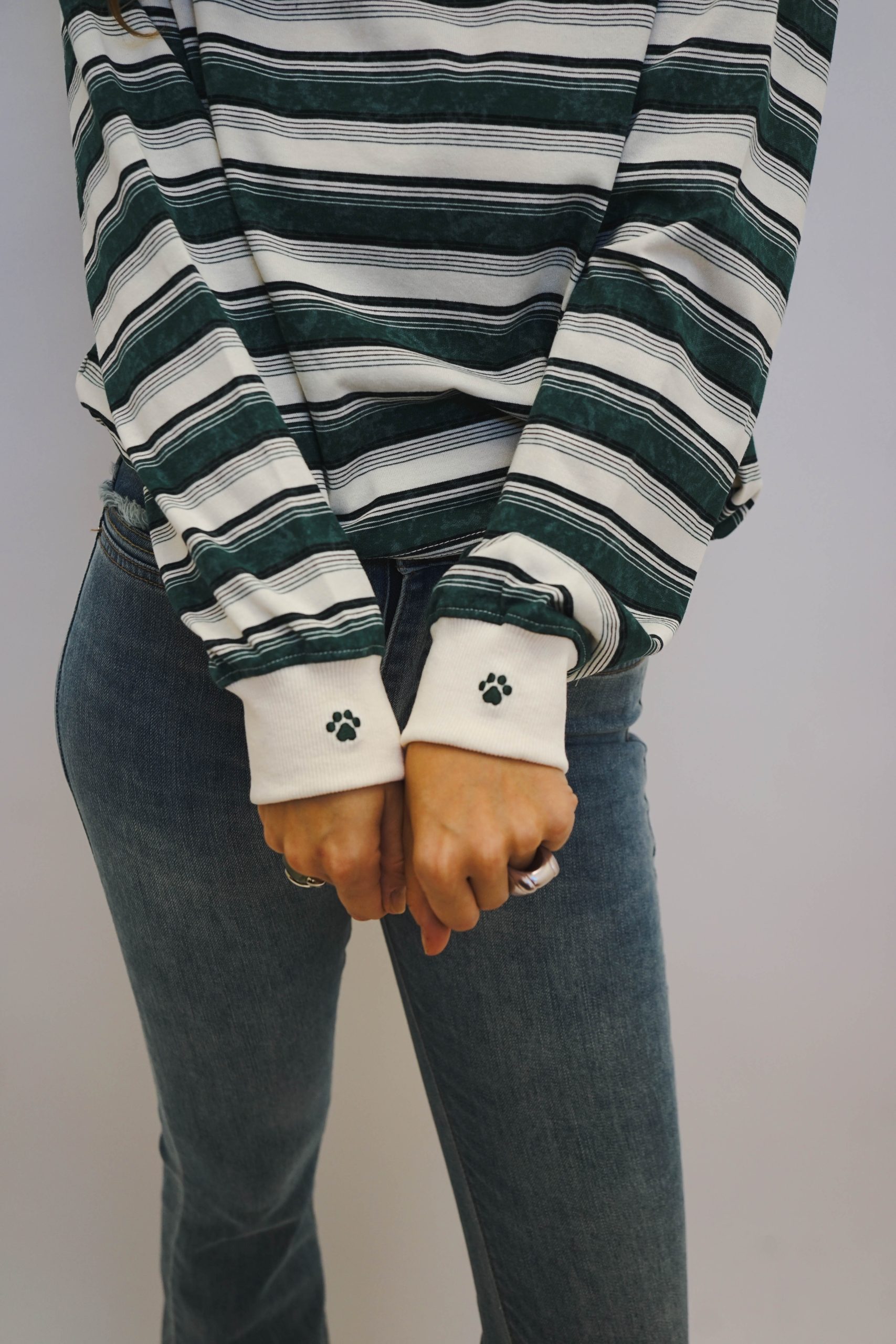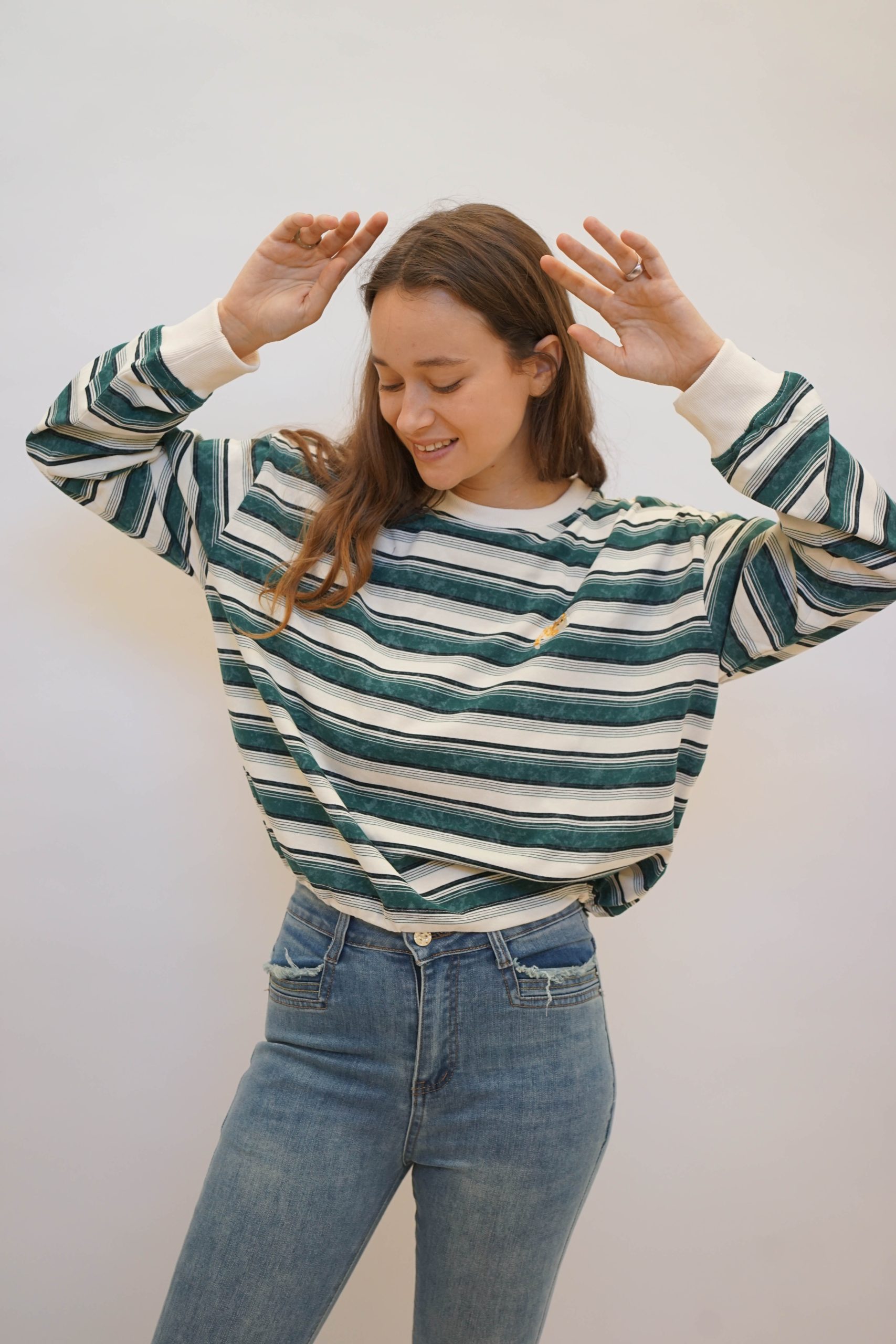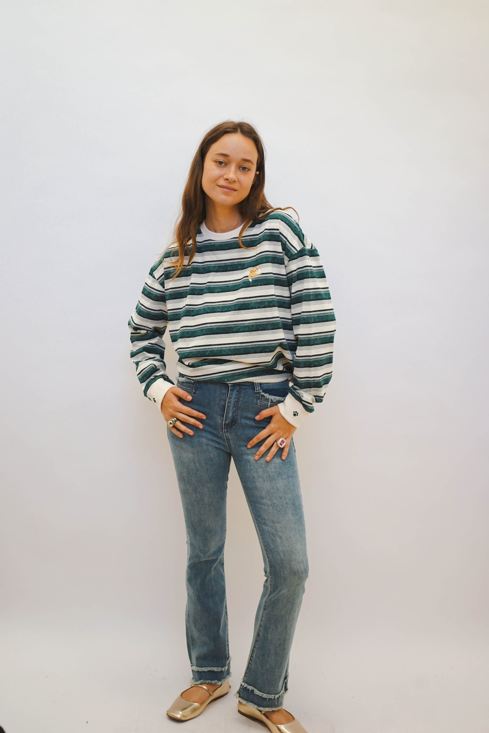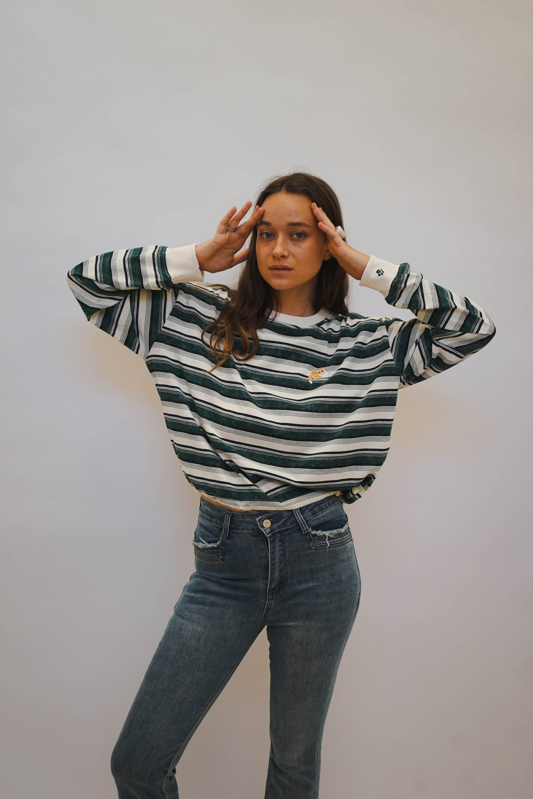 טישרט קלילה פסים עם רקמת חתול בצד בגיזרה רחוקה מהגוף.למראה קליל עם ג'ינס,מכנס מחוייט, ניתן ללבוש מעל חולצה כופתרת ארוכה או קצרה, מתחת לאפודה או ווסט עם חצאית למראה יותר קלאסי. כיווץ בסיומת למראה צמוד יותר במותן וכפות רקומות על פטנט השרוולים