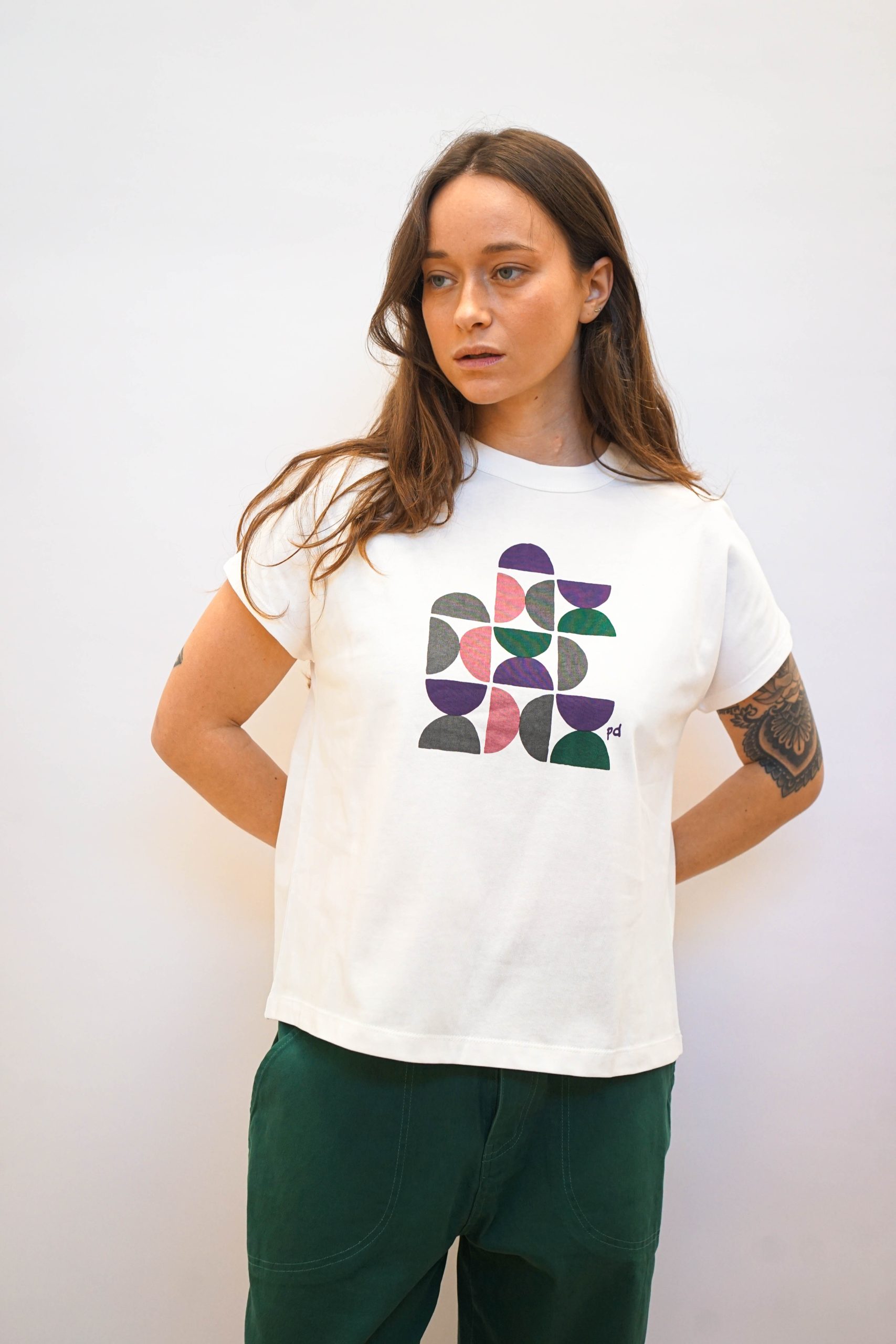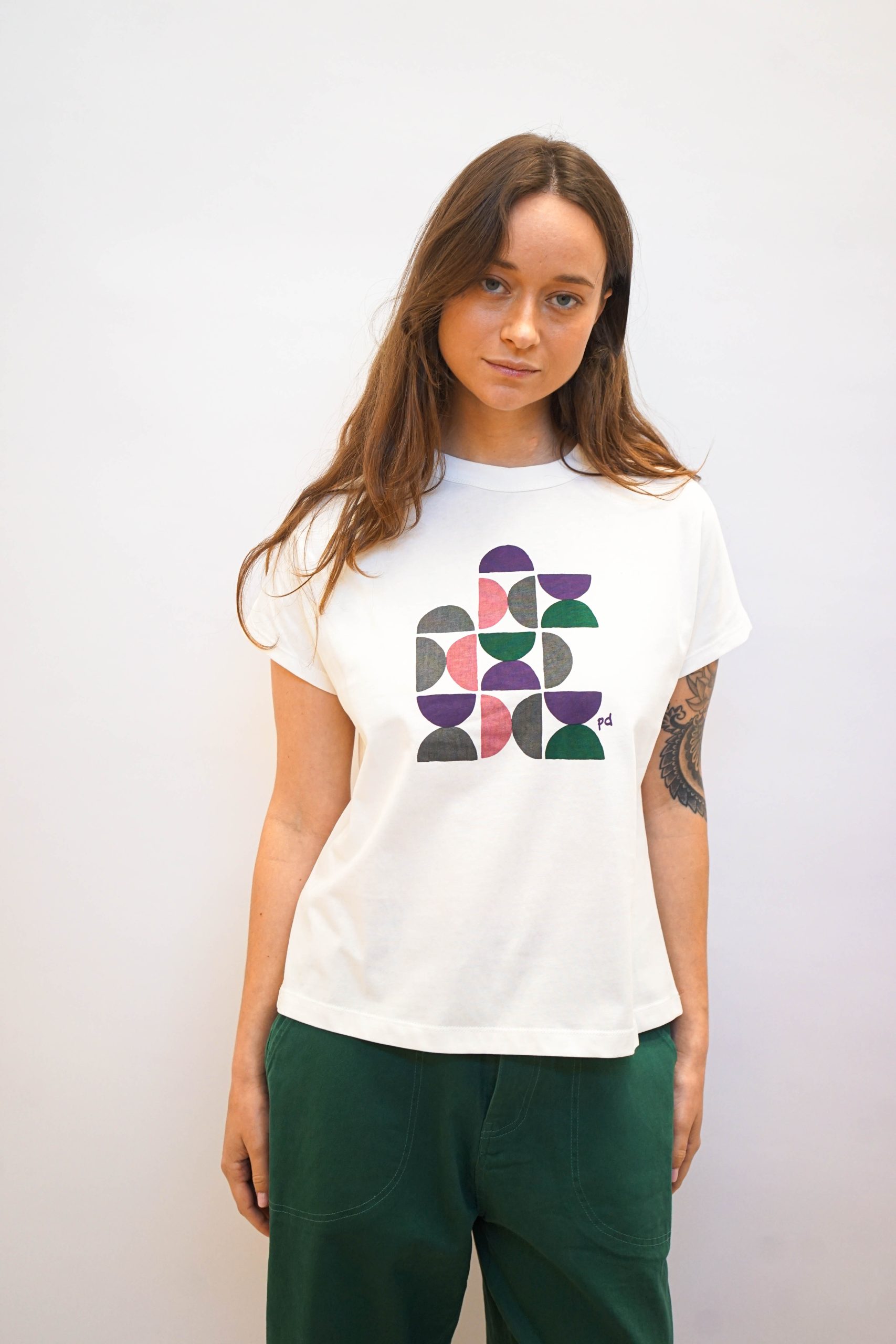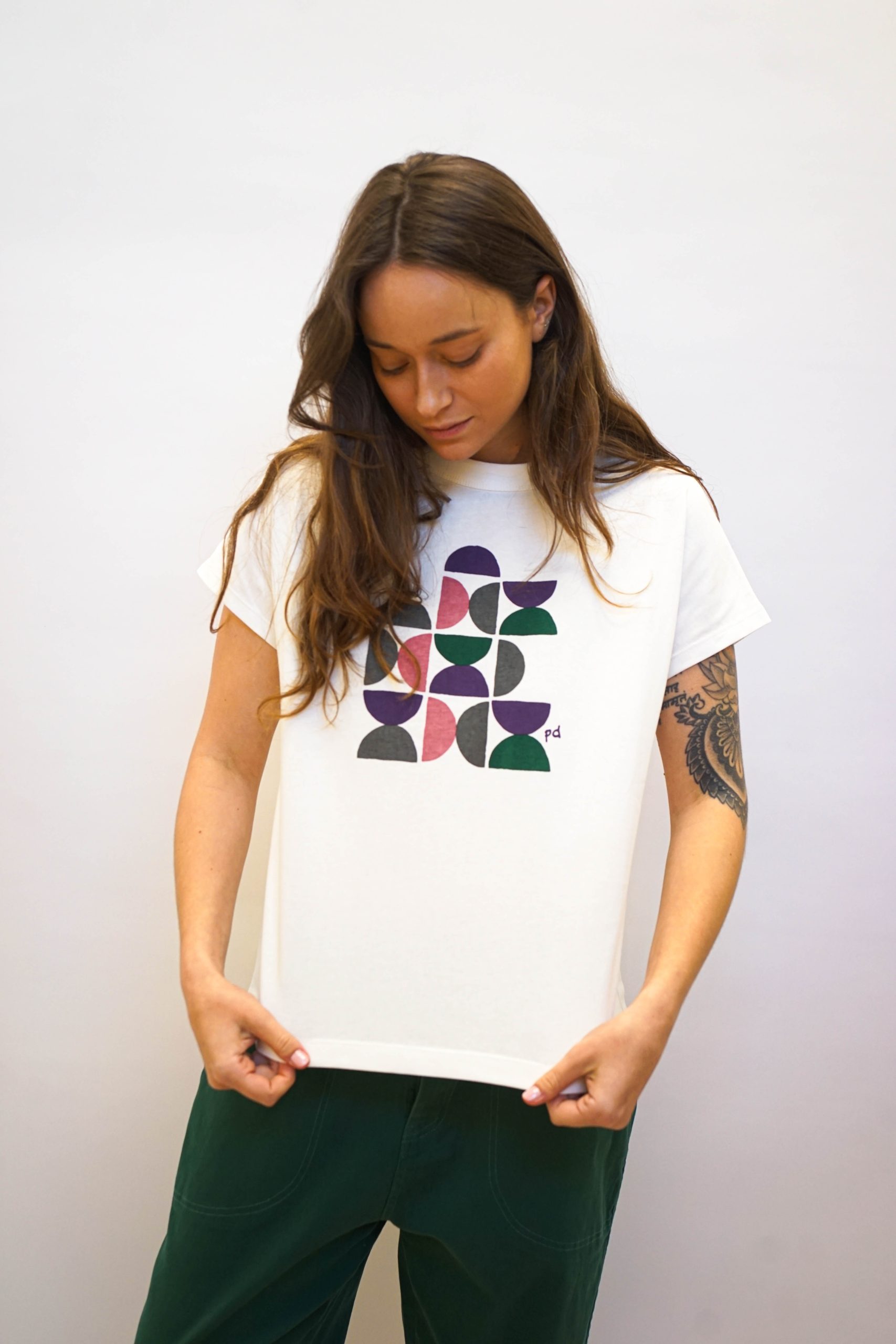 טישרט לבנה עם הדפס גיאומטרי בעיצוב מינימליסטי ומתוחכם. בגזרה קרובה לגוף ניתן לשלב עם חצאית עם הדפס זהה או עם ג'ינס מכנסי גרין בד 100% כותנה היקף 109 אורך 60