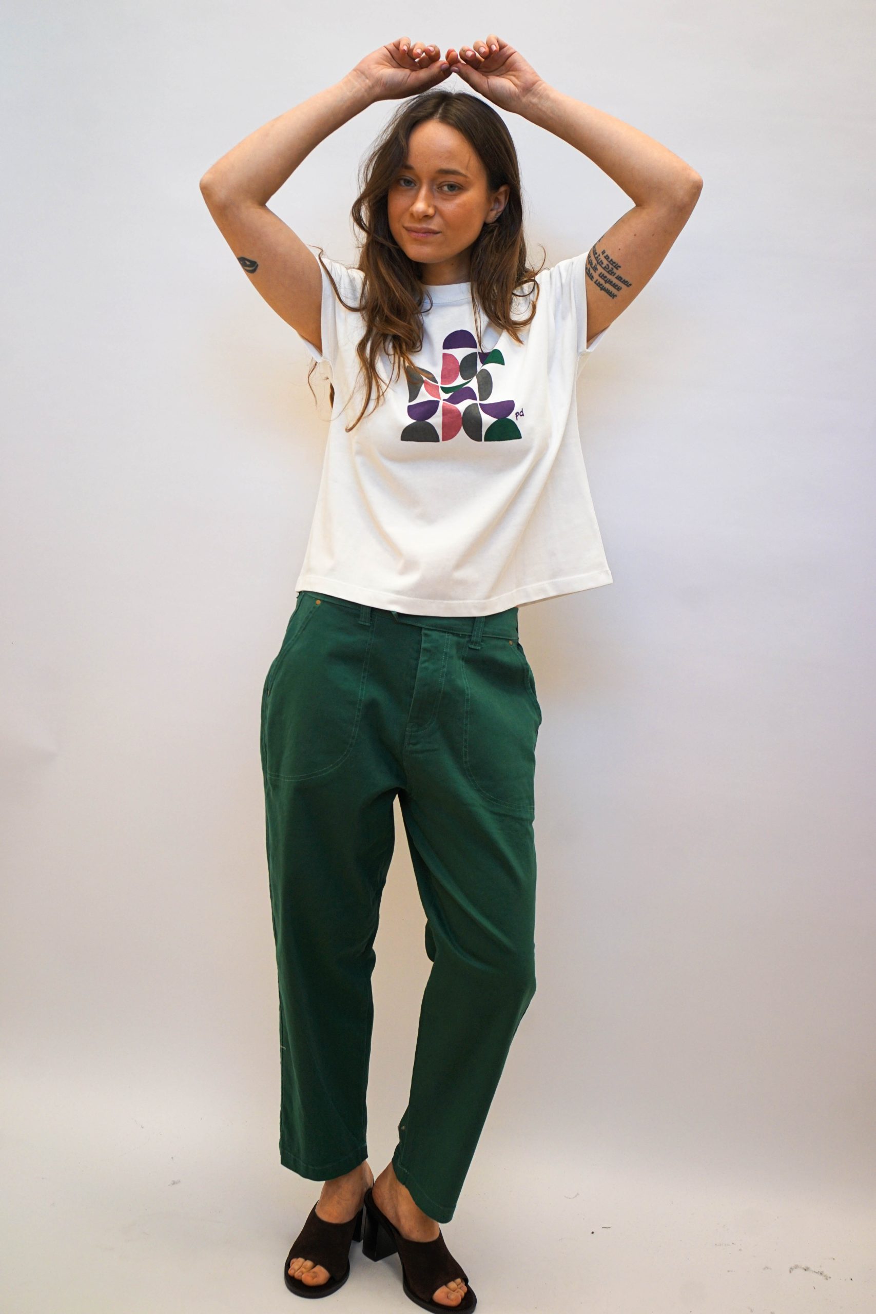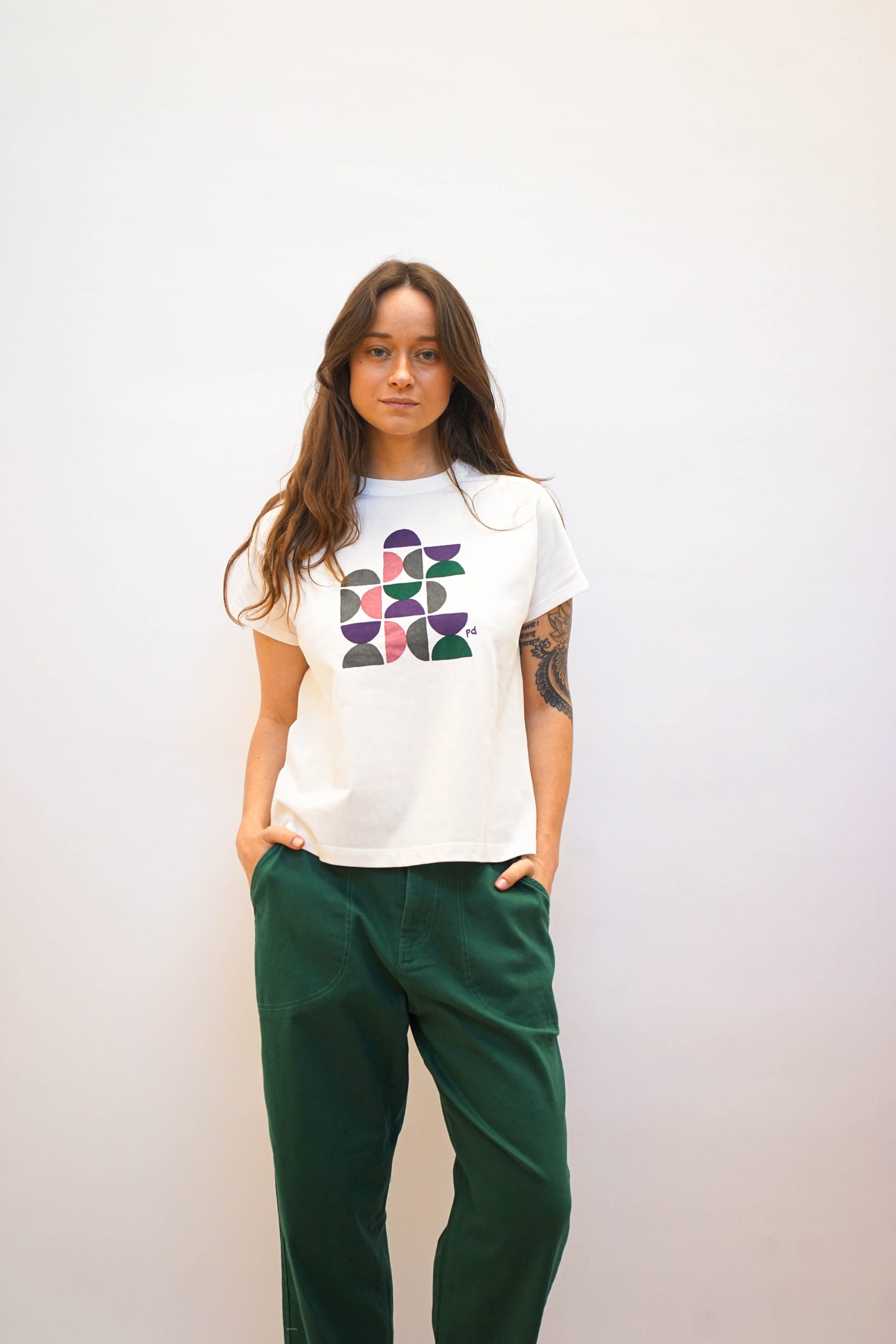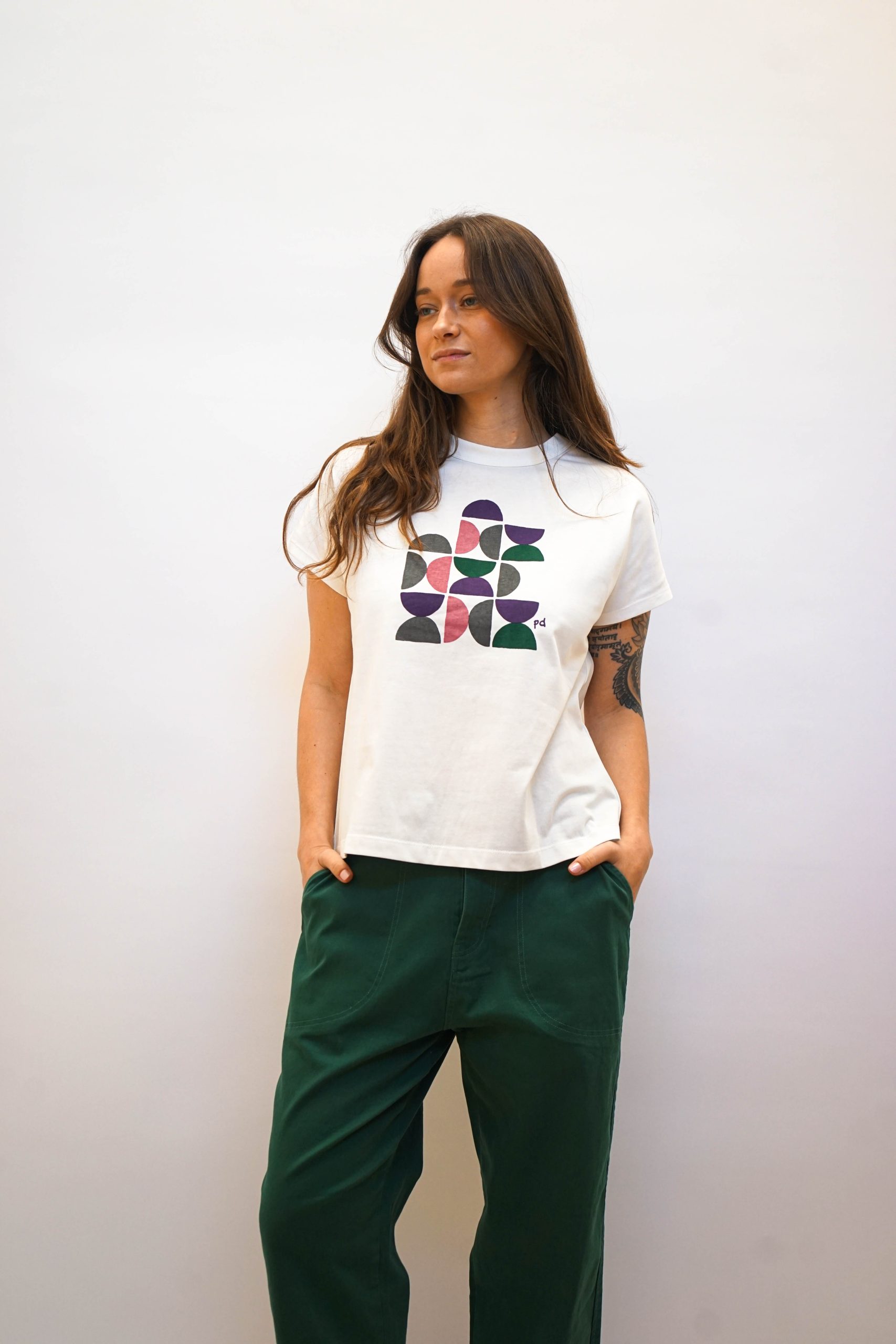 טישרט לבנה עם הדפס גיאומטרי בעיצוב מינימליסטי ומתוחכם. בגזרה קרובה לגוף ניתן לשלב עם חצאית עם הדפס זהה או עם ג'ינס מכנסי גרין בד 100% כותנה היקף 109 אורך 60