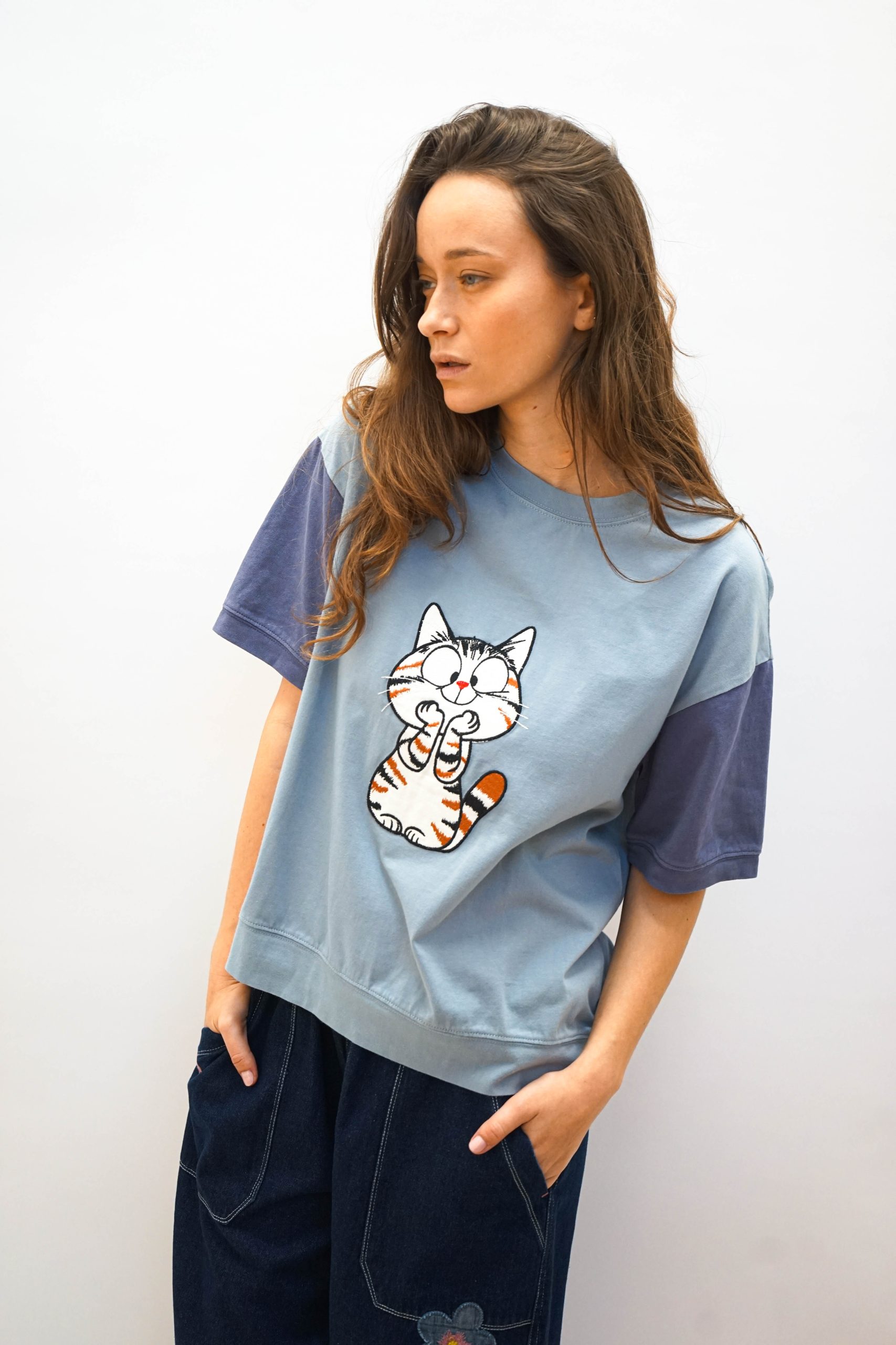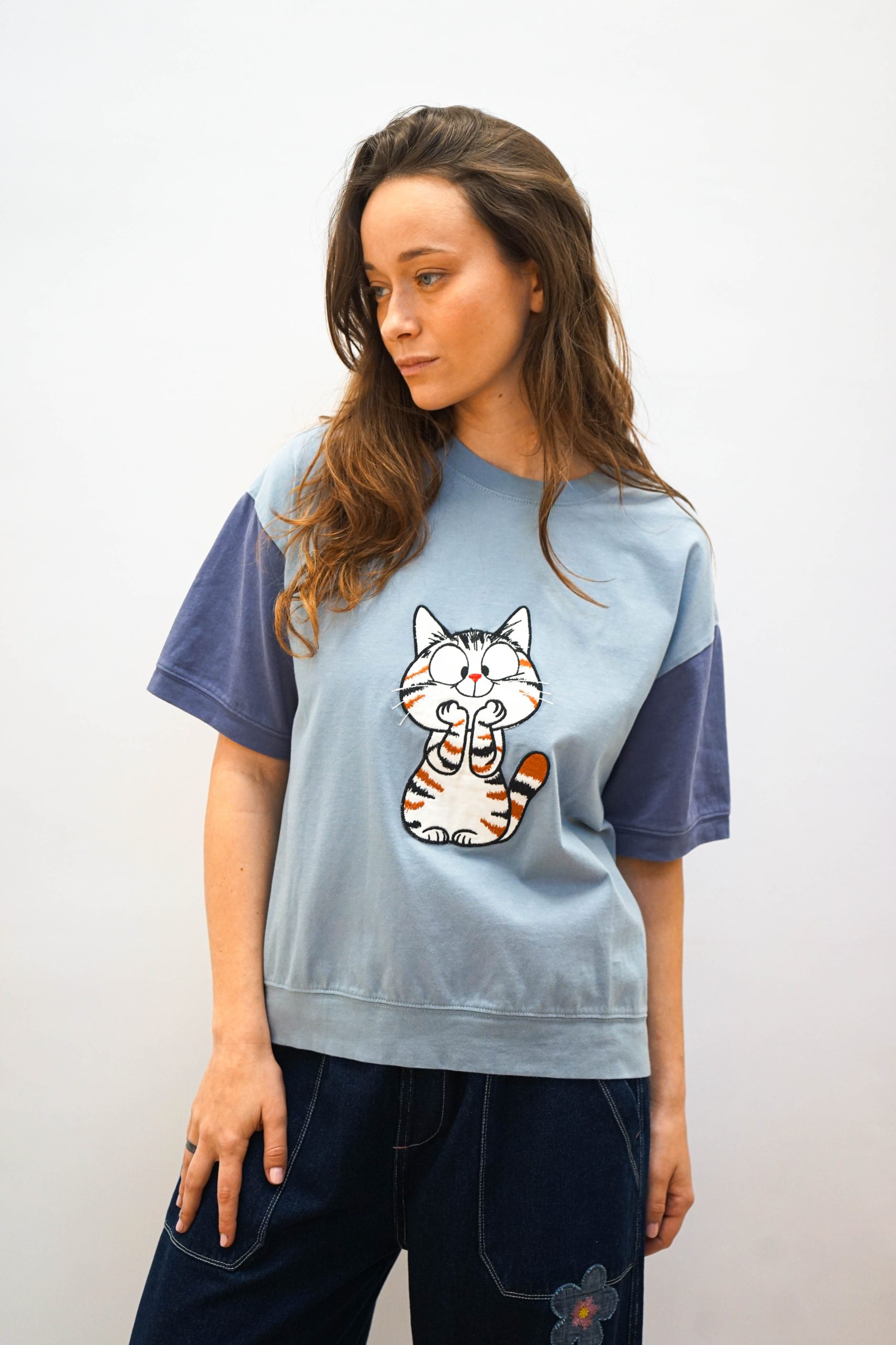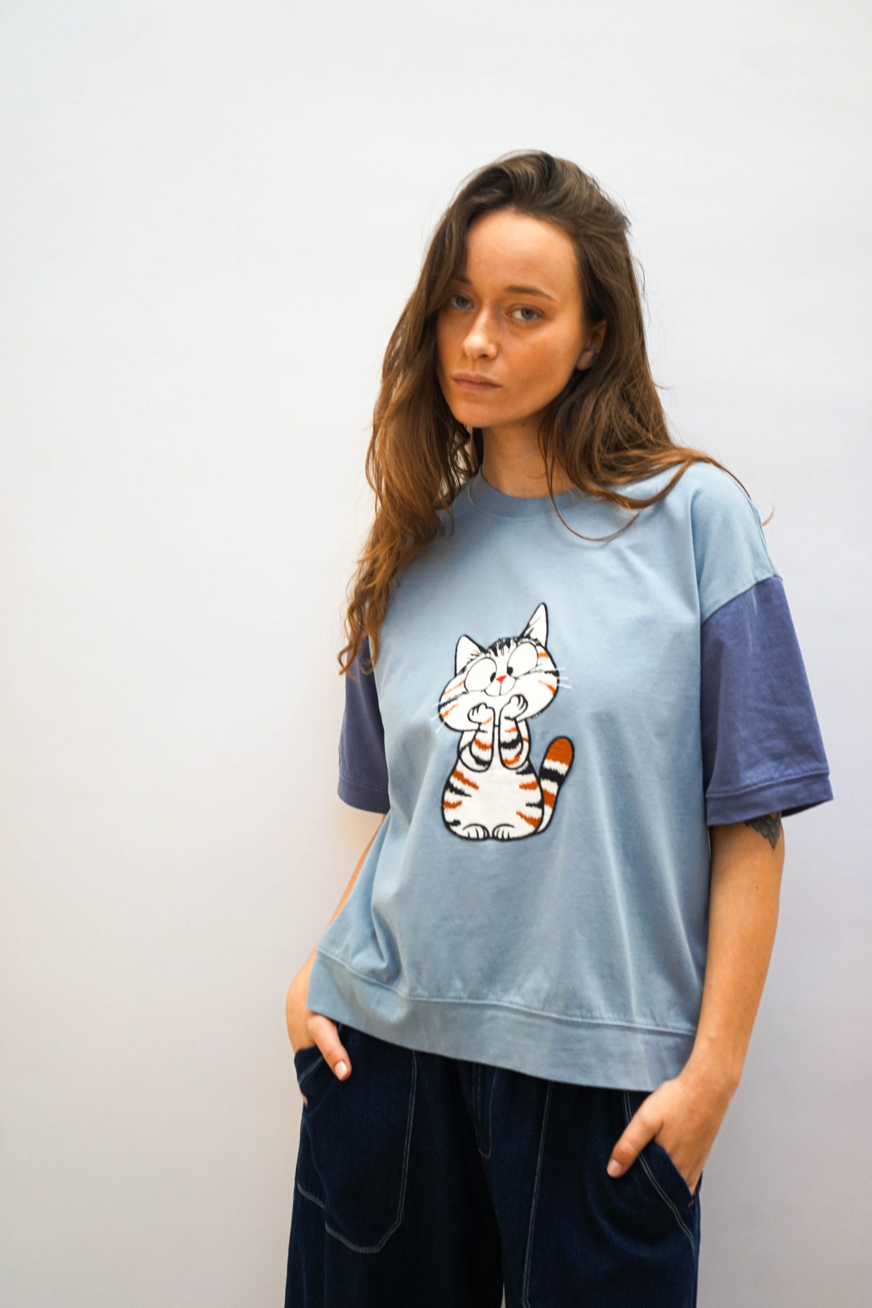 טי שרט בגזרה מעט רחוקה מהגוף. בצבע תכלת עם שרוולים סגלגלים שיוצרים מראה מדורג. במרכז אפליקצית חתול. מסתיימת עם מכפלת בתחתית . ניתן לשלב עם מכנסי מורי חרדל ג'ינס פרח או מכנסי דוטס רקומות בד 100% כותנה. היקף 112 אורך 62