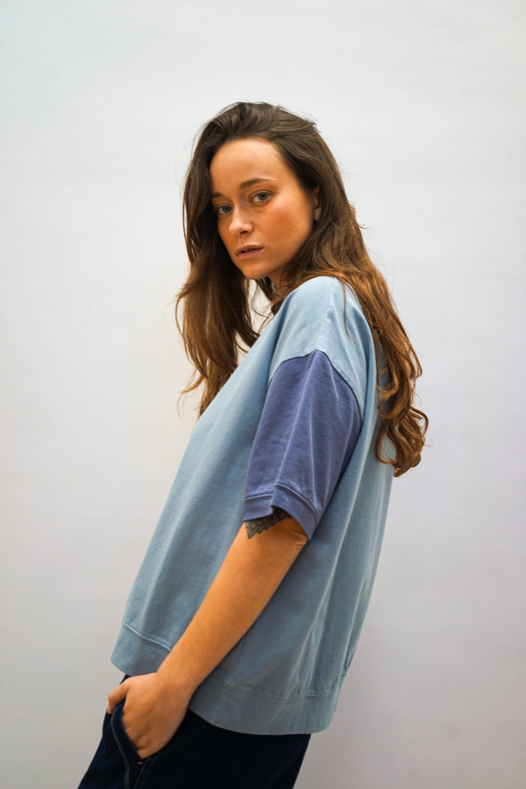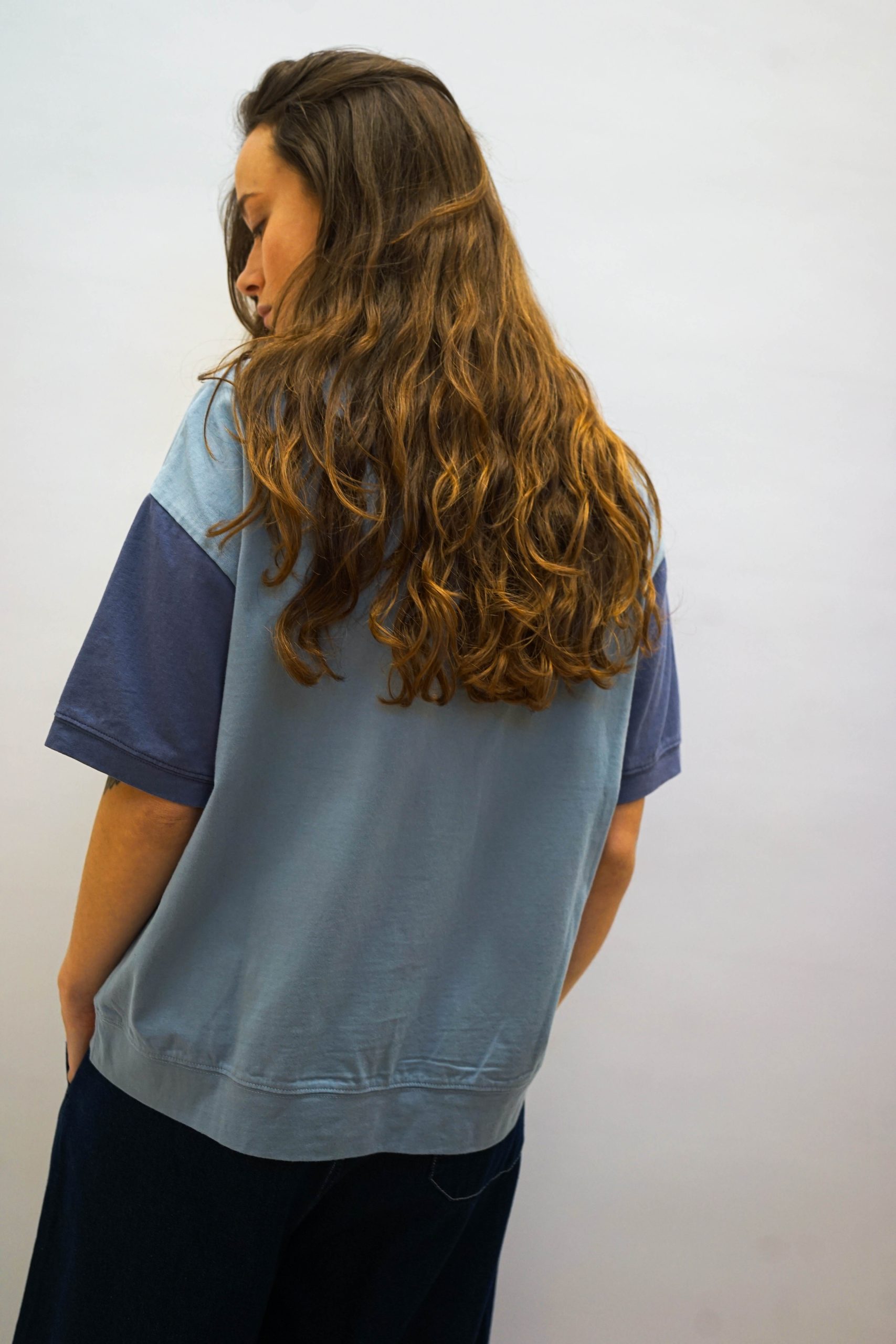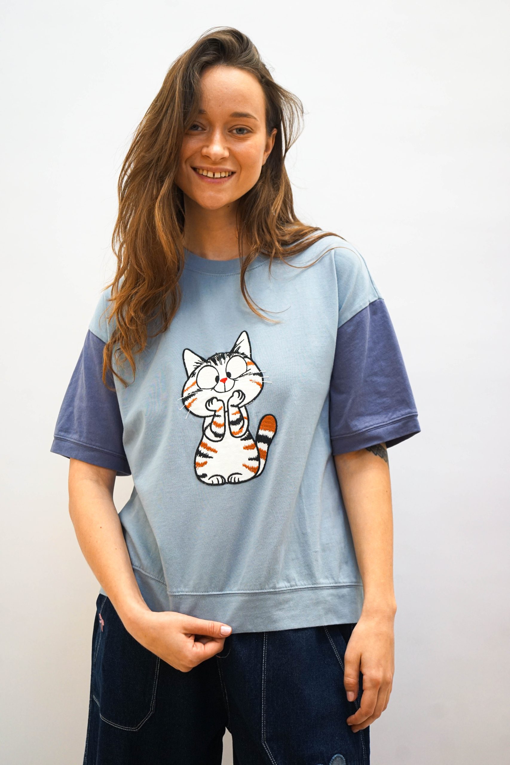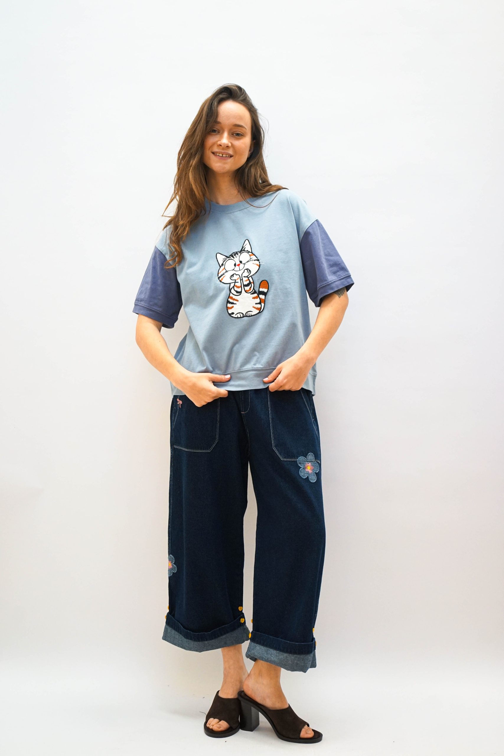 טי שרט בגזרה מעט רחוקה מהגוף. בצבע תכלת עם שרוולים סגלגלים שיוצרים מראה מדורג. במרכז אפליקצית חתול. מסתיימת עם מכפלת בתחתית . ניתן לשלב עם מכנסי מורי חרדל ג'ינס פרח או מכנסי דוטס רקומות בד 100% כותנה. היקף 112 אורך 62