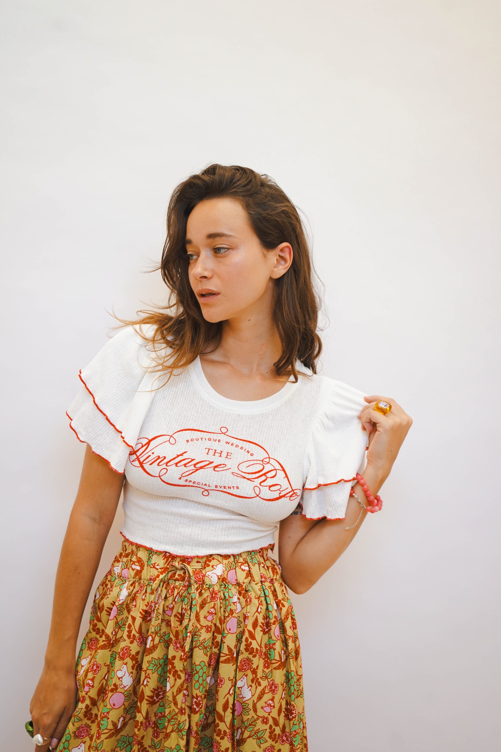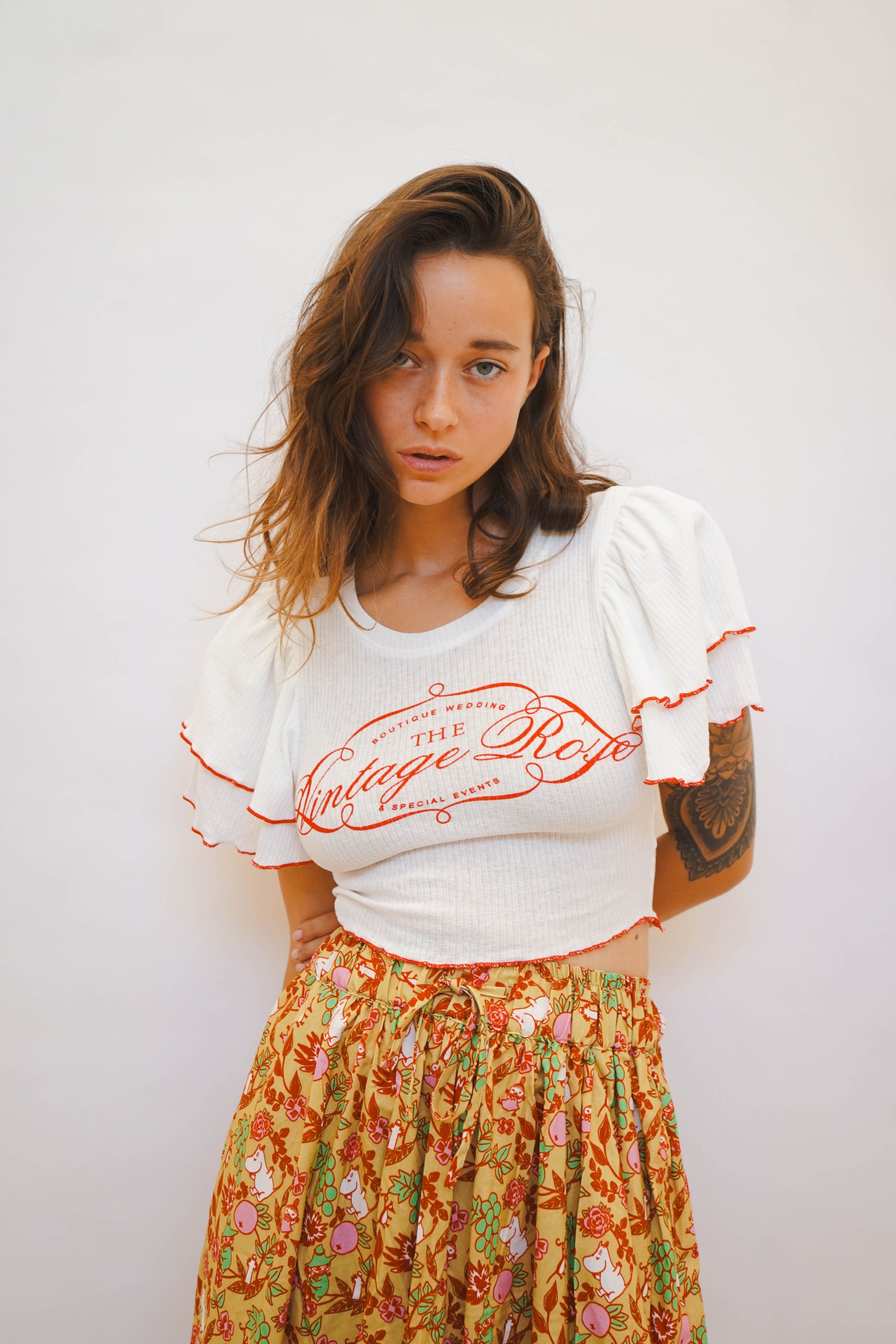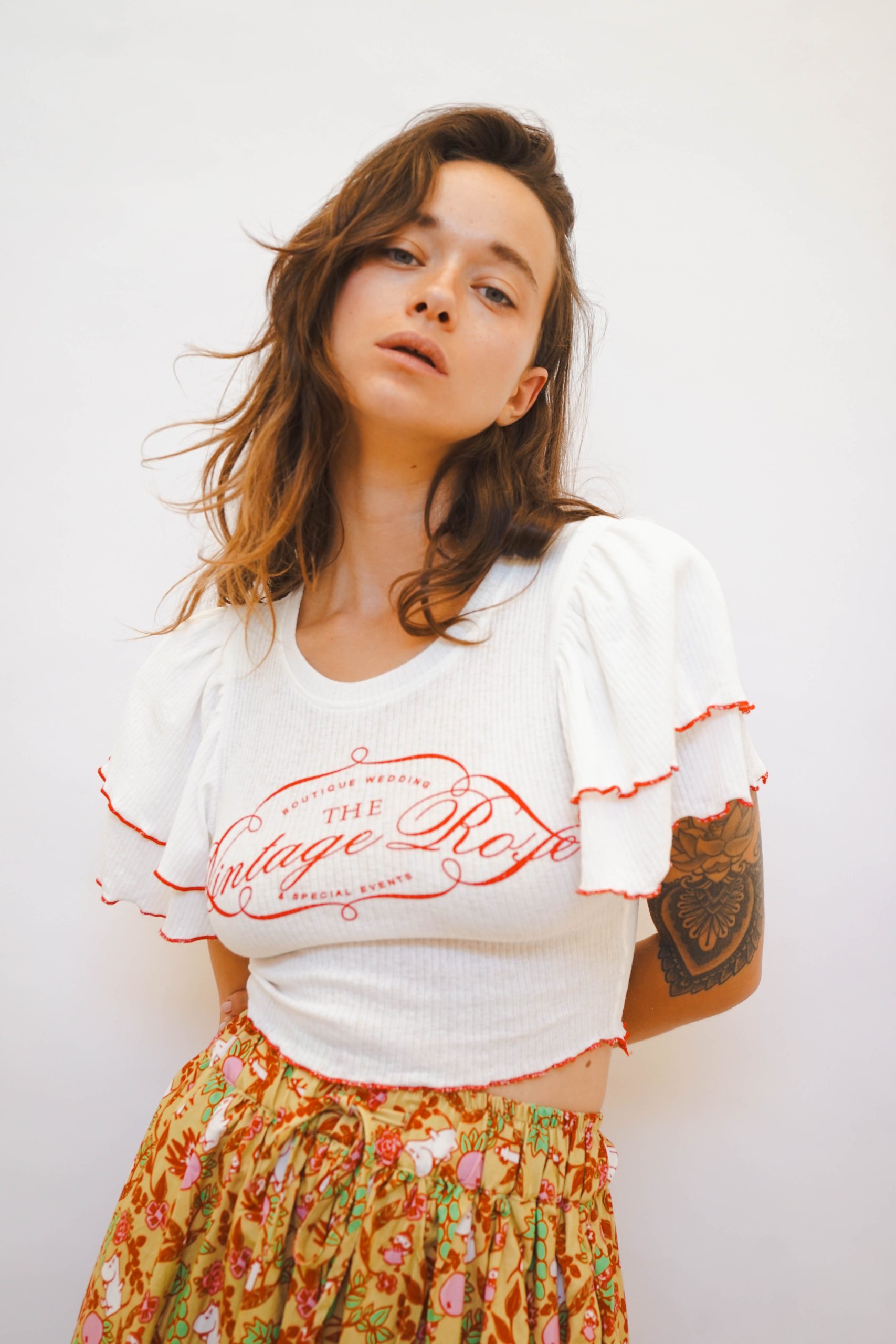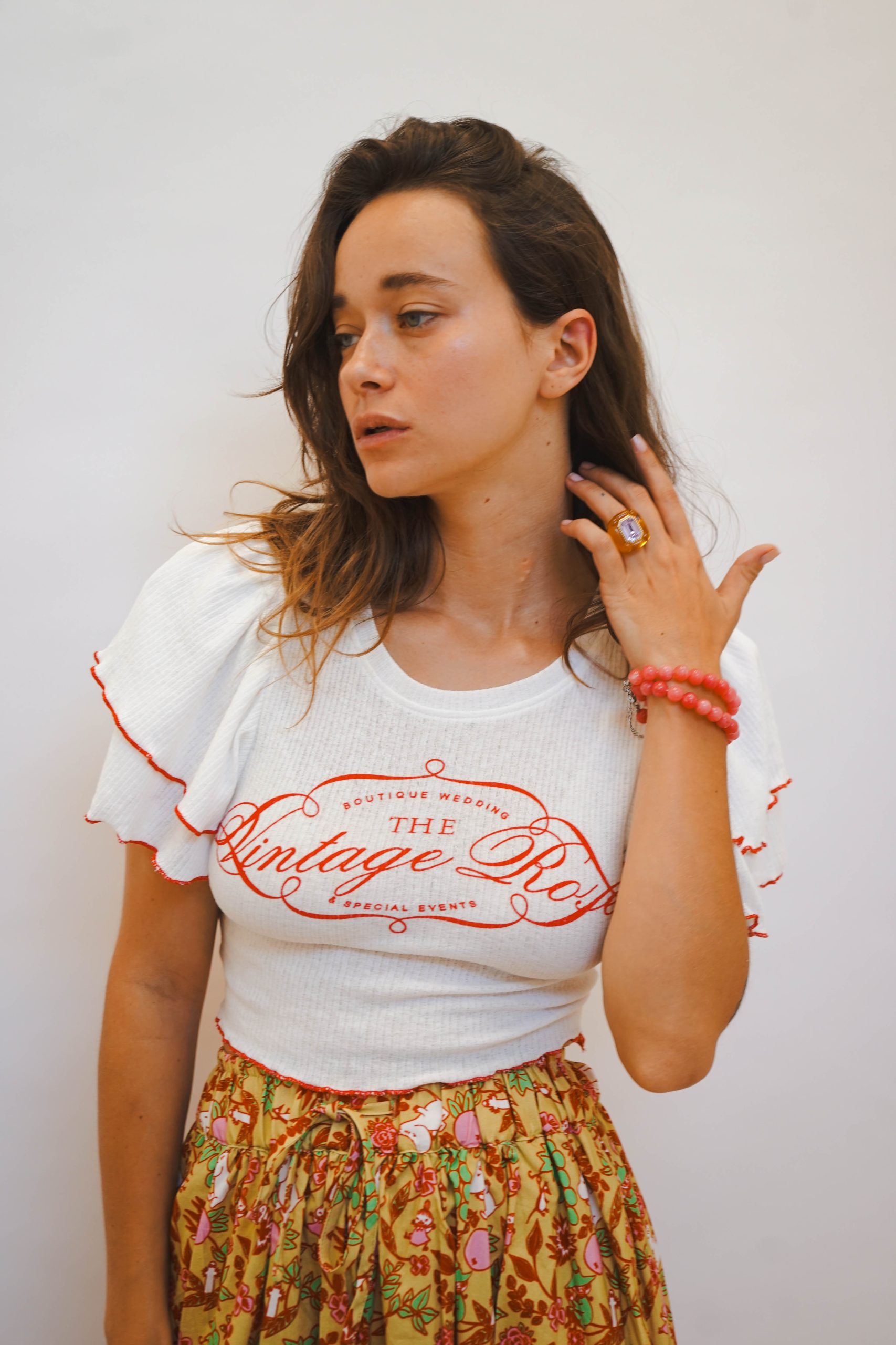חולצת טי בגזרה מחמיאה עם שרוולים תפוחים מעוטרים בתפר קישוט עדין בקצה. החולצה משלבת הדפס לוגו במראה רטרו רומנטי עם טאץ’ נשי ונועז. מתאימה לשילוב עם חצאית, ג’ינס או מכנסיים בכל אורך ליצירת לוק מתוק ליום או לערב אורך 37 היקף 64 בד נמתח