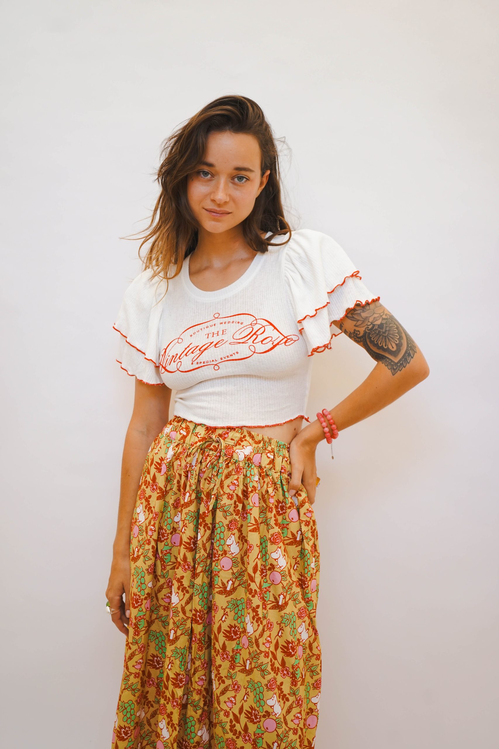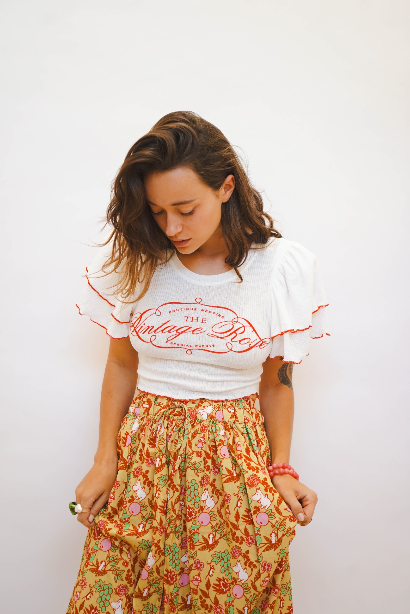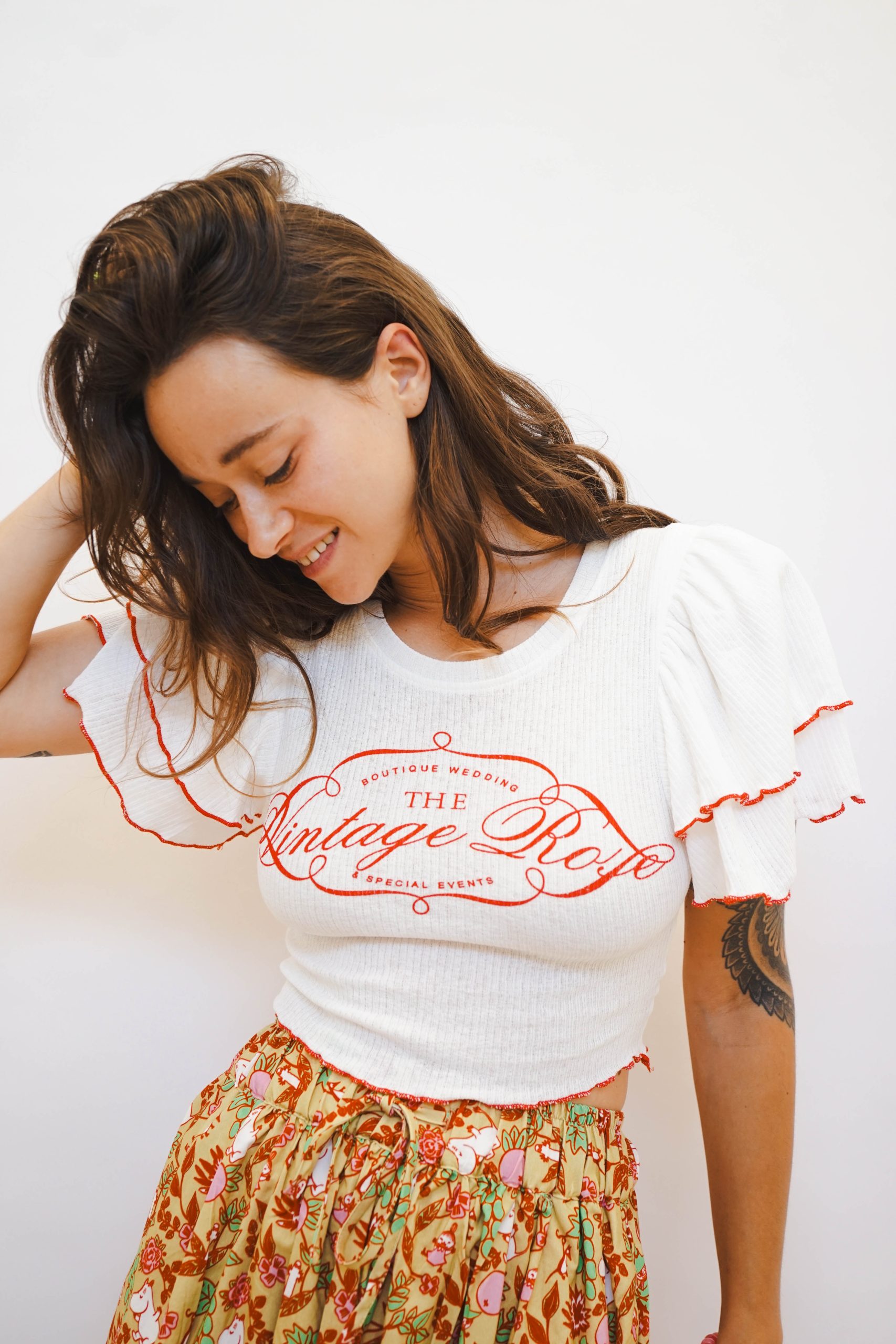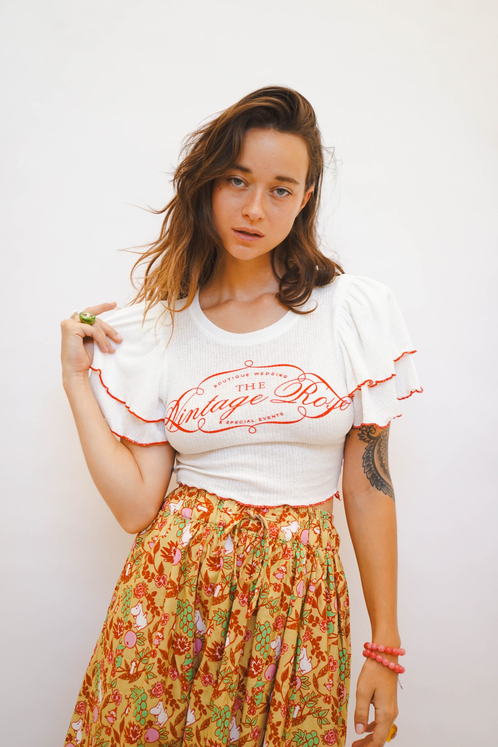 חולצת טי בגזרה מחמיאה עם שרוולים תפוחים מעוטרים בתפר קישוט עדין בקצה. החולצה משלבת הדפס לוגו במראה רטרו רומנטי עם טאץ’ נשי ונועז. מתאימה לשילוב עם חצאית, ג’ינס או מכנסיים בכל אורך ליצירת לוק מתוק ליום או לערב אורך 37 היקף 64 בד נמתח