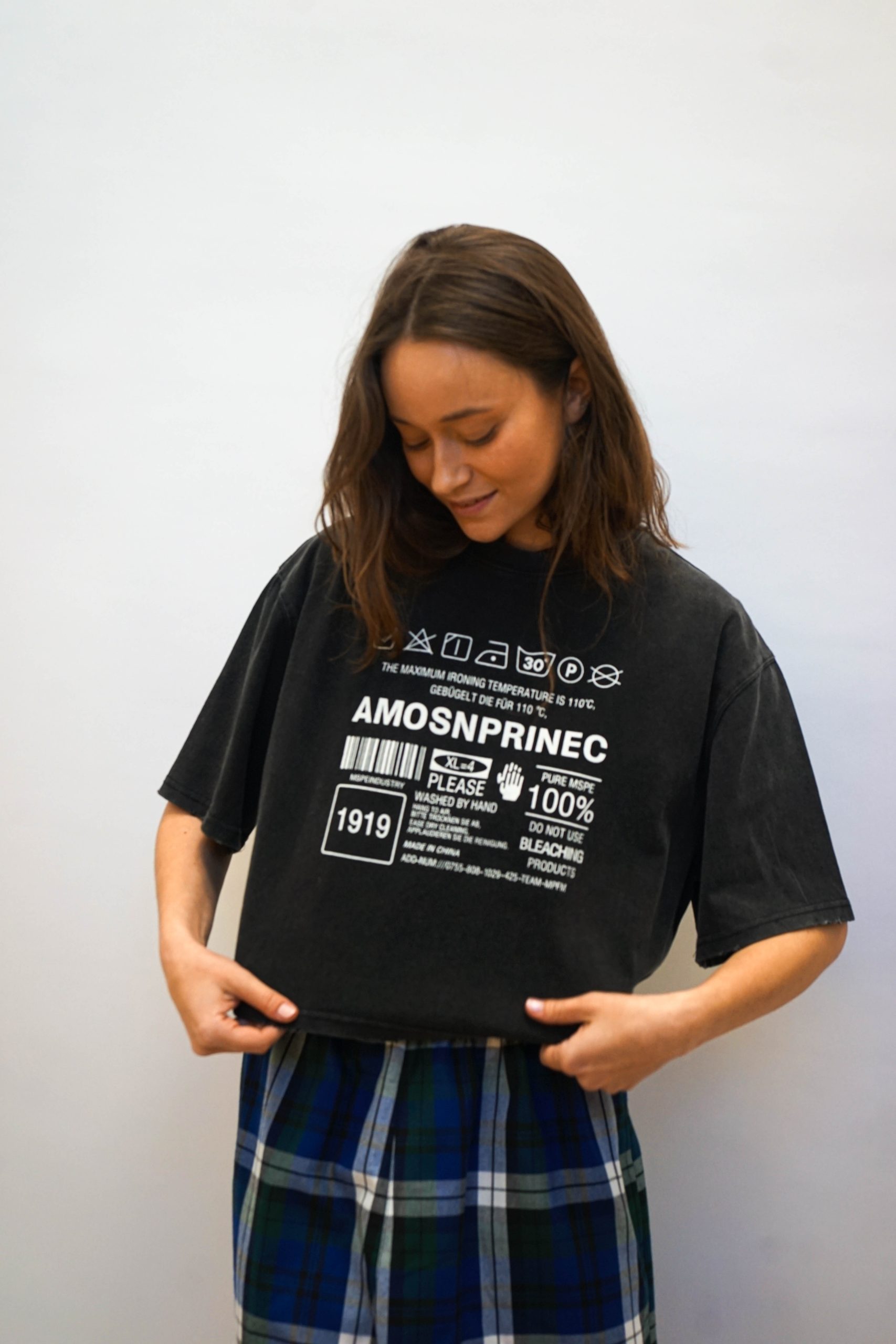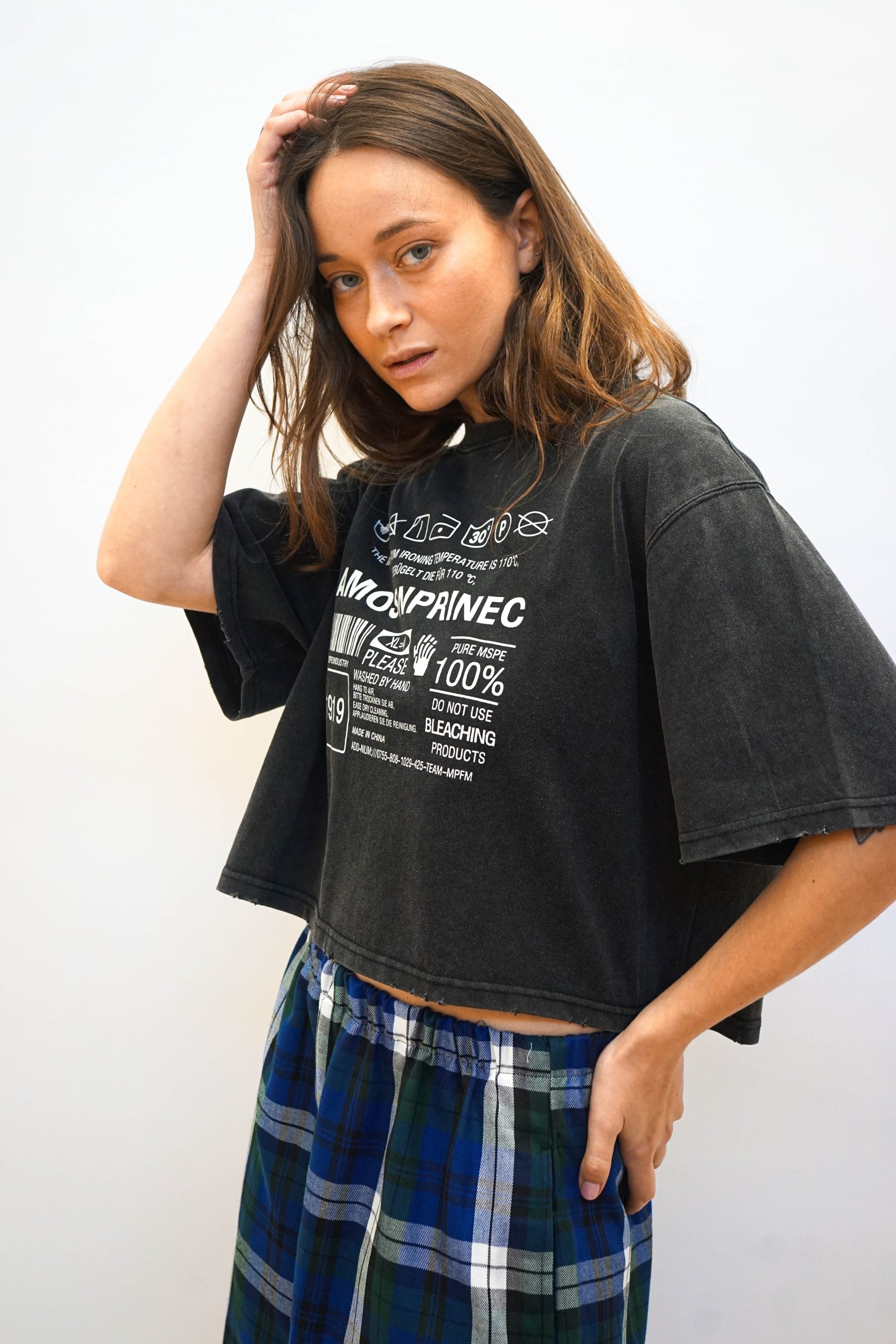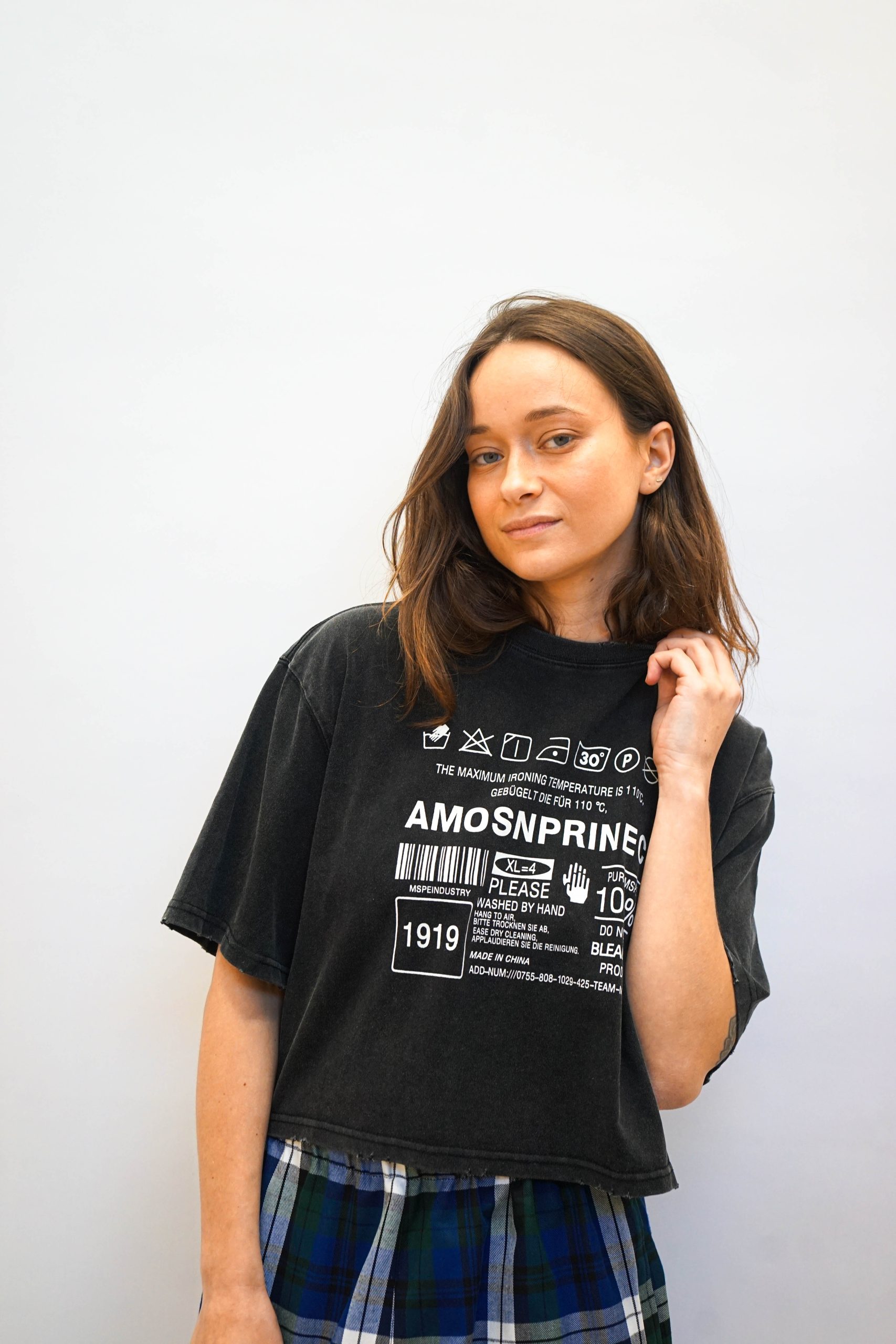 טי שרט בגזרה מעט רחוקה מהגוף בגזרת קרופ. בצבע שחור משופשף. עם הדפס גרפי של הוראות כביסה במרכז בצבע לבן. ניתן לשלב עם מכנסי איטליה (כמו בתמונה ) ג'ינס מתרחב. או חצאית ג'ינס פסים צבעוניים בד 100% כותנה. היקף 120 אורך 50