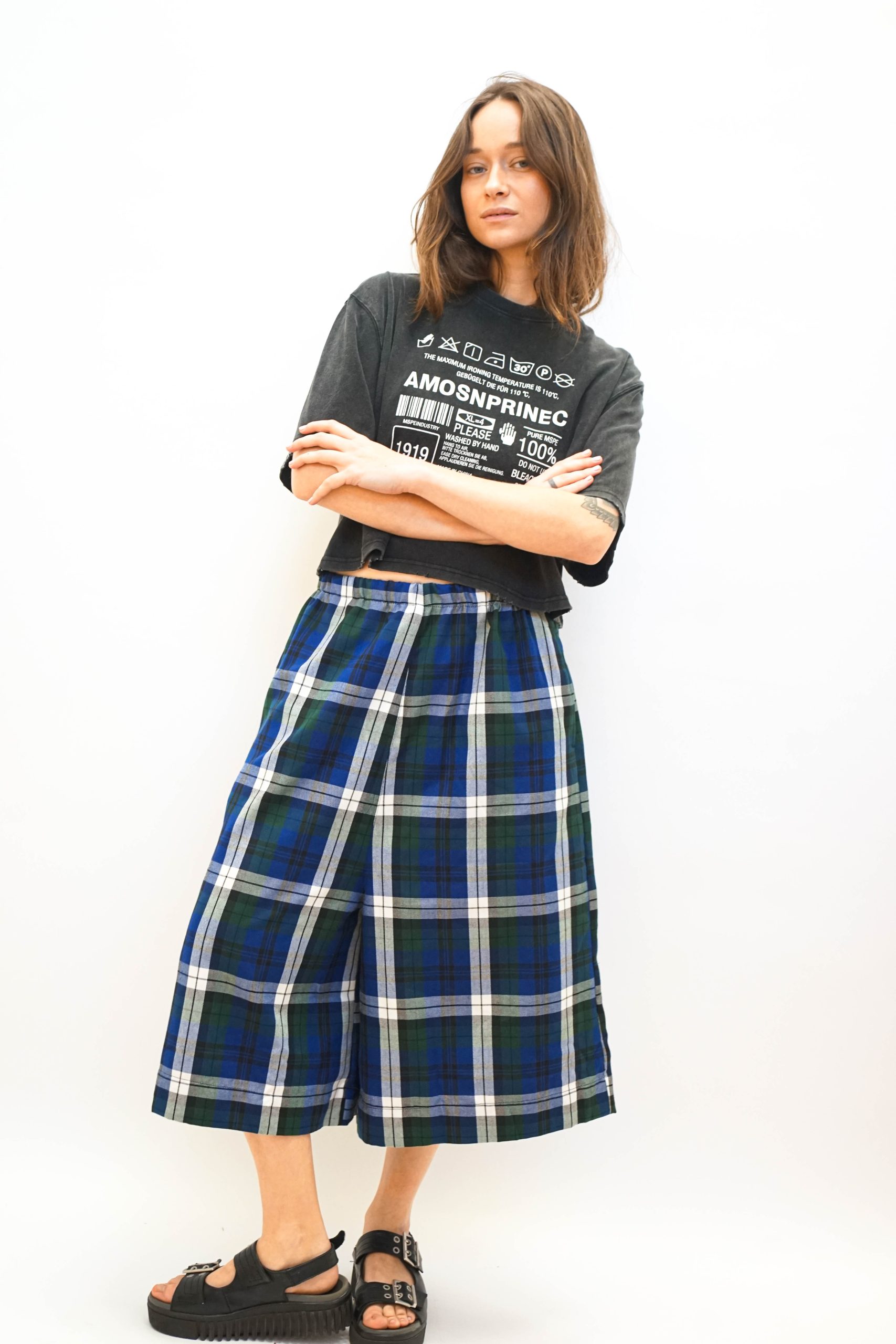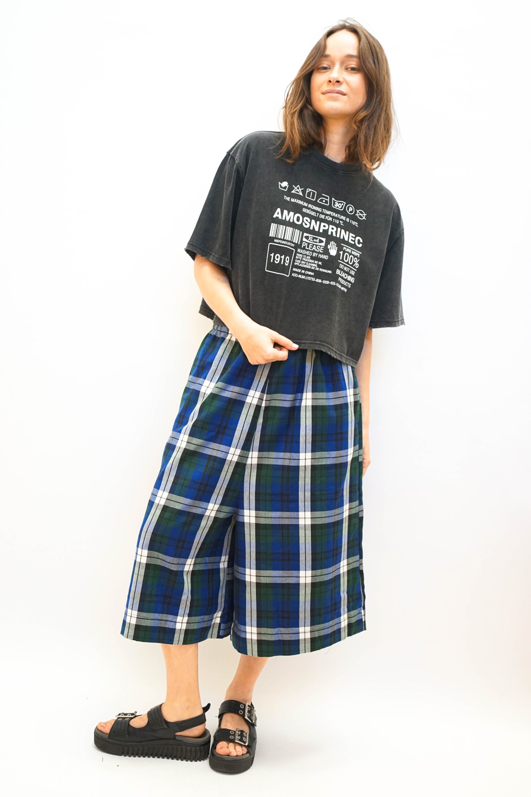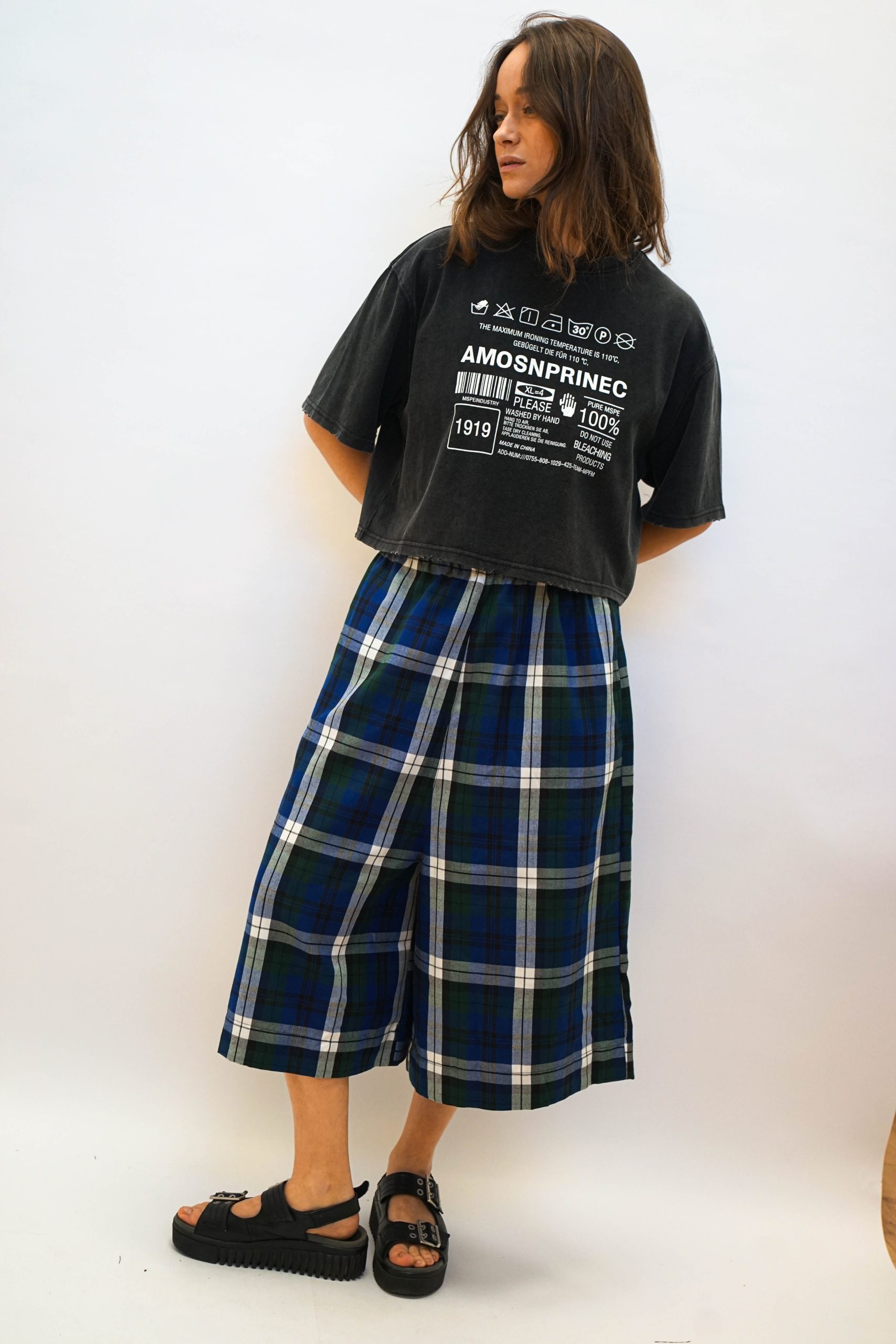 טי שרט בגזרה מעט רחוקה מהגוף בגזרת קרופ. בצבע שחור משופשף. עם הדפס גרפי של הוראות כביסה במרכז בצבע לבן. ניתן לשלב עם מכנסי איטליה (כמו בתמונה ) ג'ינס מתרחב. או חצאית ג'ינס פסים צבעוניים בד 100% כותנה. היקף 120 אורך 50