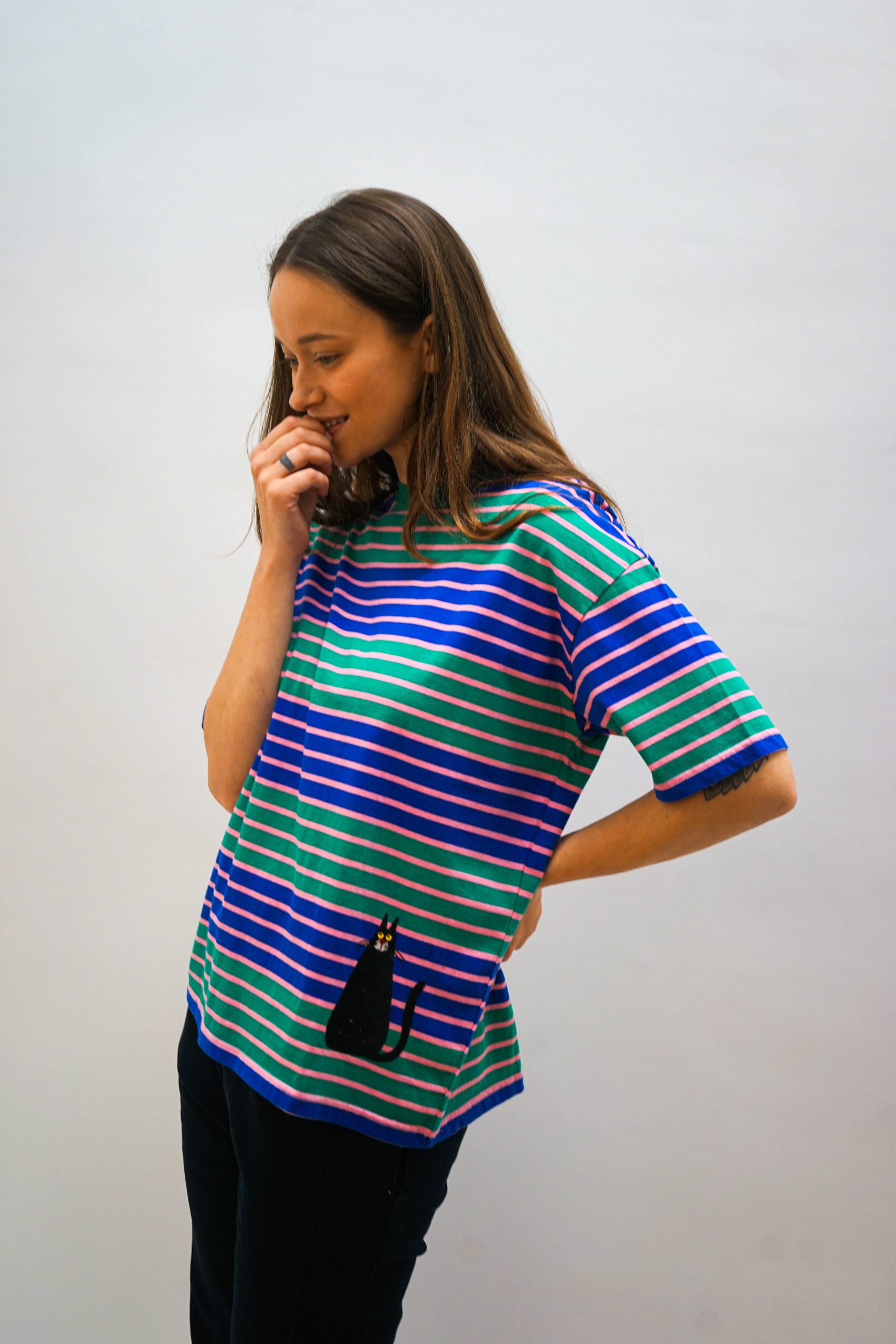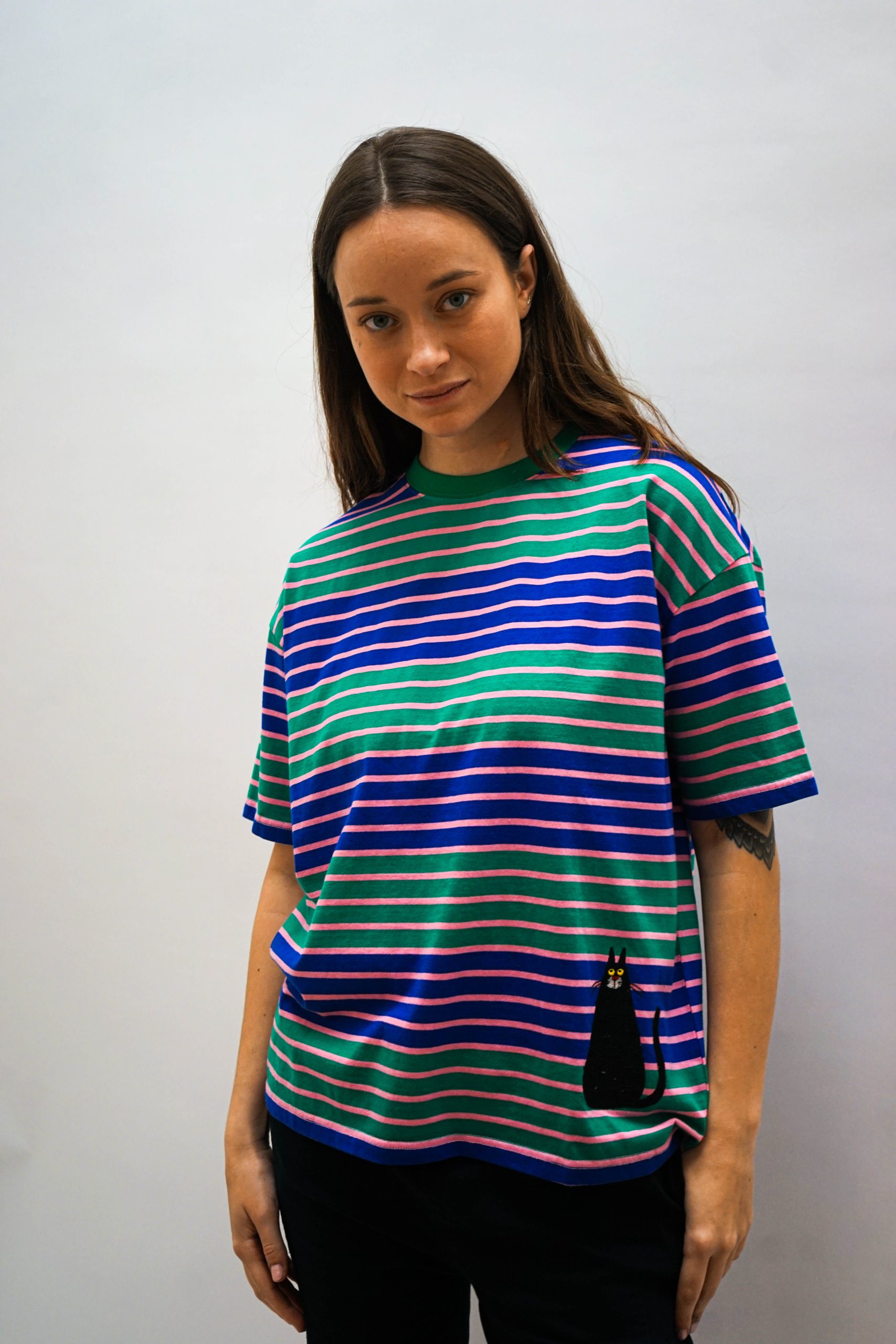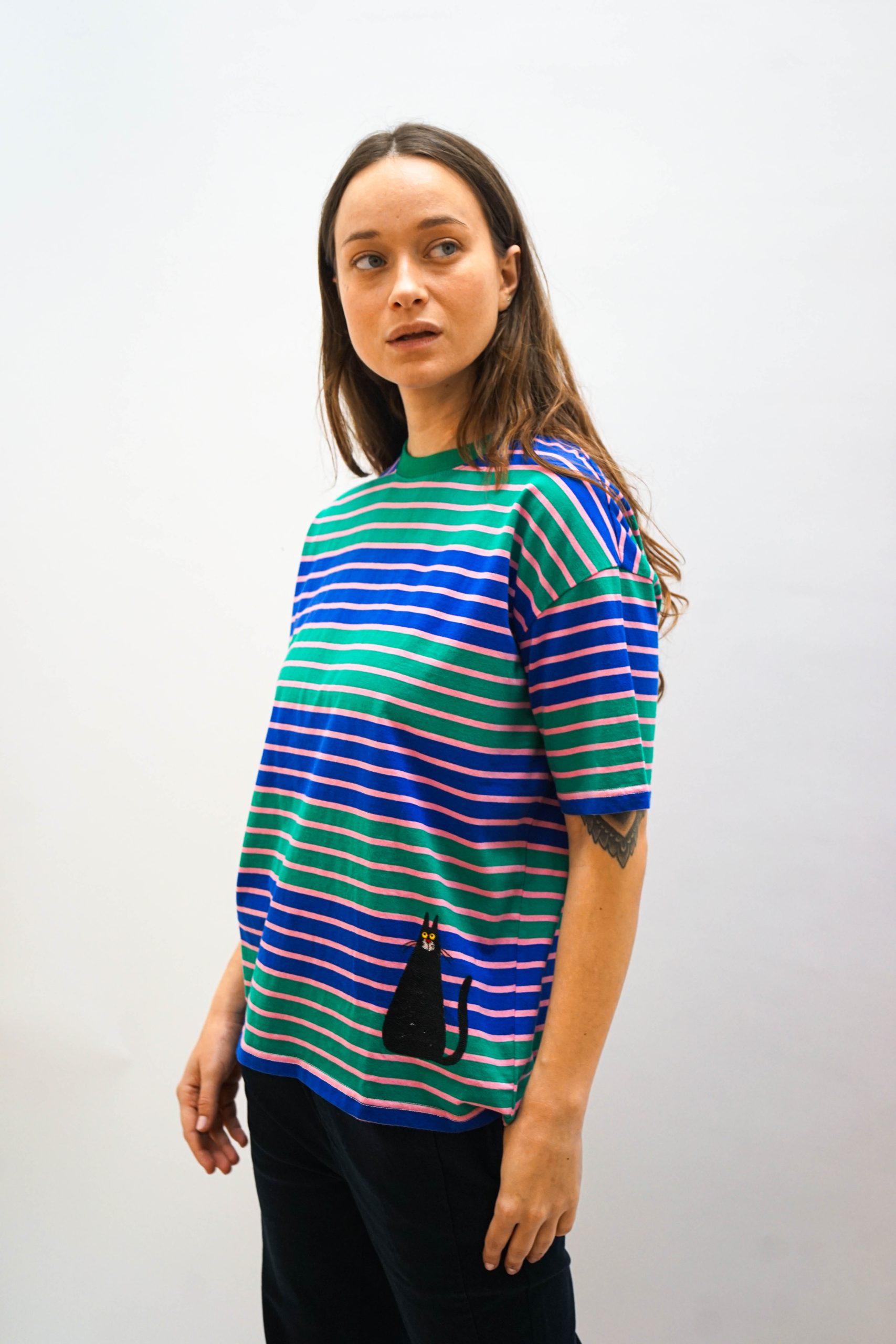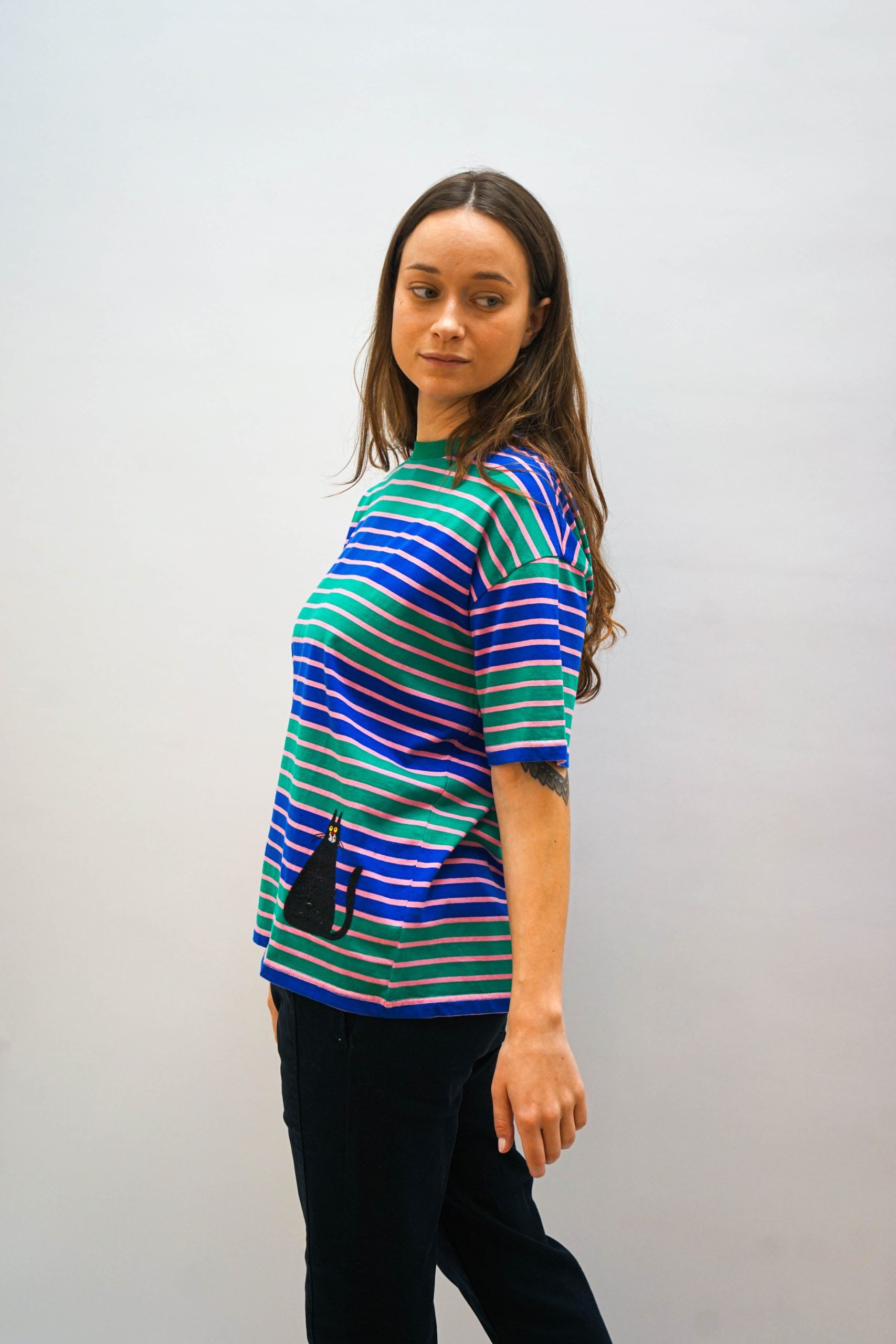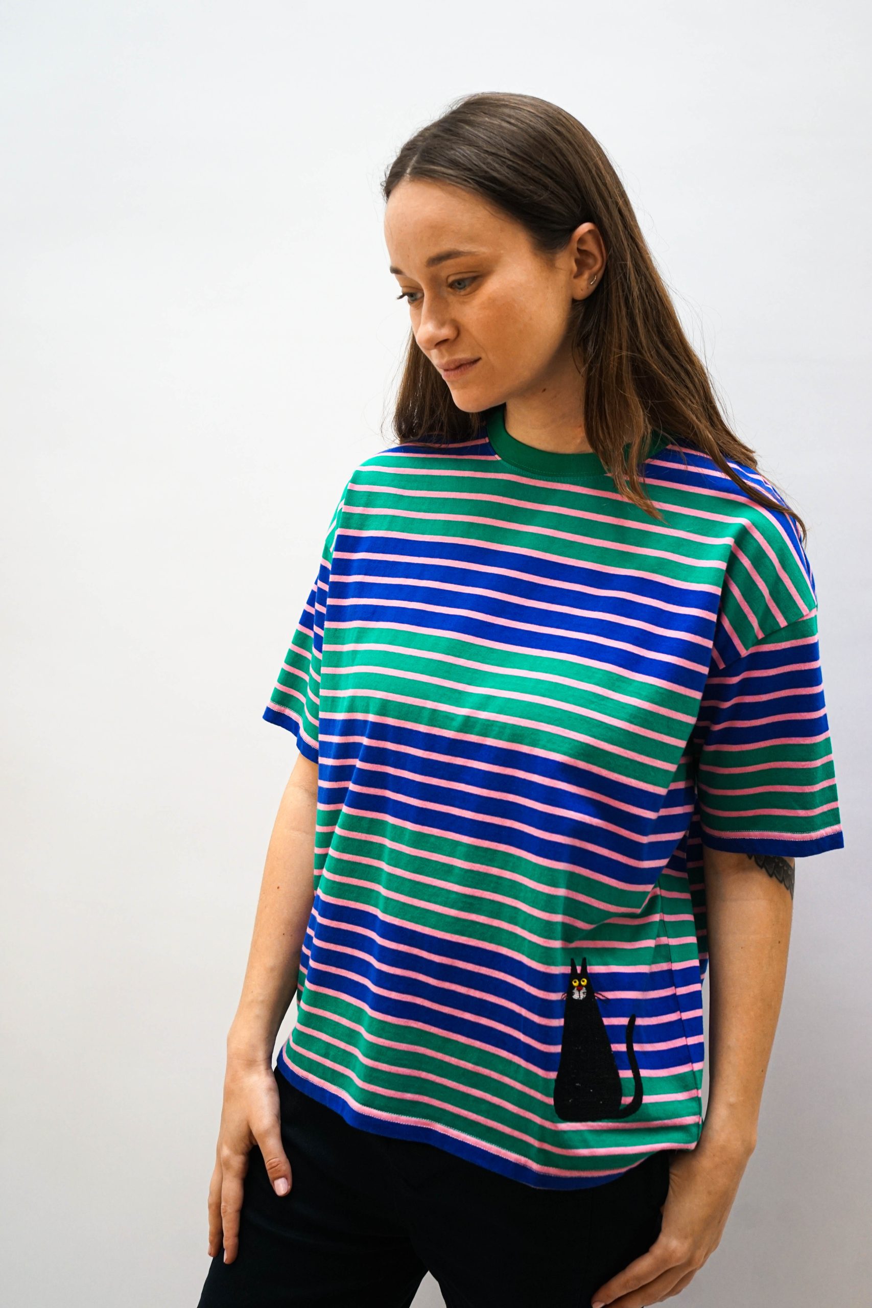 טי שרט בגזרה מעט רחוקה מהגוף. עם פסים רוחביים צפופים בצבעי סגול וירוק וריקמת חתול מתוק למטה. ניתן לשלב עם ג'ינס או חצאית שחורה פרחים בבד בד 100% כותנה היקף 120 אורך 64