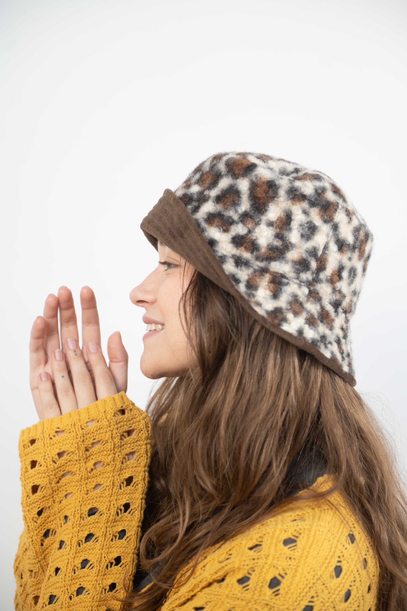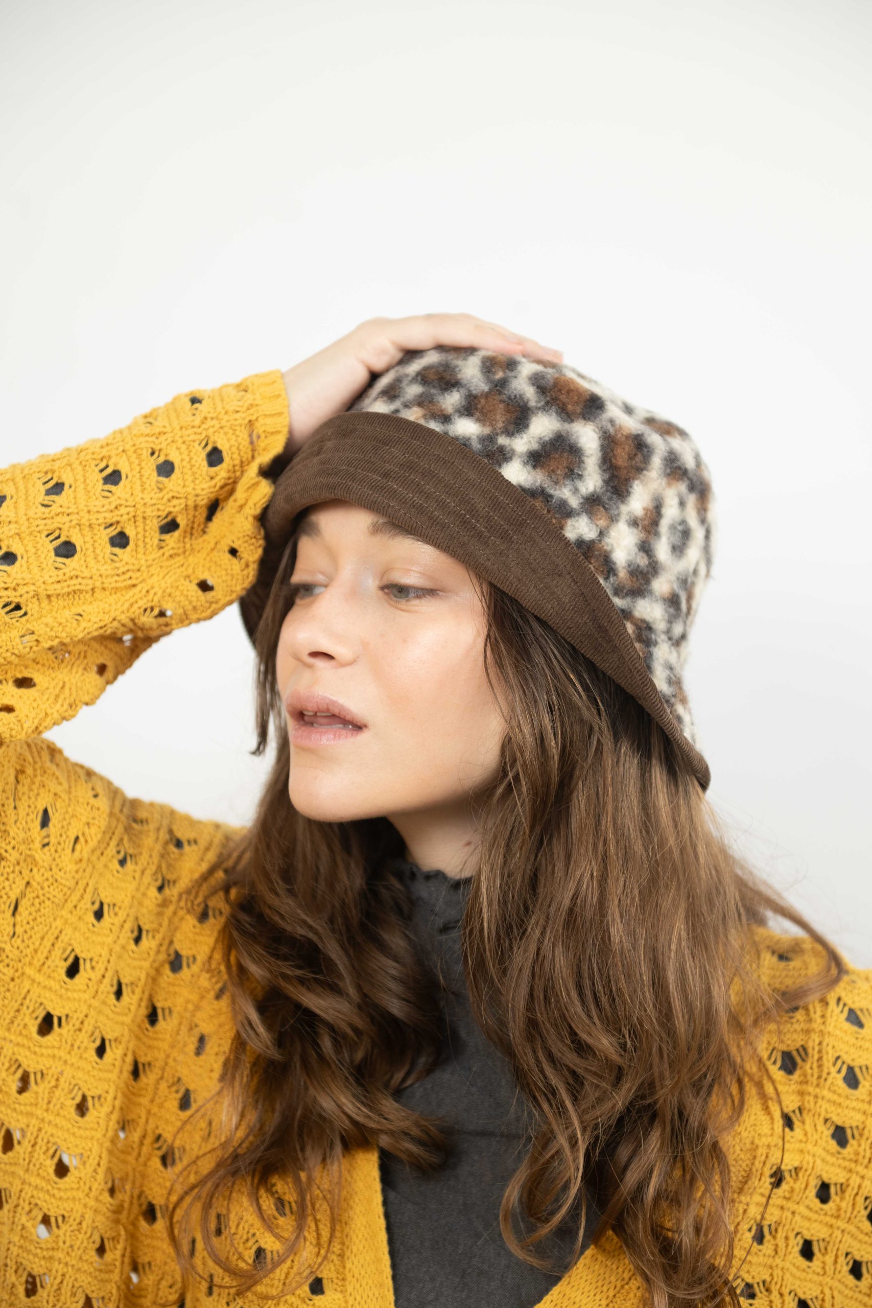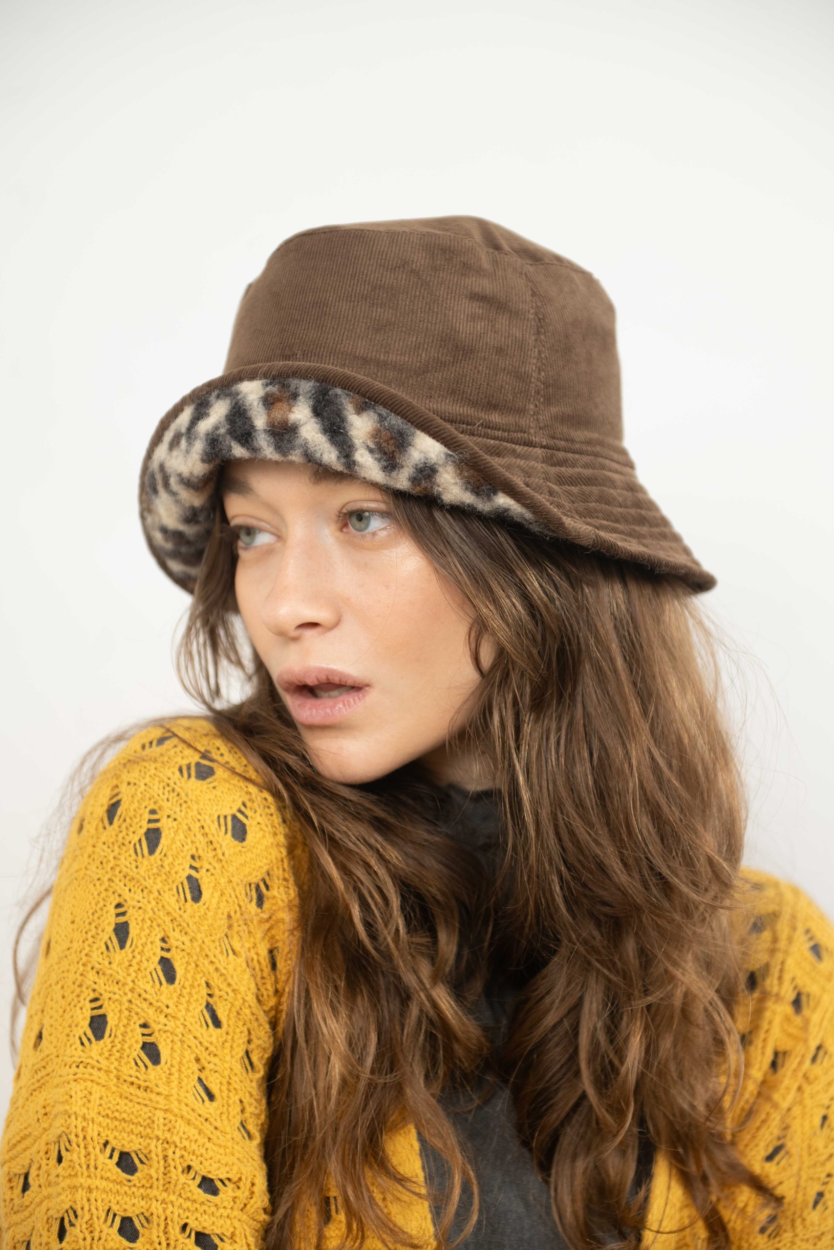 כובע באקט פרינט מנומר בגווני חום וקרם. כשצד אחד קורדרי חום והצד השני מנומר מושלם לשדרוג לוק חורפי.