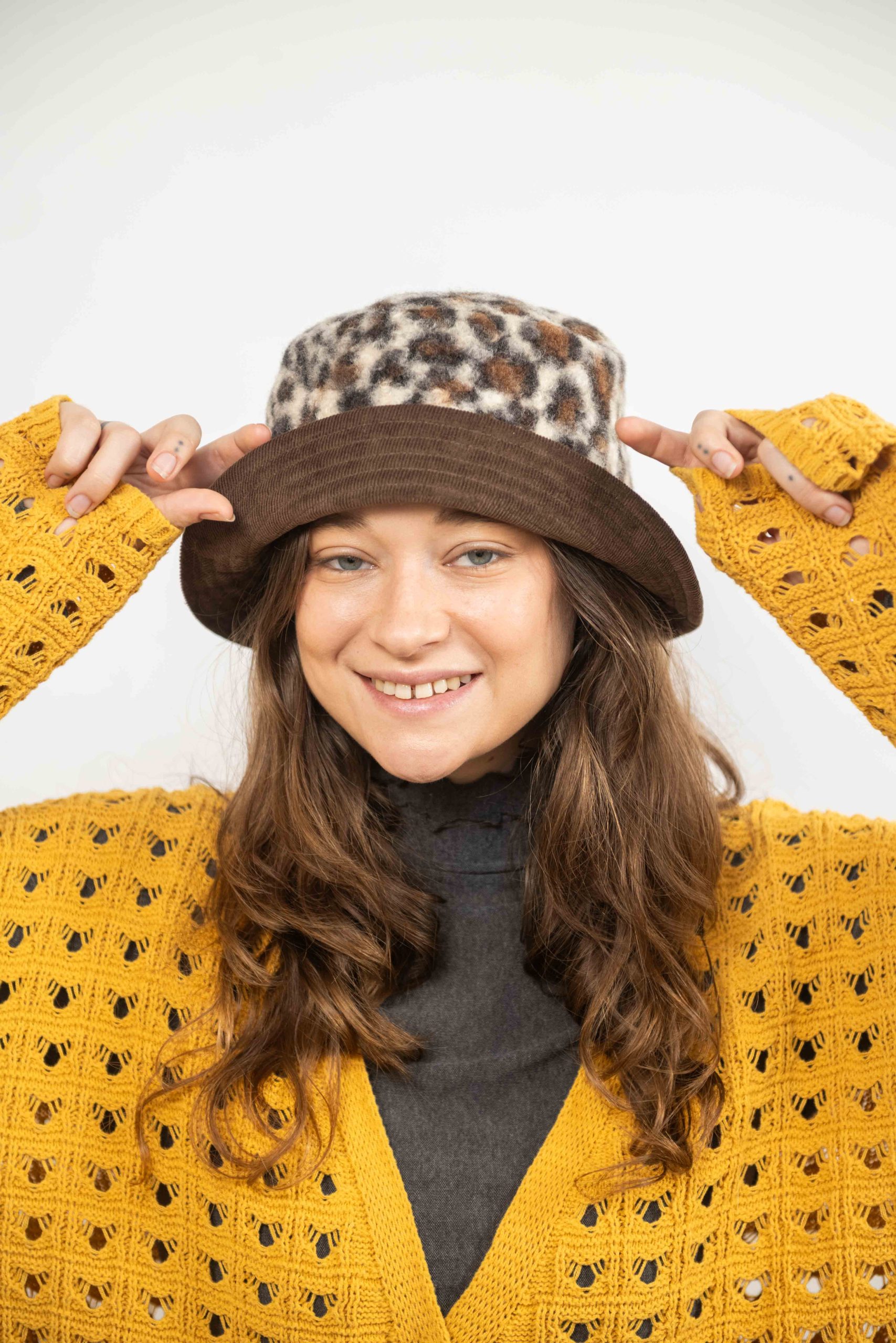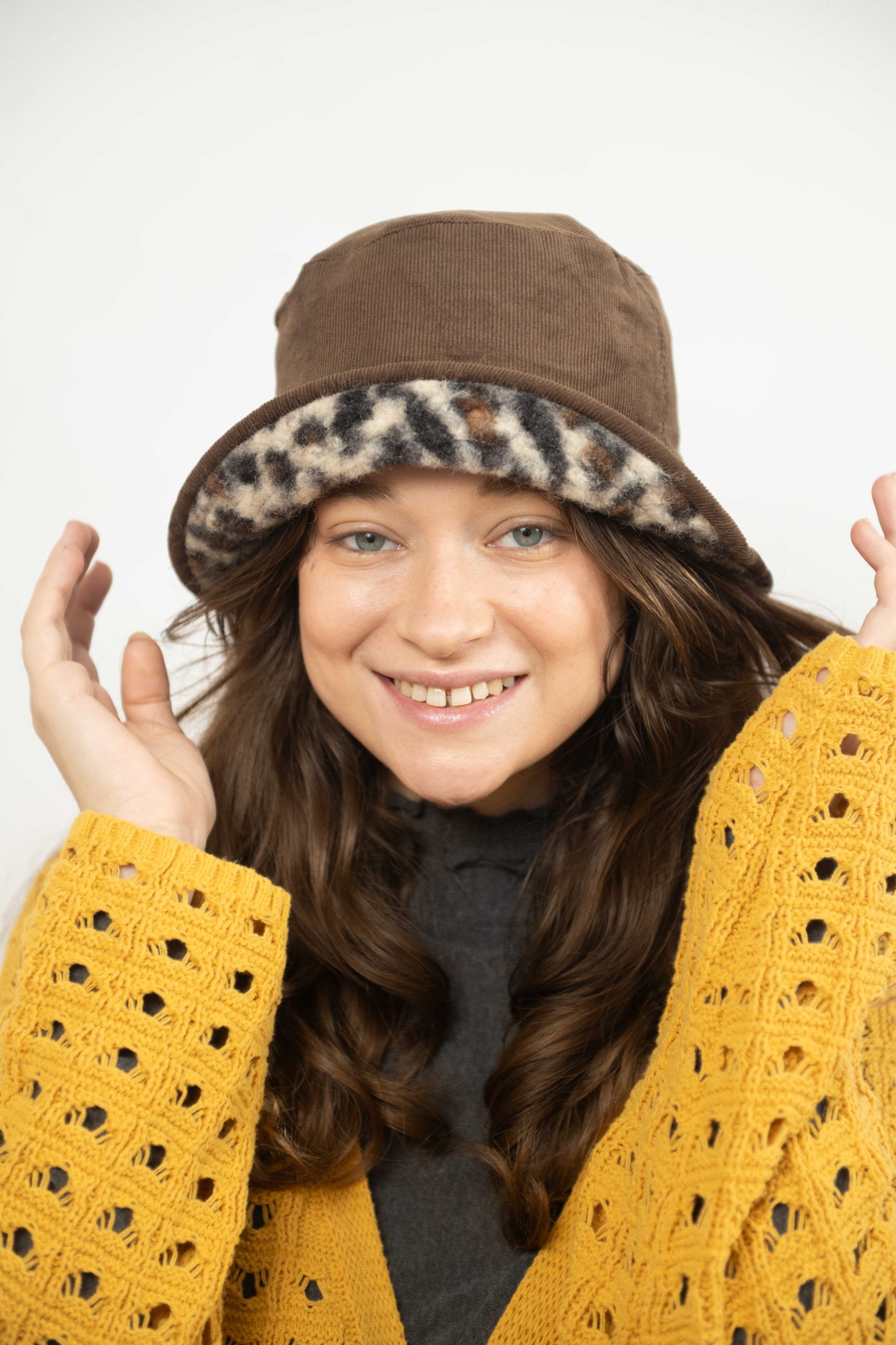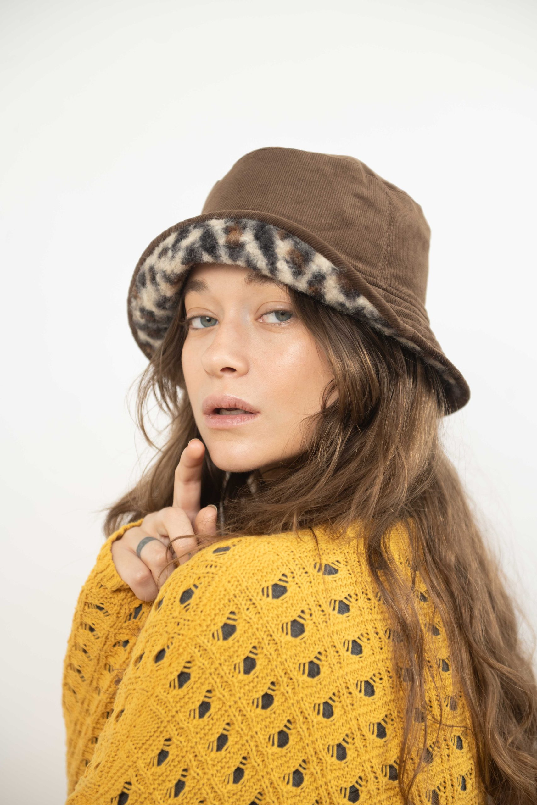 כובע באקט פרינט מנומר בגווני חום וקרם. כשצד אחד קורדרי חום והצד השני מנומר מושלם לשדרוג לוק חורפי.