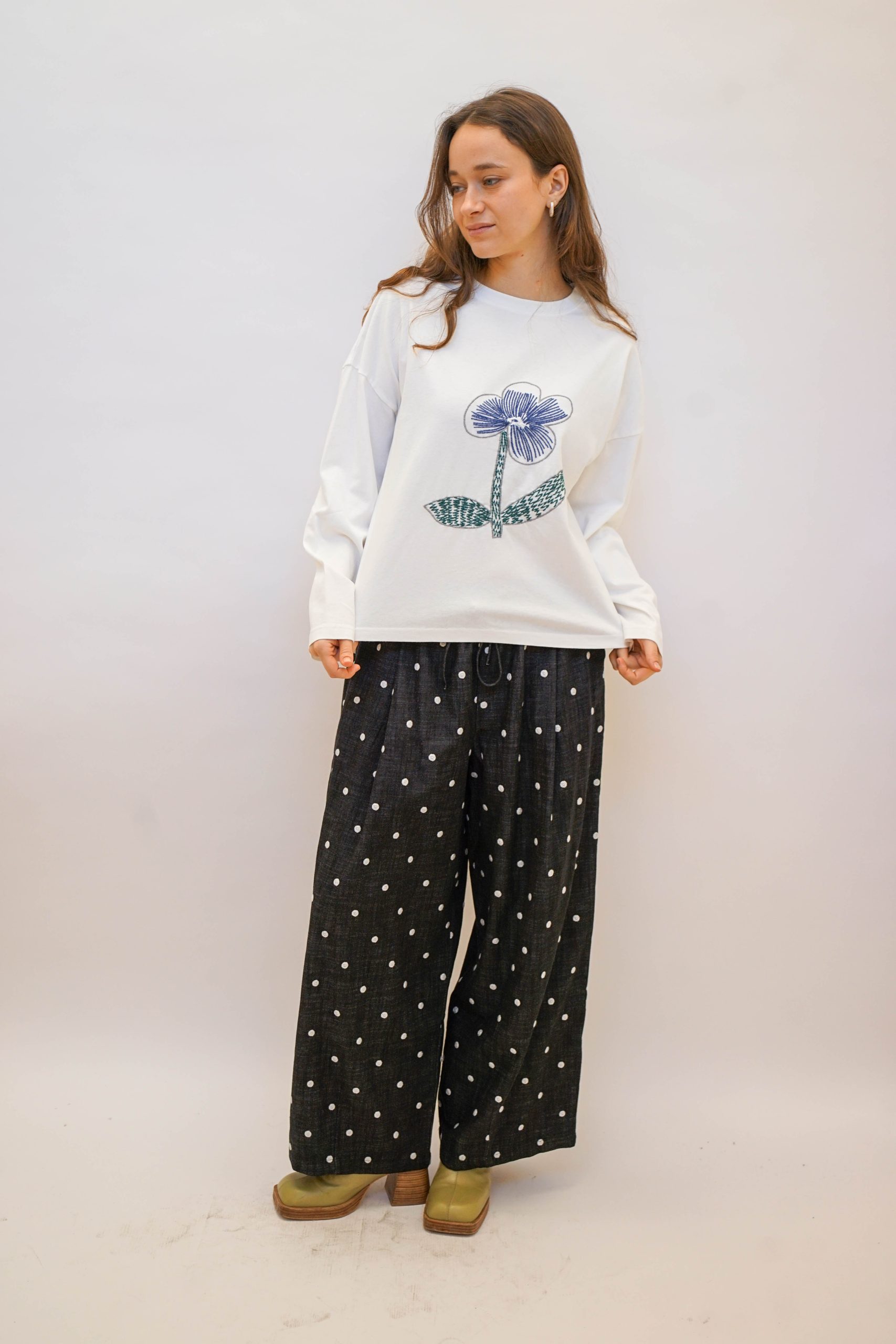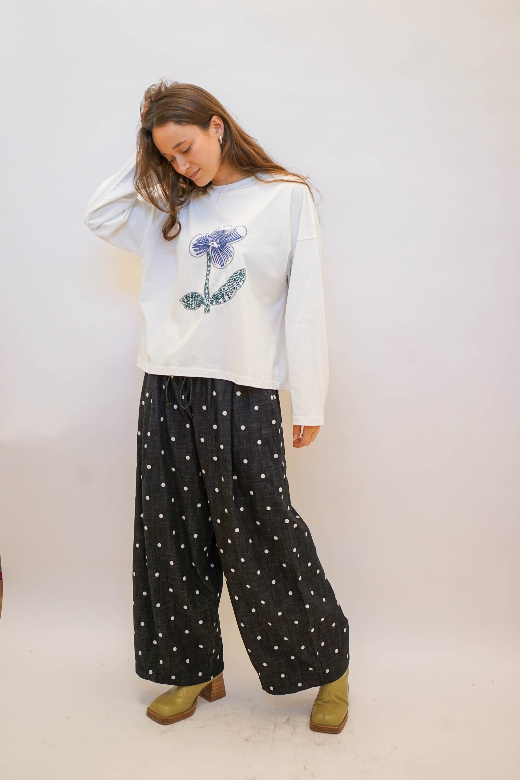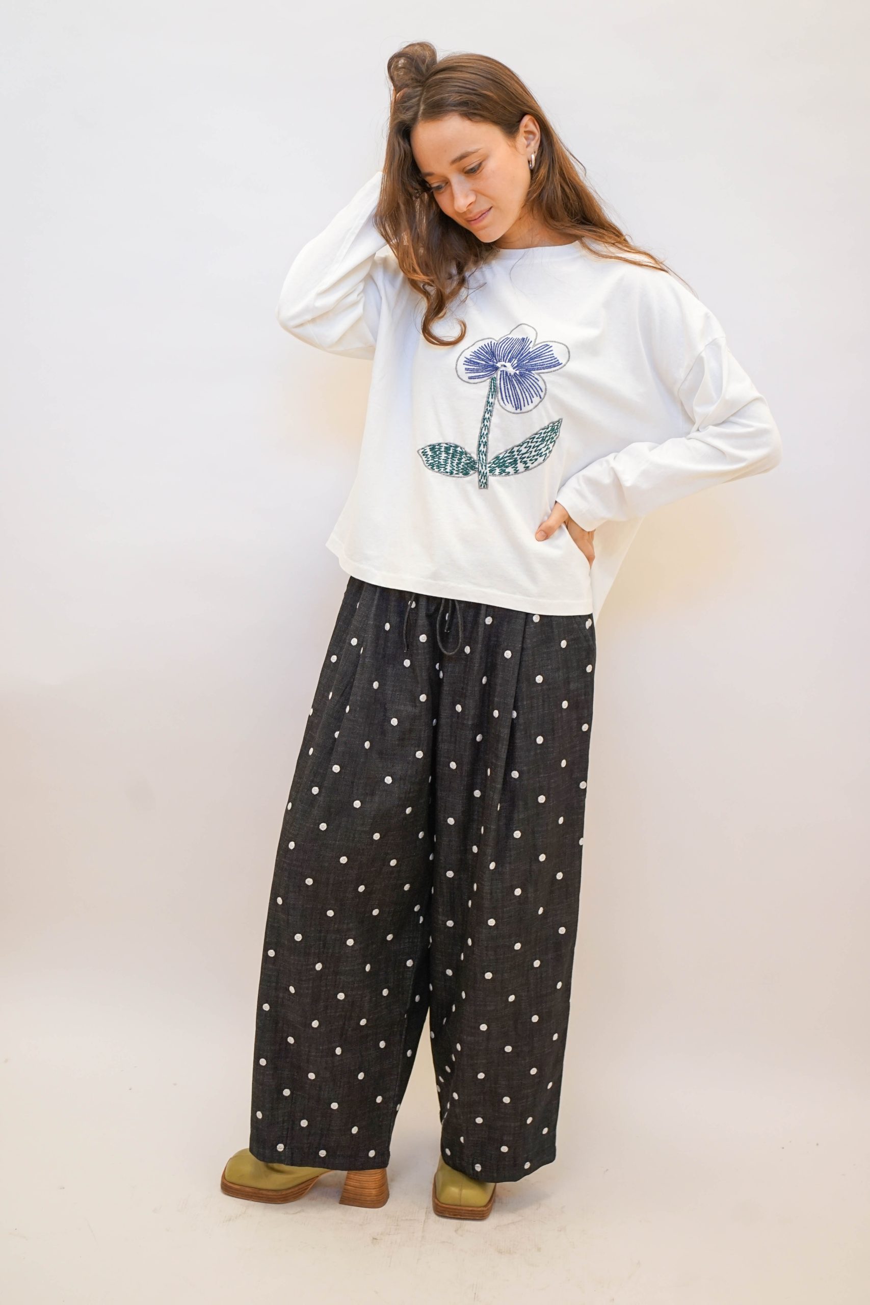מכנסיים מבד ג'ינס שחור ווש בעובי בינוני נקודות רקומות לבנות , בגזרת בלון . בד נעים עם שרוך בצבע המכנסיים נוחות ונעימות לחורף ניתן לשלב עם כל חולצה מכופתרת או צמודה עם סווטישרט עיגולים צבעוניים או טישרט פרח רקום לבנה היקף 84 אורך 106