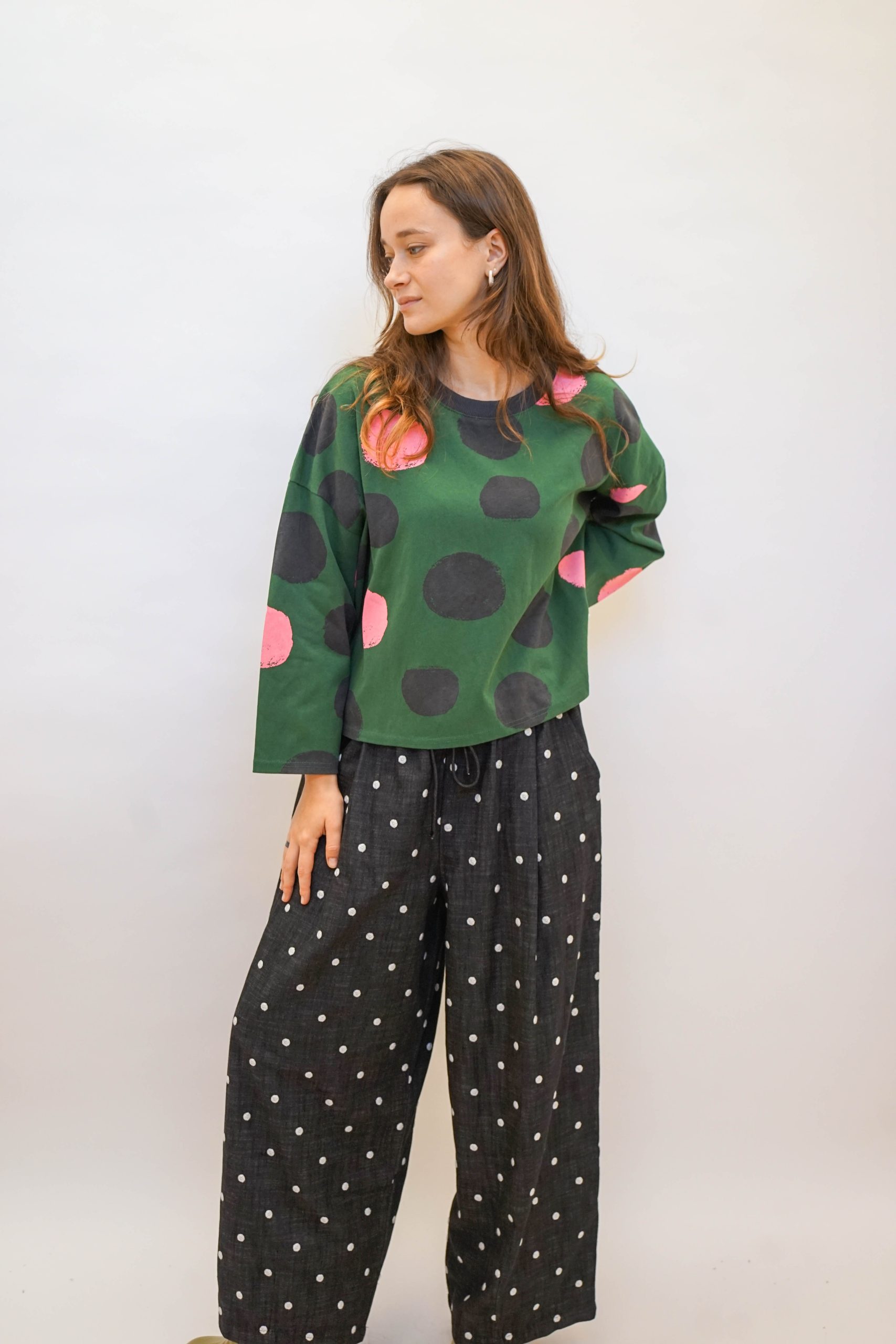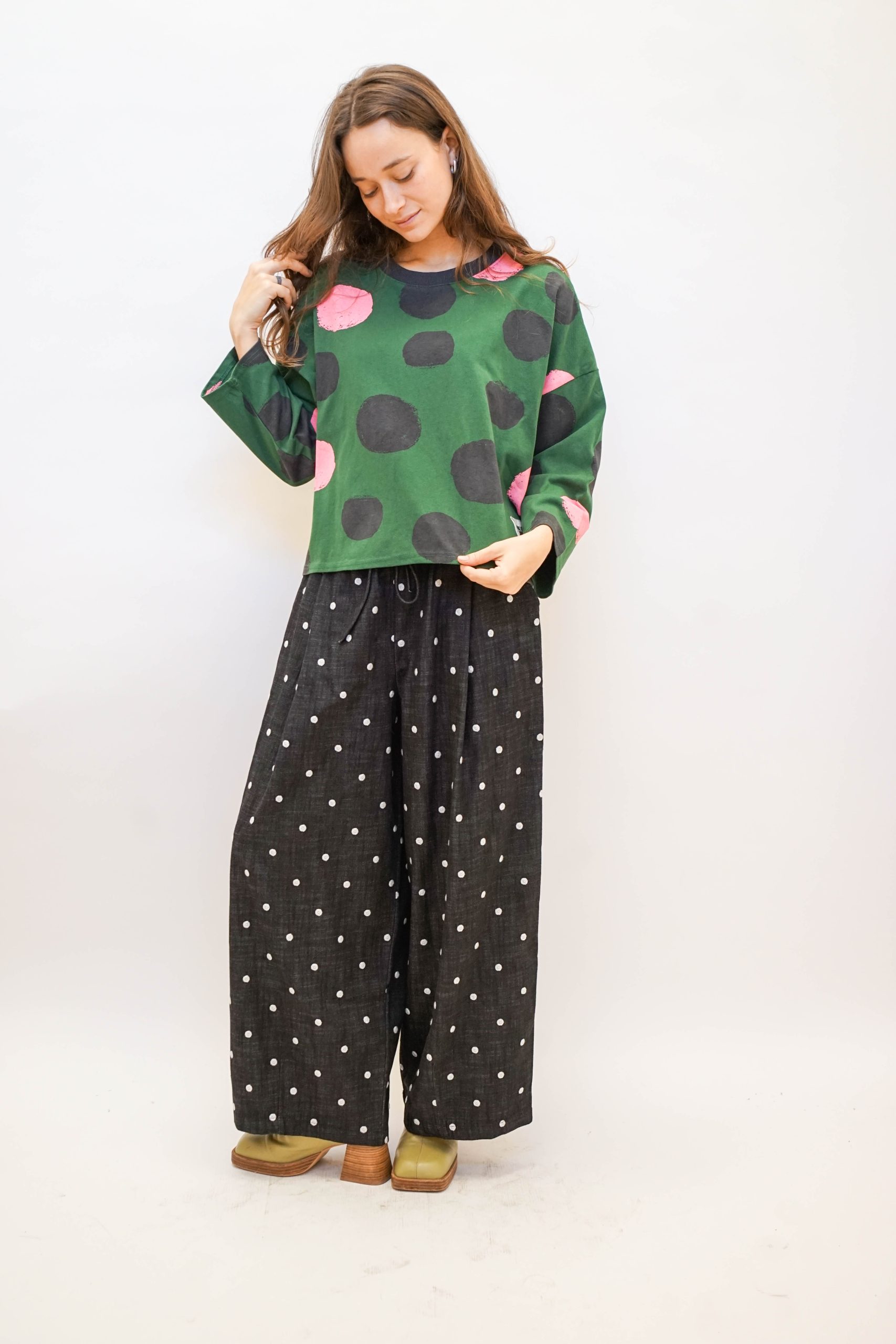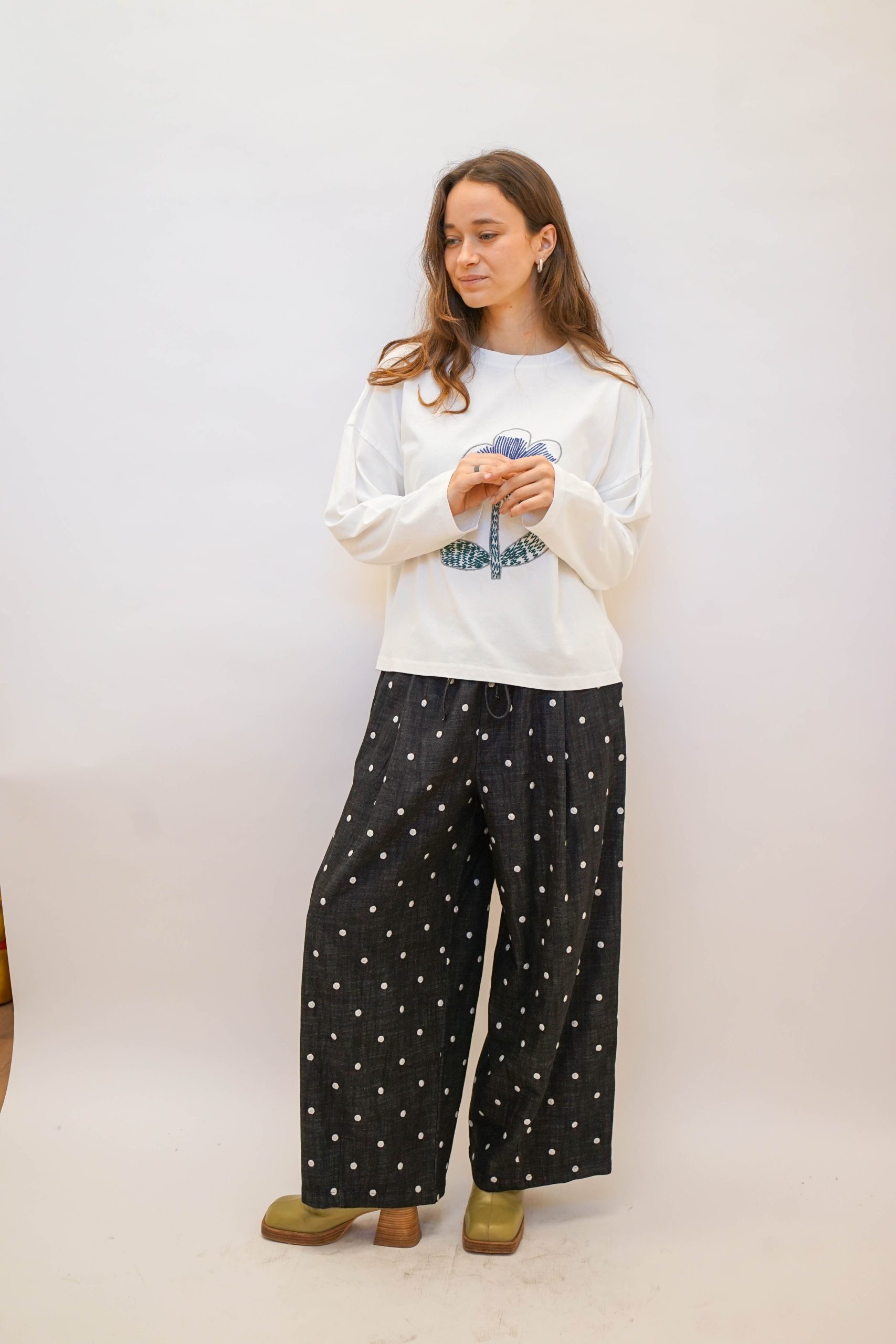 מכנסיים מבד ג'ינס שחור ווש בעובי בינוני נקודות רקומות לבנות , בגזרת בלון . בד נעים עם שרוך בצבע המכנסיים נוחות ונעימות לחורף ניתן לשלב עם כל חולצה מכופתרת או צמודה עם סווטישרט עיגולים צבעוניים או טישרט פרח רקום לבנה היקף 84 אורך 106