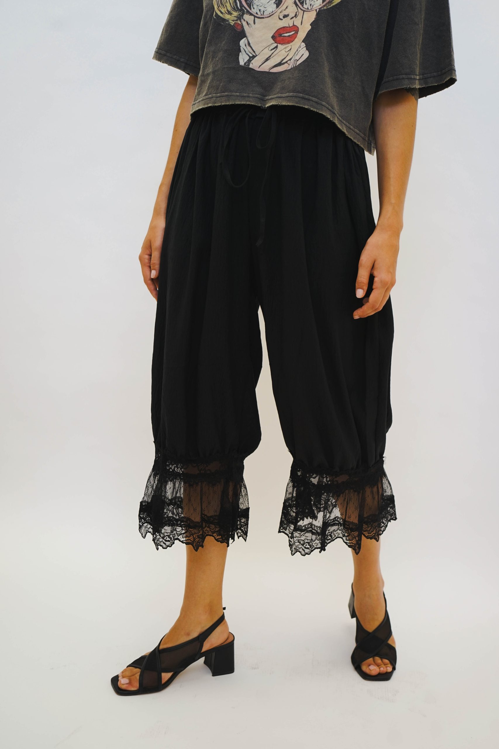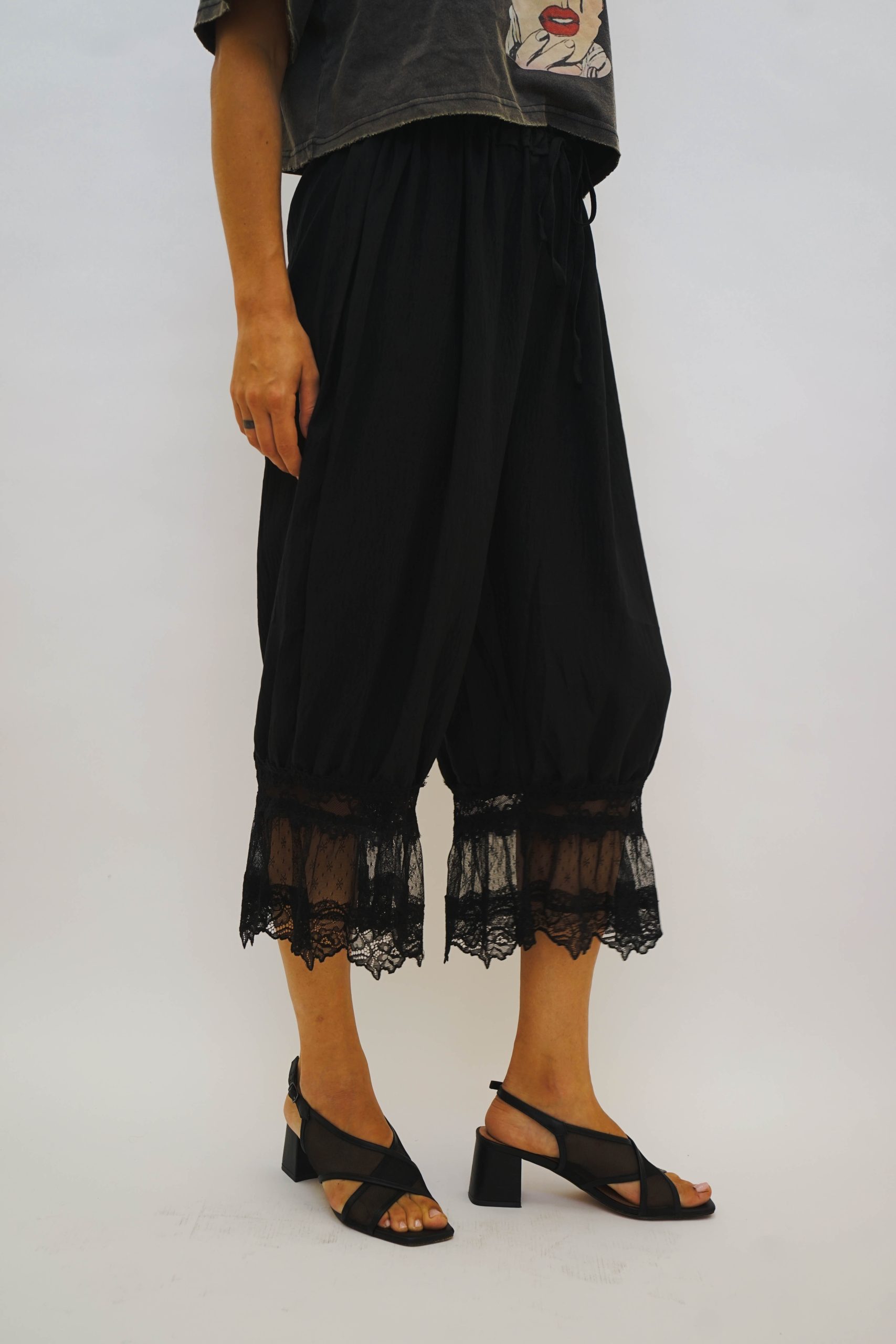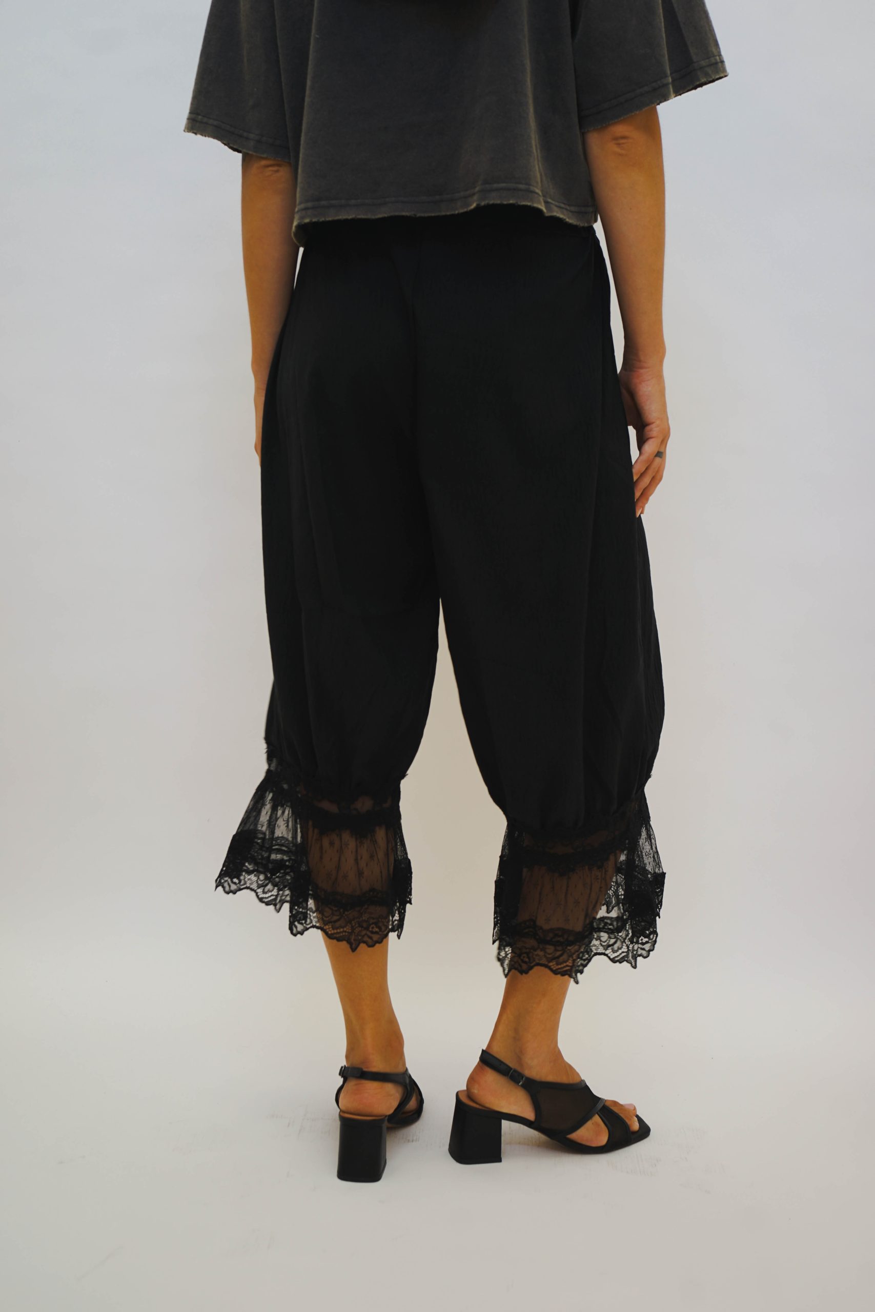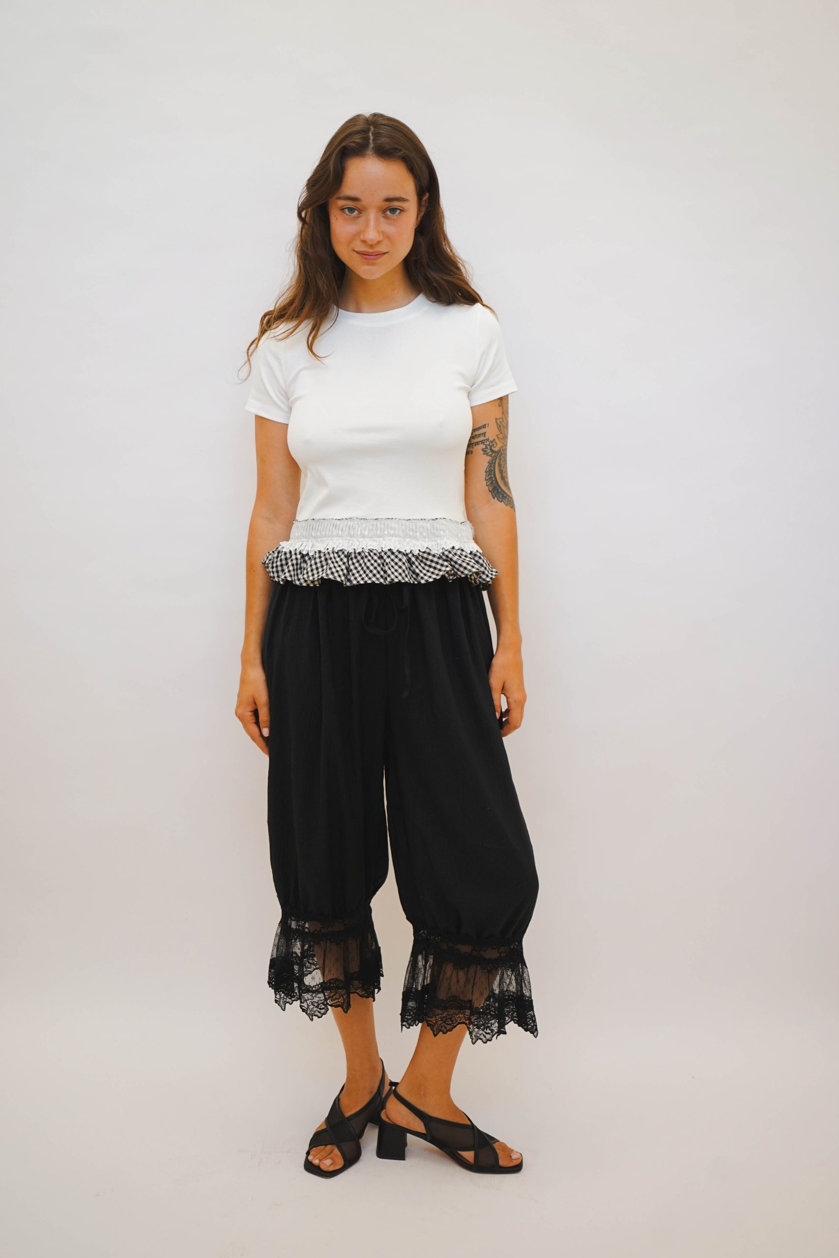 מכנס בגזרת בלון רומנטית ונפוחה, באורך של שלושת רבעי, עשוי מבד קליל ונושם שמתאים במיוחד לעונות החמות. הגומי במותן ובקרסוליים מאפשר התאמה נוחה ומראה מחמיא. הקצה התחתון מעוטר בבד מקומט שמוסיף טאץ’ ייחודי.