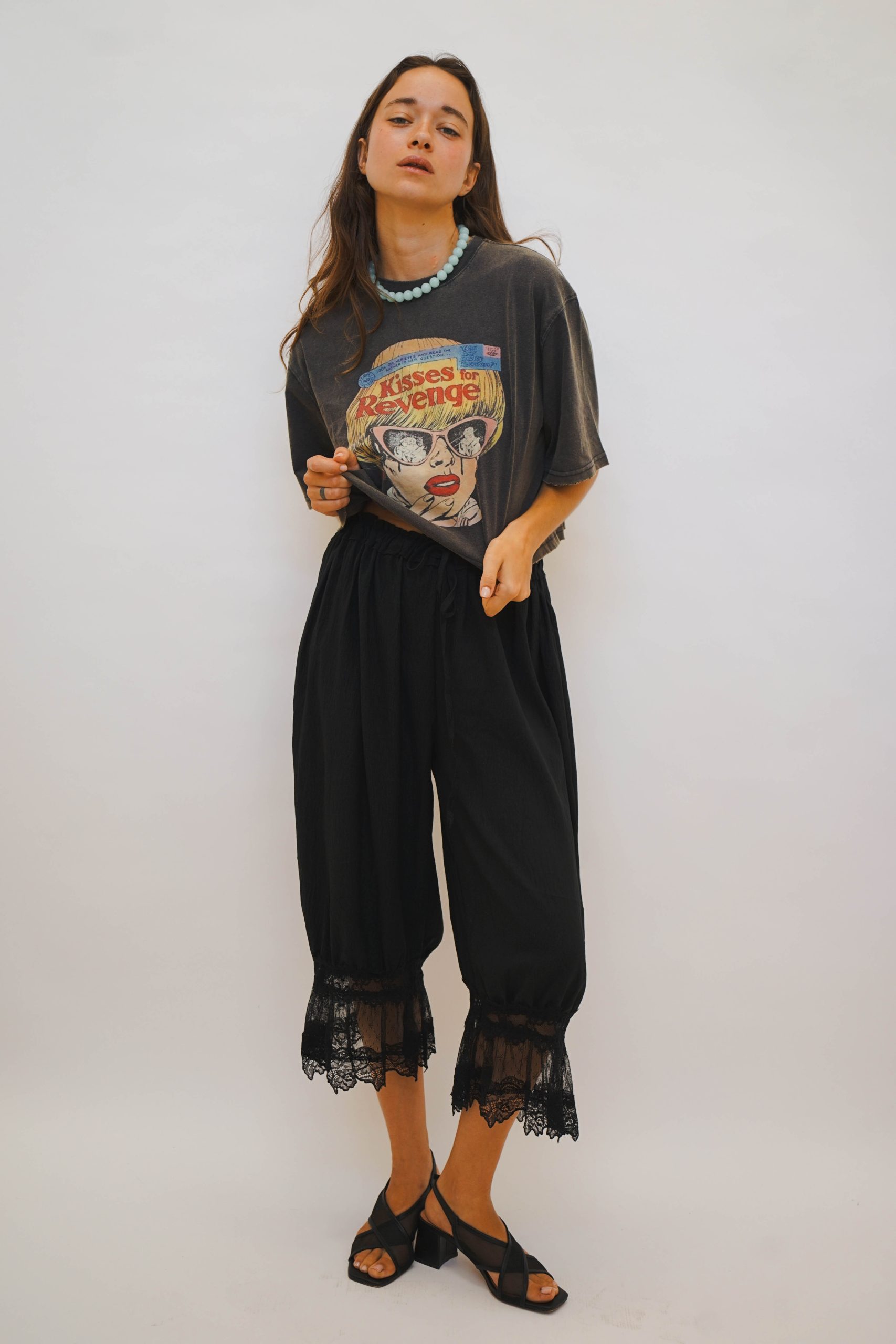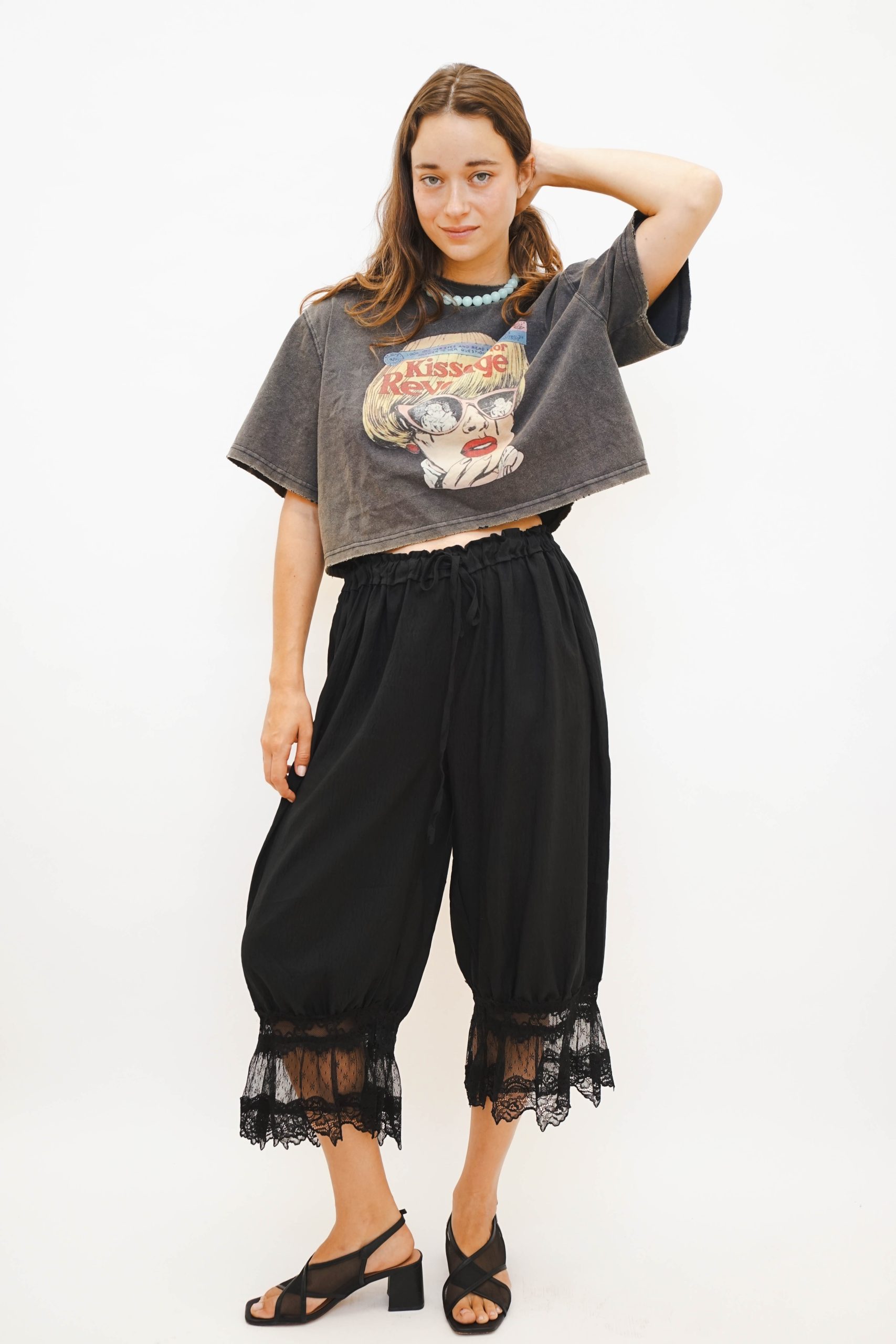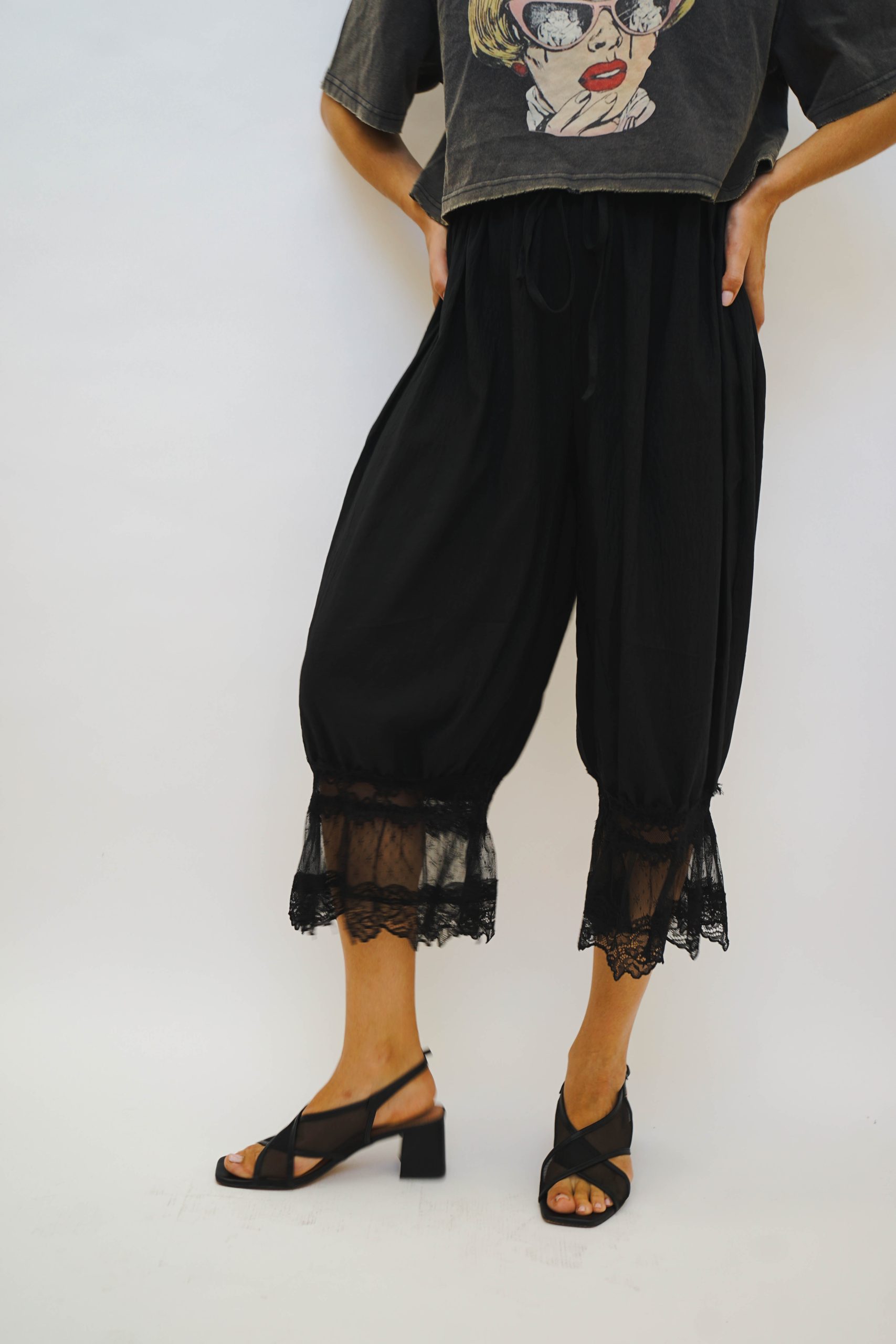 מכנס בגזרת בלון רומנטית ונפוחה, באורך של שלושת רבעי, עשוי מבד קליל ונושם שמתאים במיוחד לעונות החמות. הגומי במותן ובקרסוליים מאפשר התאמה נוחה ומראה מחמיא. הקצה התחתון מעוטר בבד מקומט שמוסיף טאץ’ ייחודי.